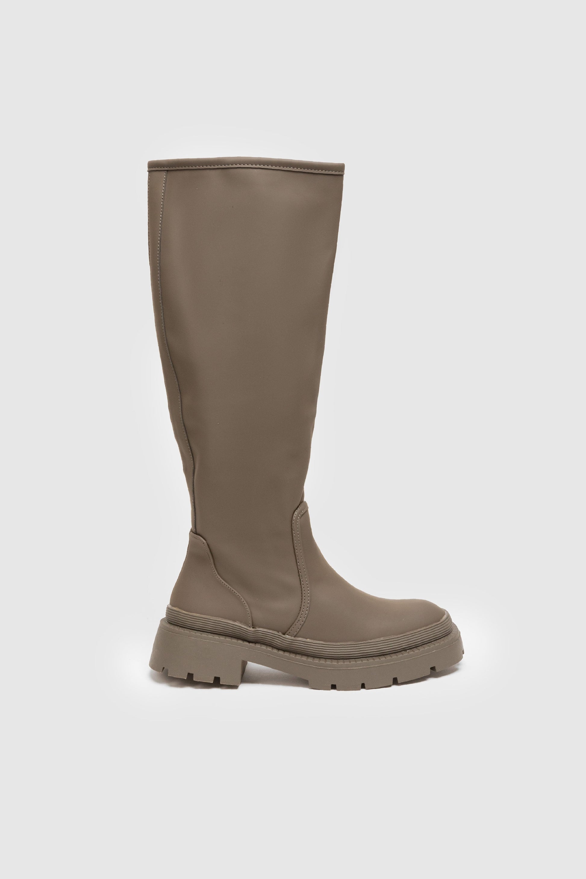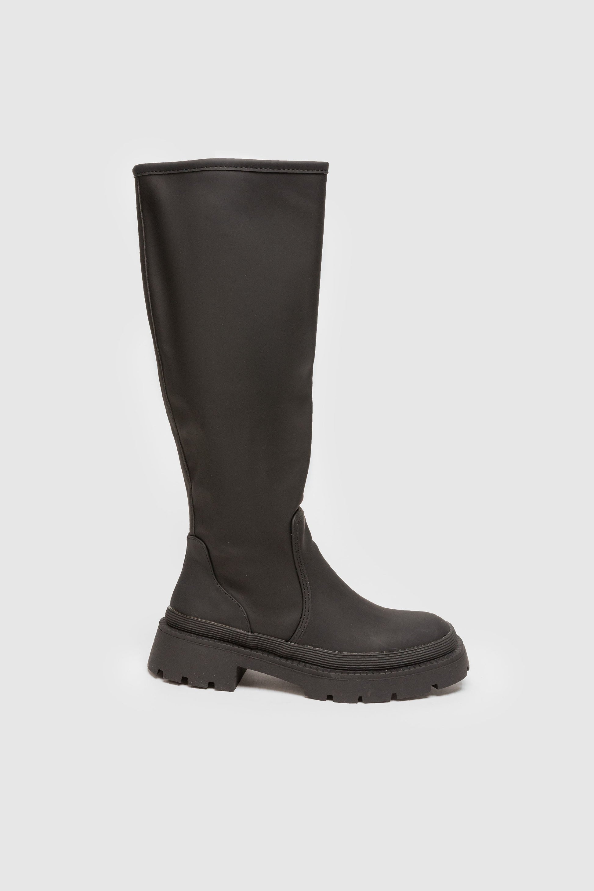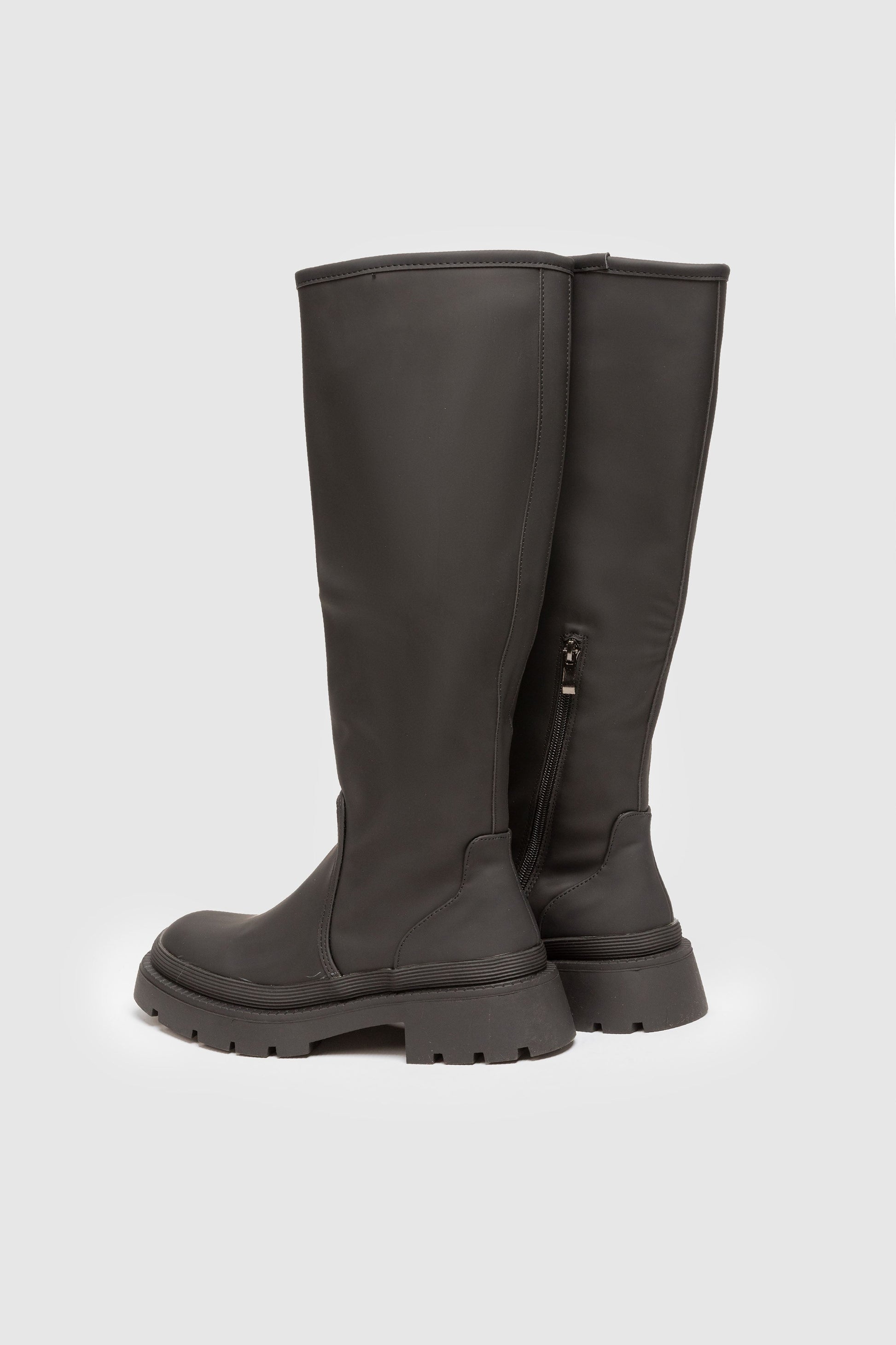 Bota plana engomada. Punta redonda. Caña alta . Suela track. Forro interior. Cierre de cremallera hasta la mitad de la caña.