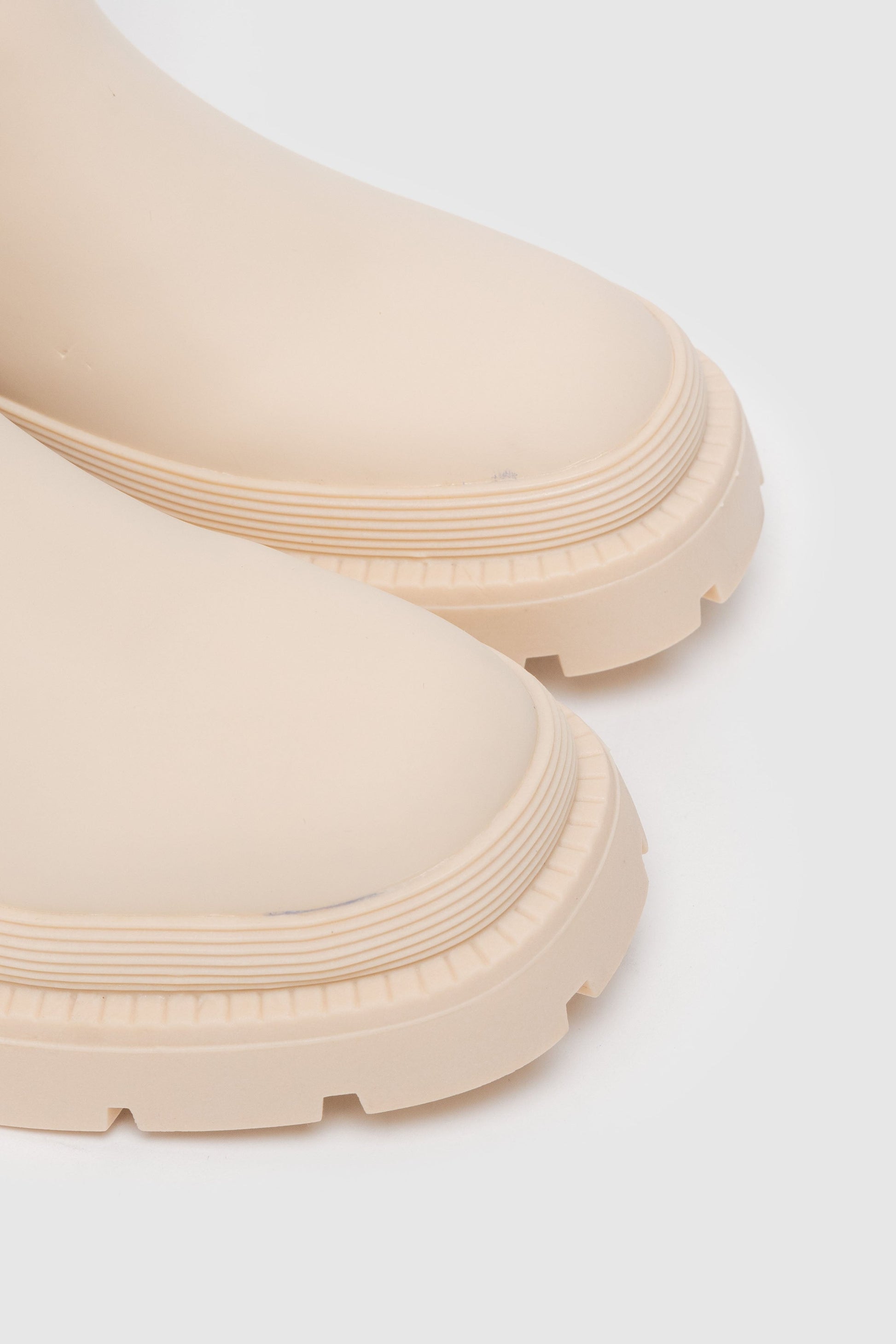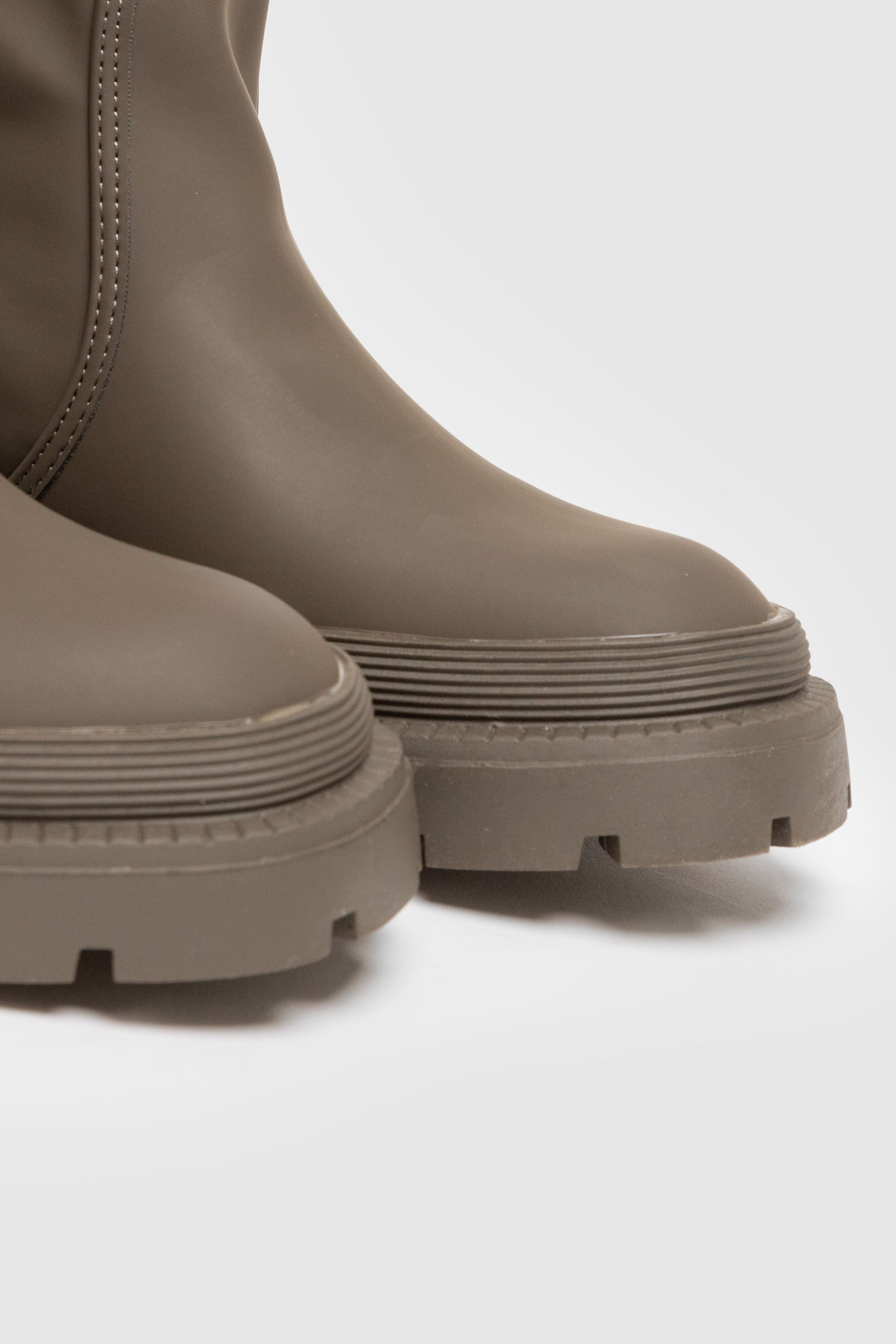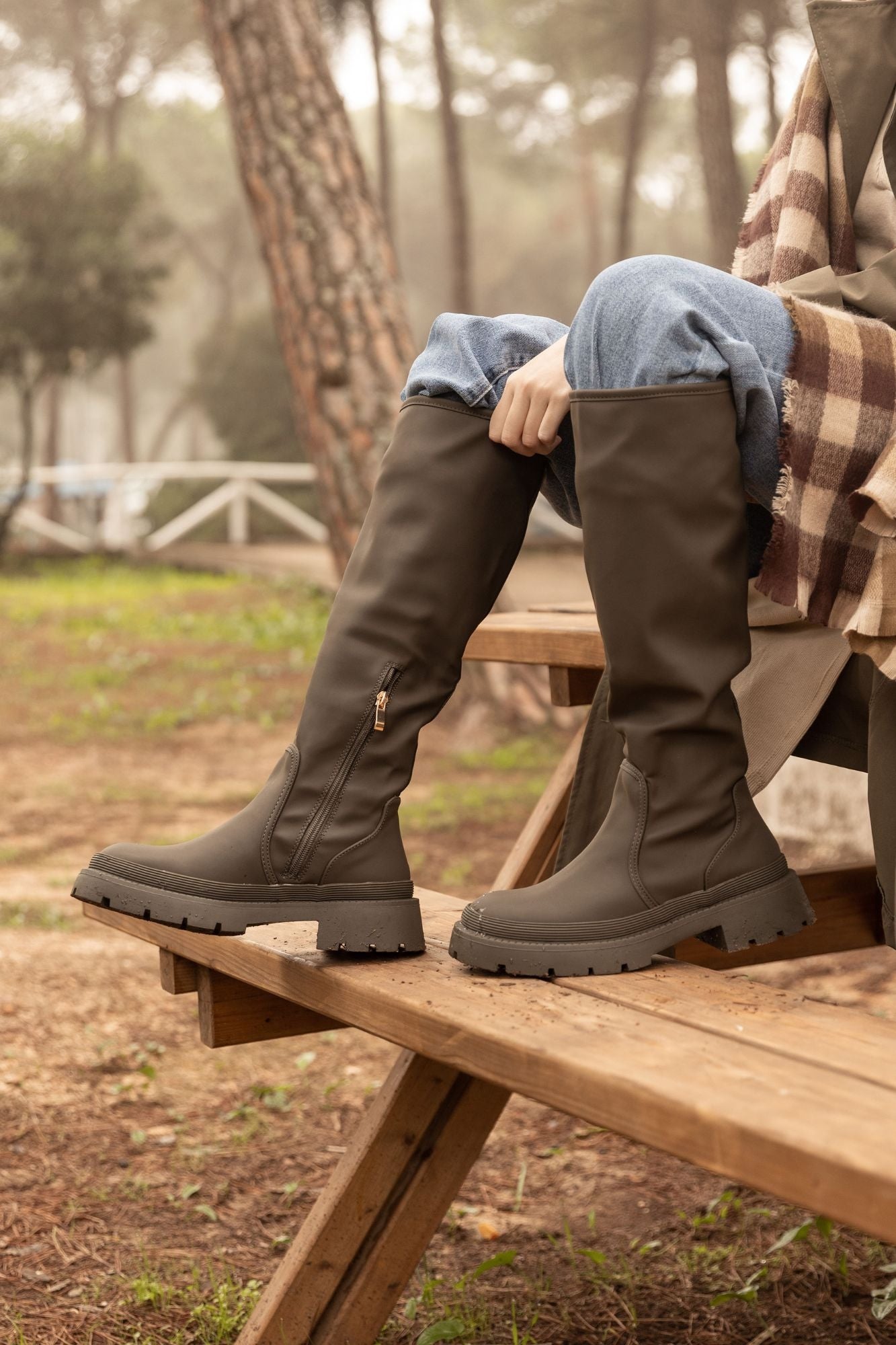 Bota plana engomada. Punta redonda. Caña alta . Suela track. Forro interior. Cierre de cremallera hasta la mitad de la caña.