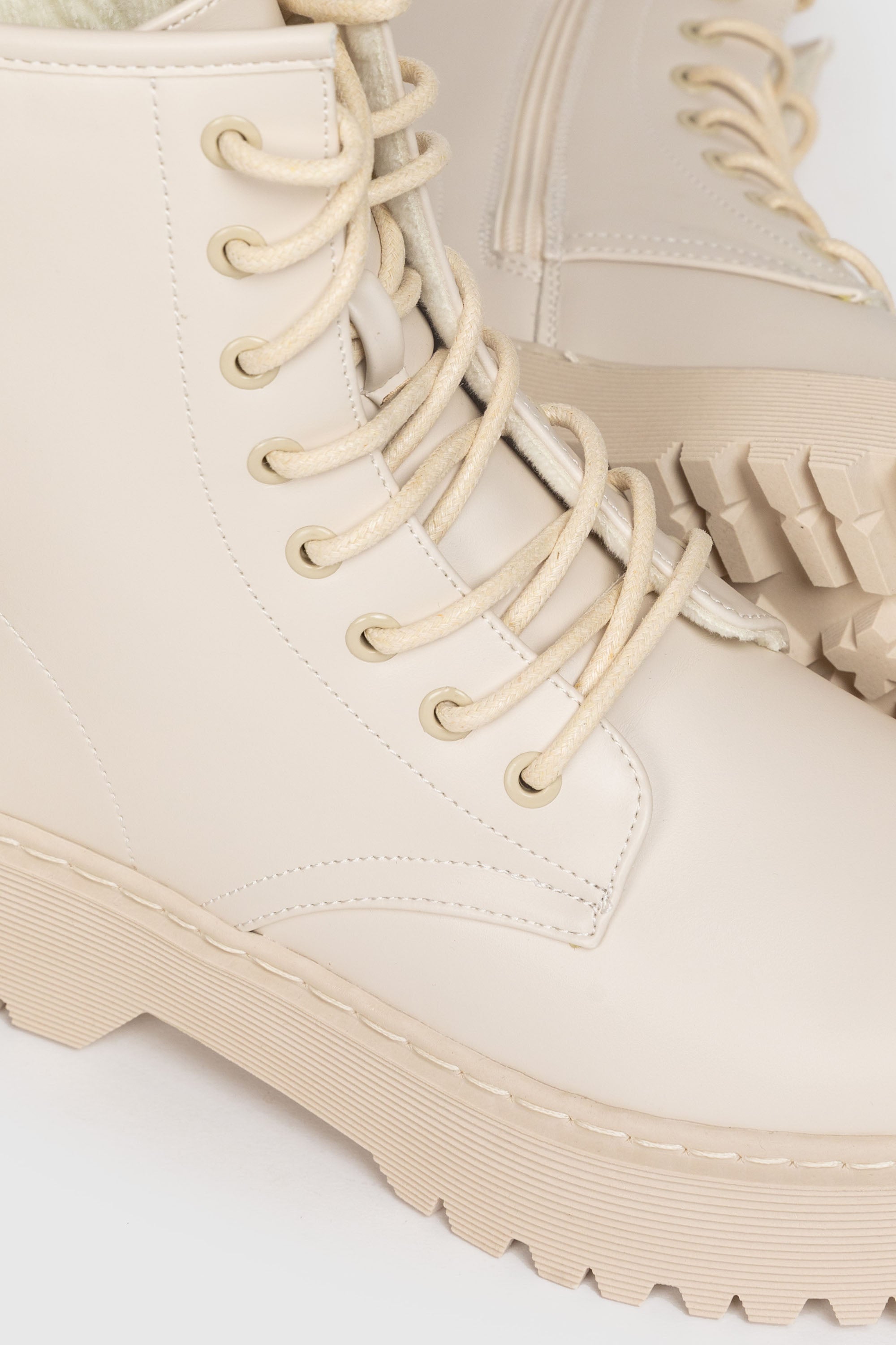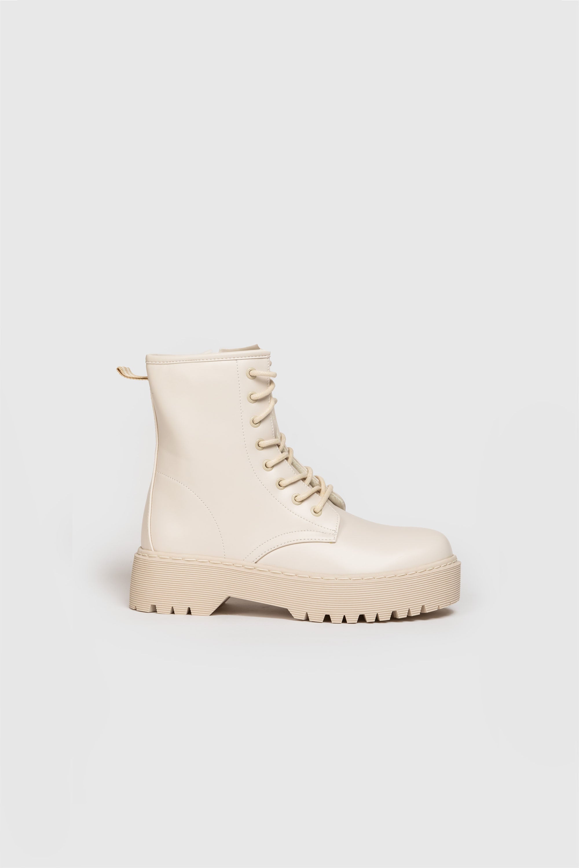Botines planos acordonados. Tejido piel sintética. Acabado en puna redonda. Caña baja. Cierre de cremallera lateral. Cierre de cordones. Suela track. Forrado. Altura tacón: 4 cm. Altura caña: 15 cm.