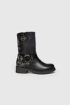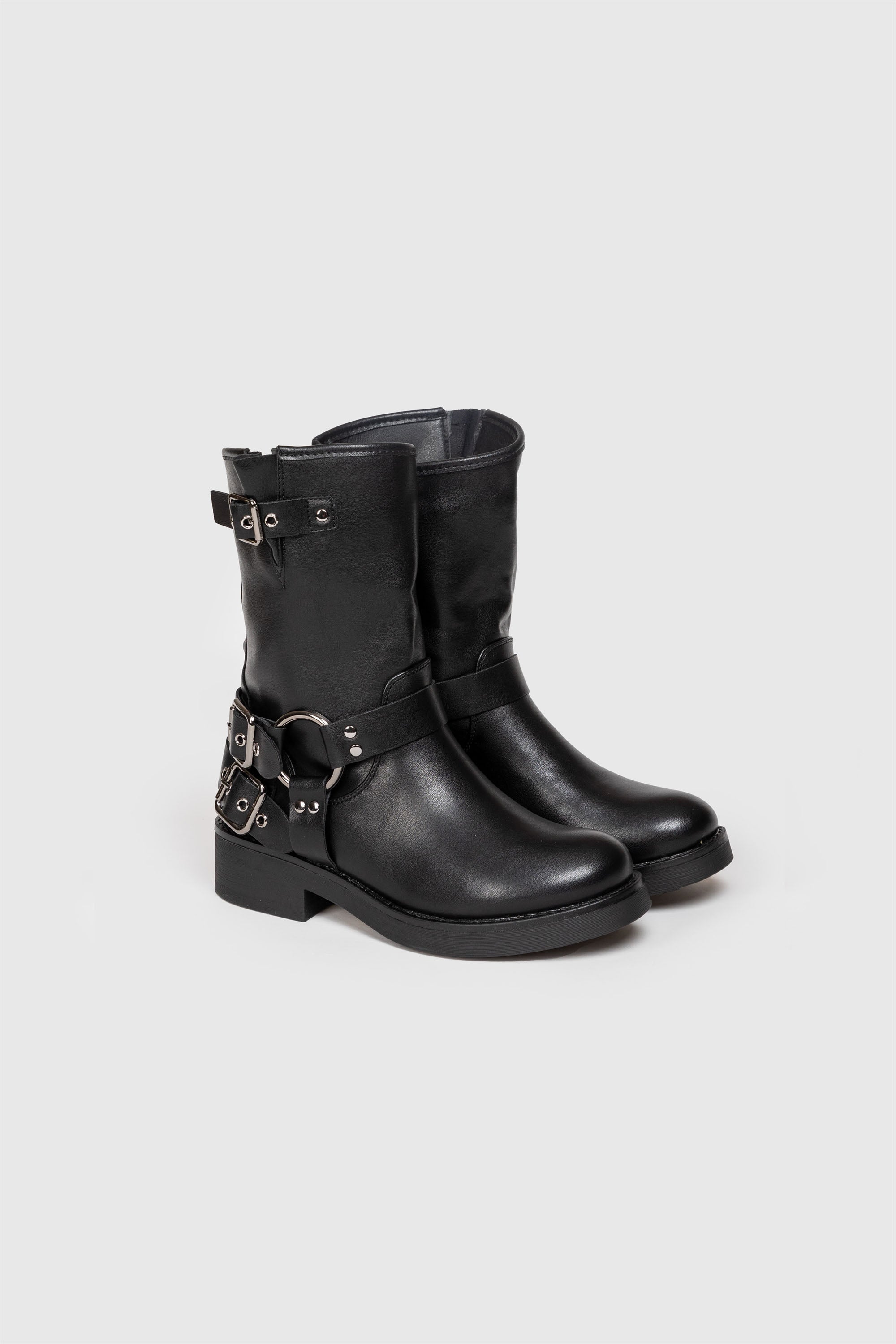 Bota estilo motero. Tejido piel sintética. Diseño desgastado. Acabado redondo. Caña media. Cierre de cremallera lateral. Tacón plano. Detalle de tiras con hebillas en el empeine y en la parte superior de la caña. Forrada. Altura tacón: 4 cm. Altura caña: 14 cm.