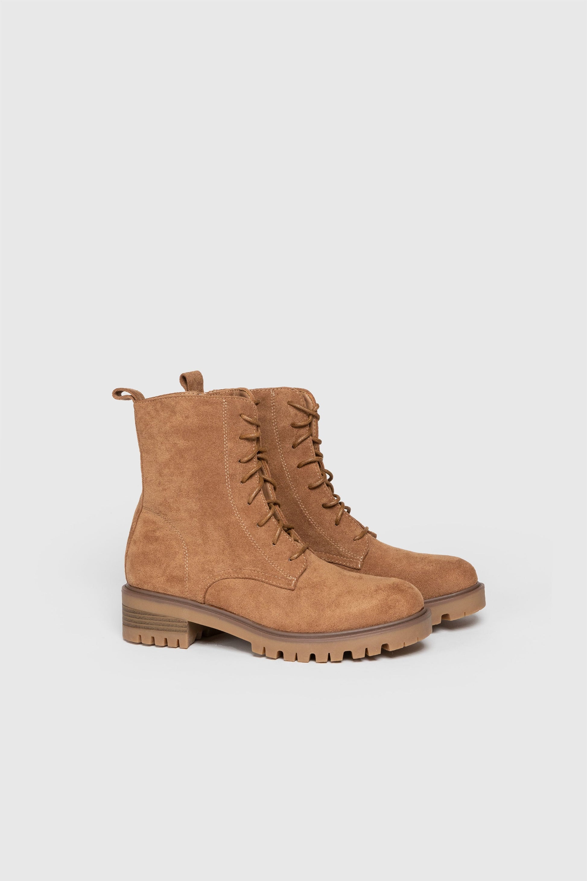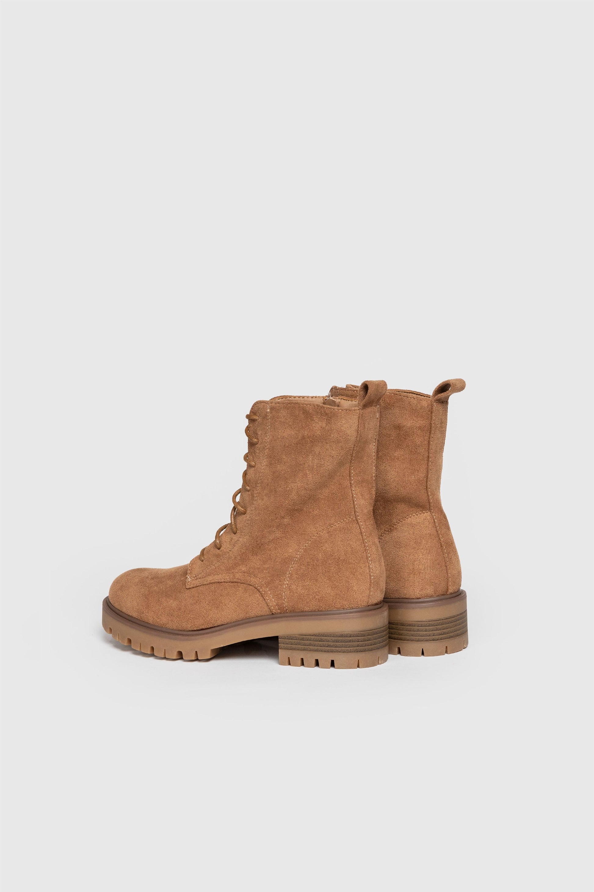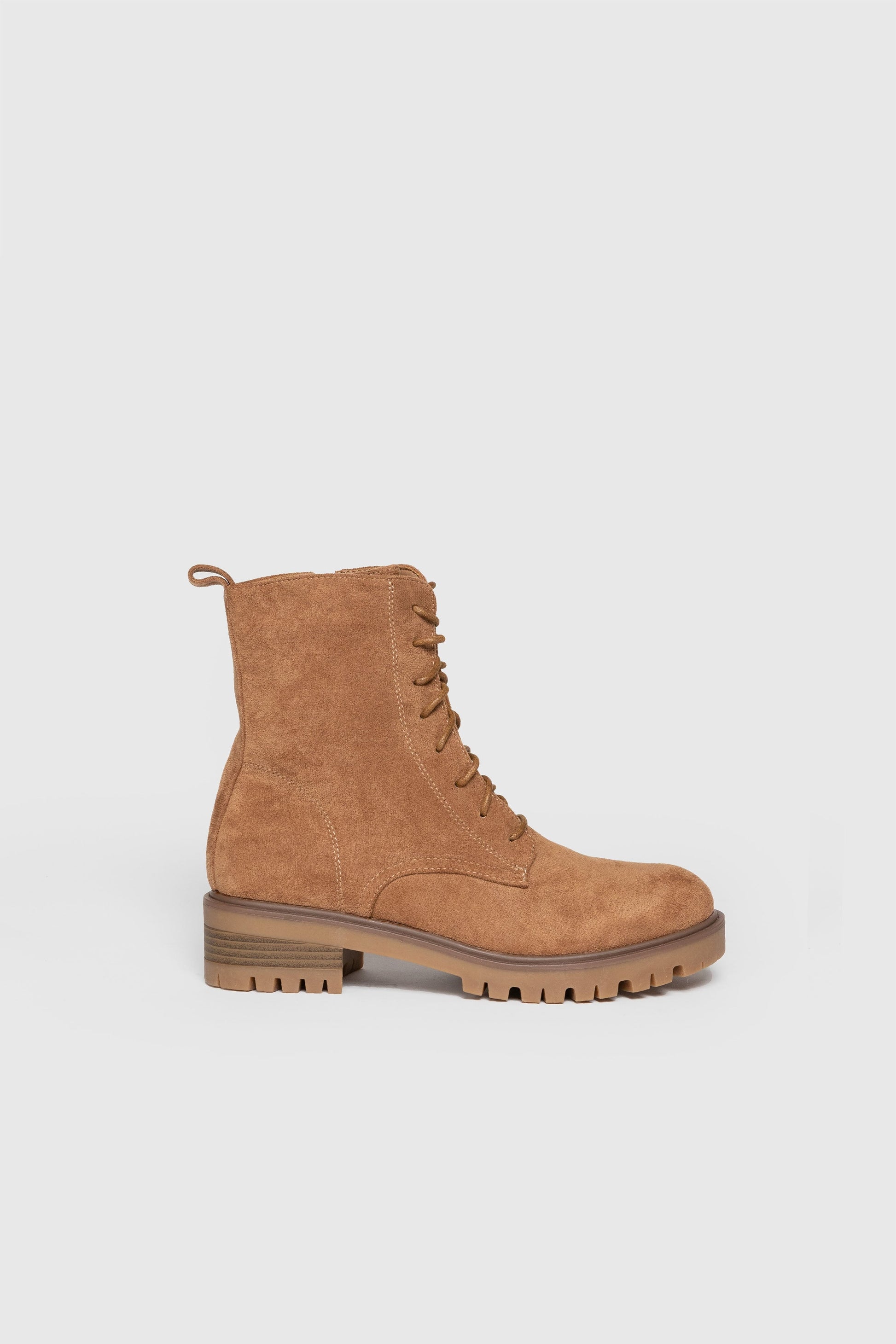 Bota estilo motero. Tejido antelina. Acabado redondeado. Caña baja. Suela dentada tipo track. Cierre de cordones. Cremallera lateral. Tirador trasero. Altura tacón 4.0 cm.