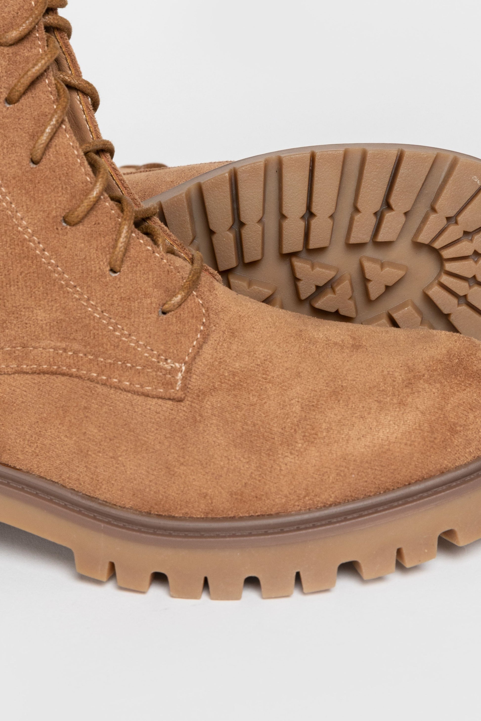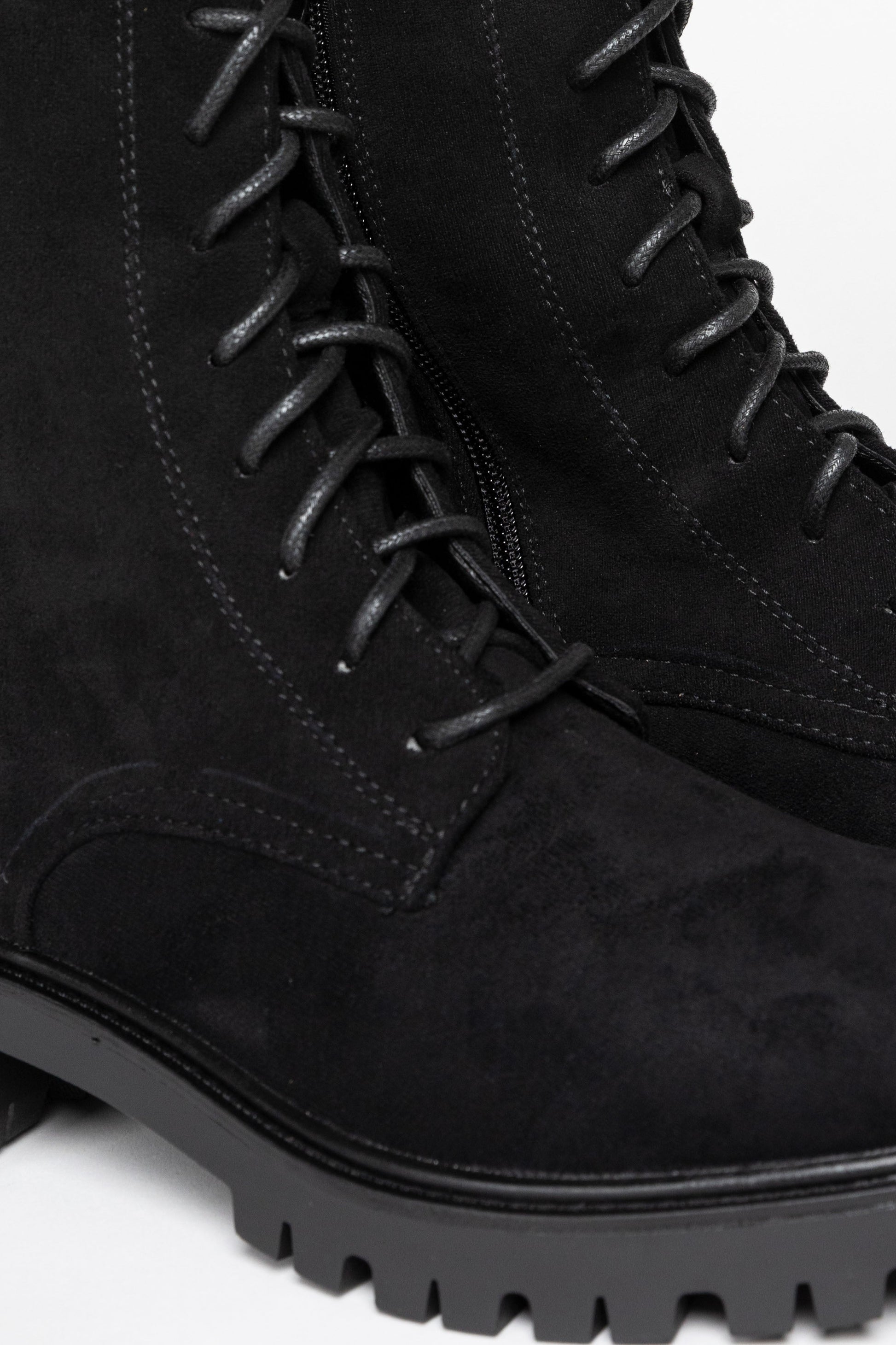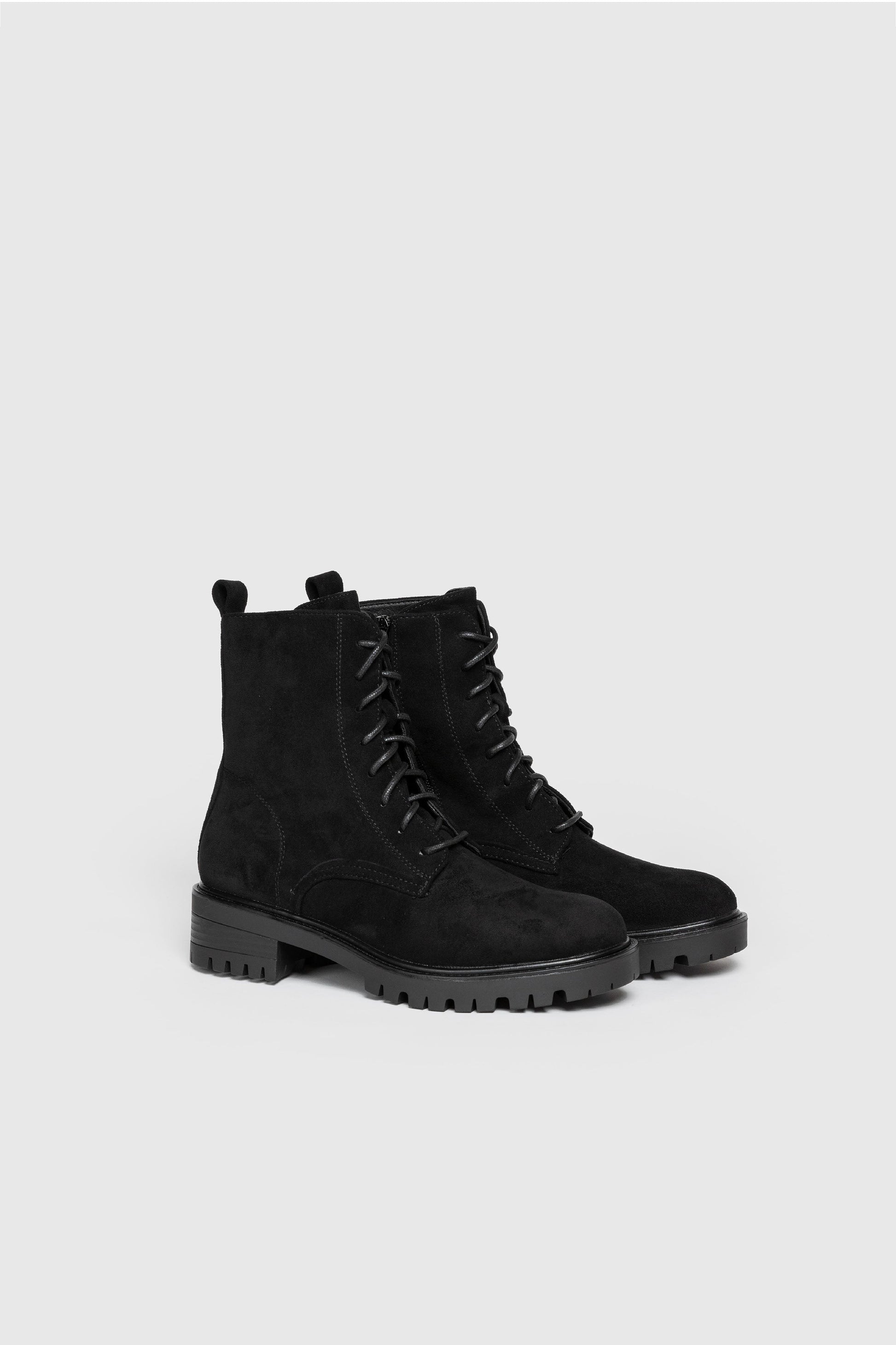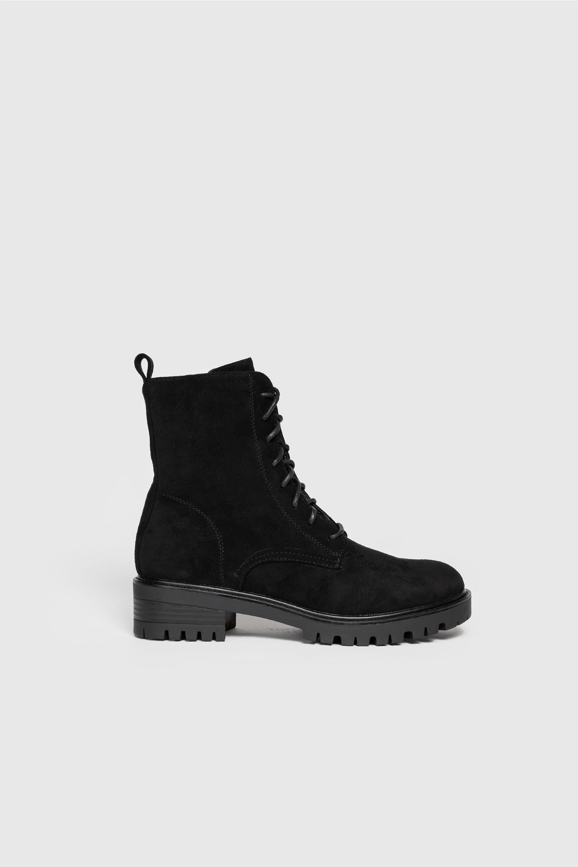 Bota estilo motero. Tejido antelina. Acabado redondeado. Caña baja. Suela dentada tipo track. Cierre de cordones. Cremallera lateral. Tirador trasero. Altura tacón 4.0 cm.