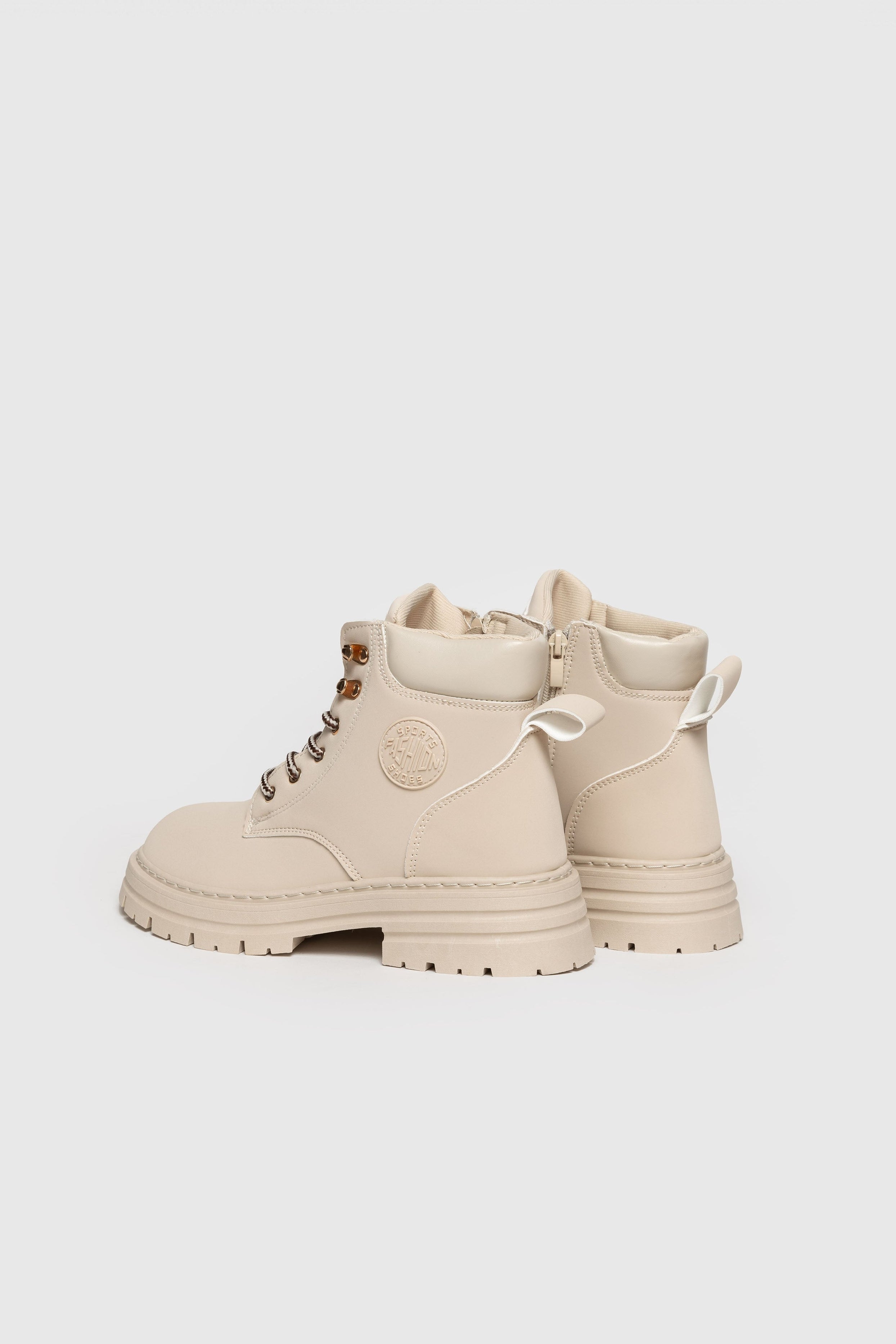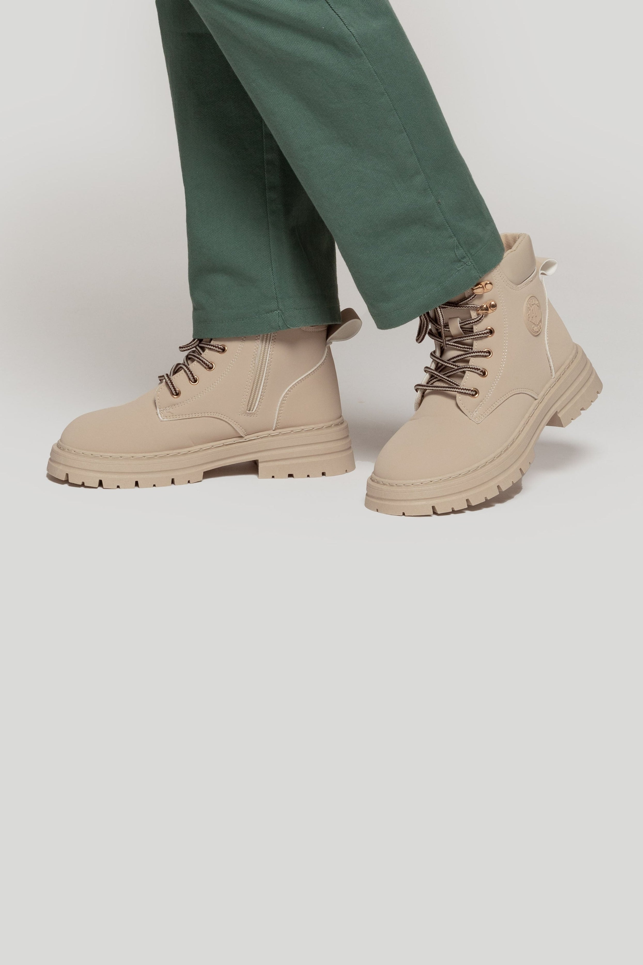 Bota estilo track. Tejido combinado. Acabado redondeado. Caña baja. Plataforma sobresaliente. Suela dentada. Tacón track. Cremallera lateral. Cierre de cordones. Tirador. Altura tacón 5.0 cm.