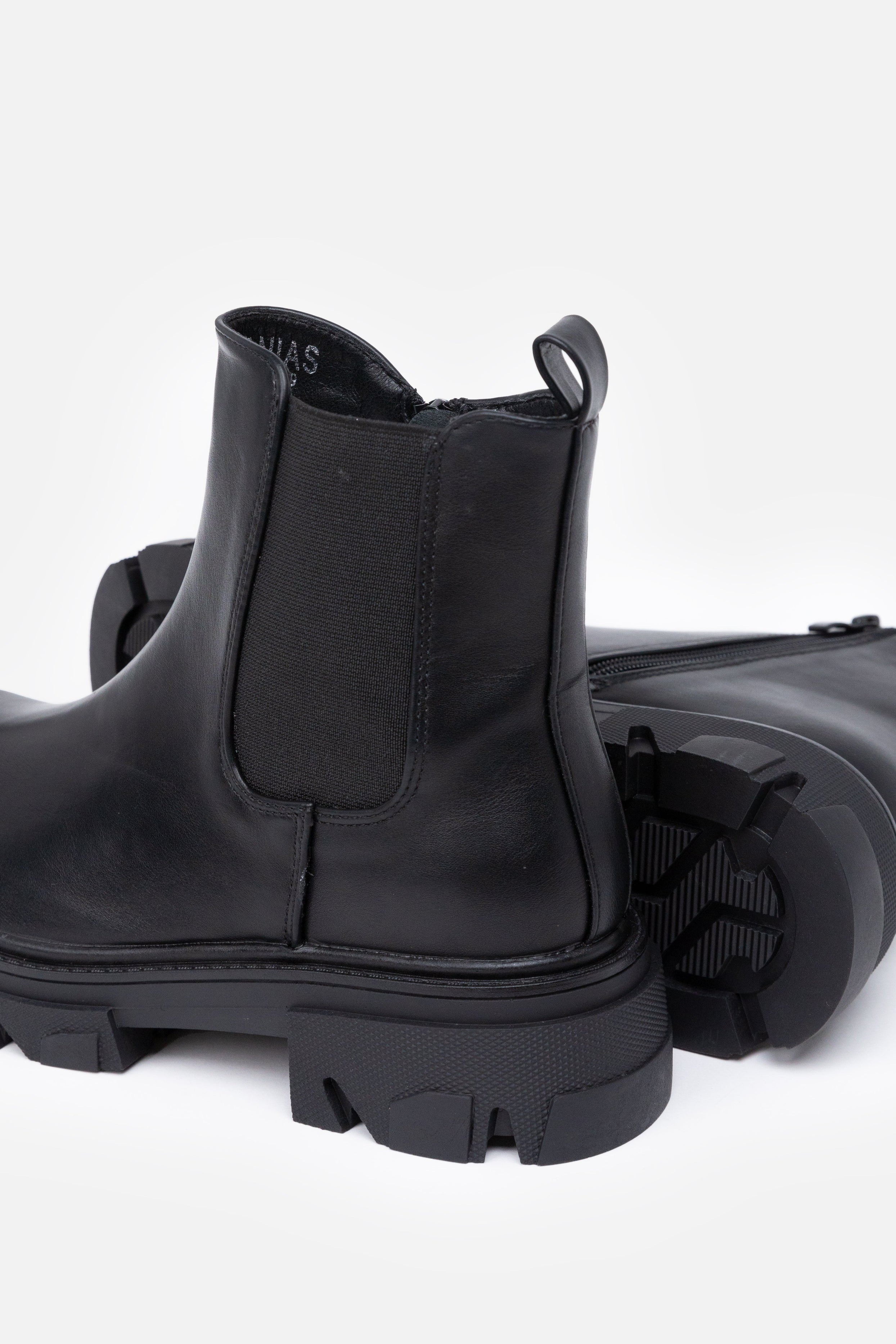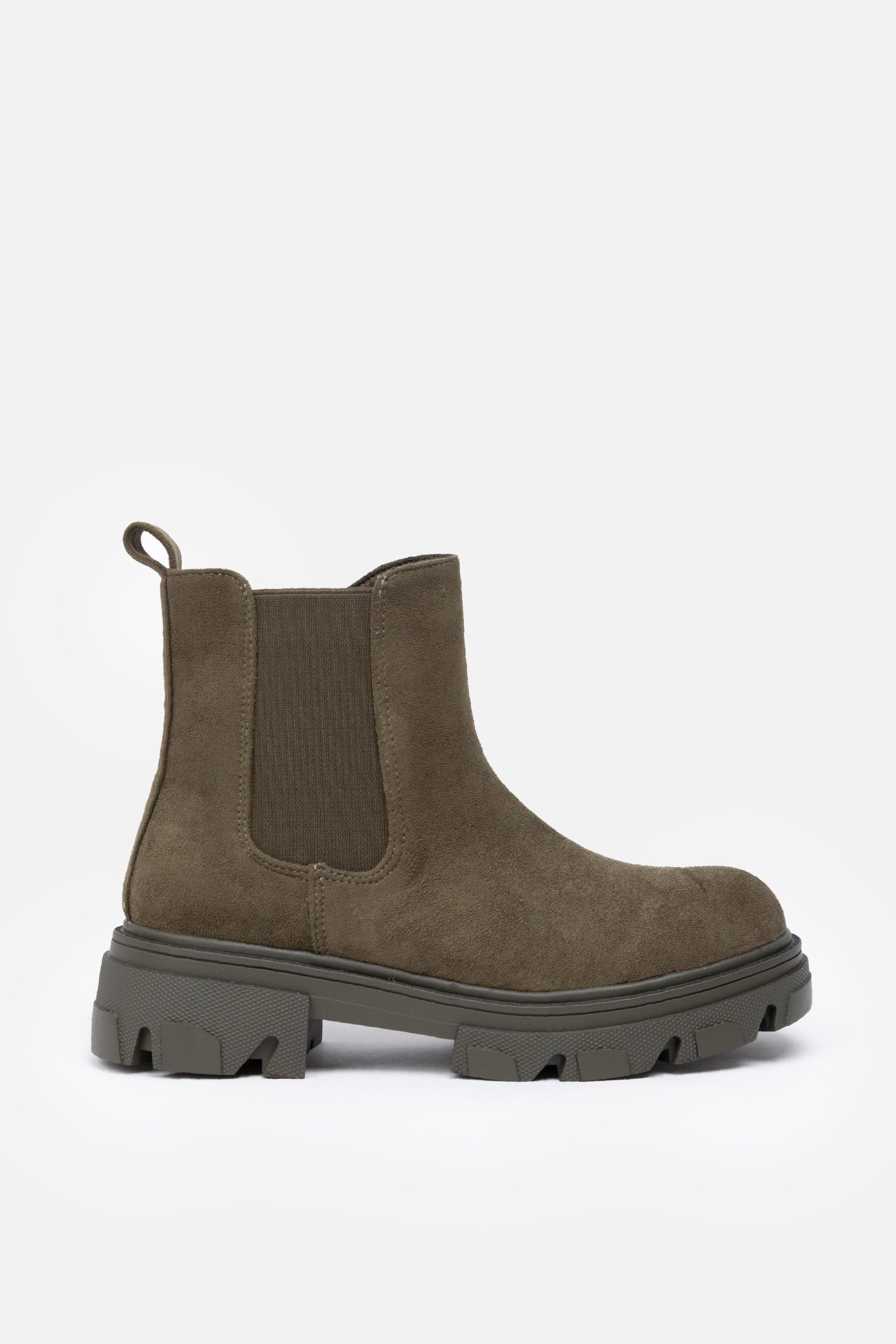 Botín de caña media. Paneles laterales elásticos. Punta redonda. Suela track. Altura tacón: 2.00 cm. Color negro piel sintética, verde y khaki en tejido antelina.