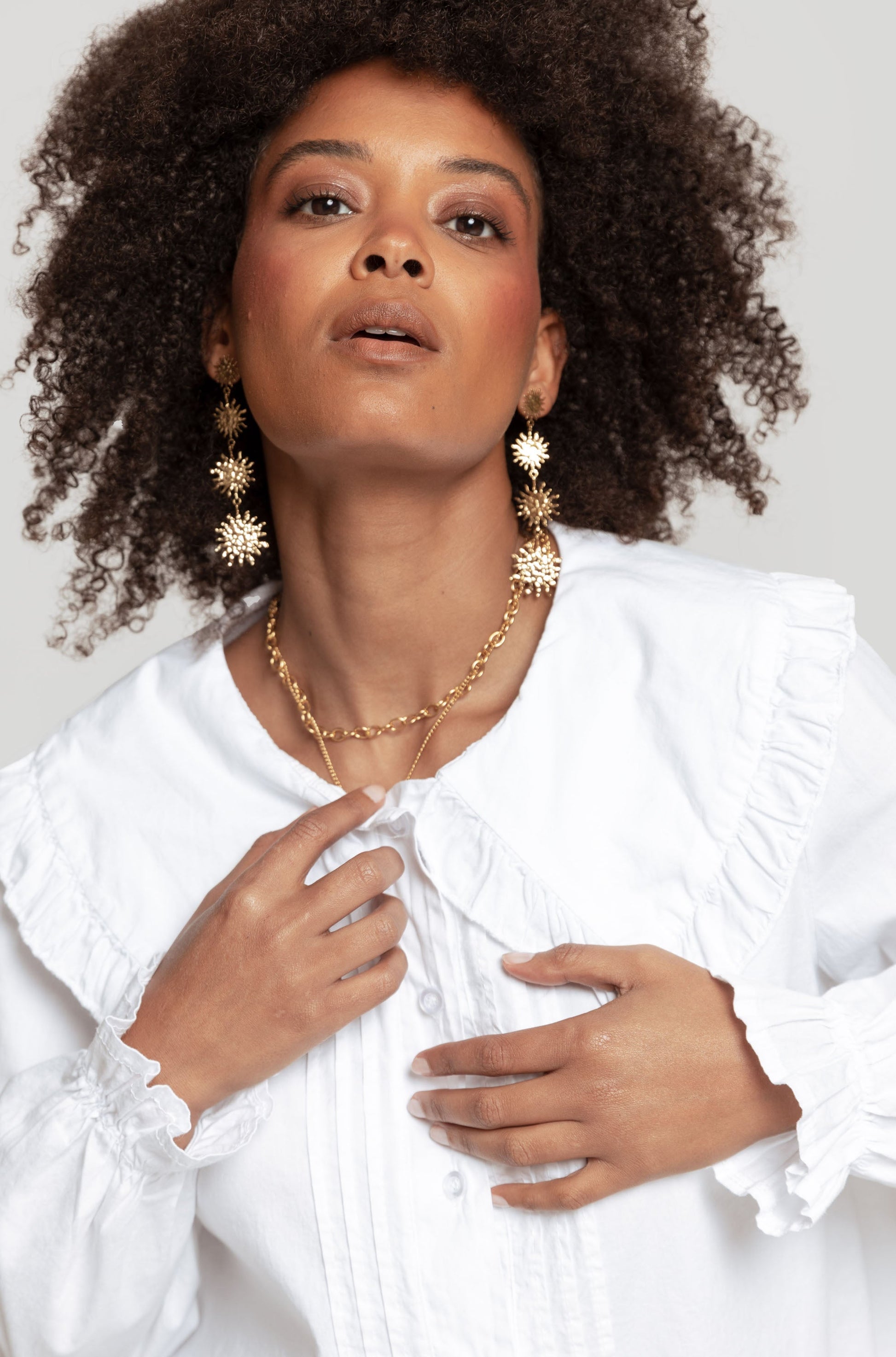 Tejido mezcla de algodón. Diseño fluido. Diseño recto. Cuello bobo. Manga larga. Puño acampanado. Cierre de botones. Talla modelo: S. Altura modelo: 1,75 m.