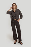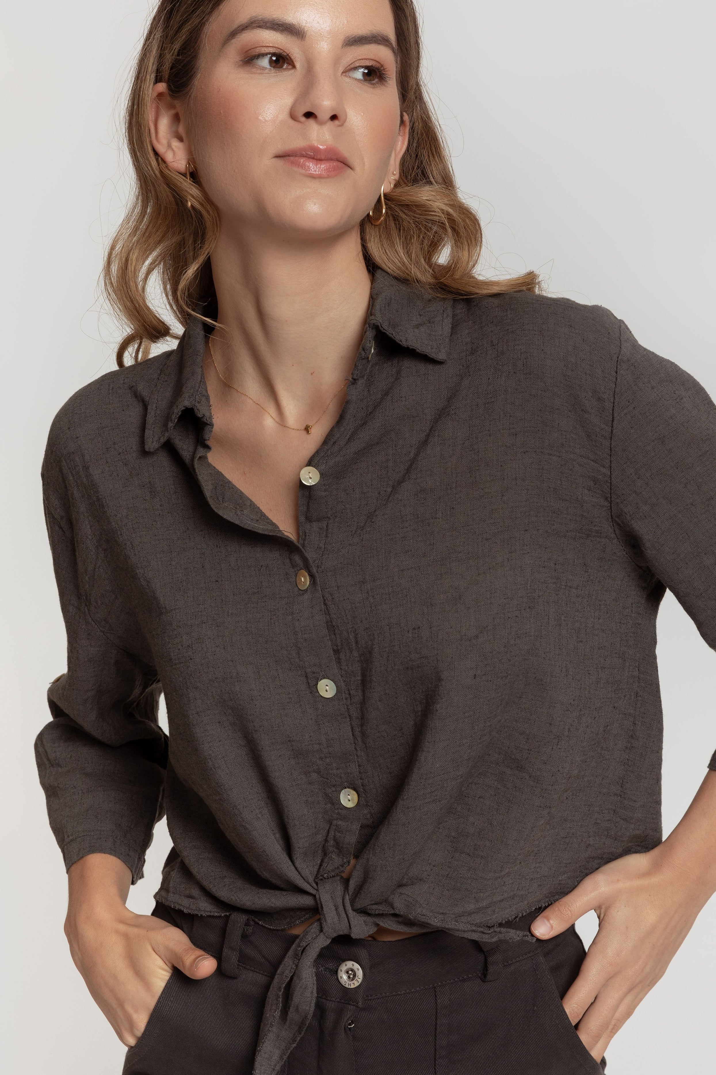 Tejido mezcla lino. Diseño nudo. Cuello solapas. Manga tres cuarto. Cierre de botones. Bajo anudado. Talla modelo: S. Altura modelo 1,70 m.