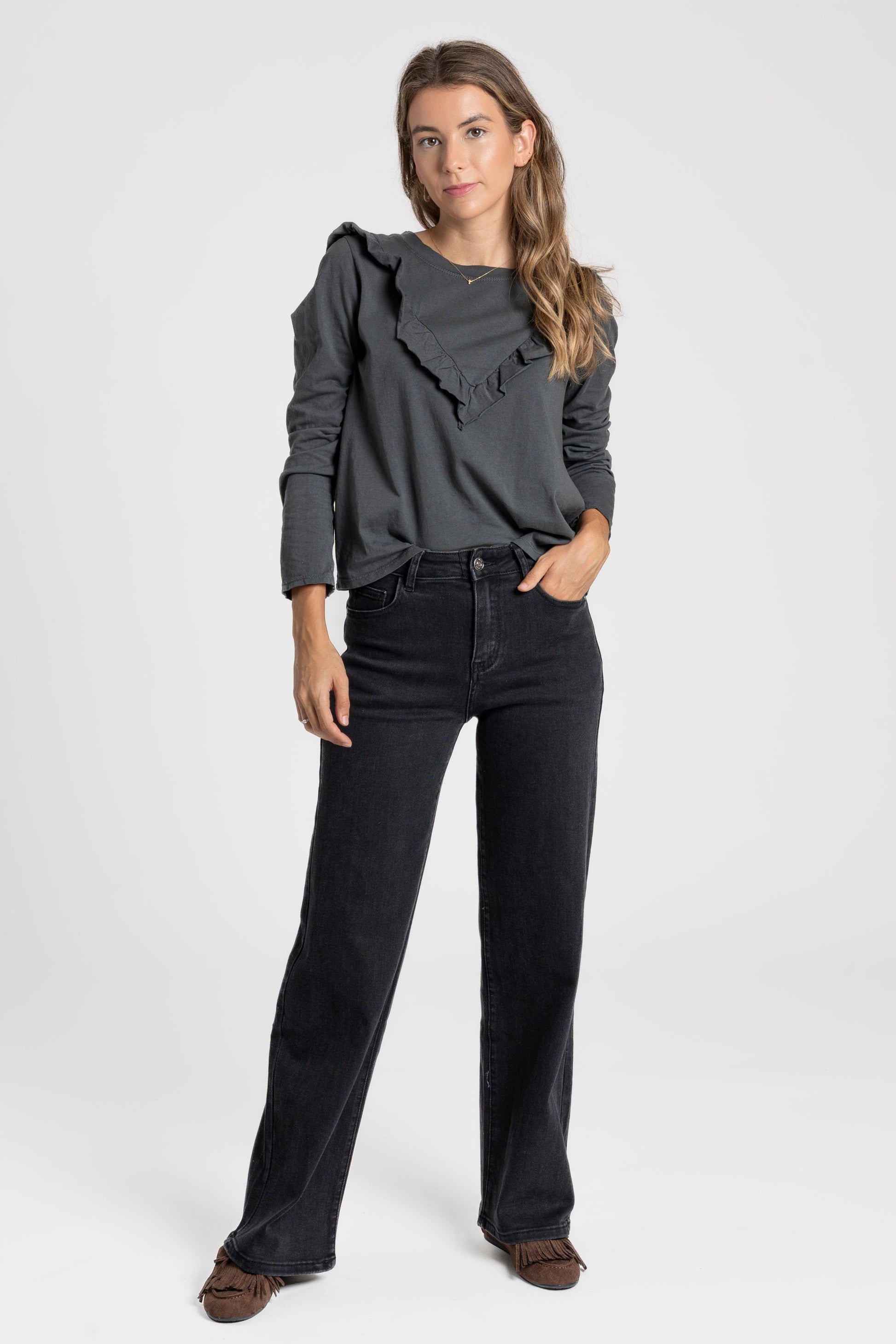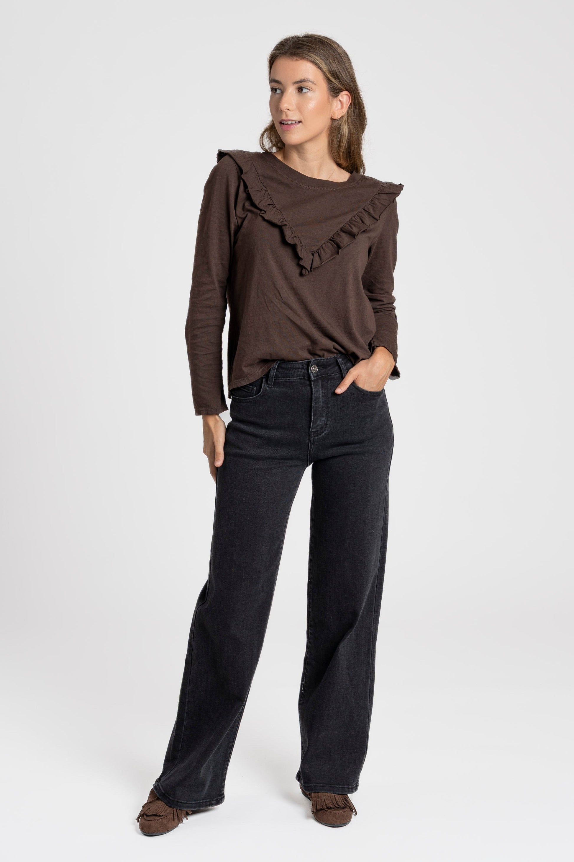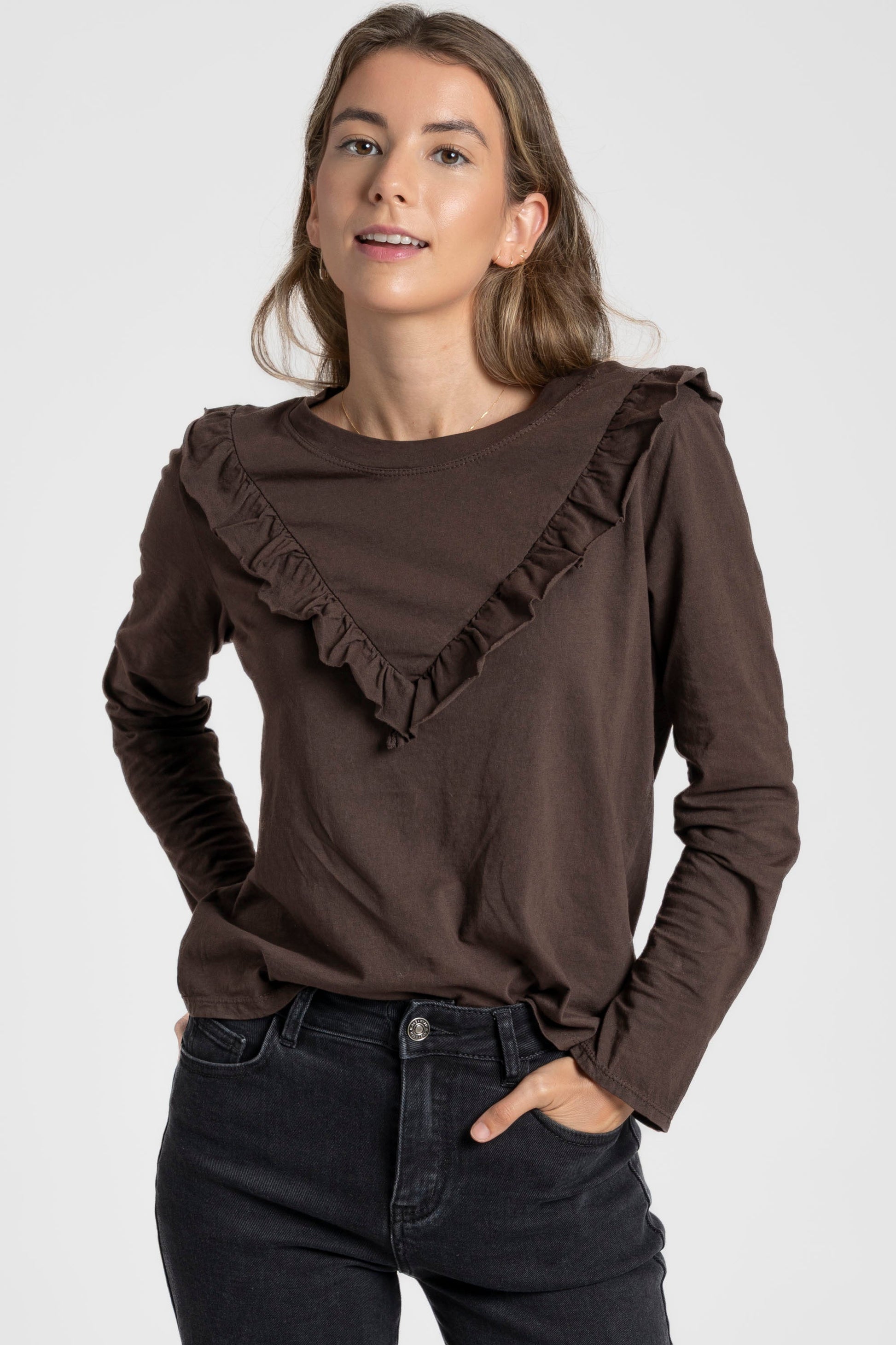 Tejido de algodón. Cuello redondo. Detalle volantes. Manga larga.