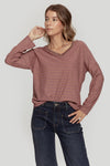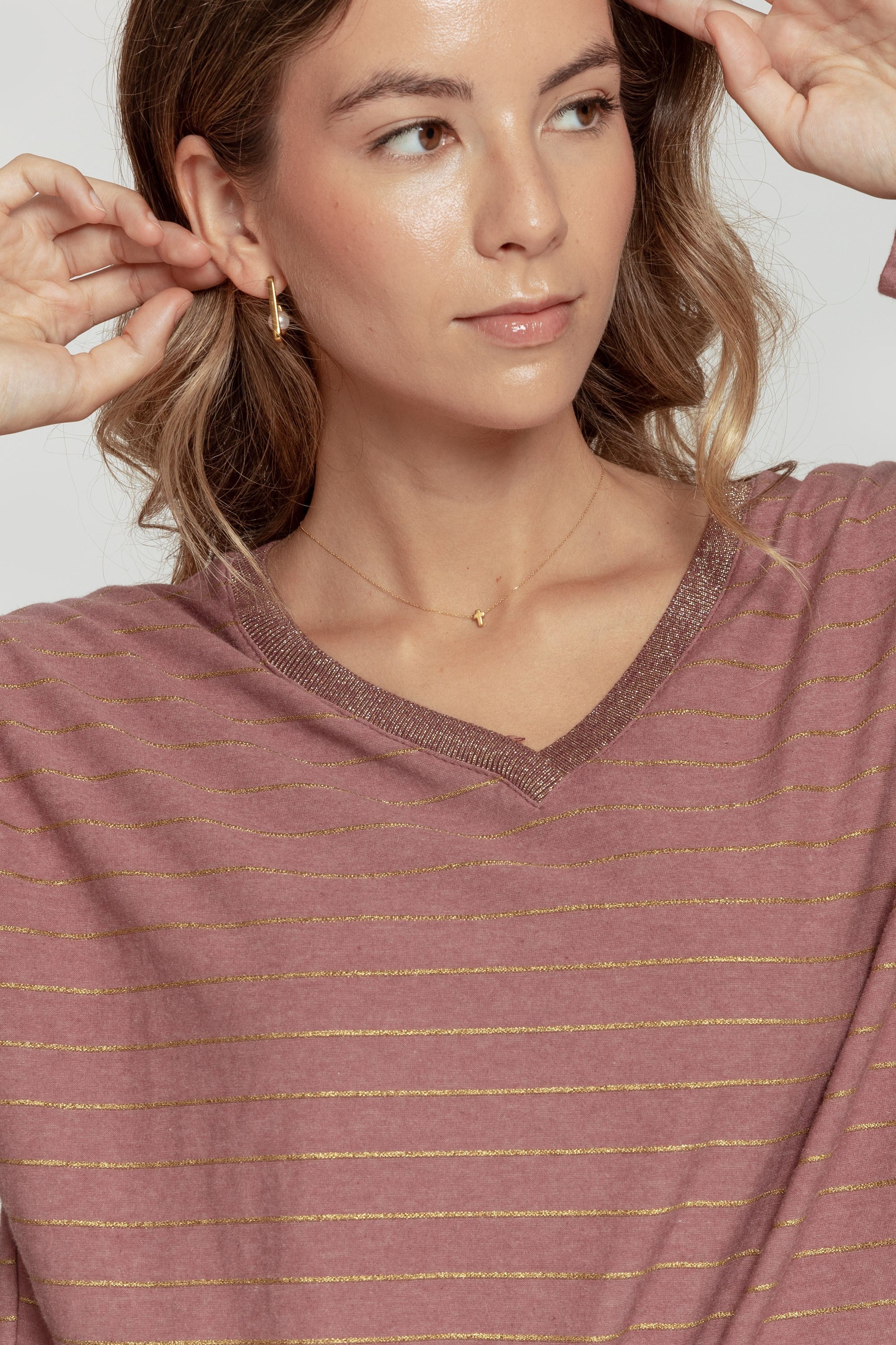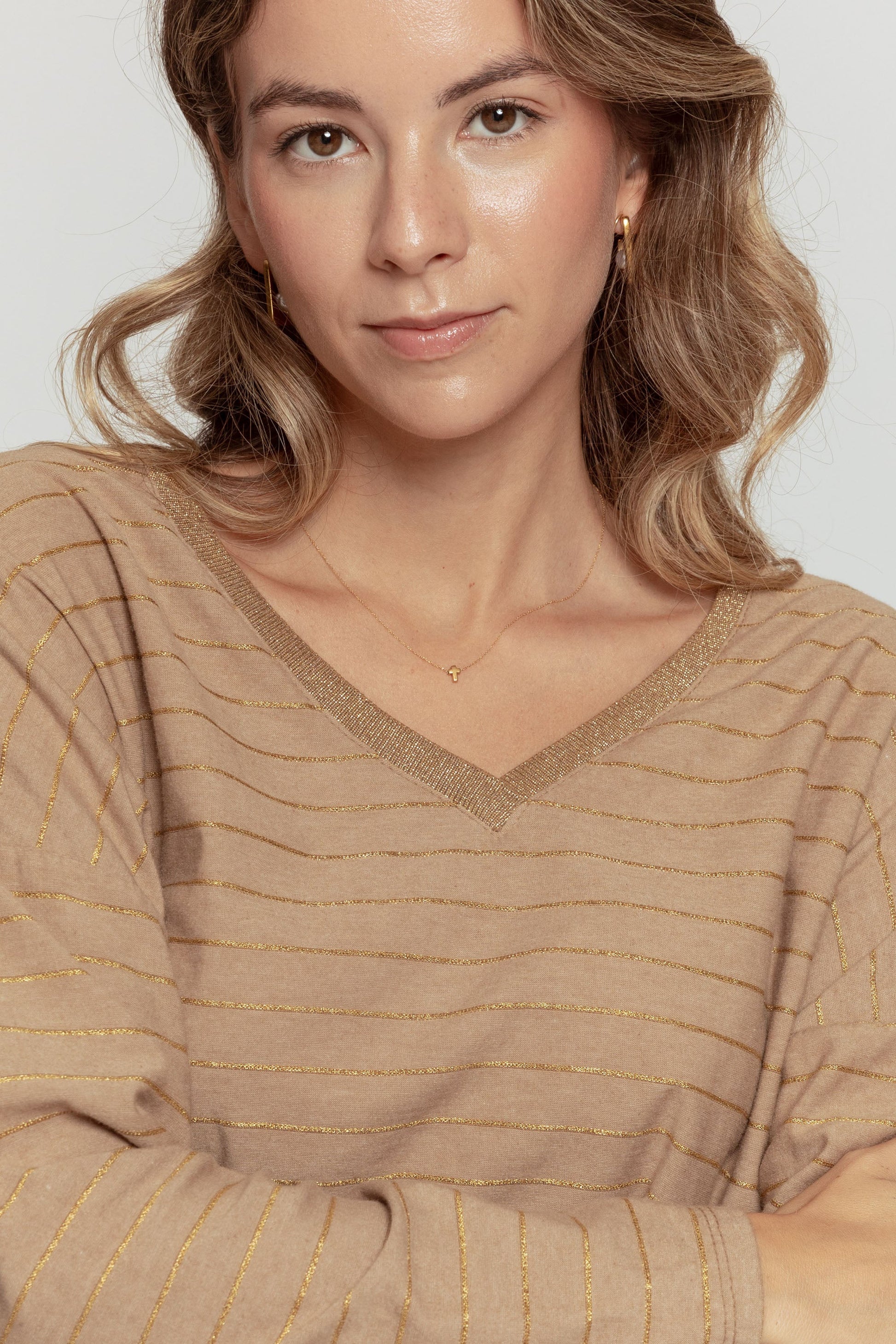 Tejido mezcla de algodón. Diseño estampado rayas. Estampado acabado de brillo. Diseño recto. Cuello pico. Manga larga. Talla modelo: S. Altura modelo: 1,70 m.