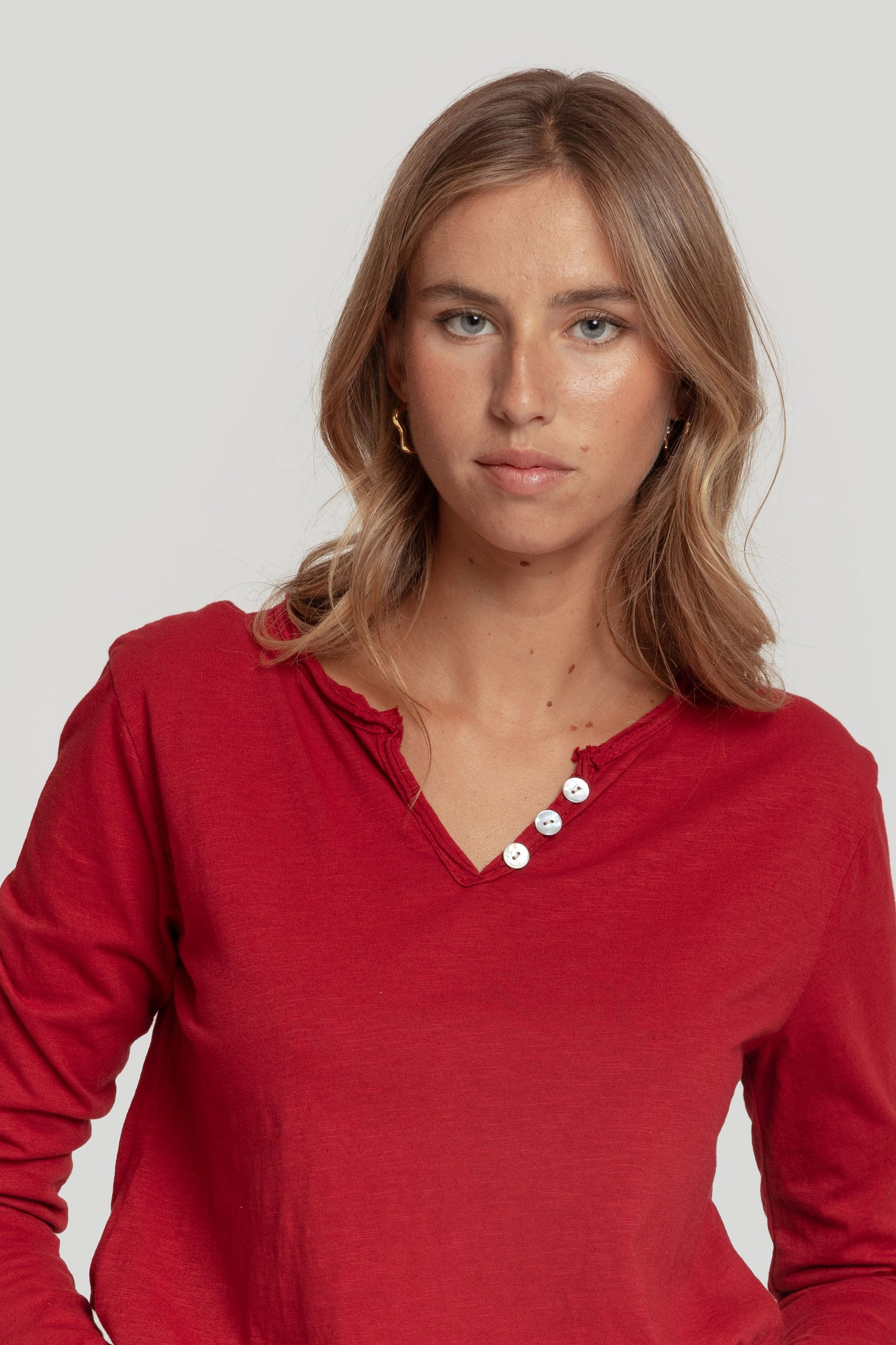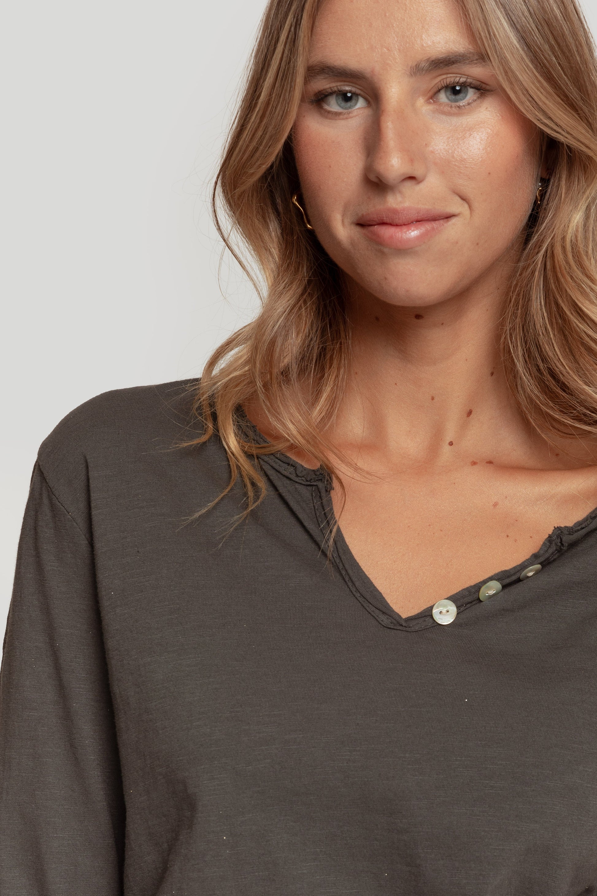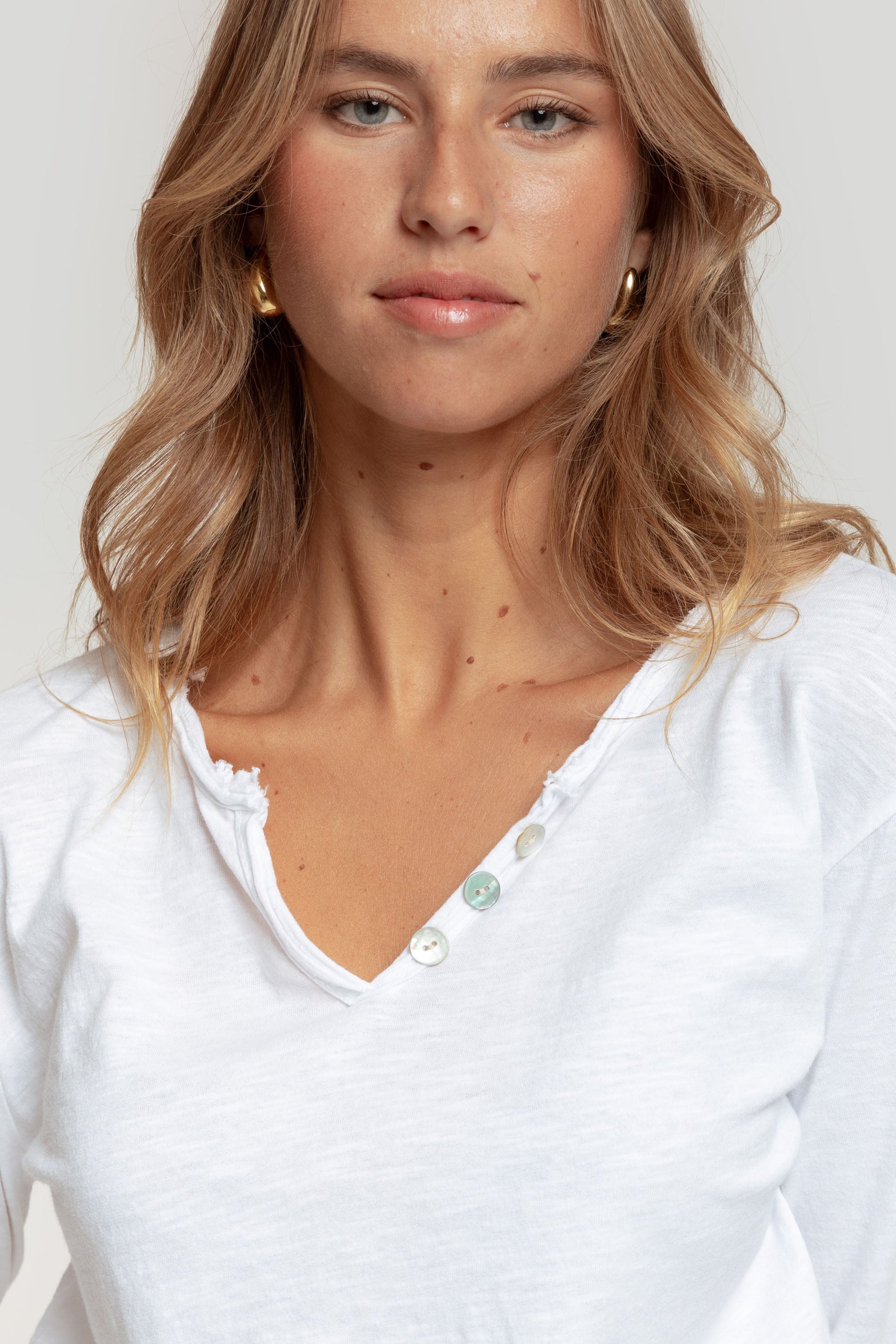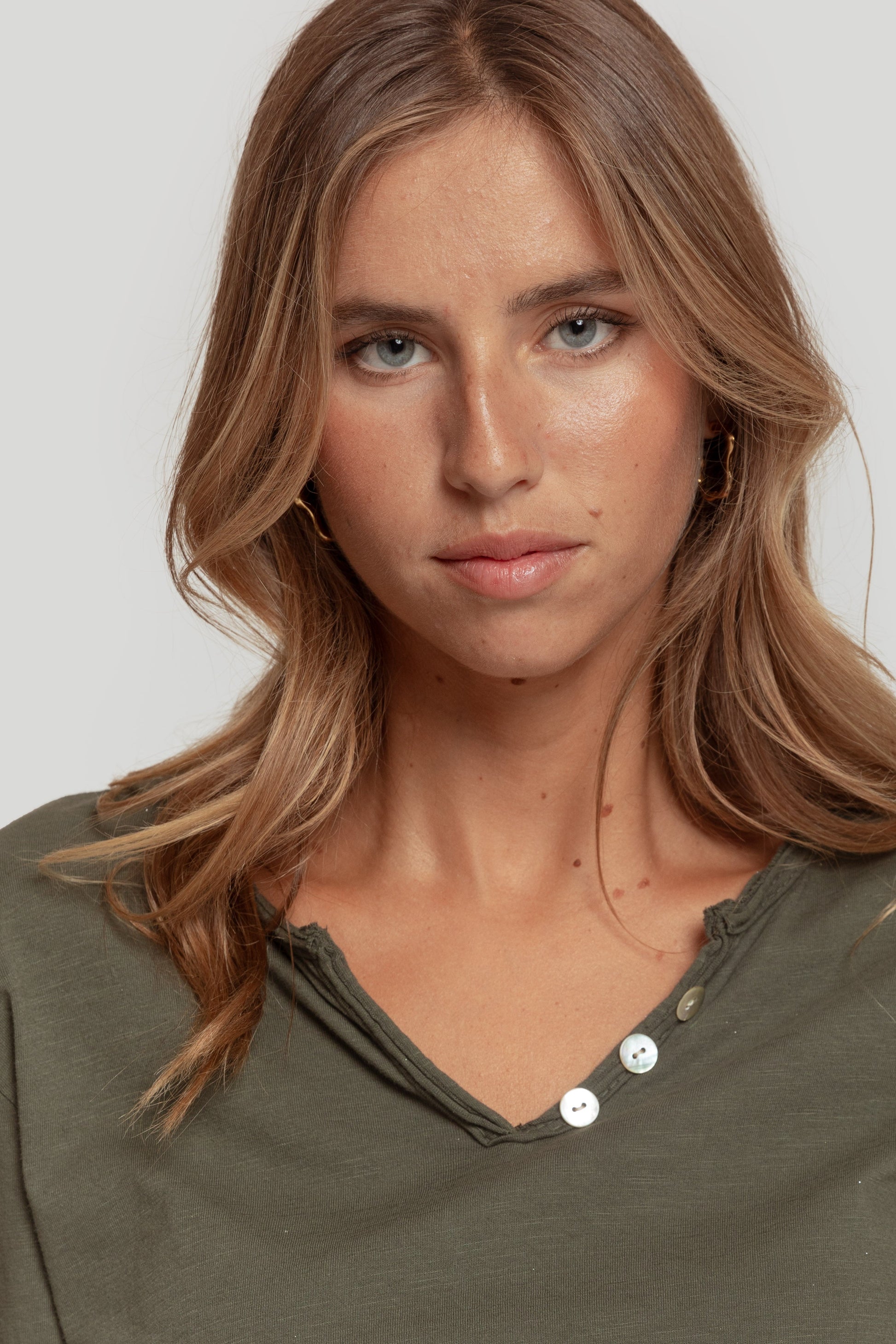 Tejido mezcla de algodón. Diseño básico. Diseño recto. Diseño fluido. Cuello pico. Manga larga. Detalle botones. Terminaciones sin rematar. Talla modelo: S. Altura modelo: 1,70 m.