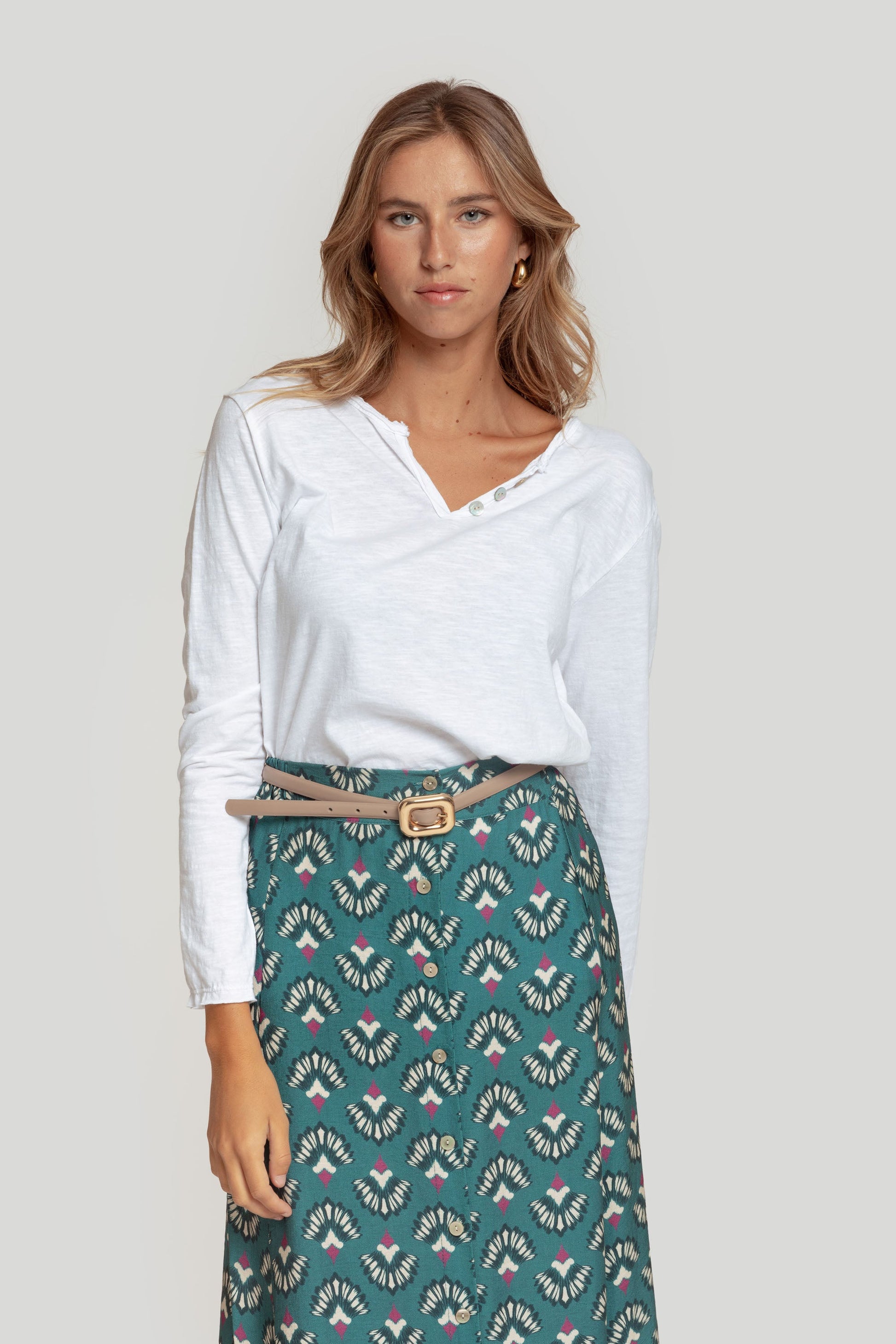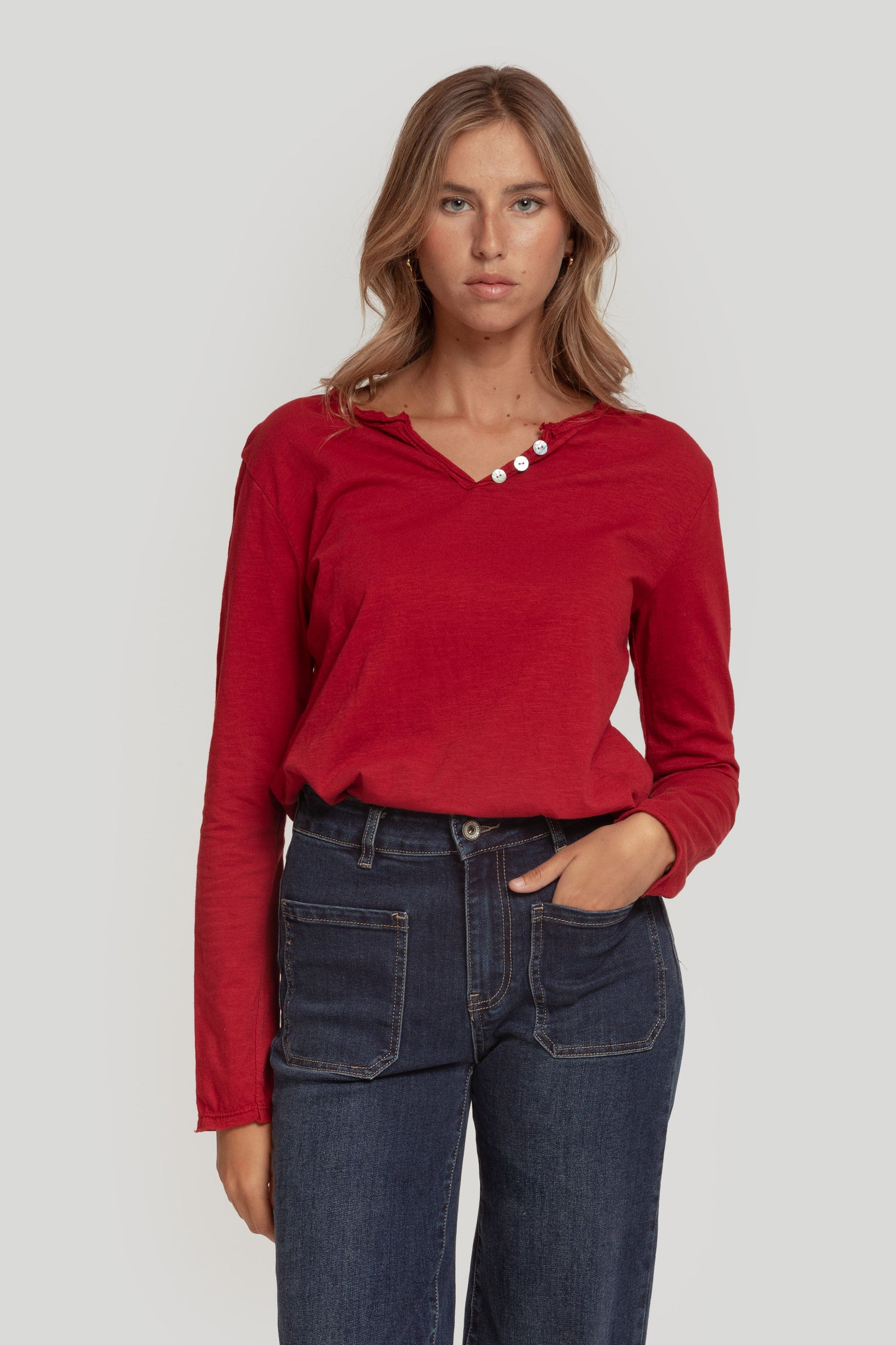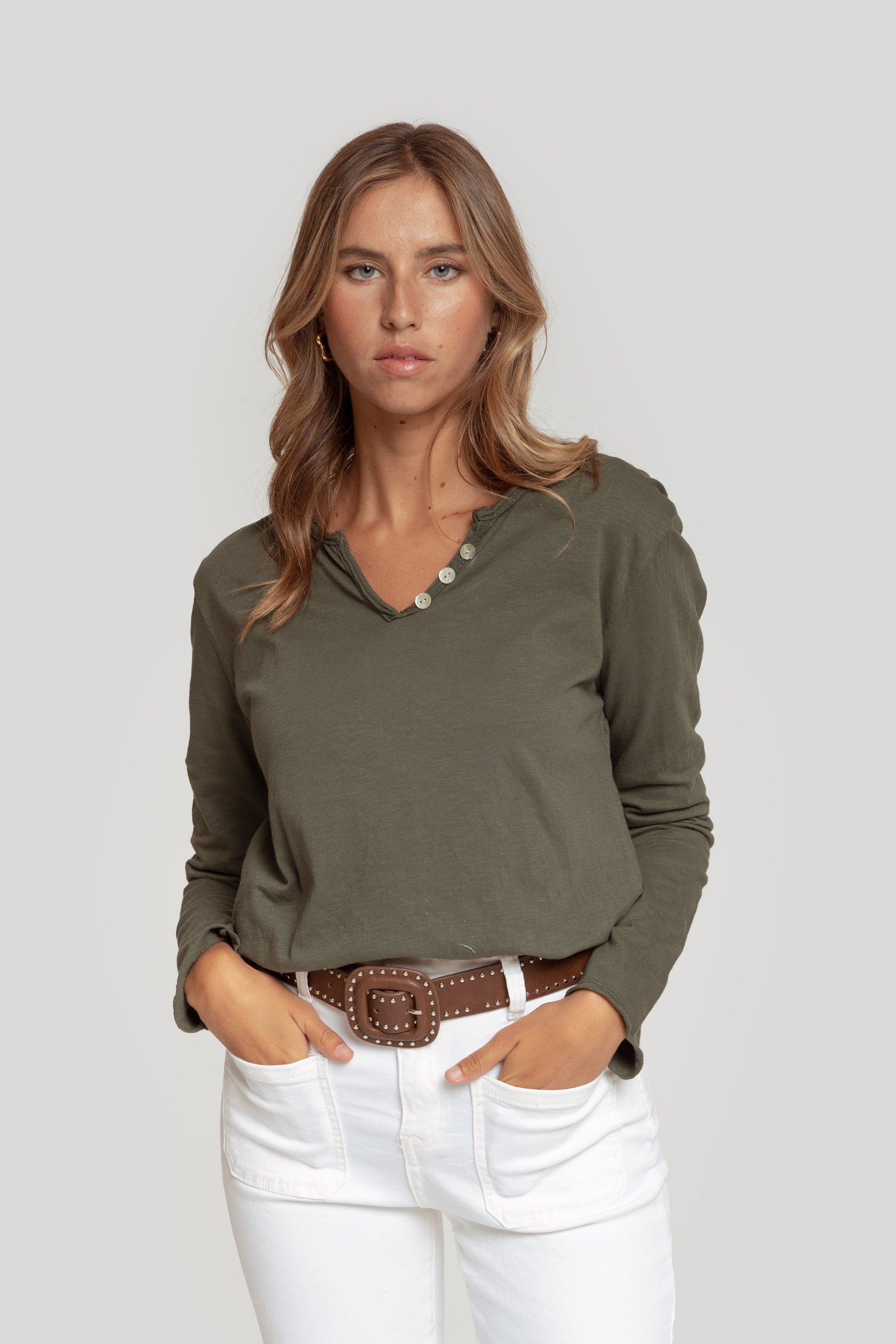 Tejido mezcla de algodón. Diseño básico. Diseño recto. Diseño fluido. Cuello pico. Manga larga. Detalle botones. Terminaciones sin rematar. Talla modelo: S. Altura modelo: 1,70 m.