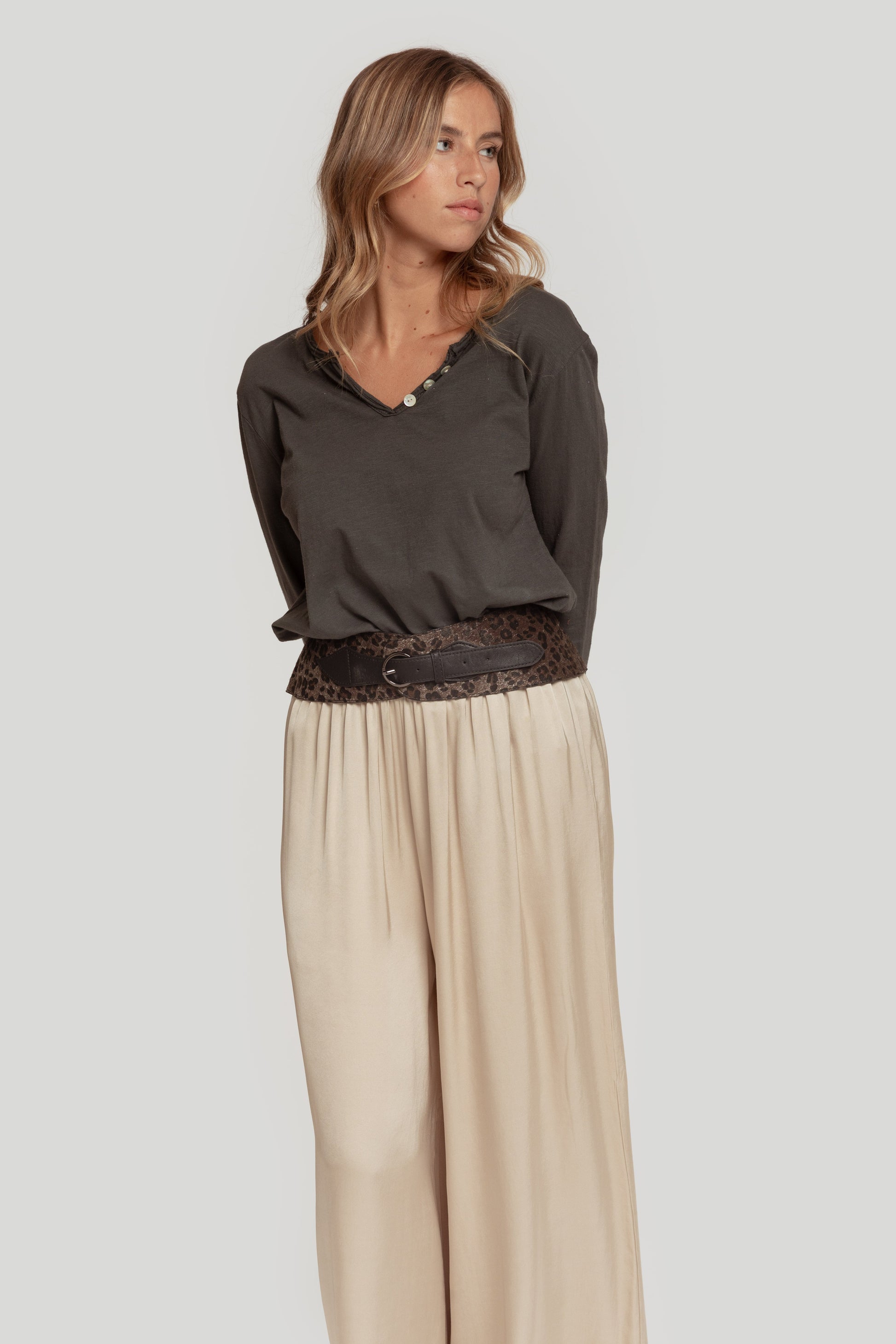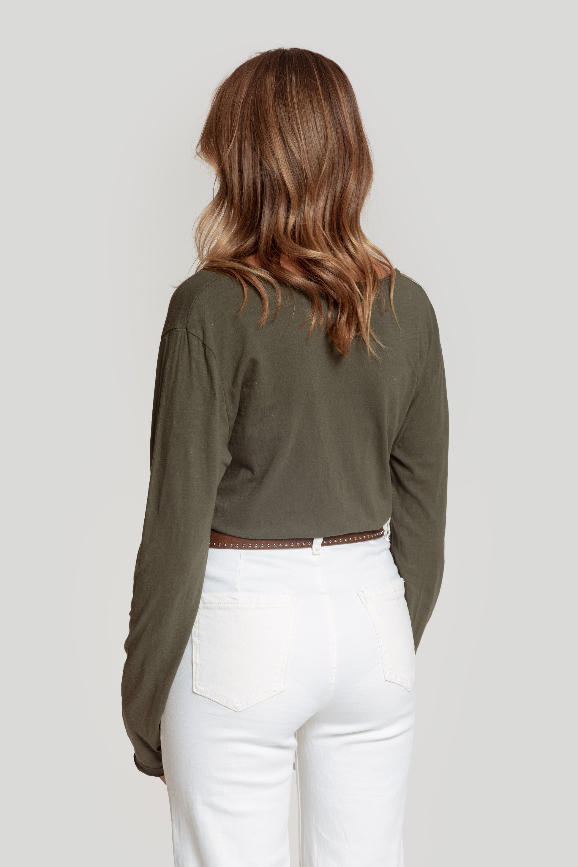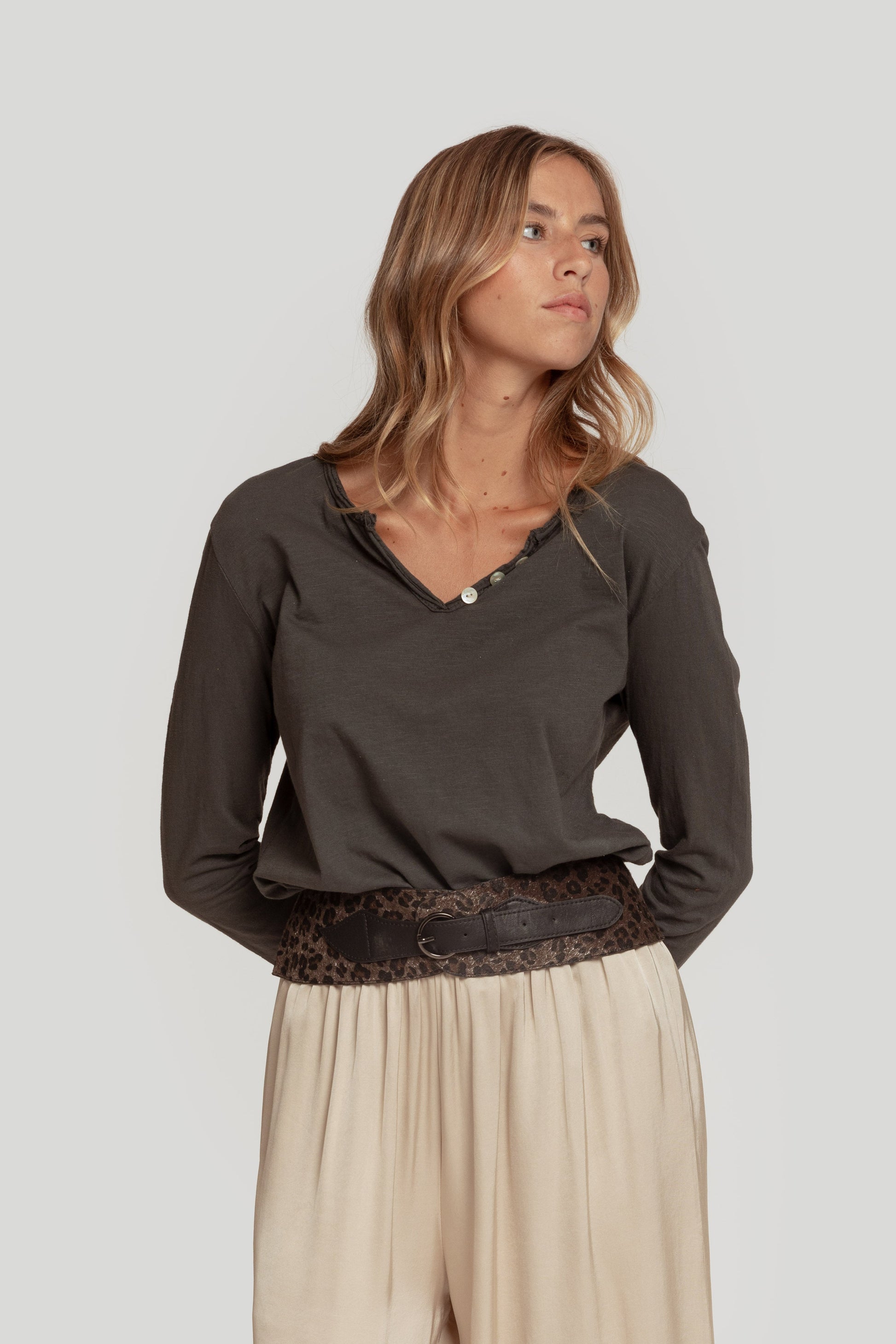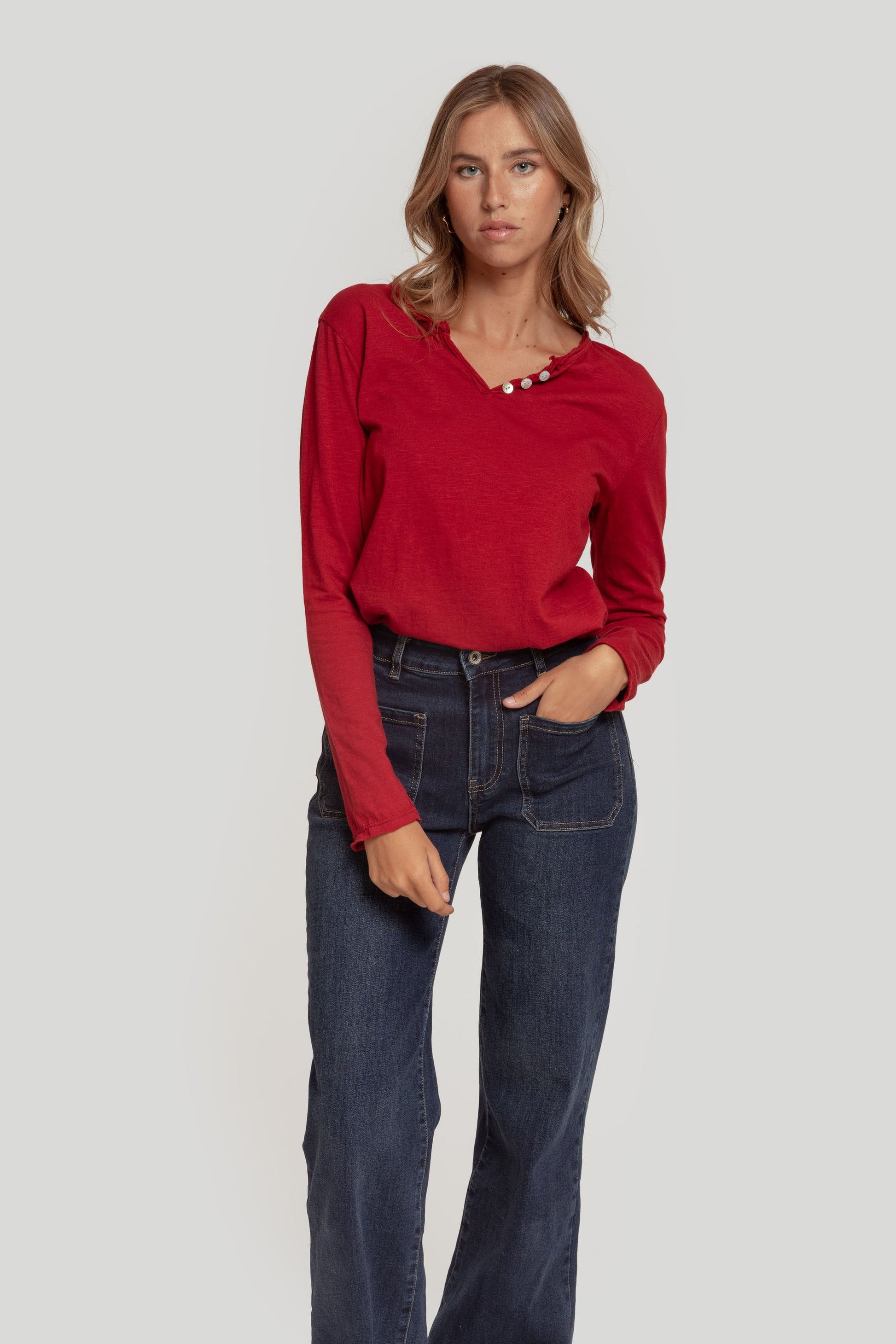 Tejido mezcla de algodón. Diseño básico. Diseño recto. Diseño fluido. Cuello pico. Manga larga. Detalle botones. Terminaciones sin rematar. Talla modelo: S. Altura modelo: 1,70 m.