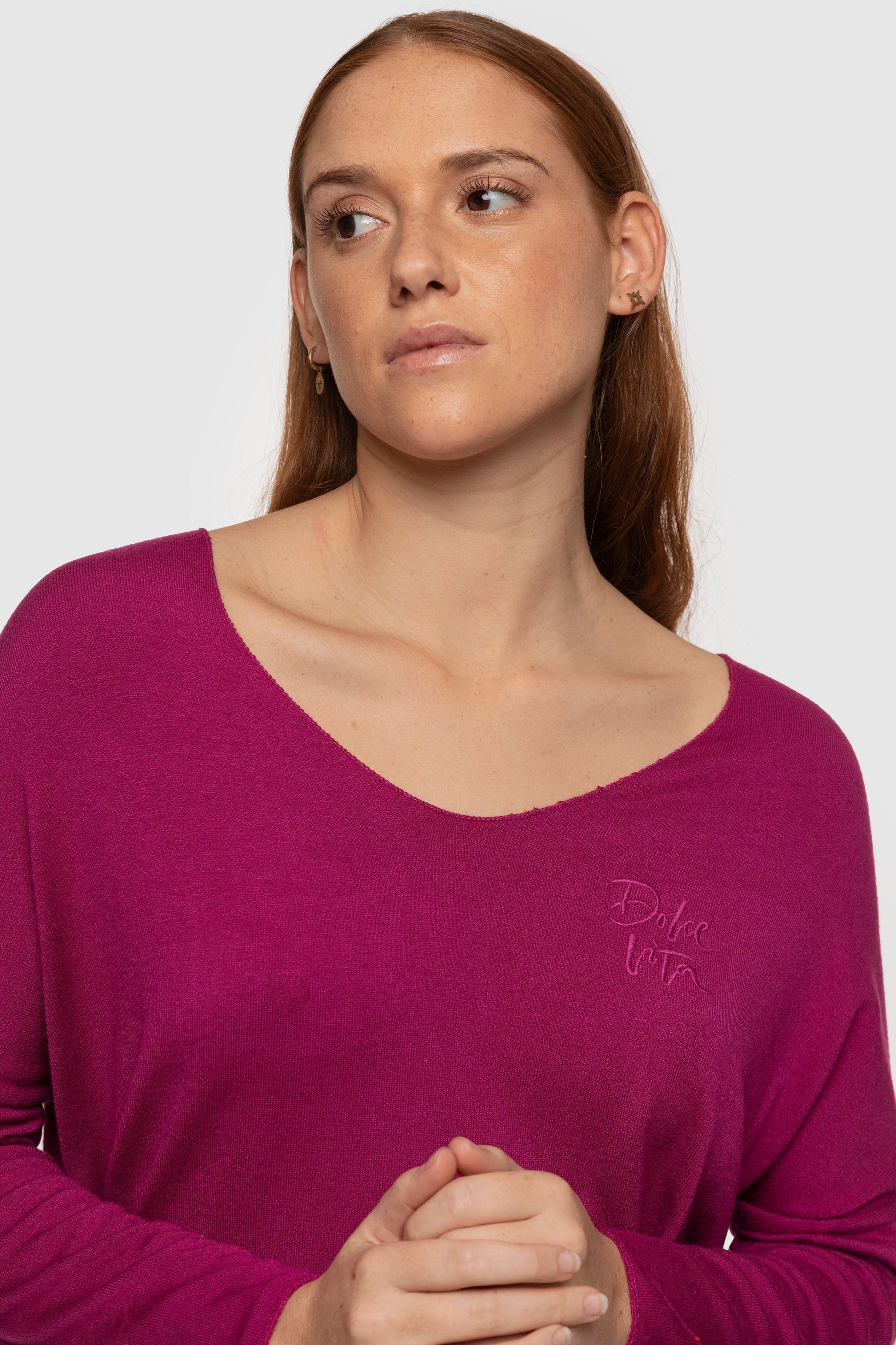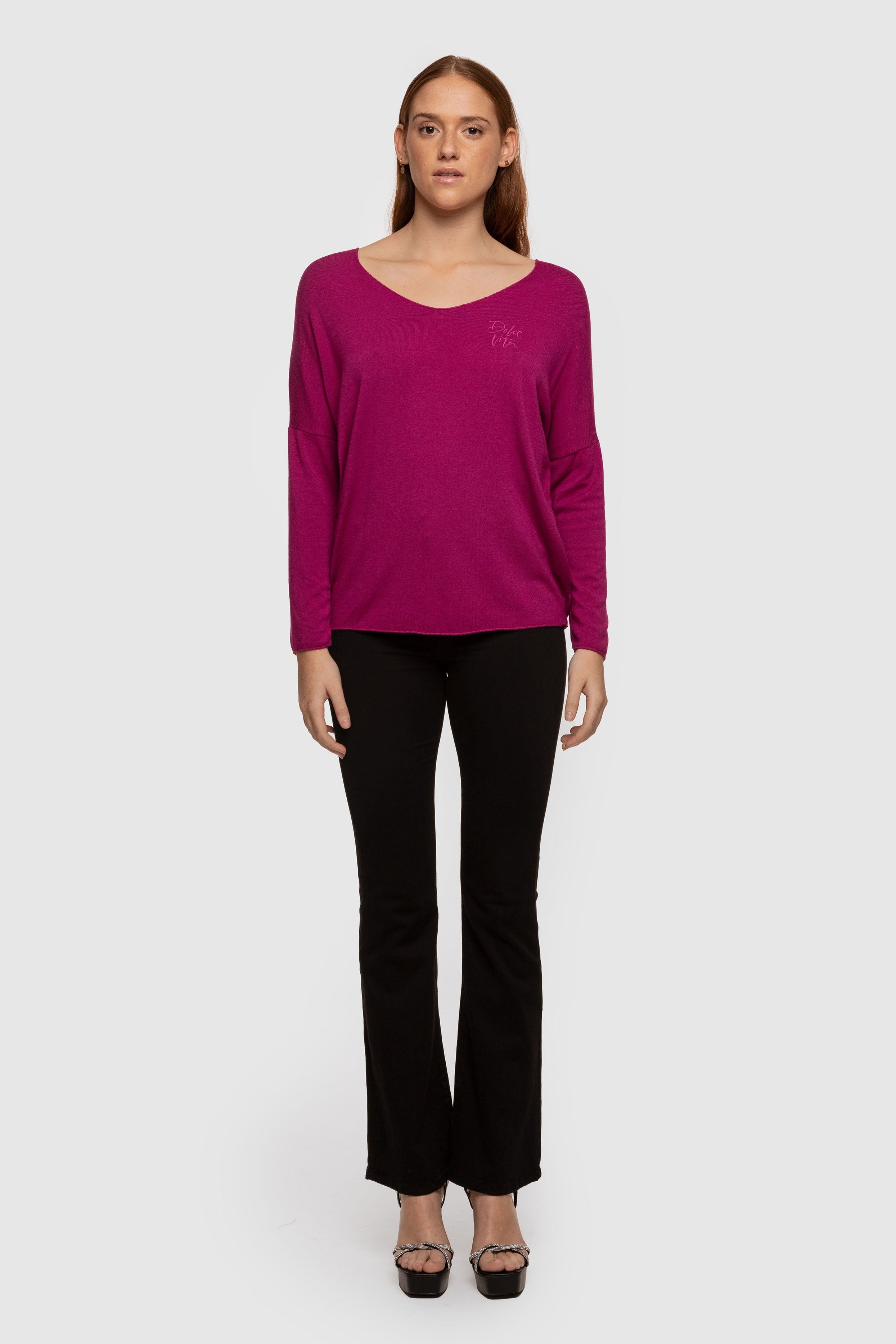 Camiseta Básica. Cuello pico y manga larga. Talla modelo: S. Altura modelo: 1.76 m.