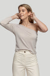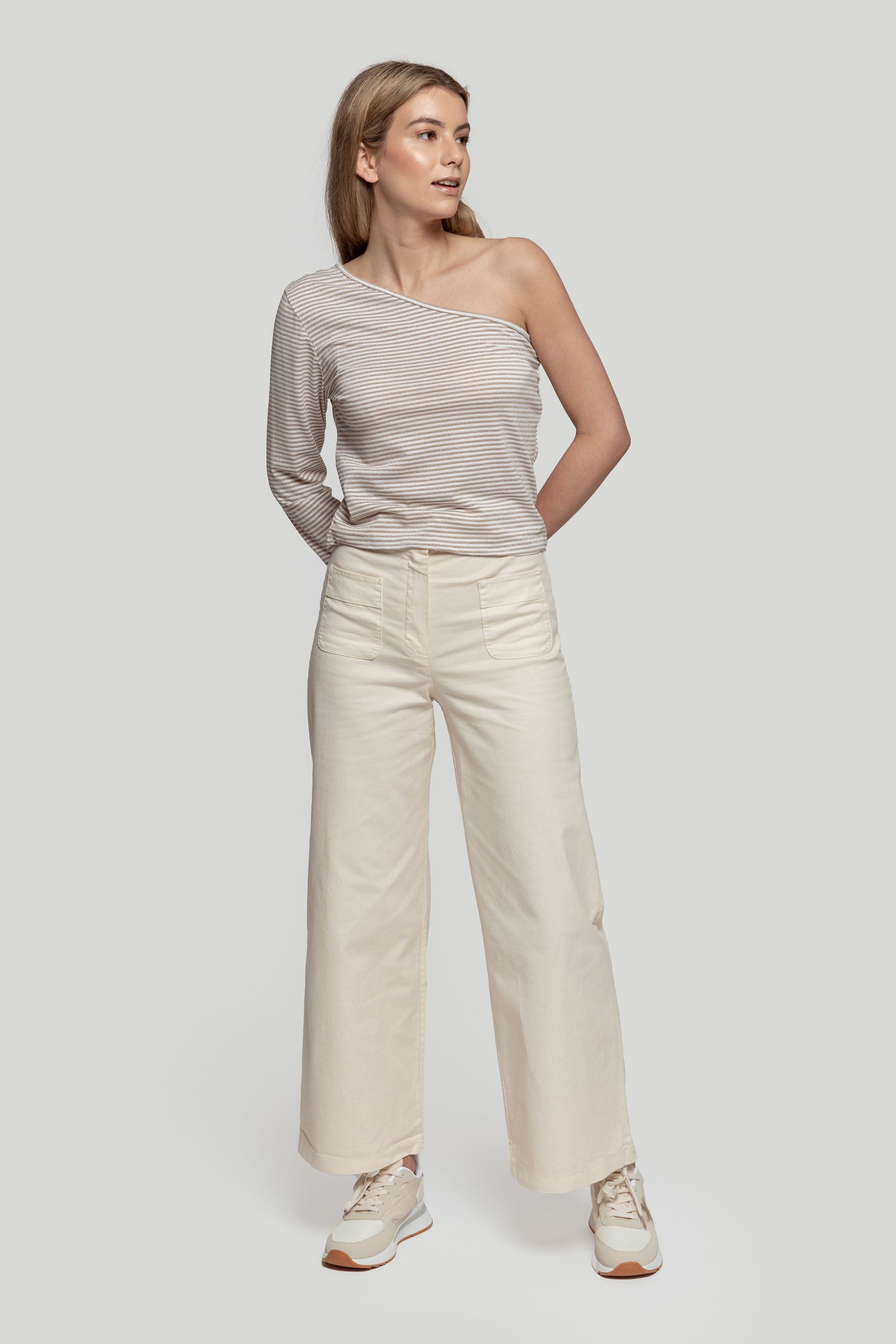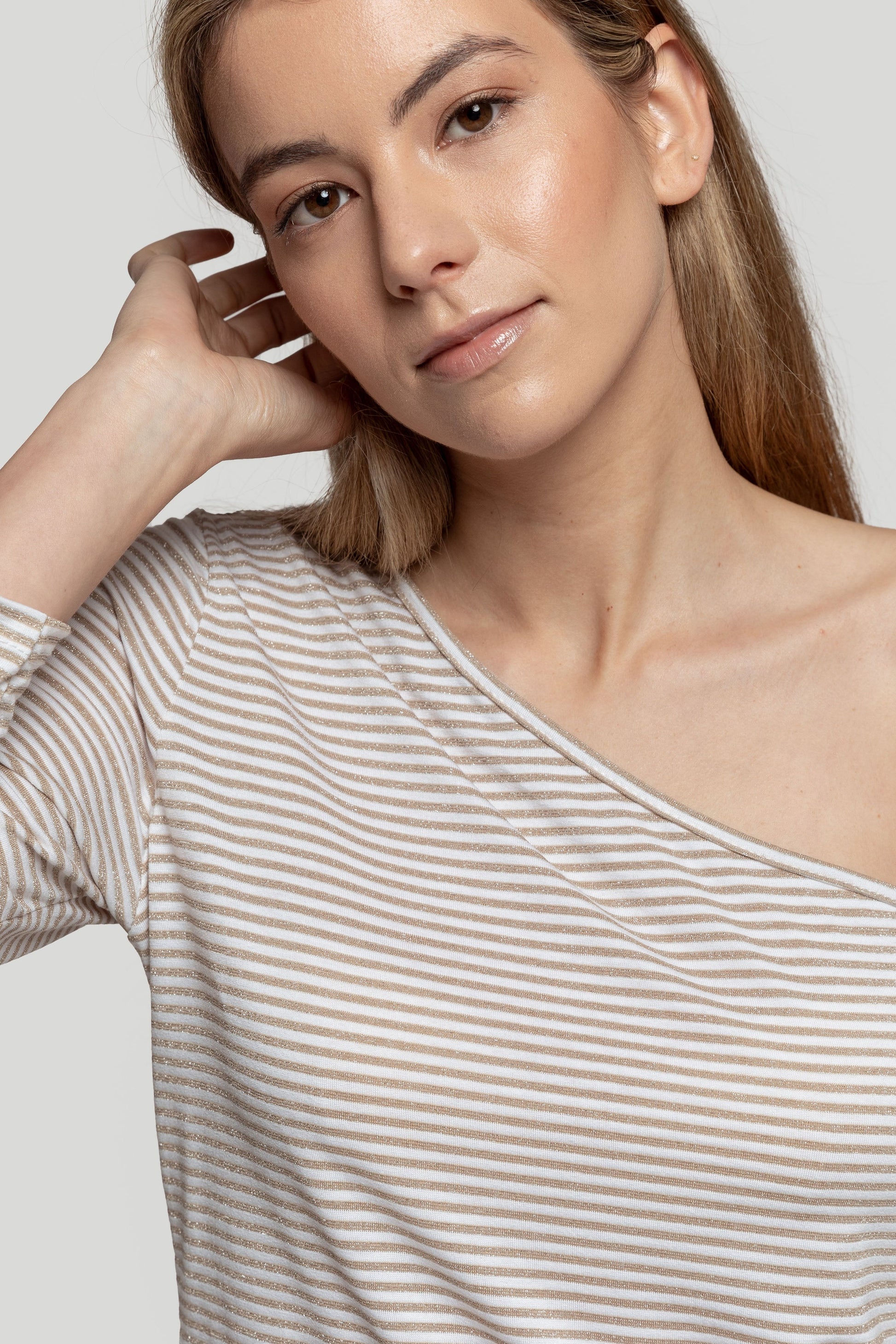 Camiseta de rayas. Tejido de acabado brillante. Diseño recto. Cuello asimétrico. Manga larga. Talla modelo: S. Altura modelo 1,70 m.
