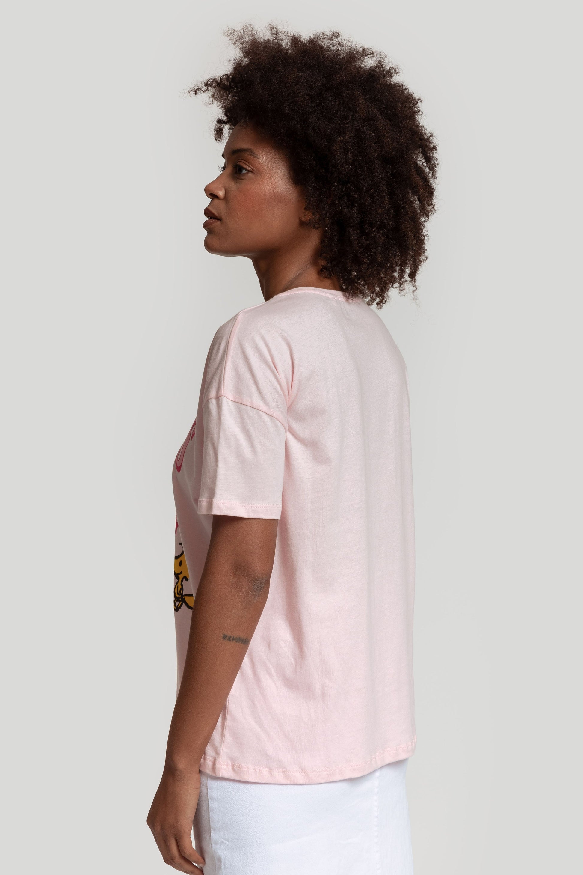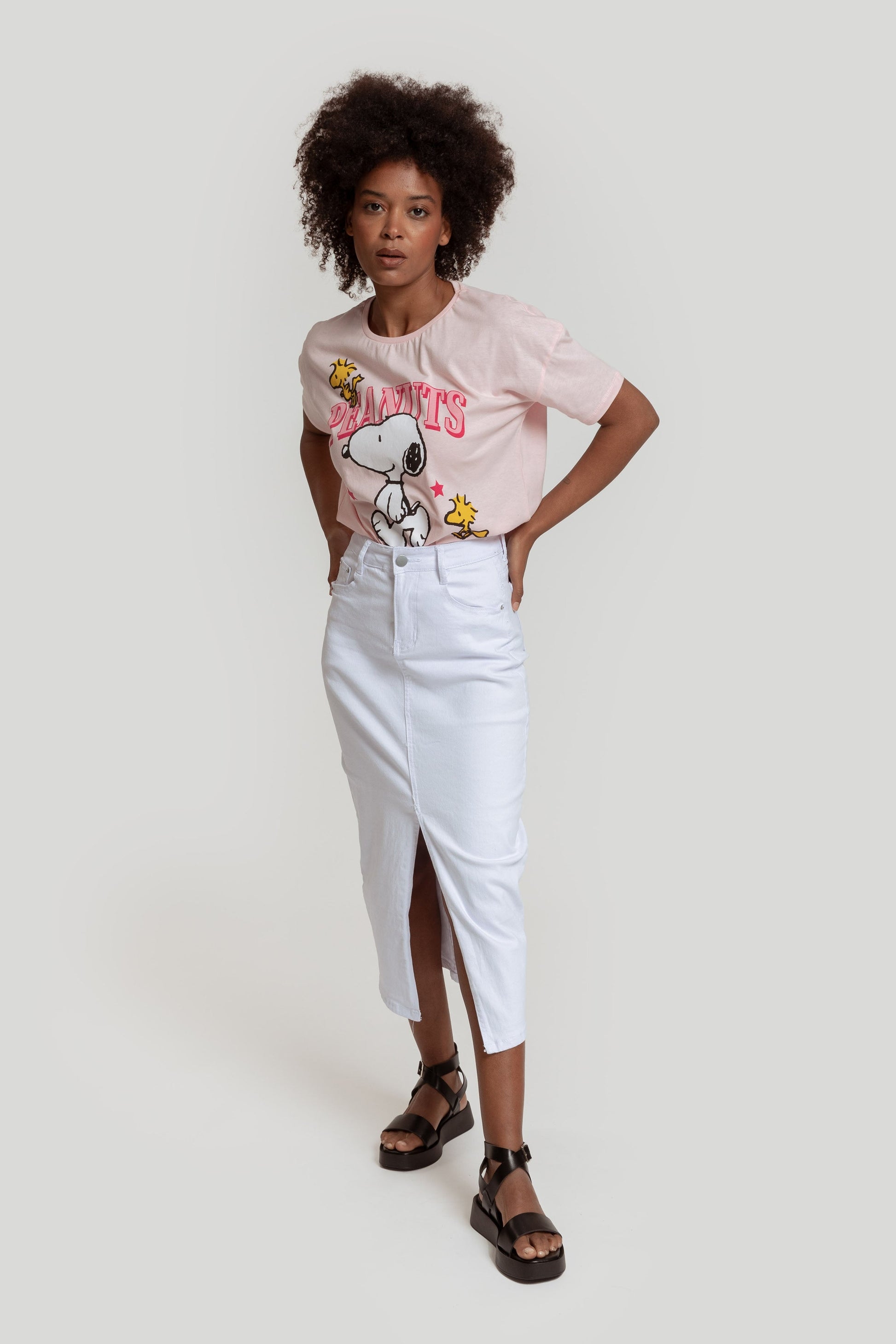 Tejido de algodón. Estampado de snoppy. Cuello redondo. Manga corta. Diseño recto. Licencia autorizada. Talla modelo: S. Altura modelo: 1,65 m.