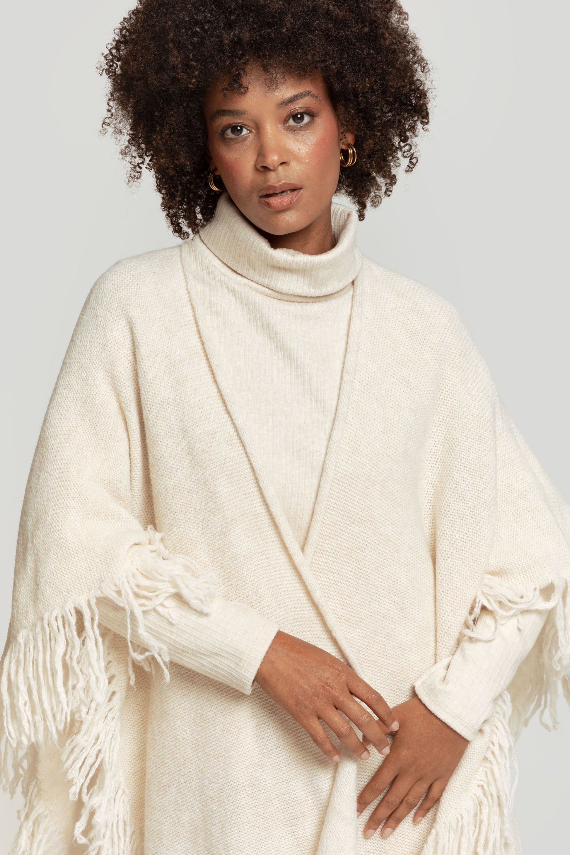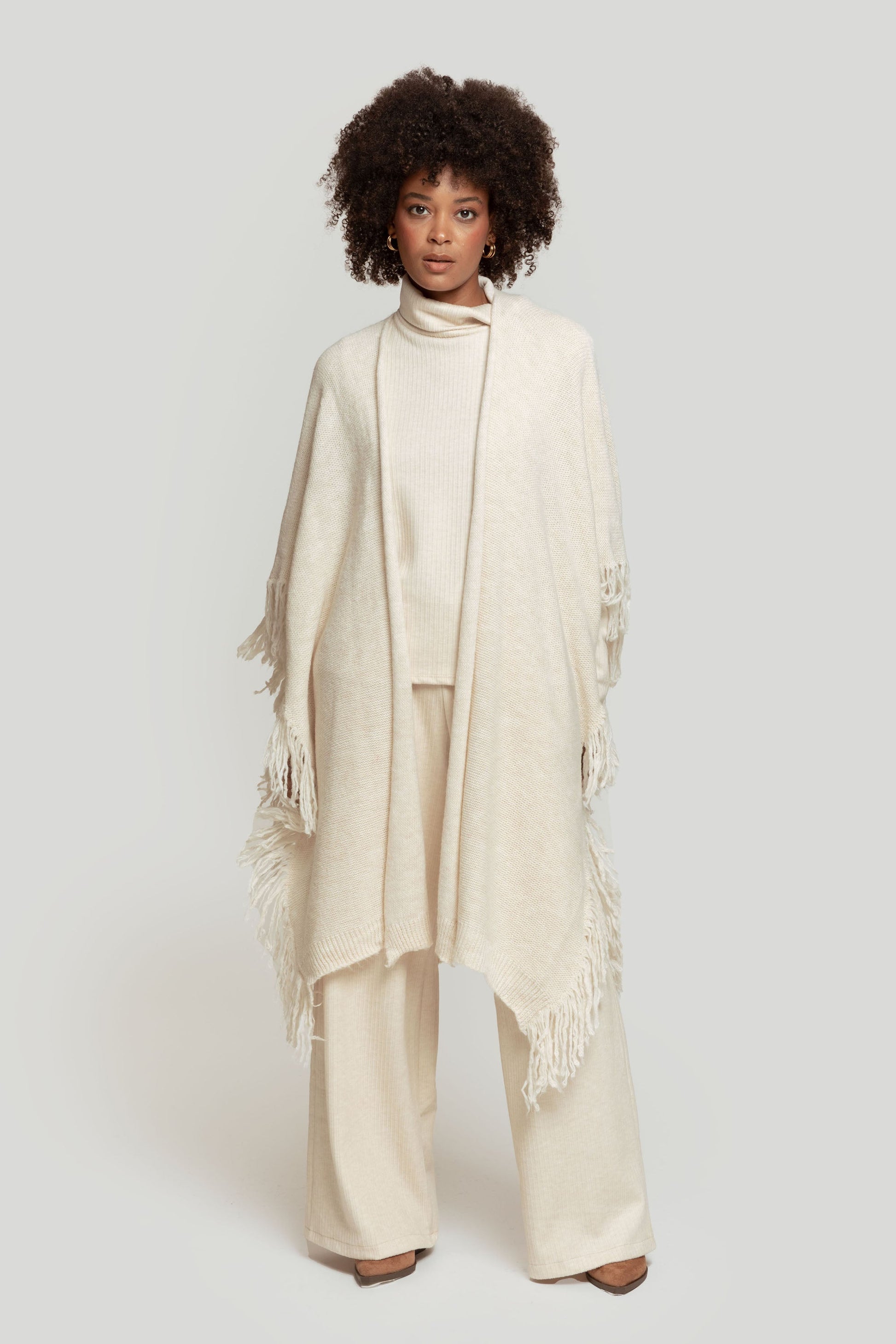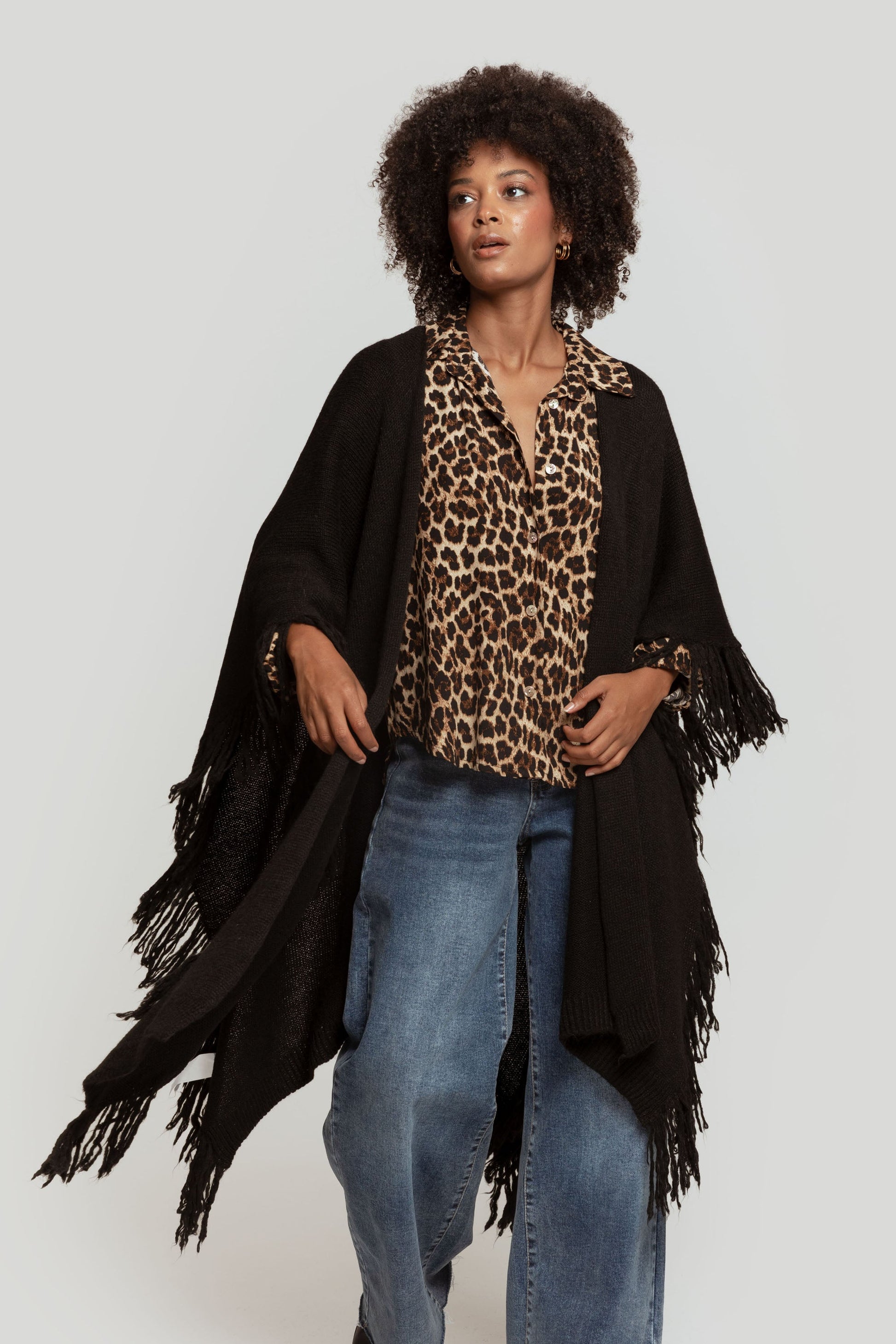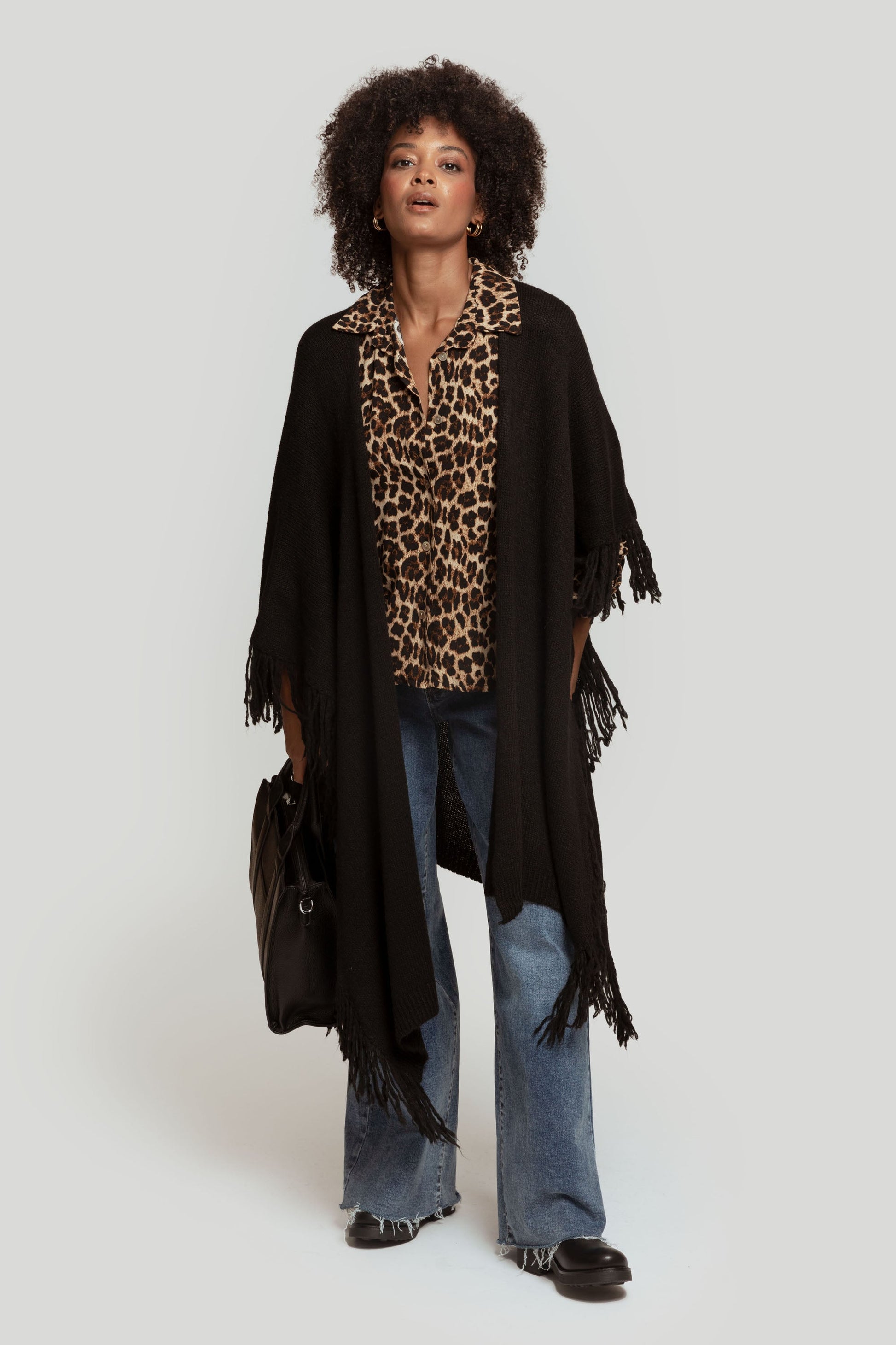 Tejido de punto. Diseño tipo cárdigan. Diseño largo. Sin mangas. Acabado flecos. Talla modelo: S. Altura modelo: 1,66 m.