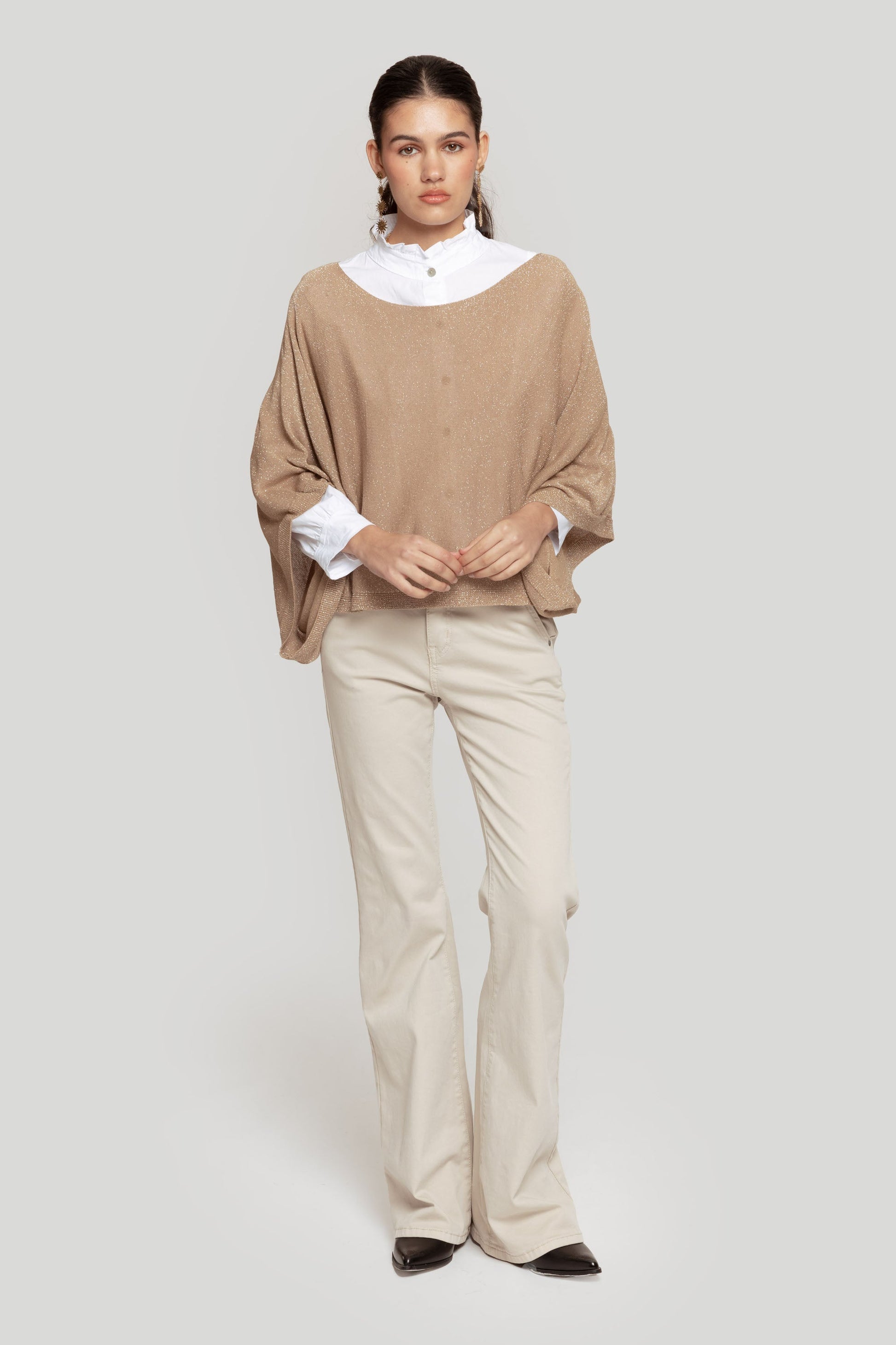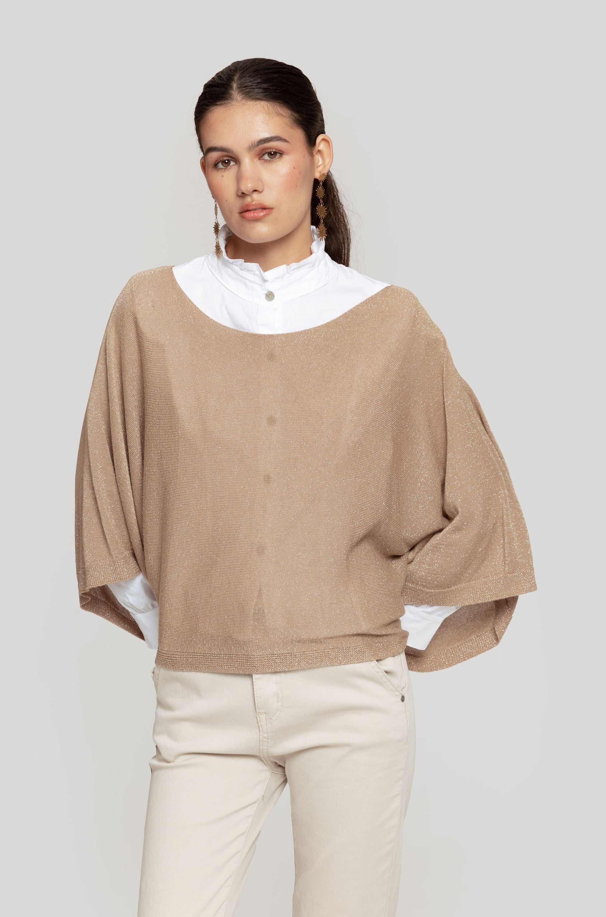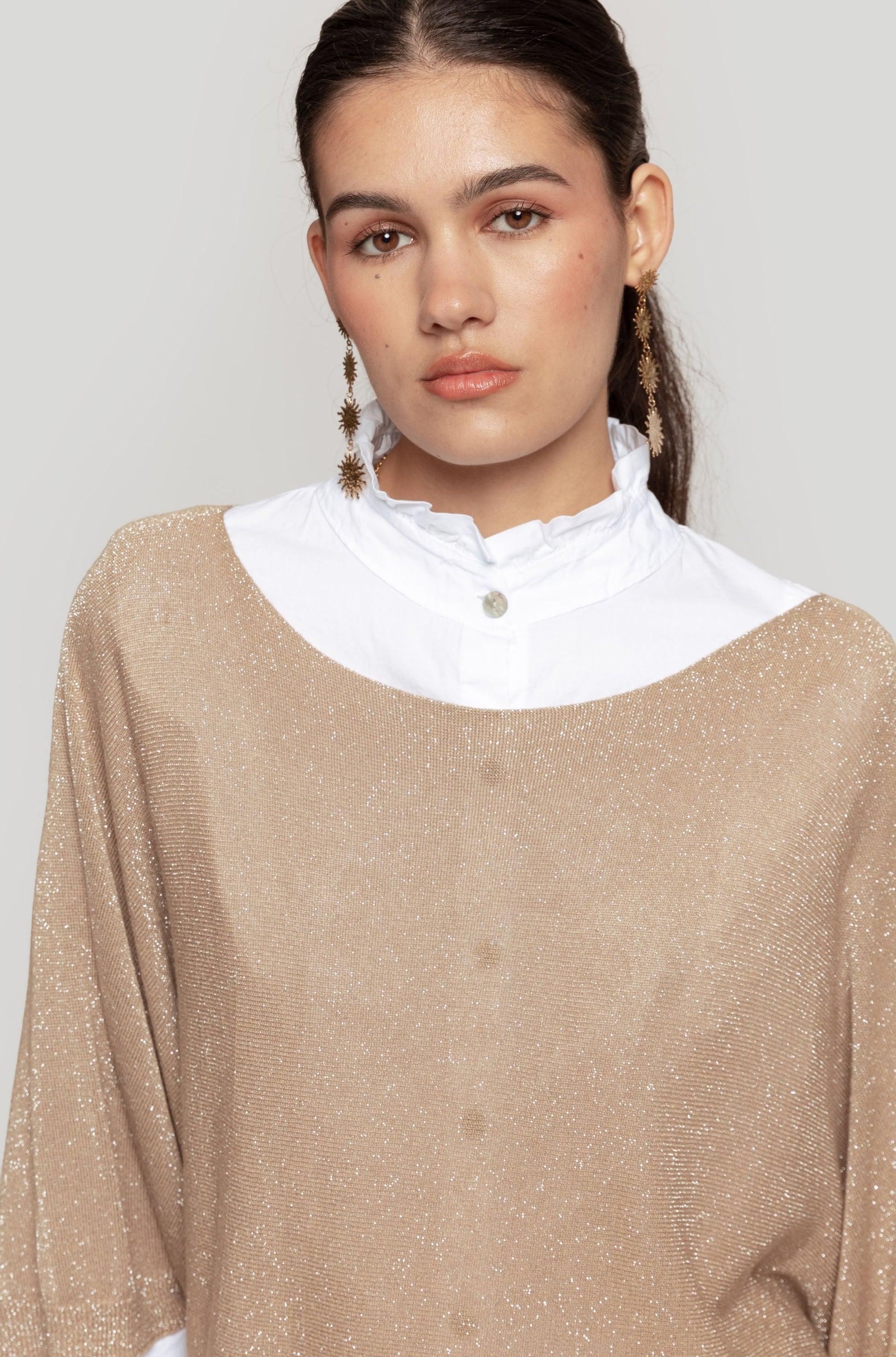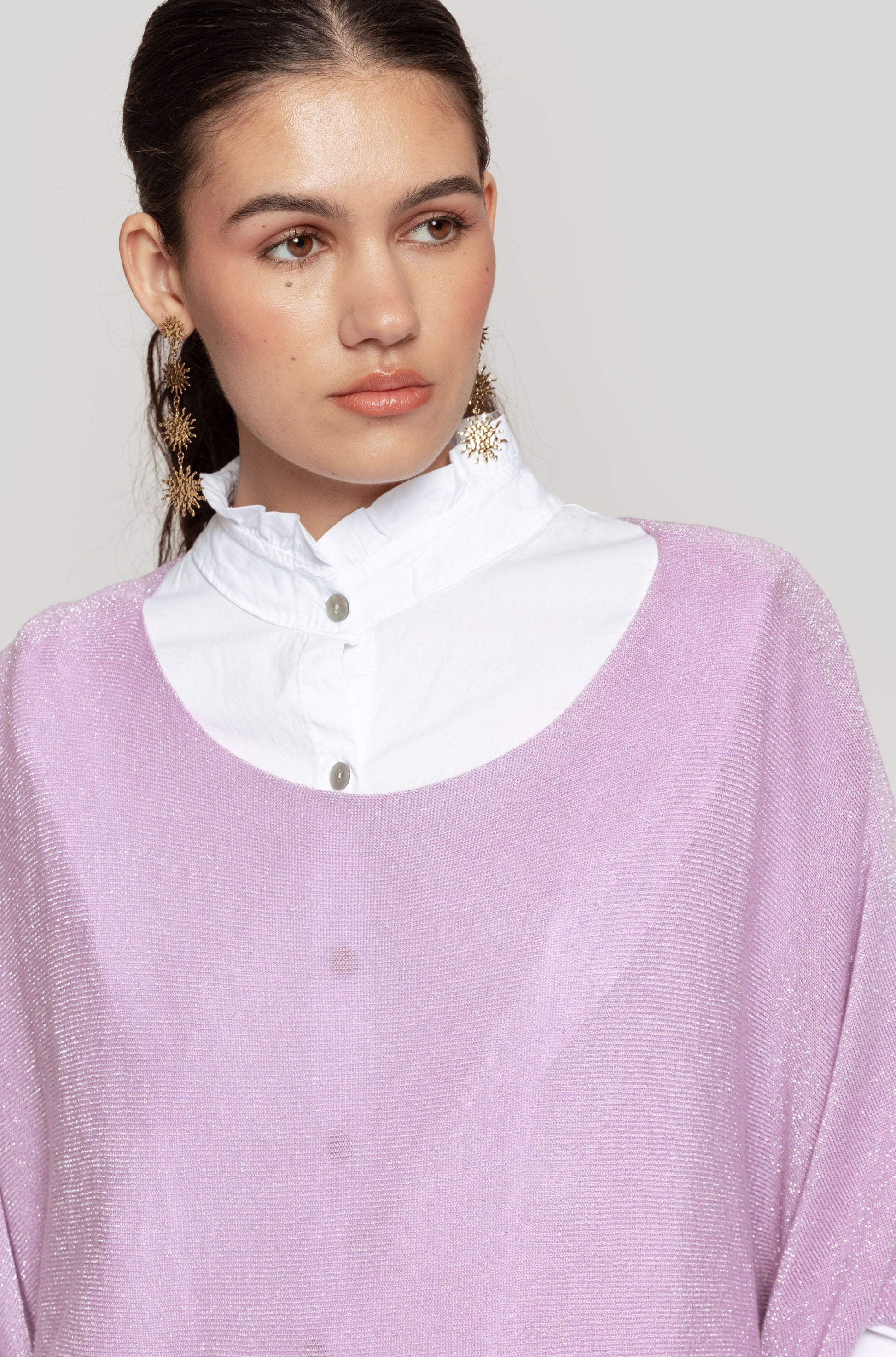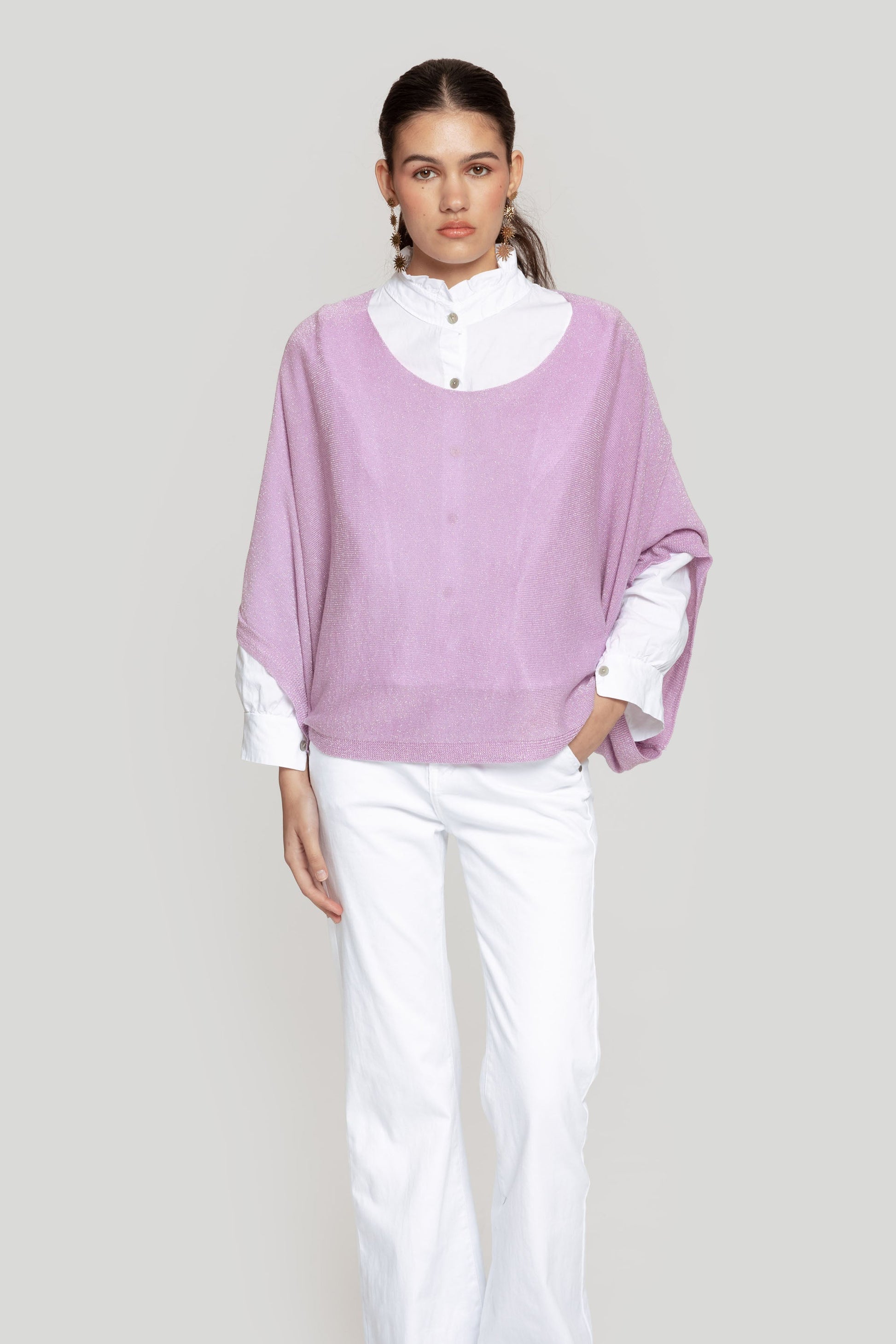 Tejido de brillo. Tejido de punto fino. Diseño en picos. Diseño básico. Cuello pico. Manga amplia. Disponible en varios colores. Talla única. Altura modelo: 1.75 m.