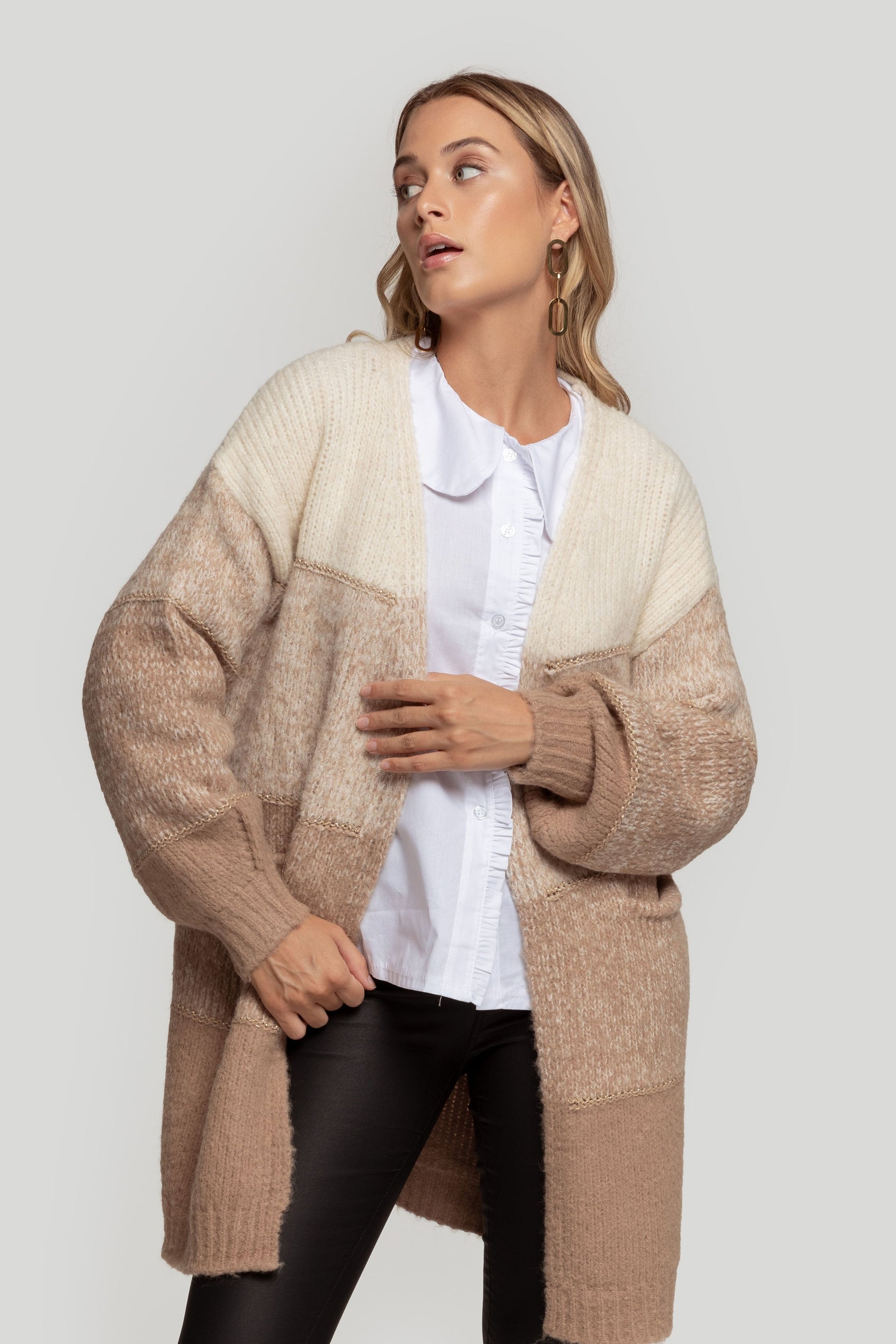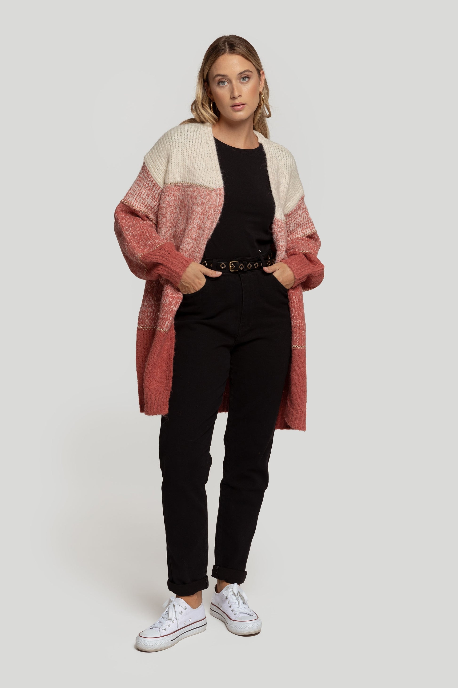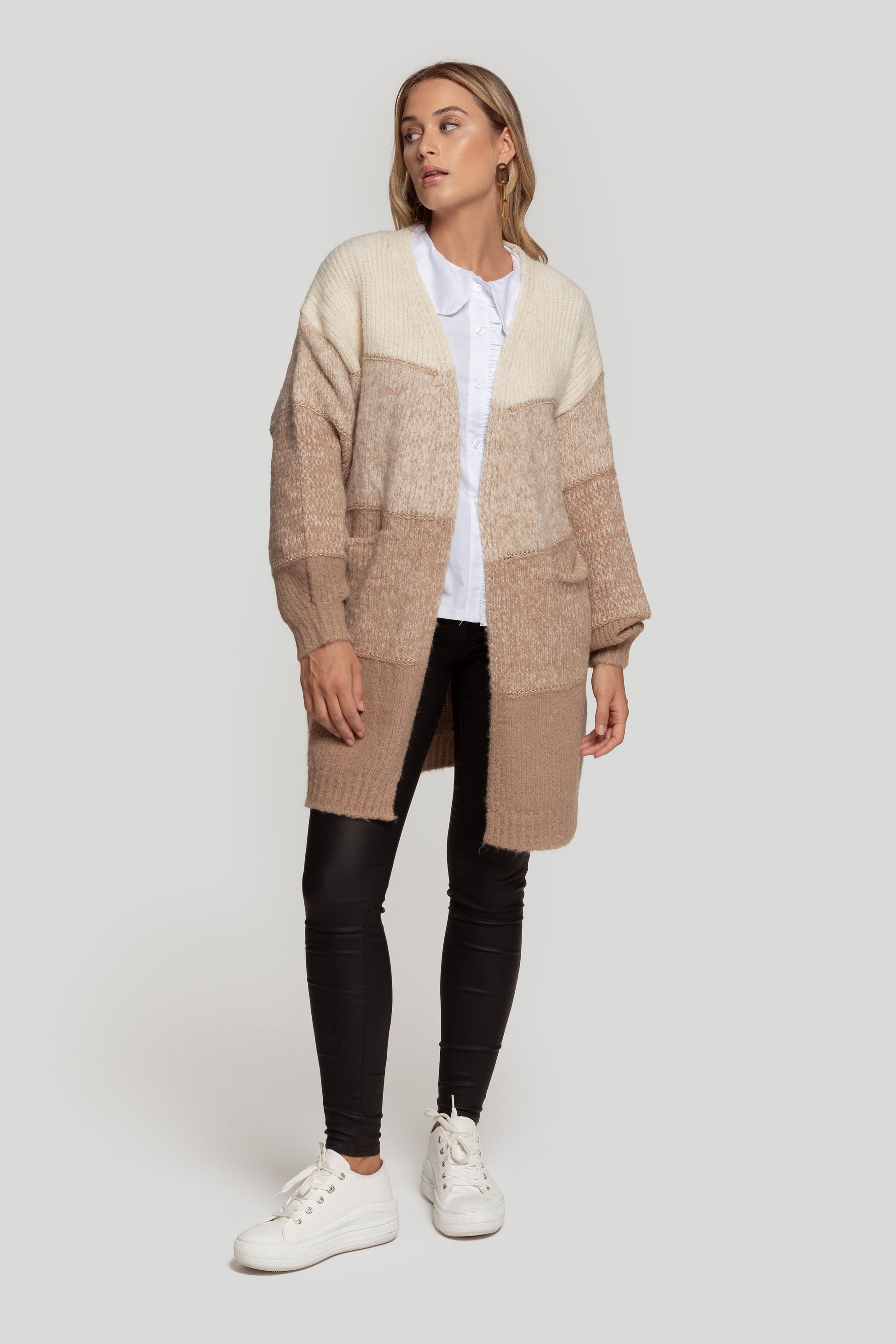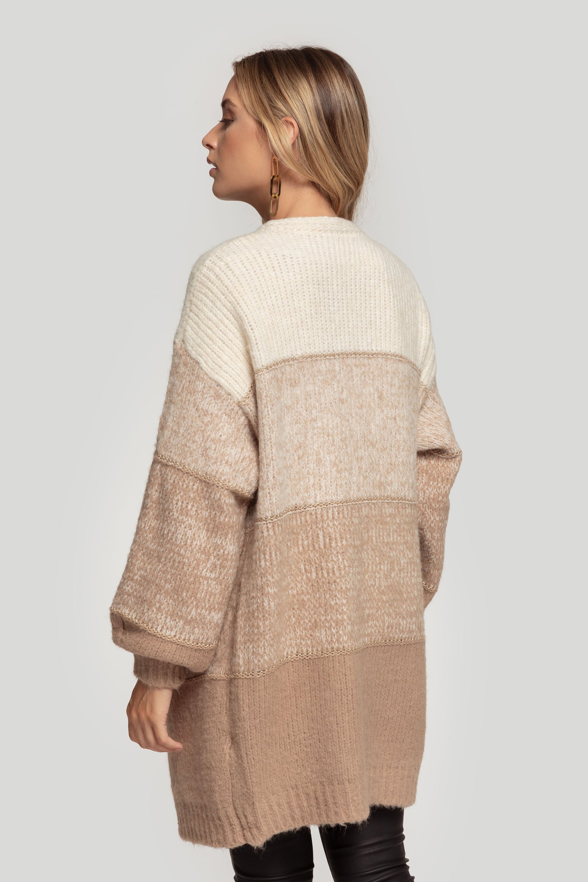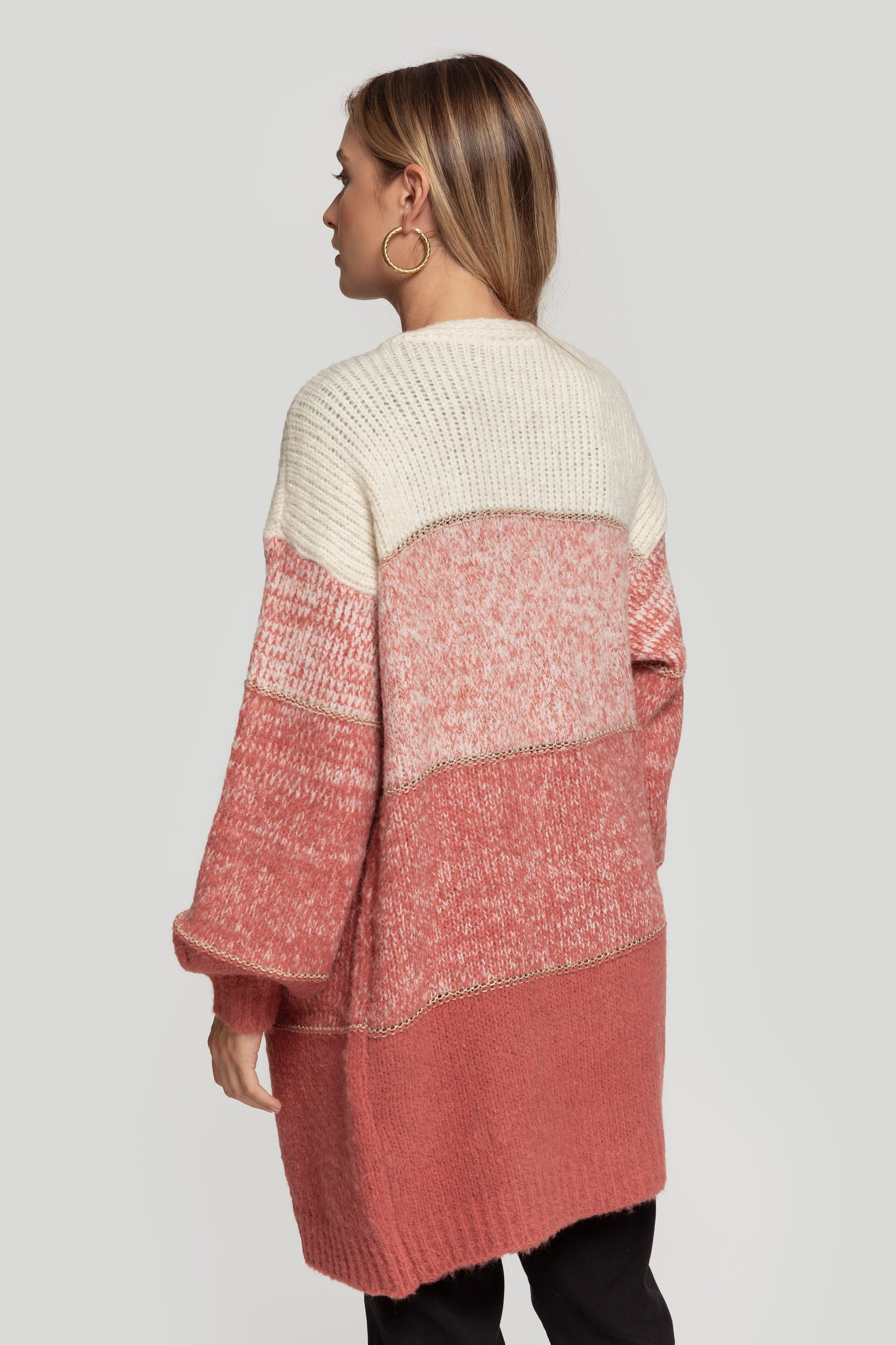 Tejido de punto grueso. Diseño recto. Diseño bicolor. Diseño recto. Abierto. Manga larga. Dos bolDetalle con trama brillante. Terminaciones en rib. Talla única. Altura modelo 1,66 m.