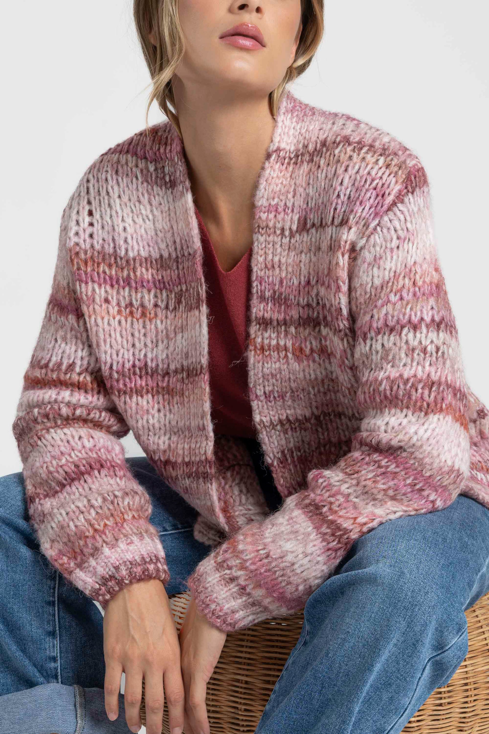 Tejido de punto. Diseño corto. Manga larga. Dos bolsillos. Sin cierre.