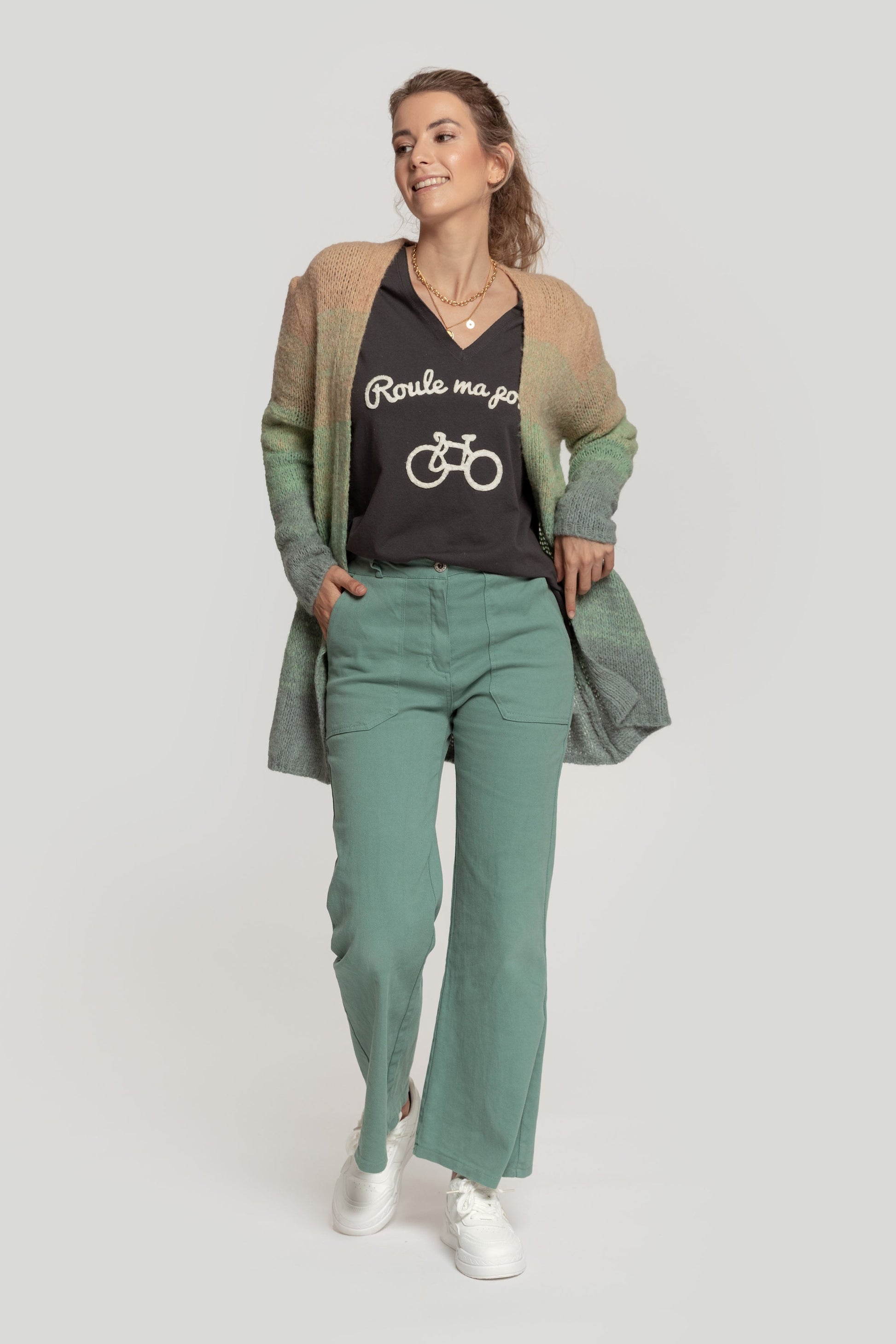 Tejido de punto. Diseño estampado. Diseño recto. Diseño fluido. Diseño largo. Cuello chimenea. Manga larga. Abierto. Acabado lana. Talla S. Altura modelo 1,70 m.