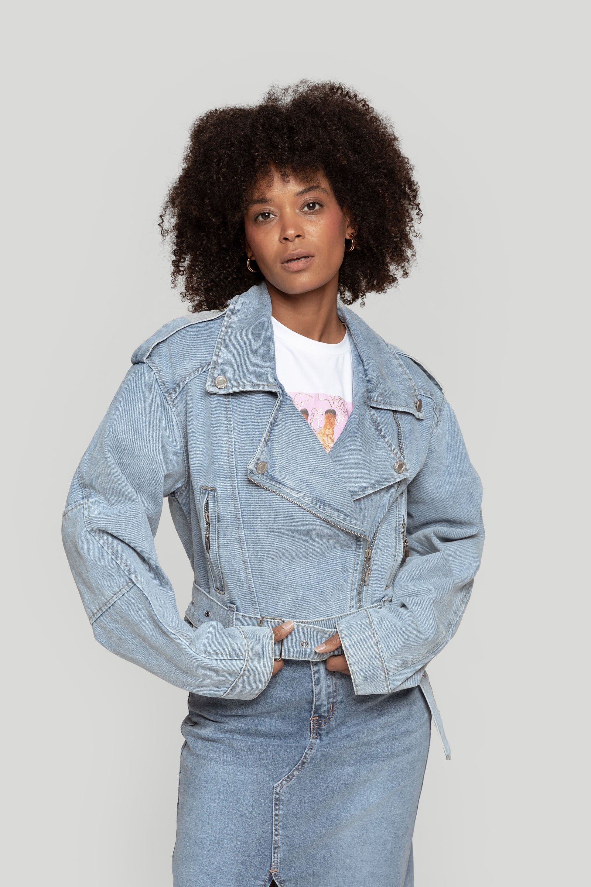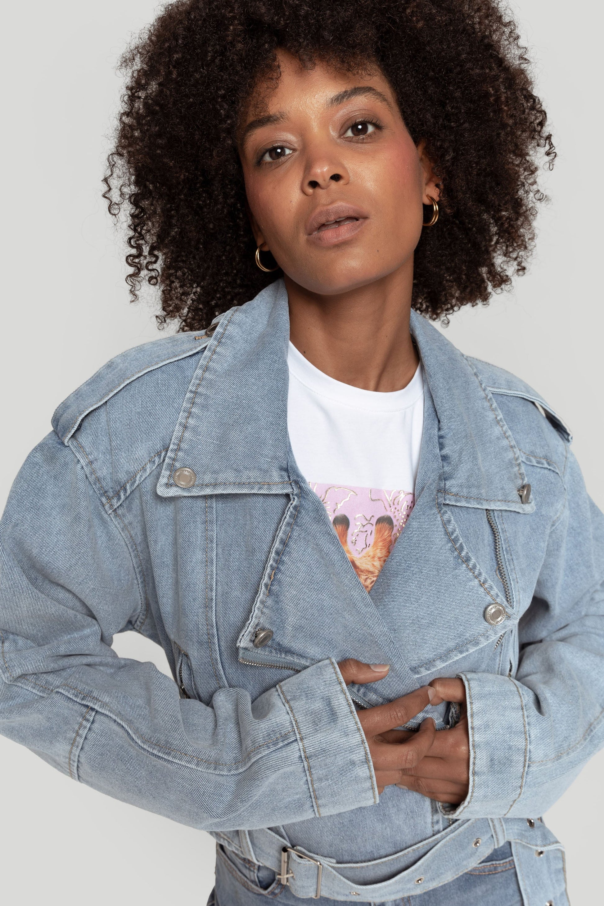 Tejido de algodón. Diseño cropped. Diseño cruzado. Cuello solapa. Manga larga. Puño abotonado. Cierre frontal con cremallera. Bolsillos laterales de cremallera. Bajo con correa. Talla modelo: S. Altura modelo 1,66 m.