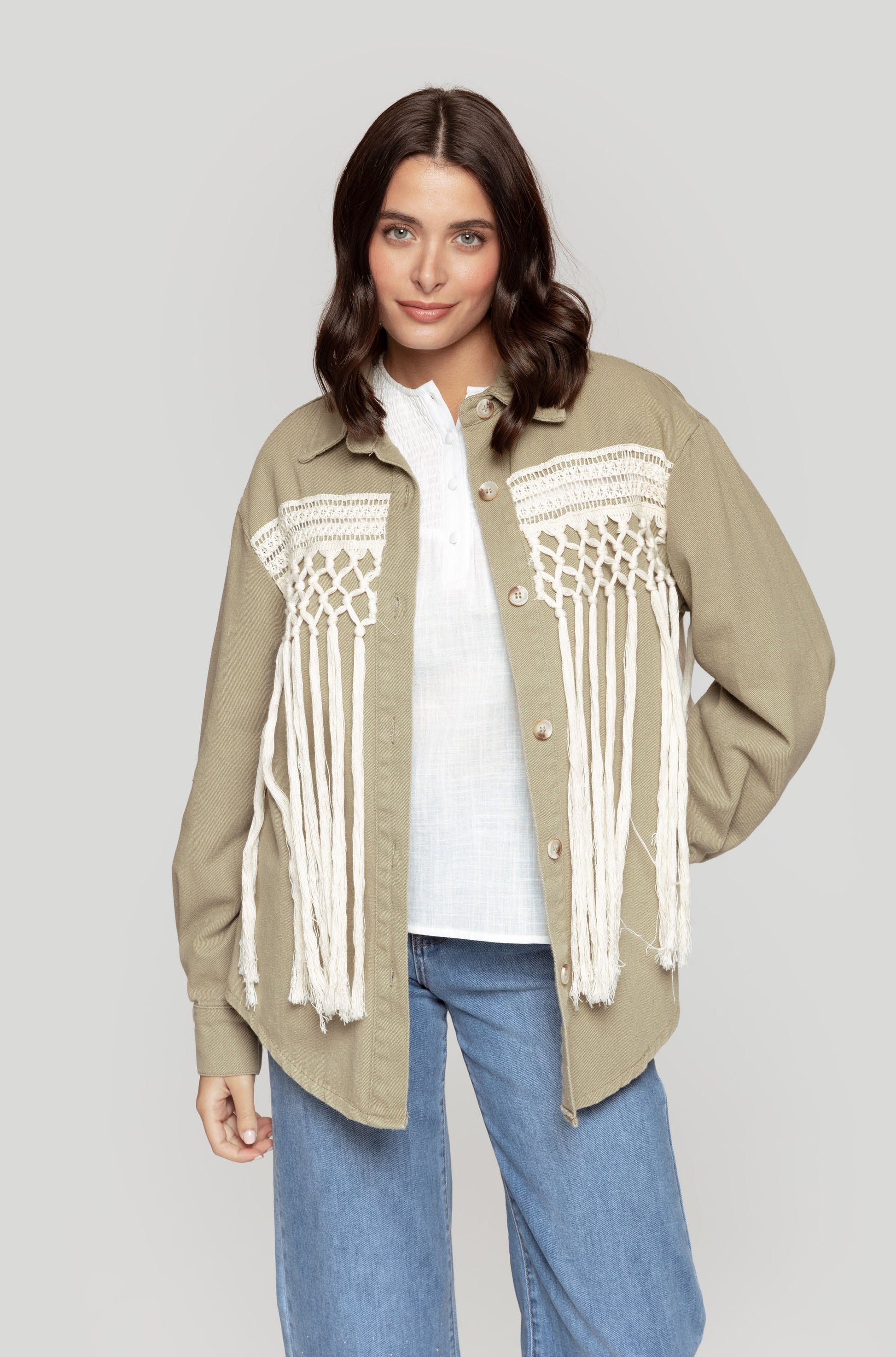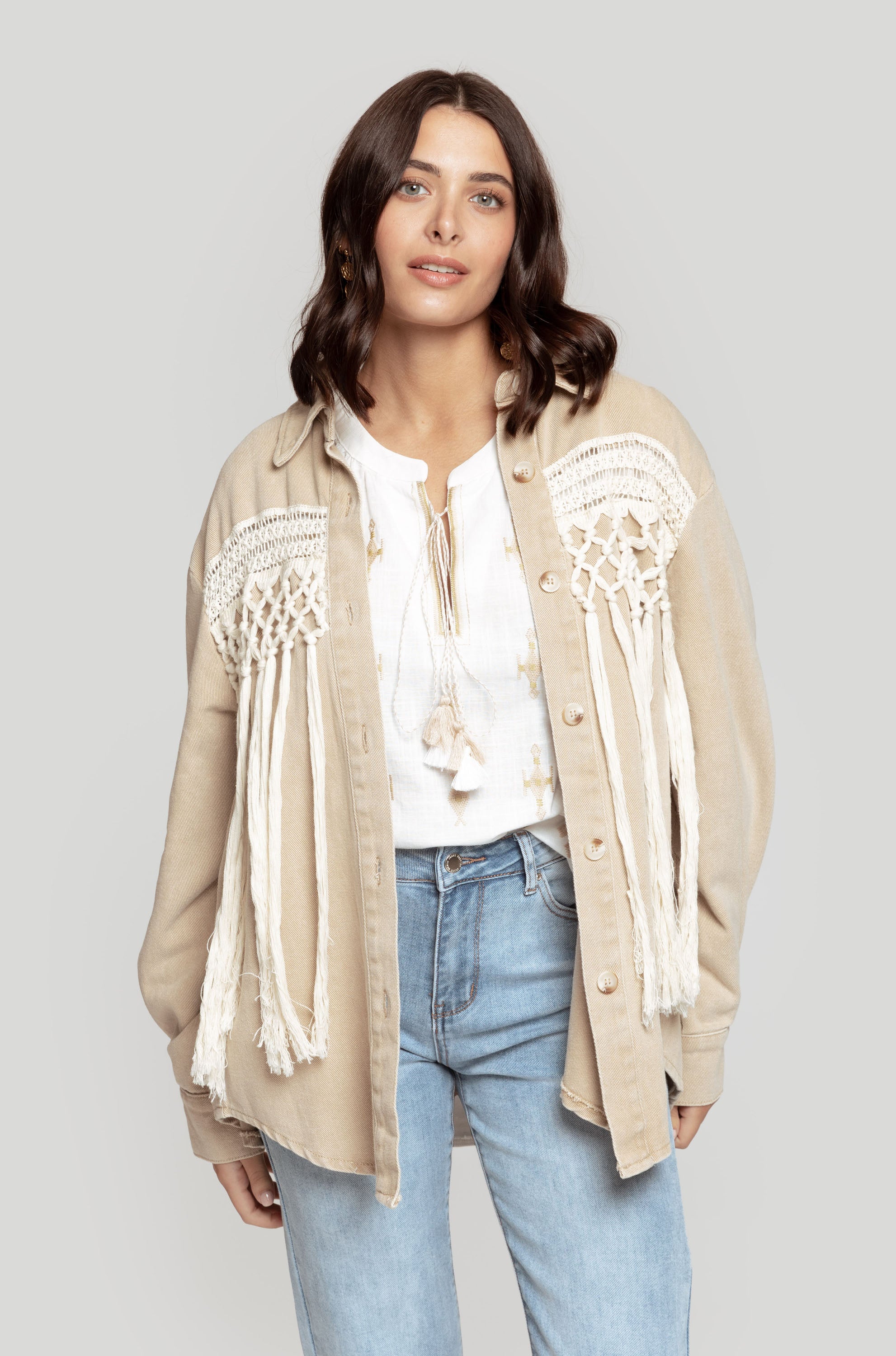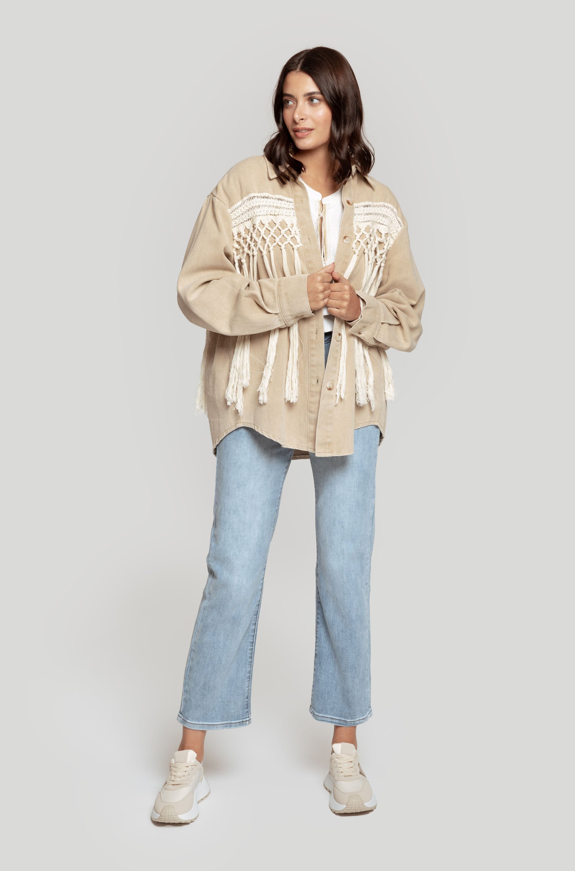 Tejido mezcla de algodón. Estilo tejano vaquero. Diseño oversize. Diseño cazadora. Diseño recto. Cuello solapa. Manga larga. Puño abotonado. Cierre de botones. Detalles flecos. Bajo redondeado. Talla modelo: S. Altura modelo: 1.75 m.