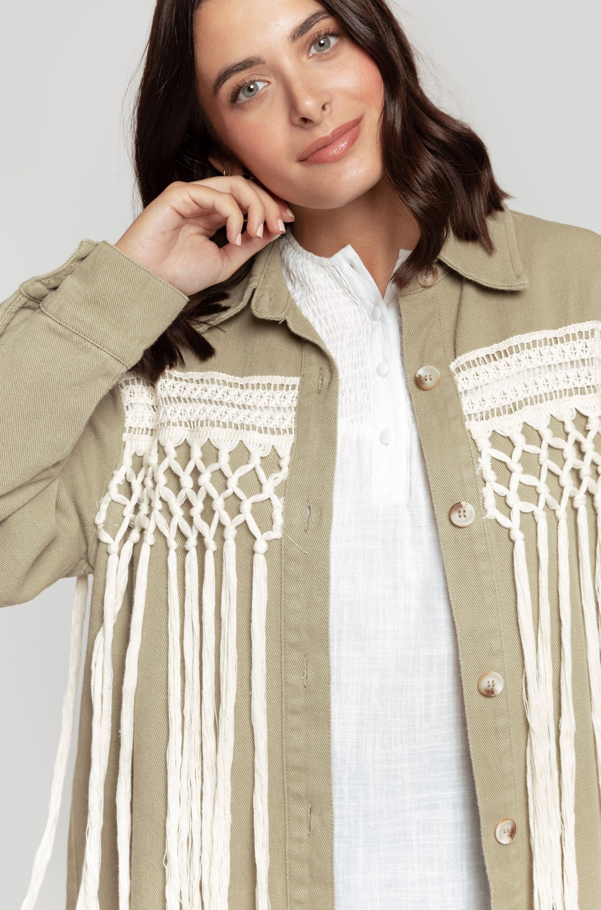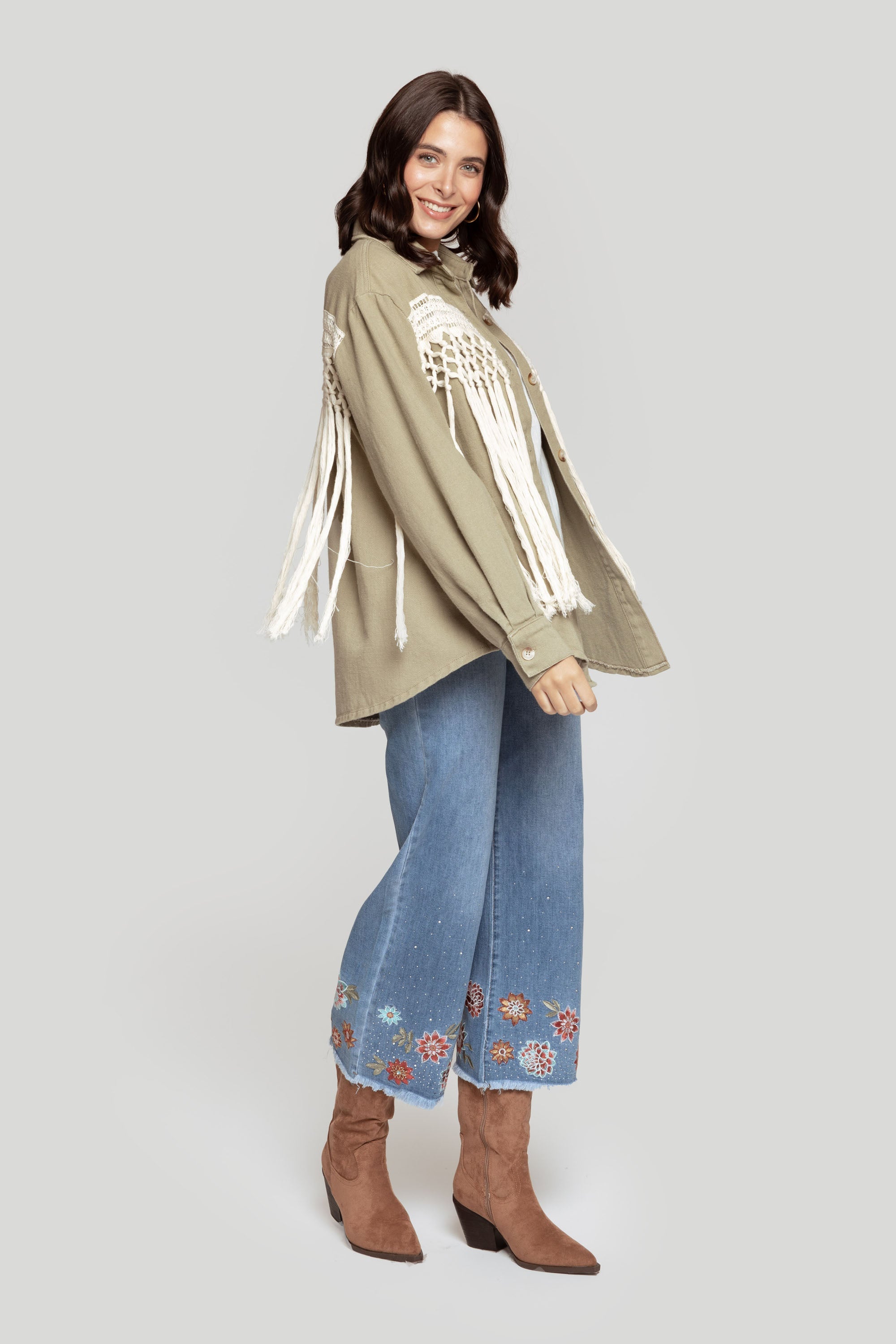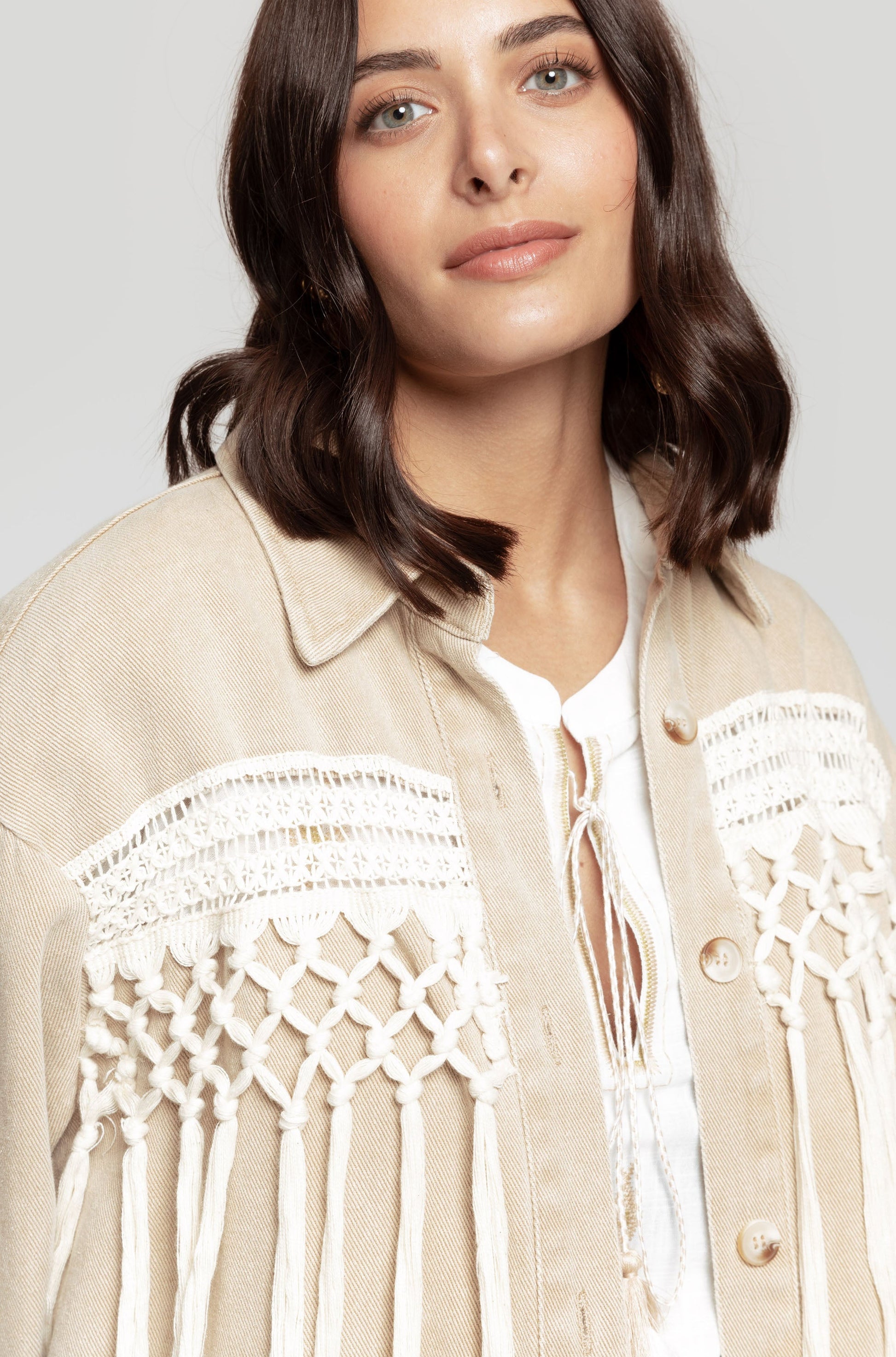 Tejido mezcla de algodón. Estilo tejano vaquero. Diseño oversize. Diseño cazadora. Diseño recto. Cuello solapa. Manga larga. Puño abotonado. Cierre de botones. Detalles flecos. Bajo redondeado. Talla modelo: S. Altura modelo: 1.75 m.