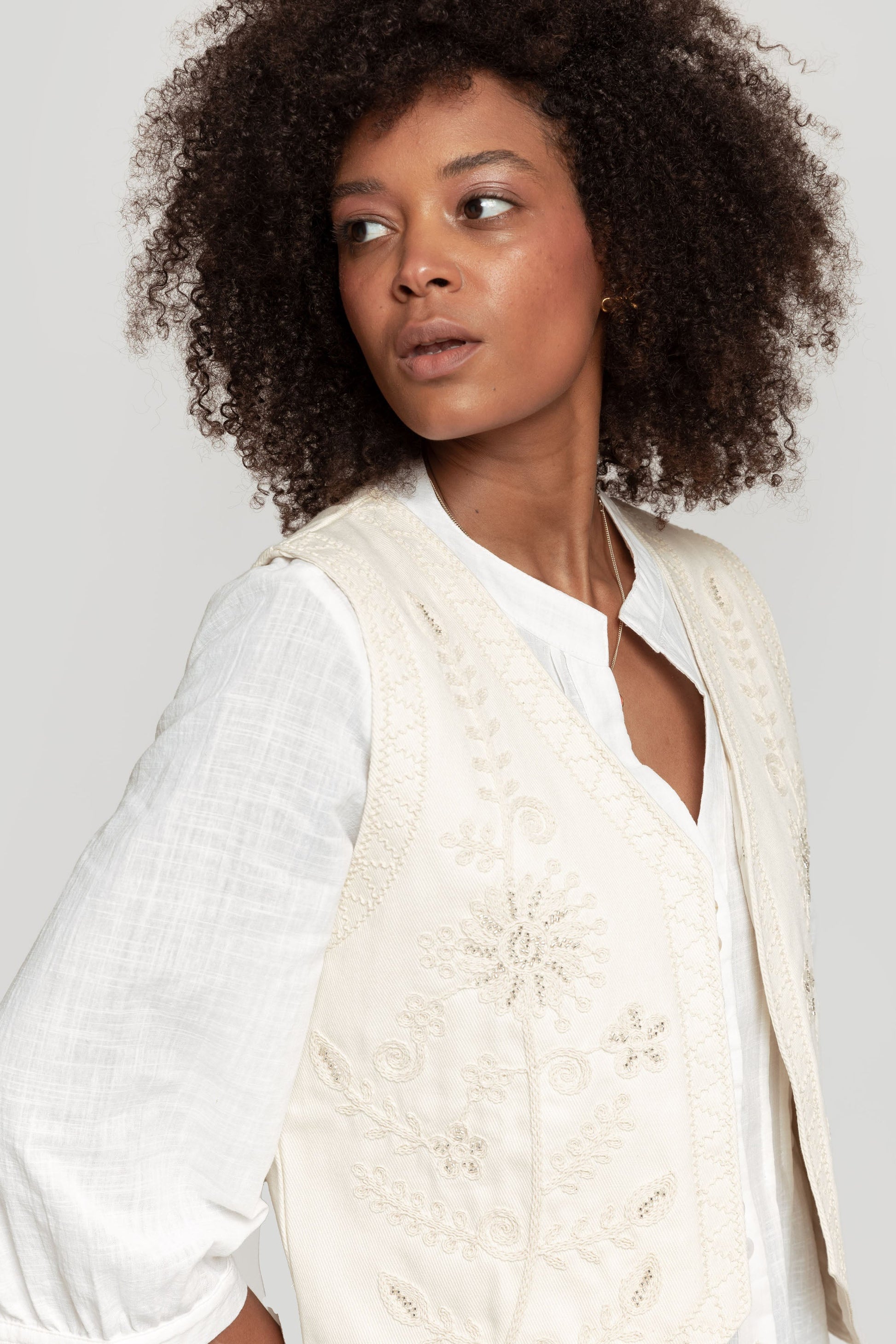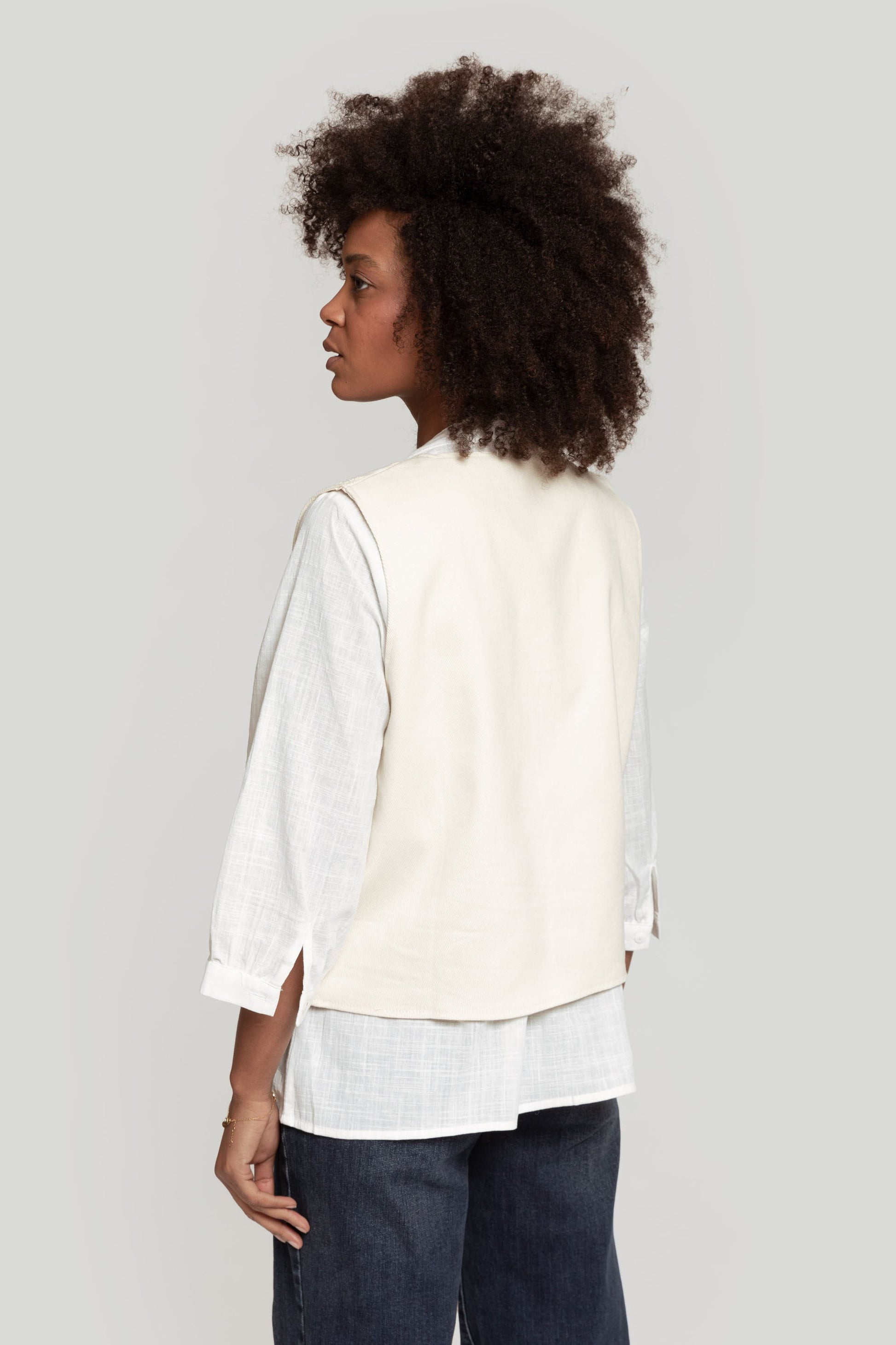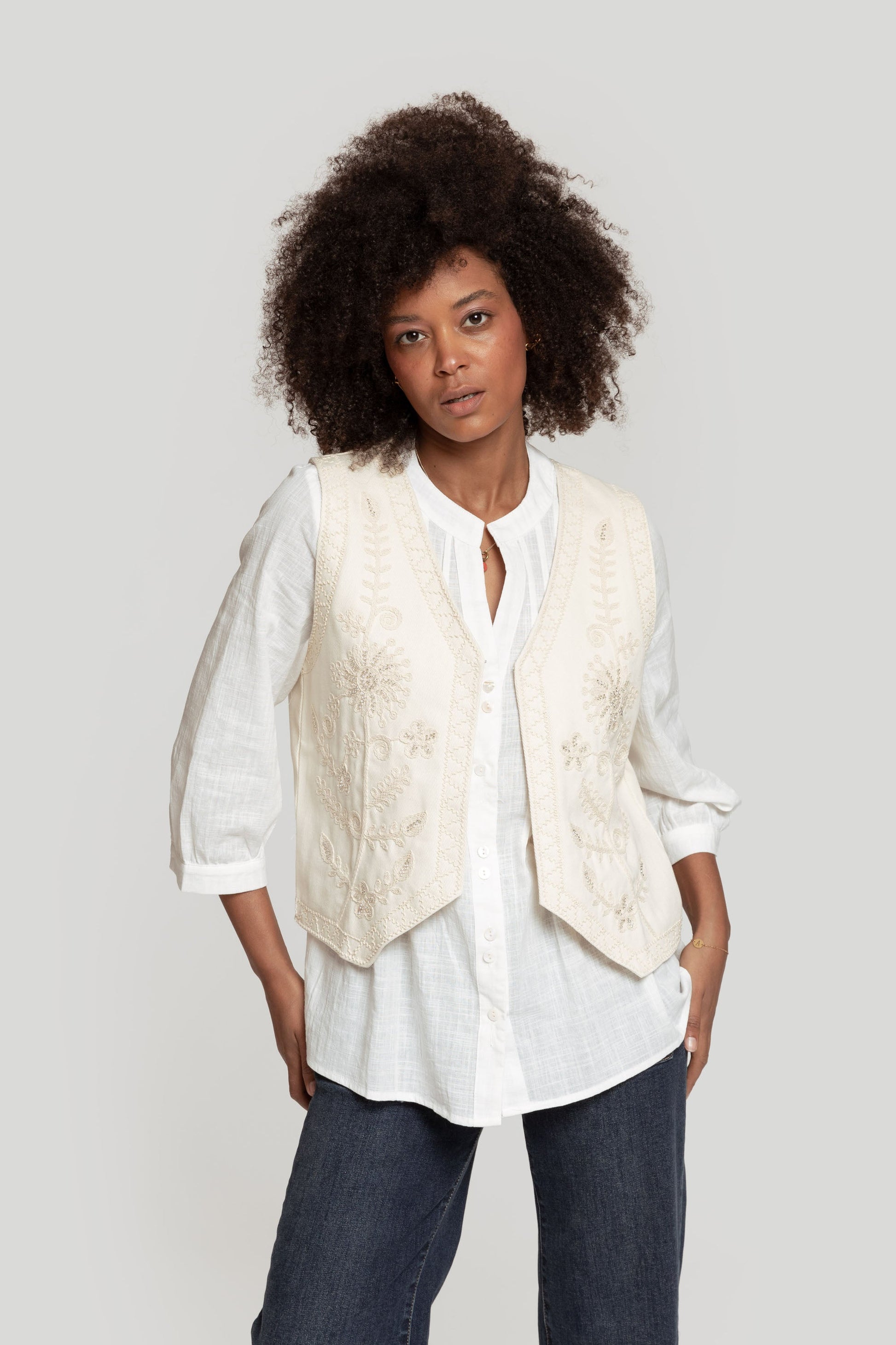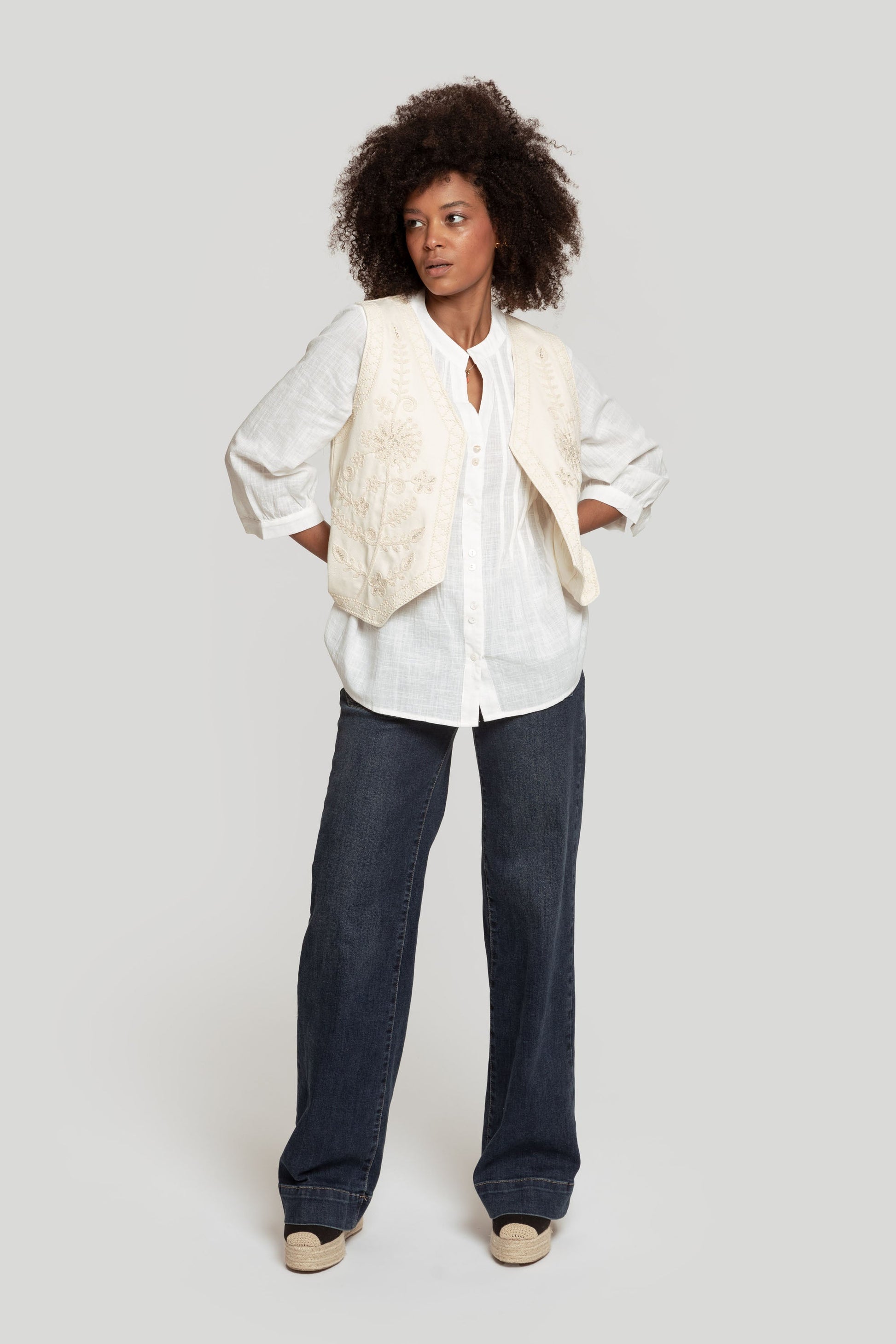 Tejido de algodón. Diseño recto. Cuello pico. Manga sisa. Cierre de corchete. Detalles strass. Bajo en pico. Talla Única. Altura modelo: 1,66 m.