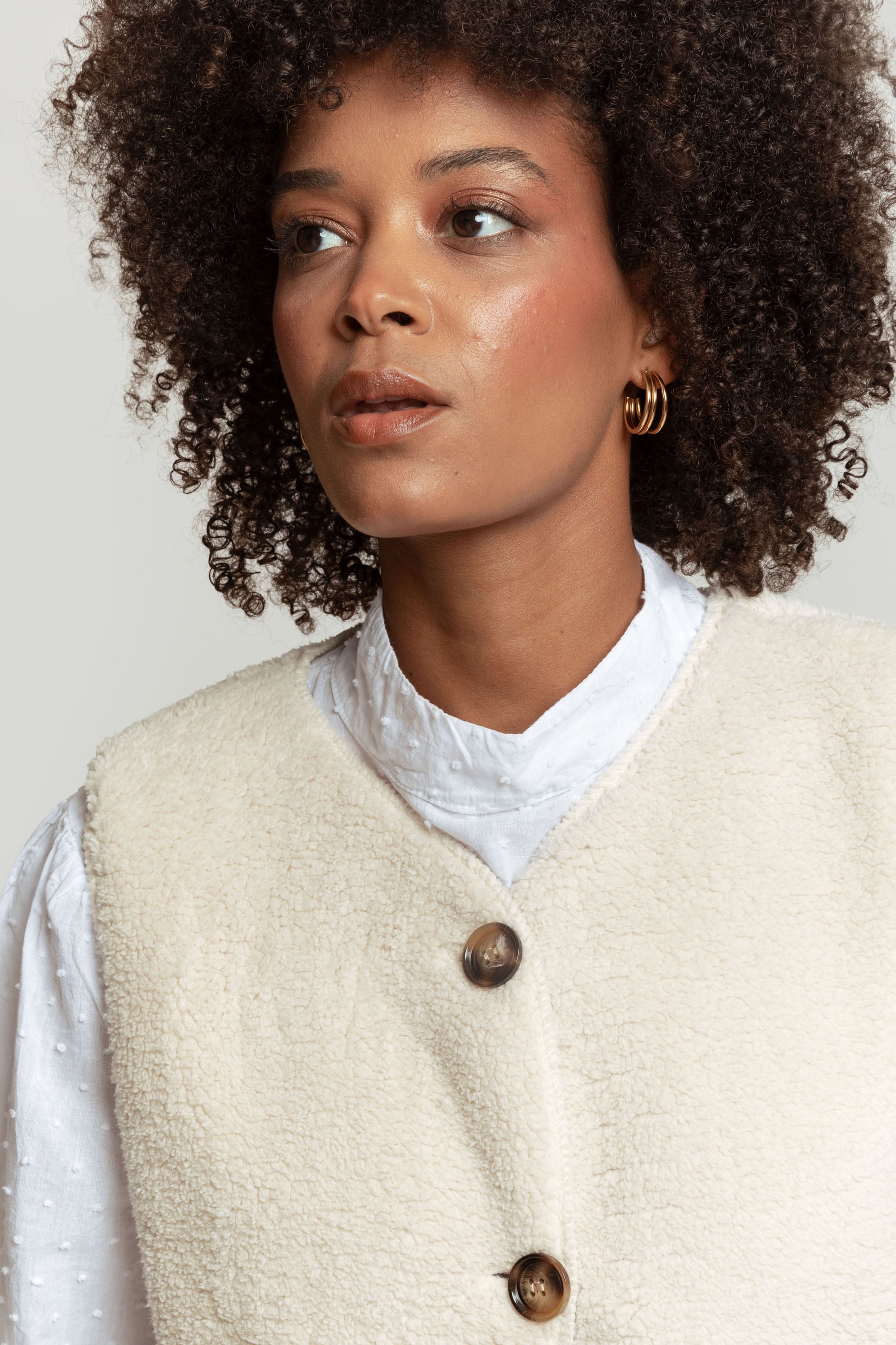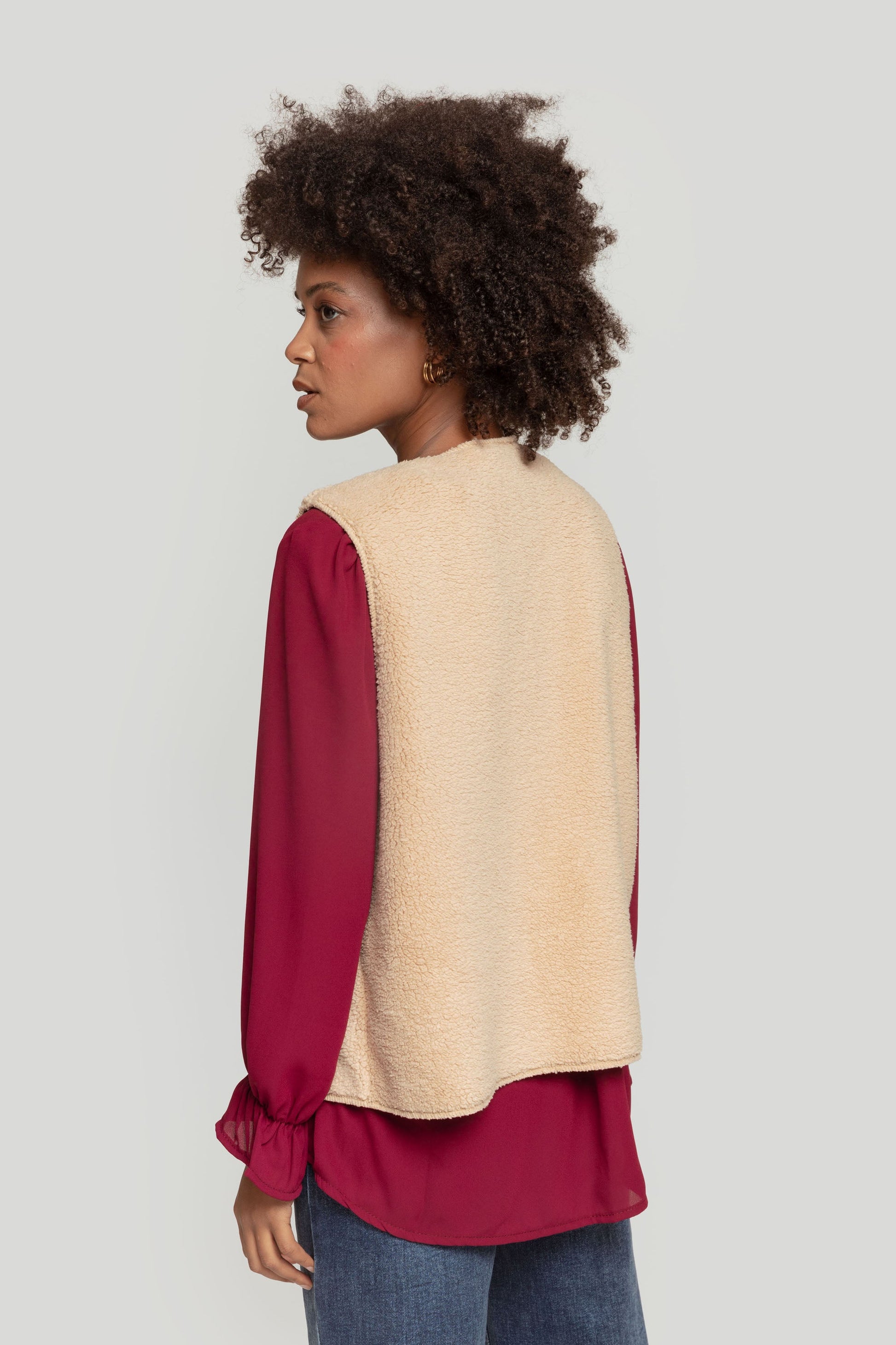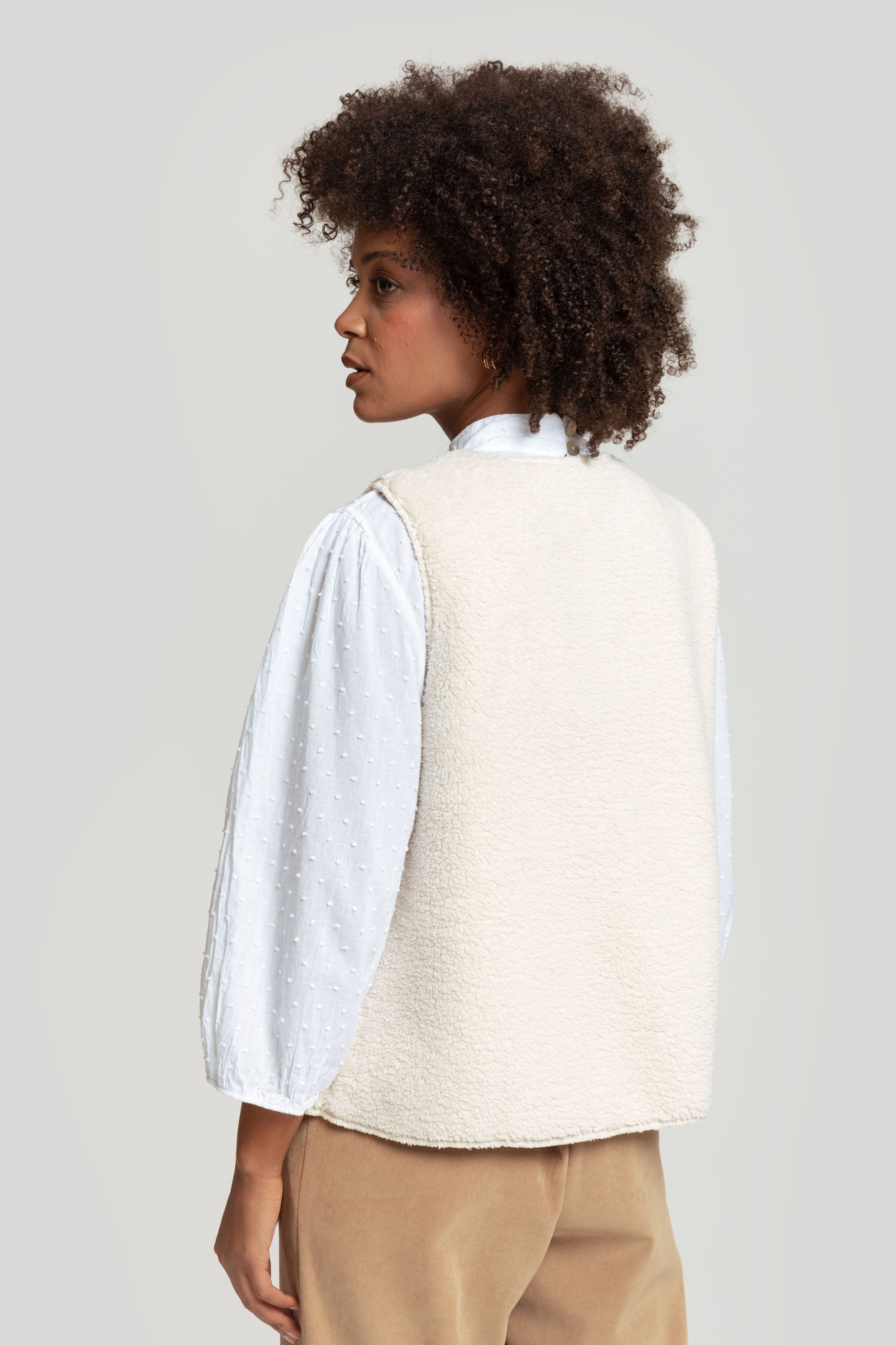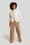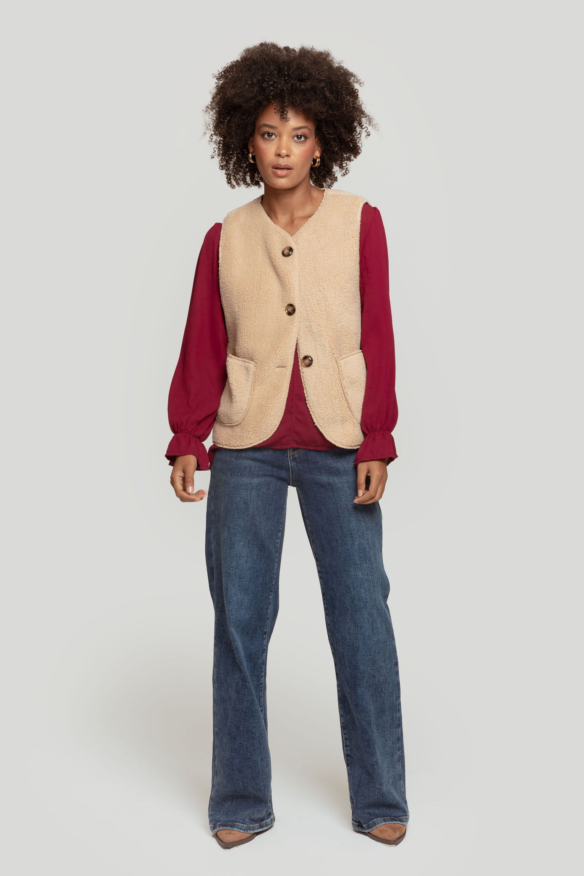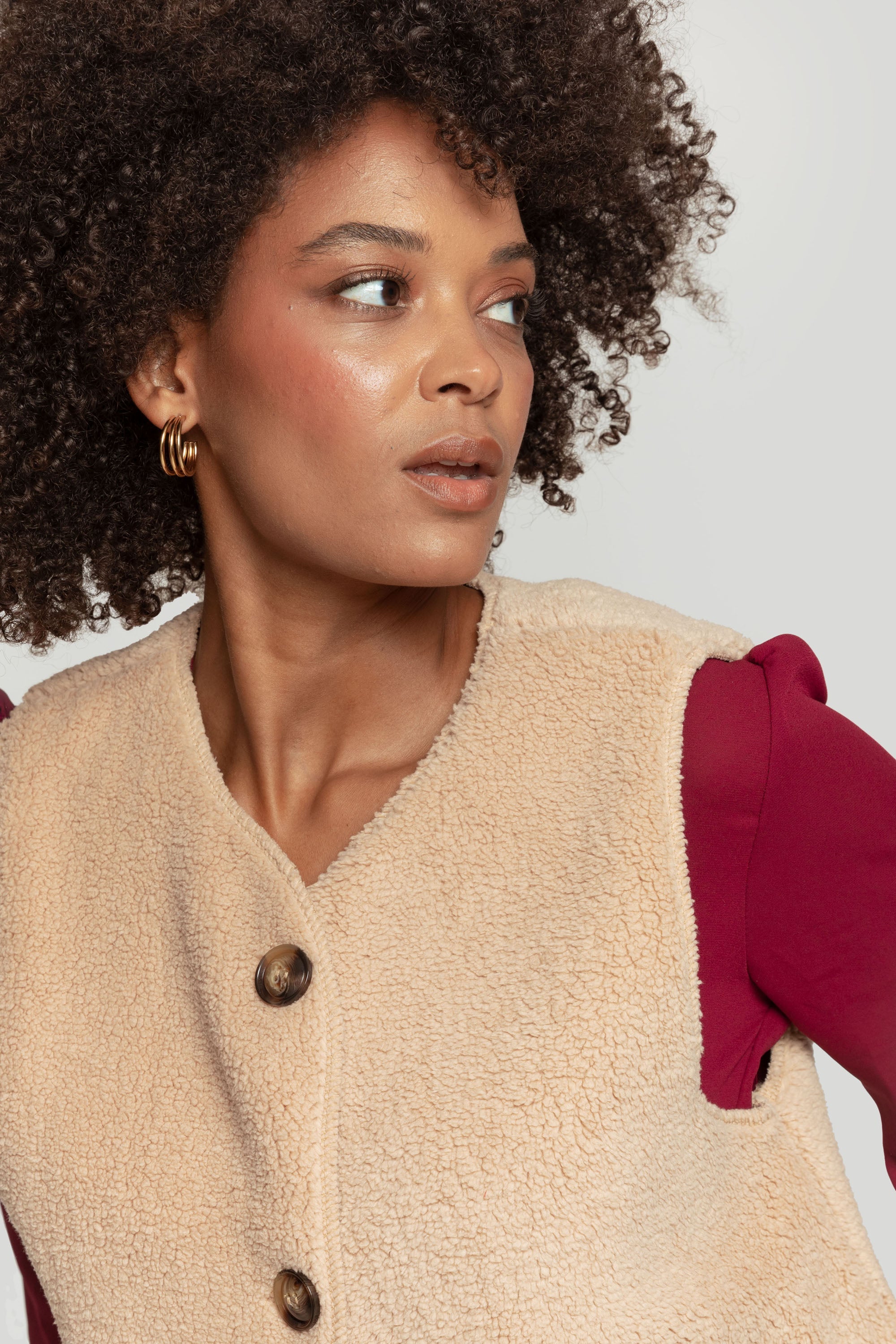 Tejido combinado. Diseño recto. Cuello pico. Manga sisa. Cierre de botones. Bolsillos frontales. Bajo redondeado. Talla modelo: S Altura modelo: 1,66 m.