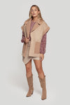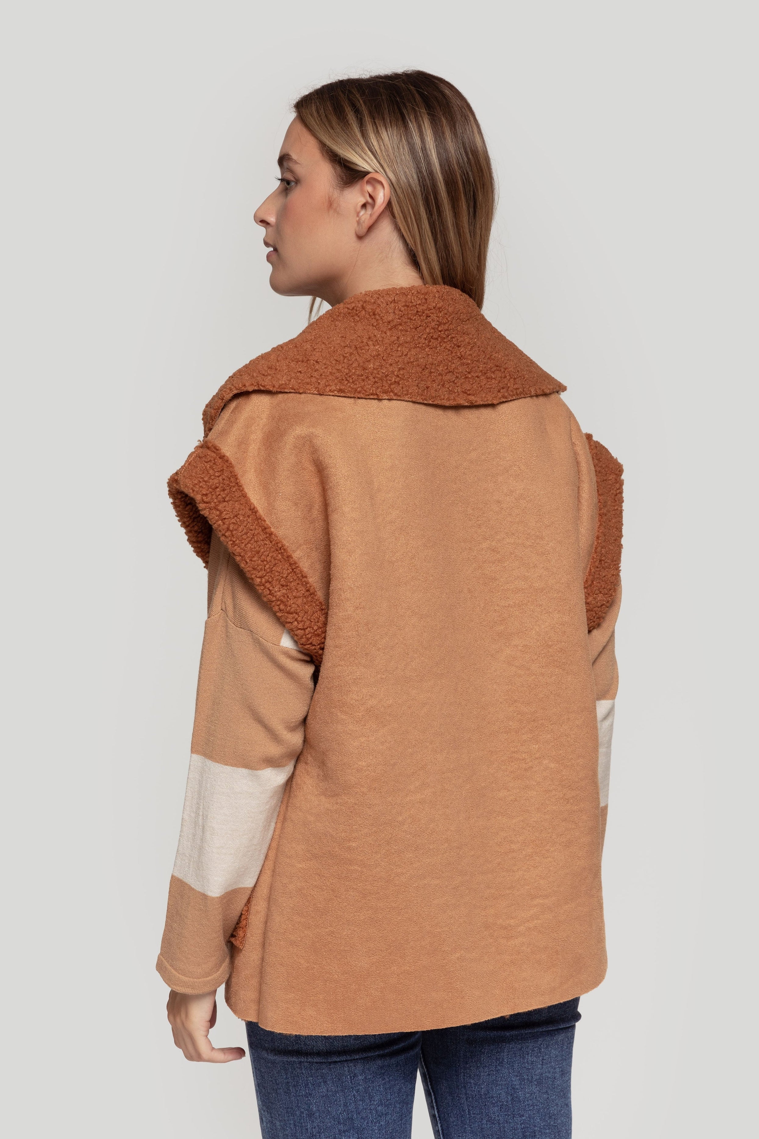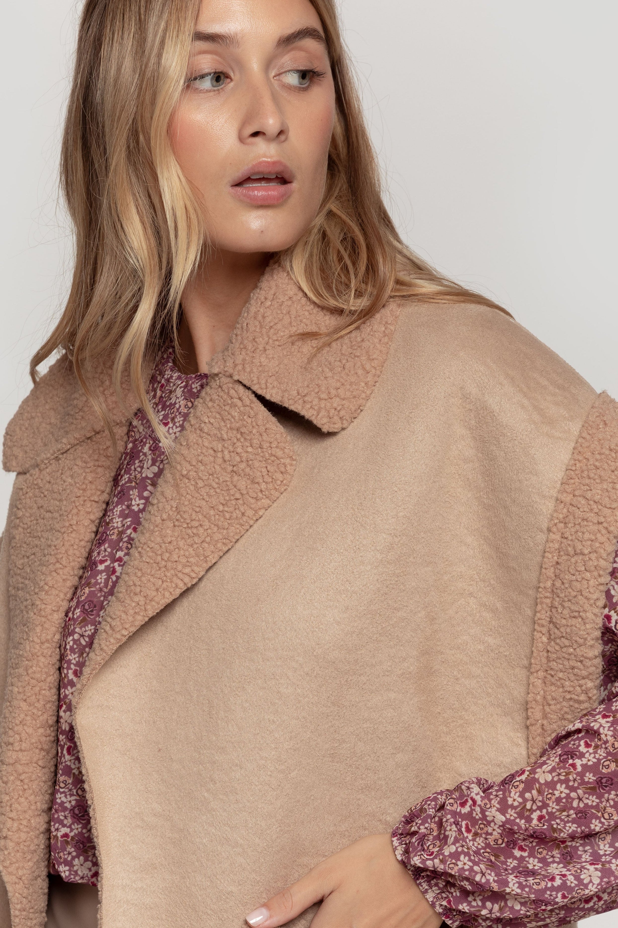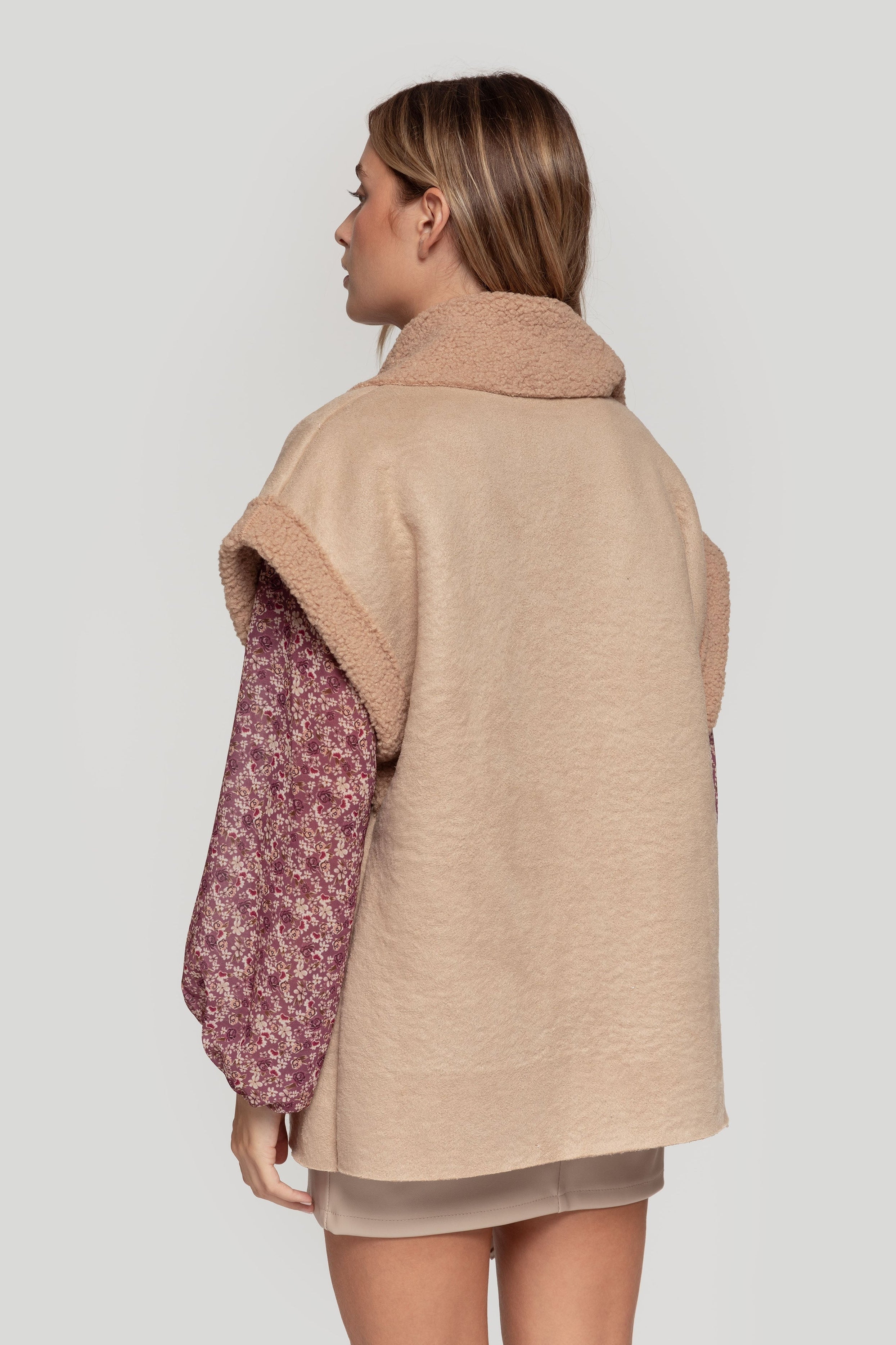Tejido revestido. Cuello y forro en borreguito suave. Cuello solapa. Manga sisa. Bolsillos delanteros. Sin cierre. Talla modelo: S. Altura modelo: 1,66 m.