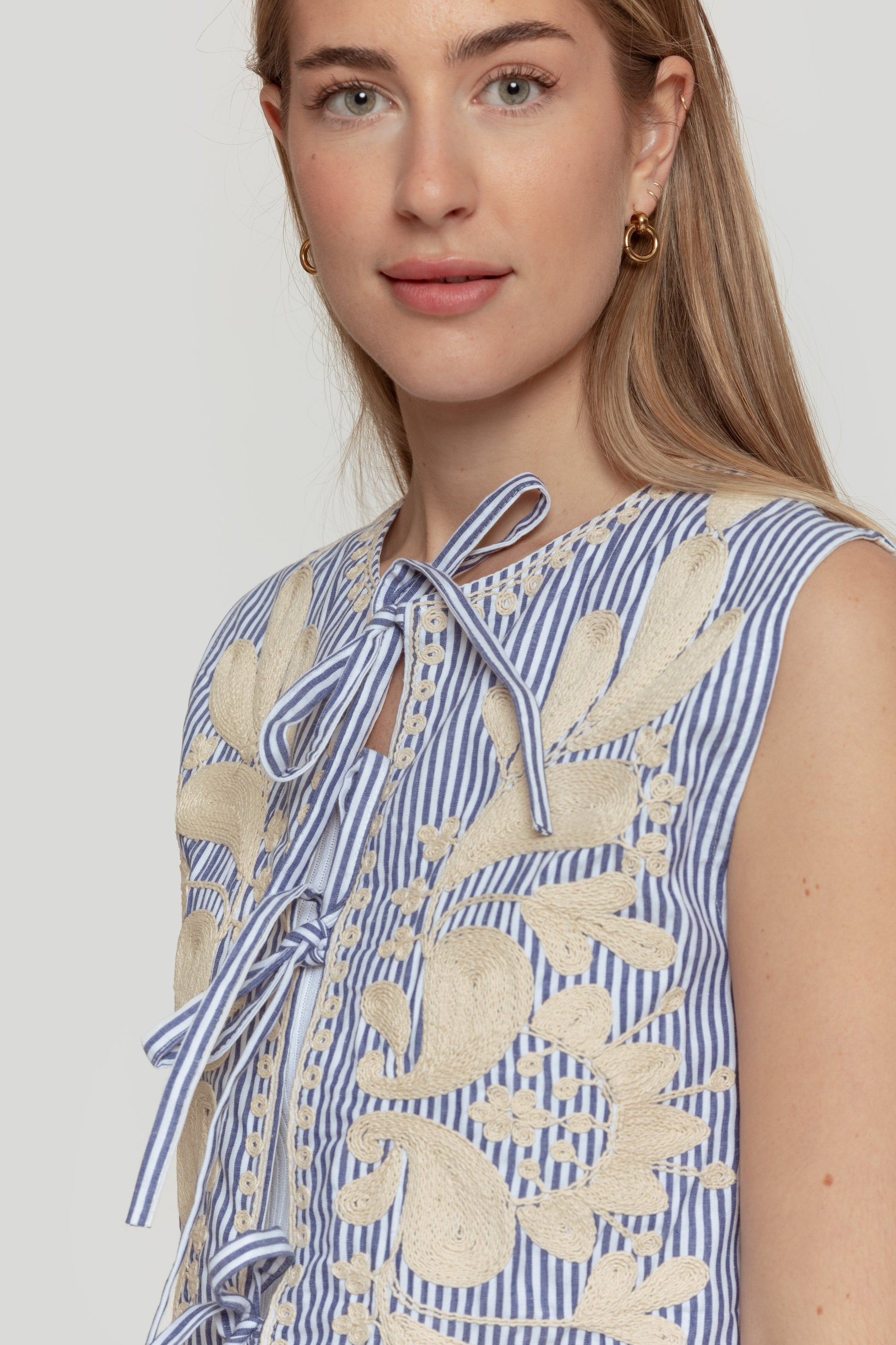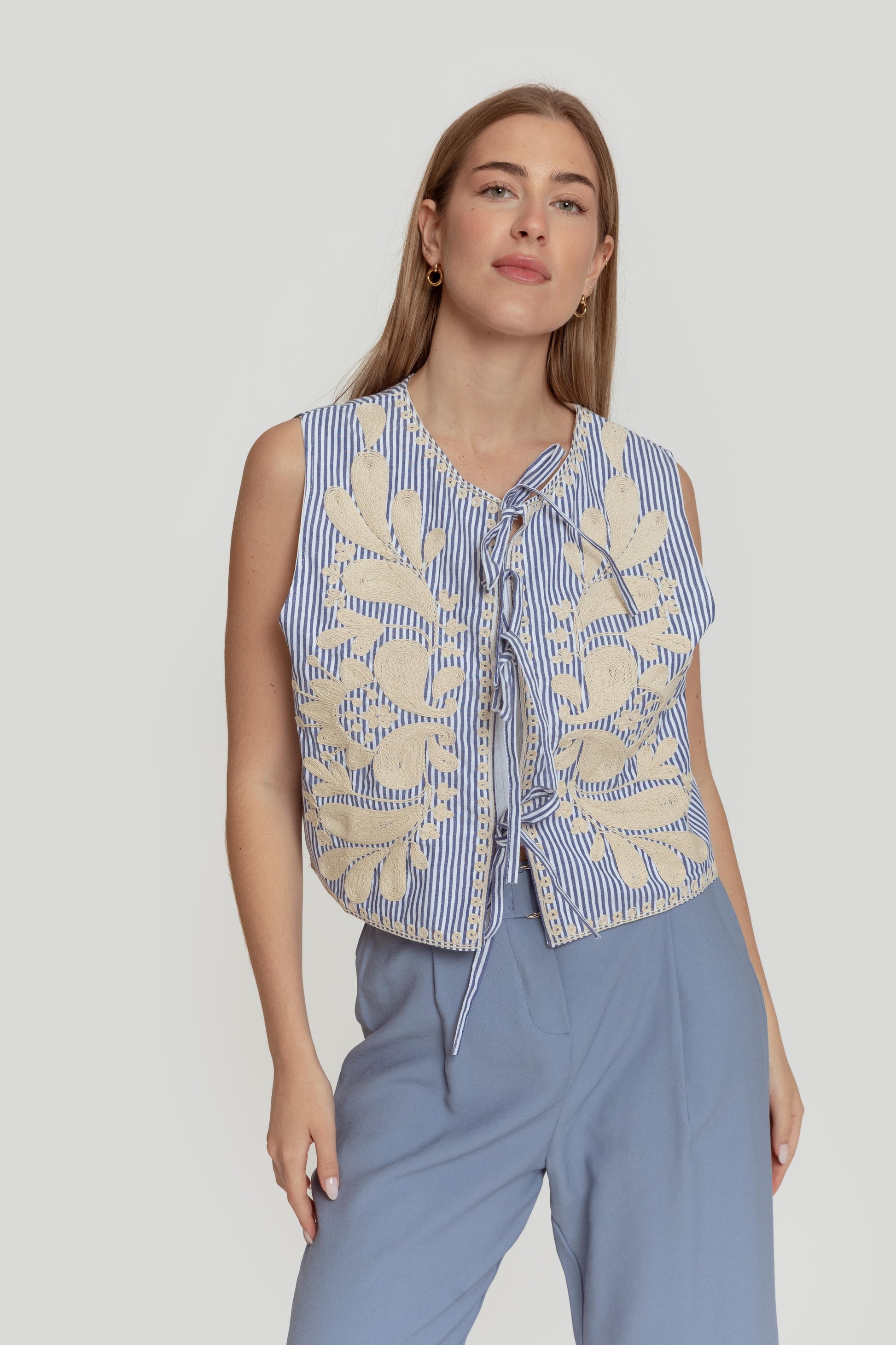 Tejido de algodón. Tejido fluido. Diseño estampado. Detalles bordados en crochet. Diseño corto. Diseño recto. Manga sisa. Cierre de doble tira. Forrado. Talla única. Altura modelo: 1,70 m.