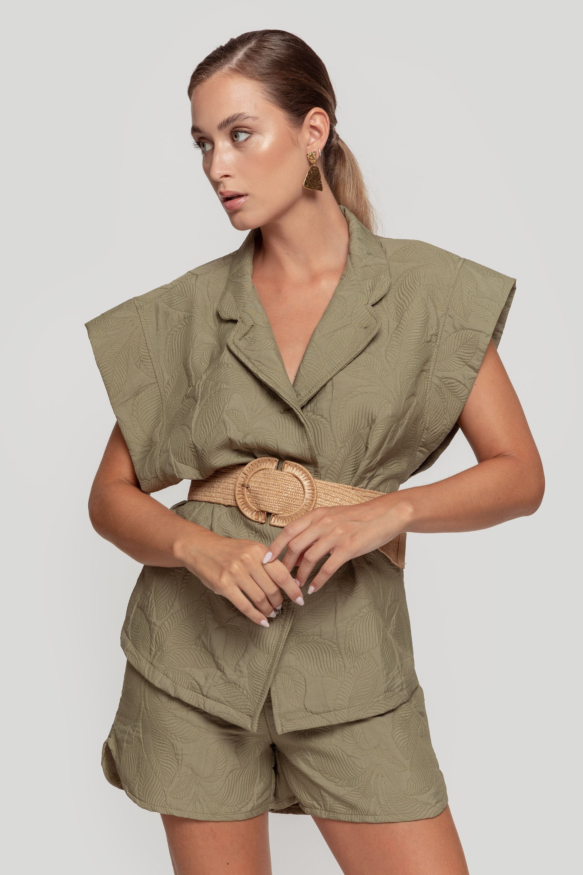 Tejido efecto acolchado. Diseño amplio. Diseño bordado. Diseño recto. Cuello solapa. Manga sisa. Cierre de botones. Talla modelo: S. Altura modelo 1,66 m.