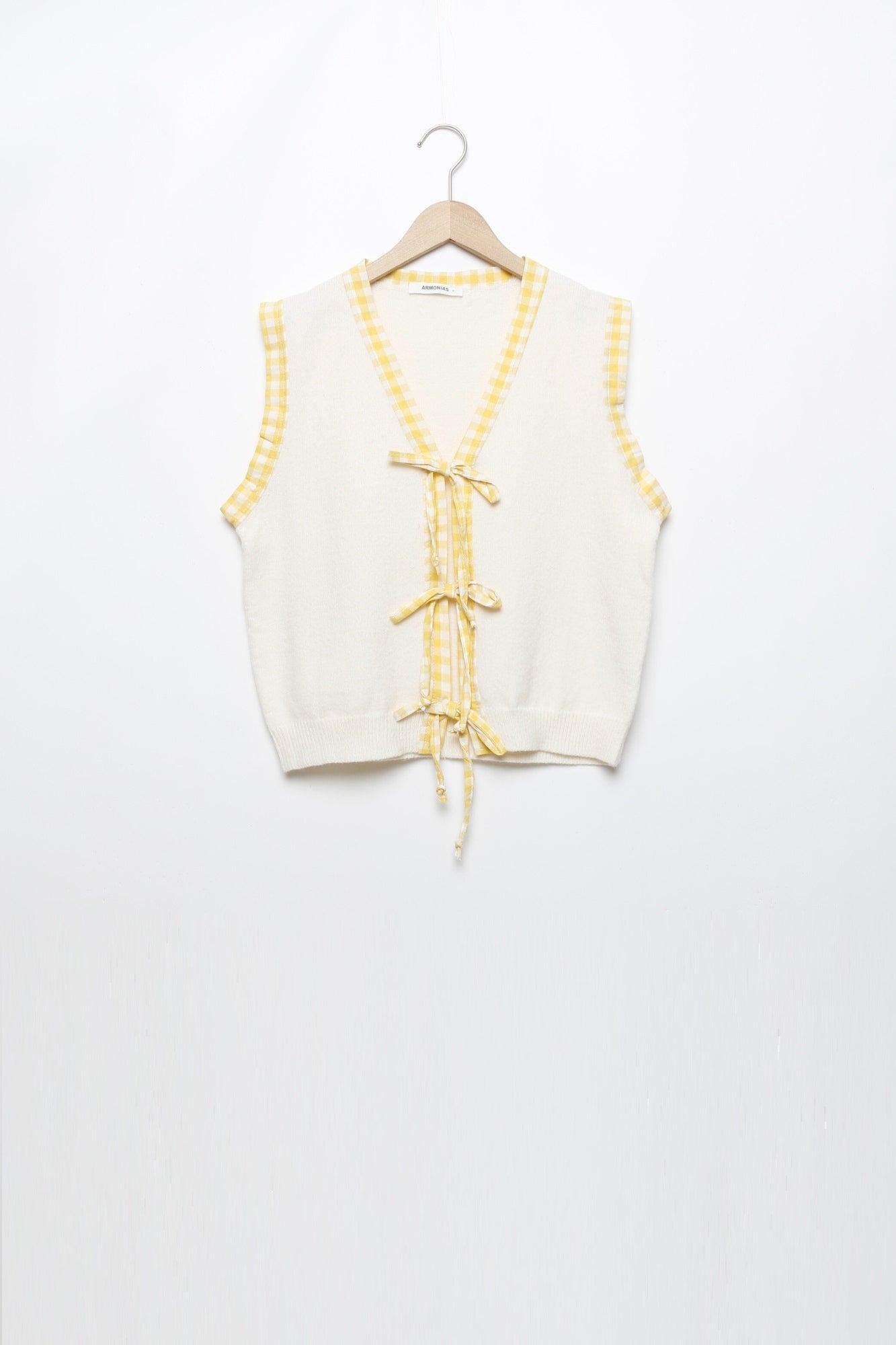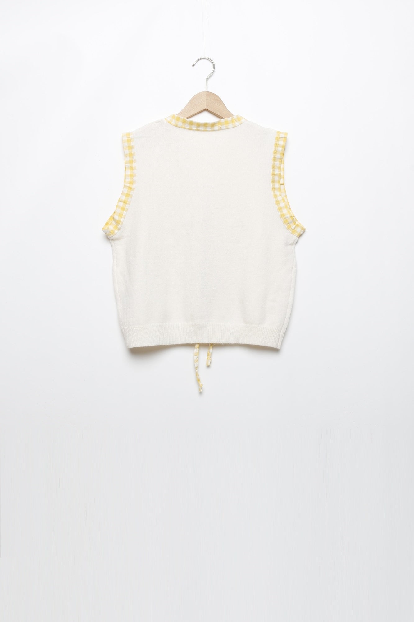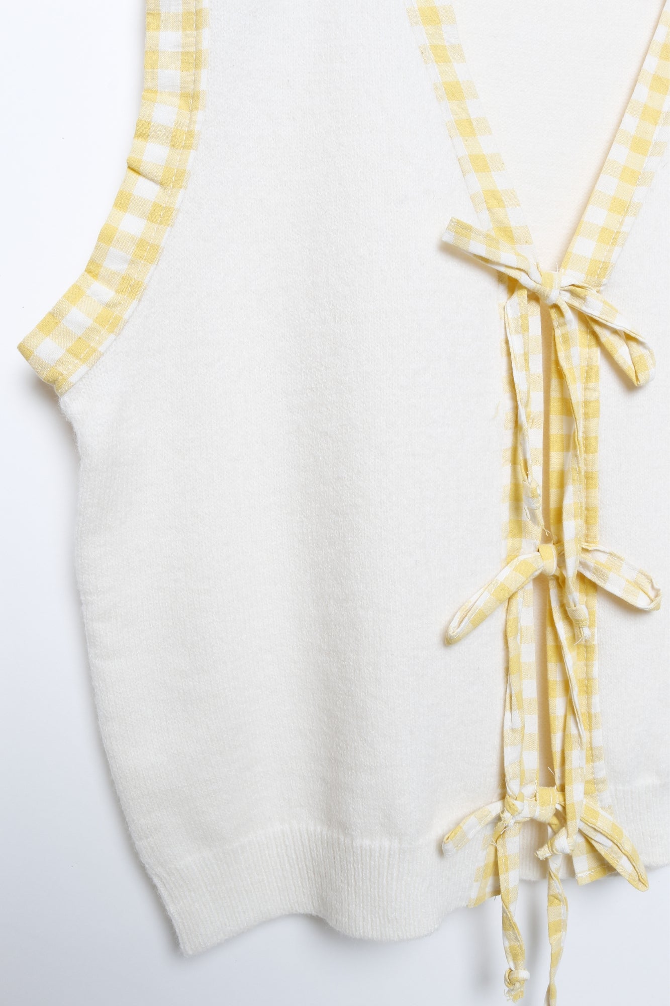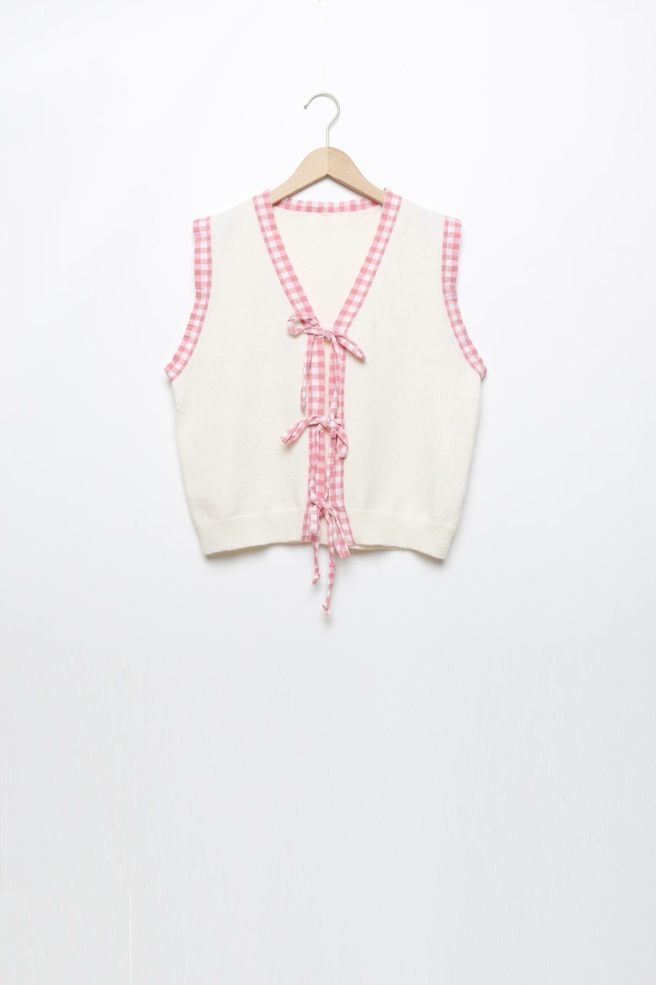 Chaleco punto. Cuello pico. Manga sisa. Cierre de lazos.