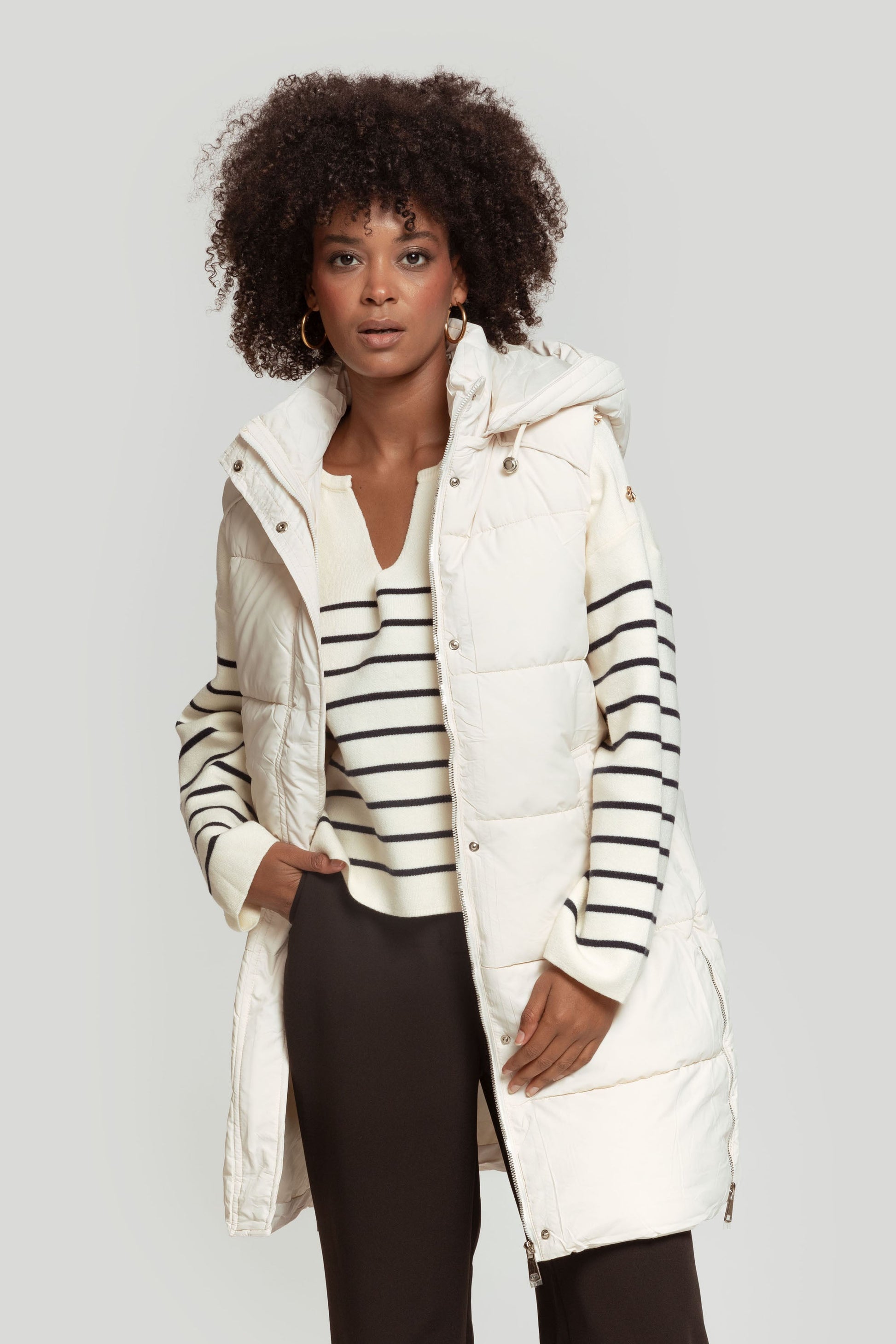 Tejido repelente al agua. Diseño acolchado. colchado. Diseño midi. Cuello alto. Con capucha desmontable. Manga sisa. Bolsillos laterales con cierre de botones. Cierre de cremallera. Cierre de botones a presión. Forrado., Talla modelo: S. Altura modelo: 1,66 m.