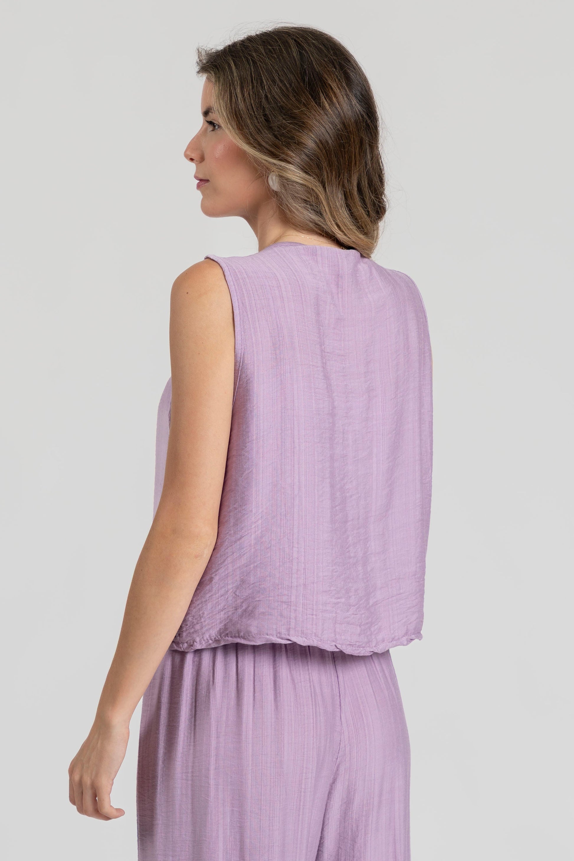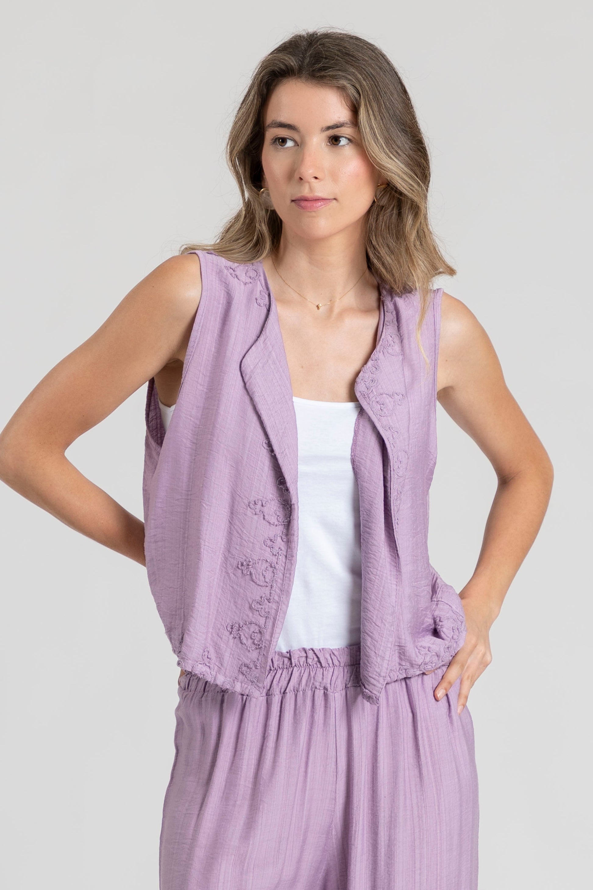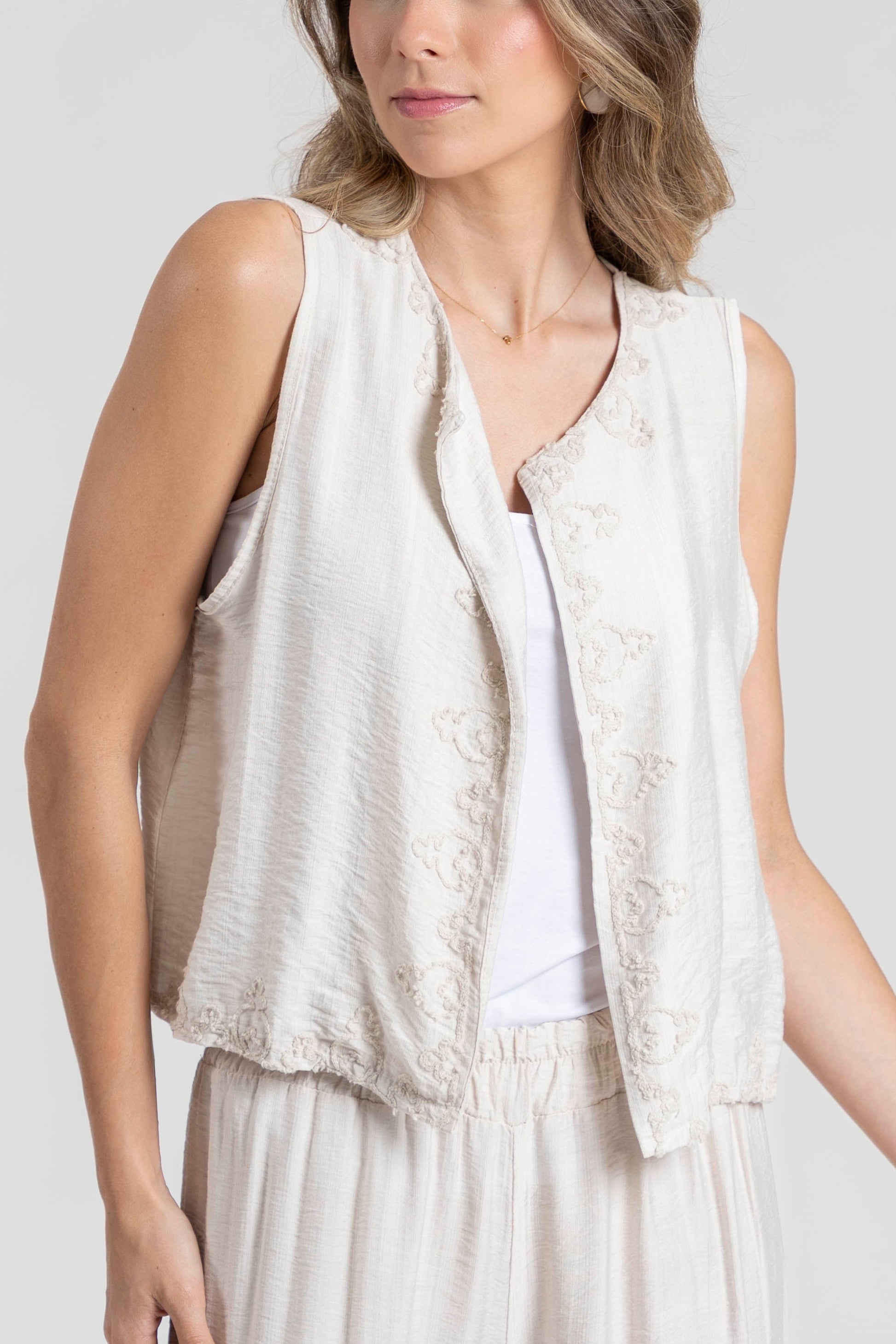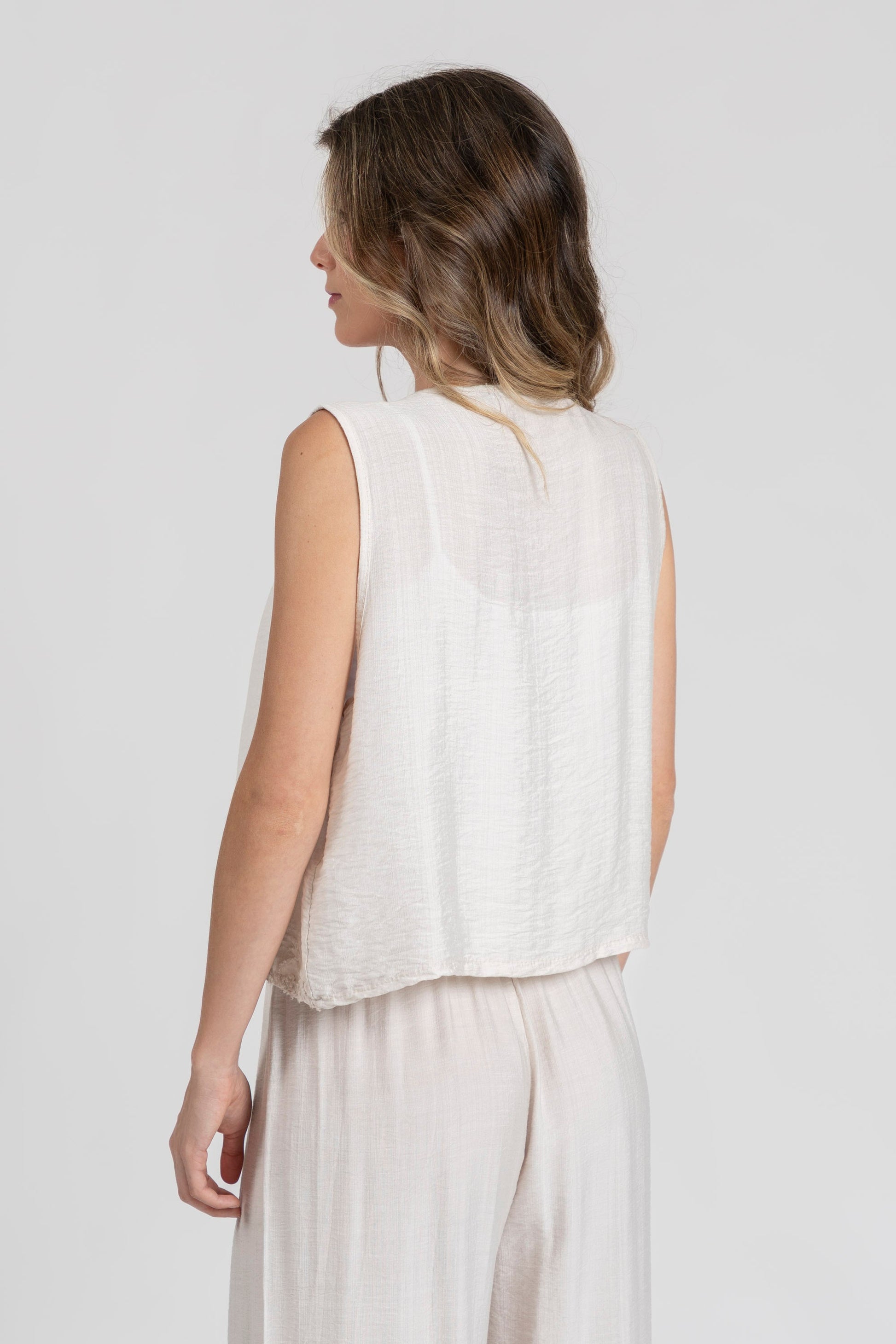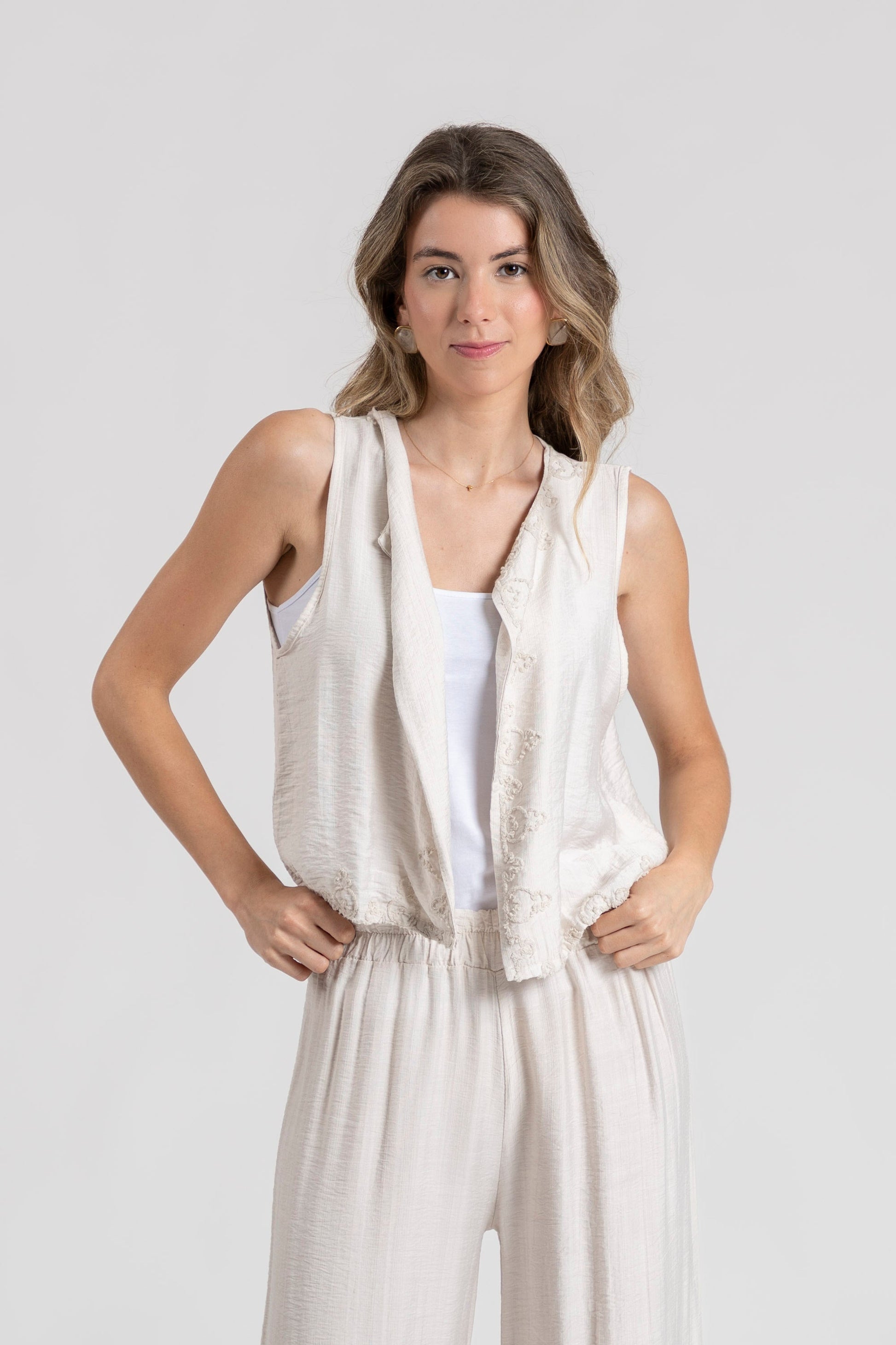 Tejido fluido. Tejido textura. Diseño recto. Manga sisa. Terminaciones bordadas. Sin cierre. Talla modelo: S.