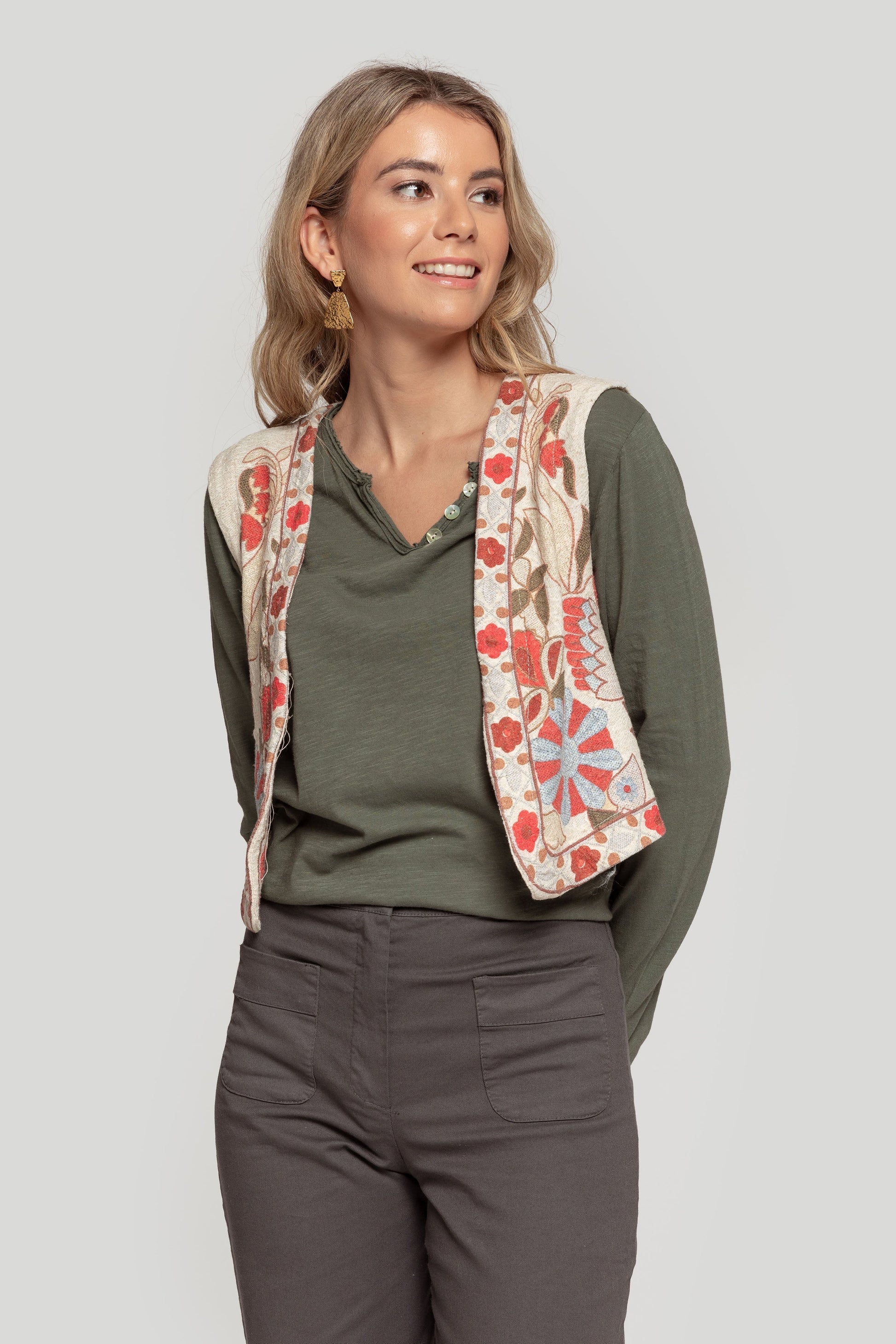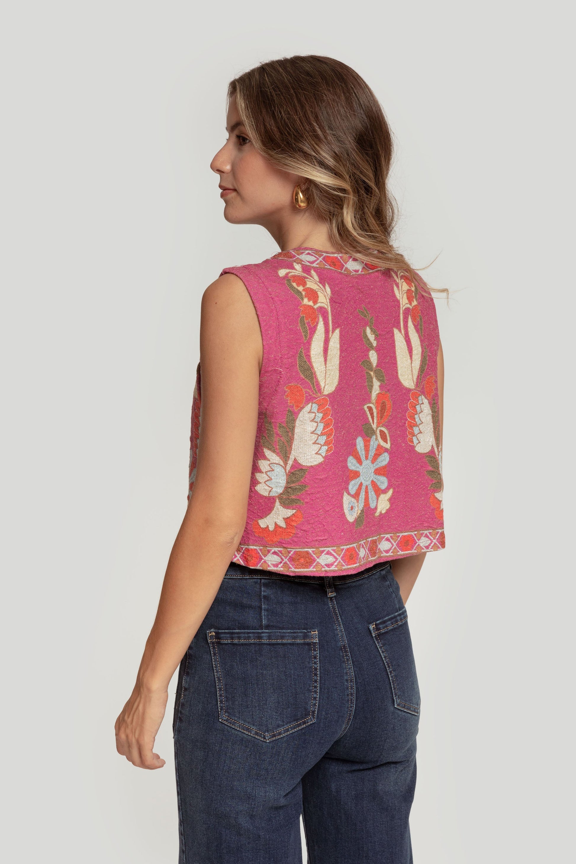 Tejido de algodón. Tejido de acabado brillo. Diseño estampado. Diseño entallado. Diseño corto. Manga sisa. Sin cierre. Talla modelo: S. Altura modelo: 1,70 m.