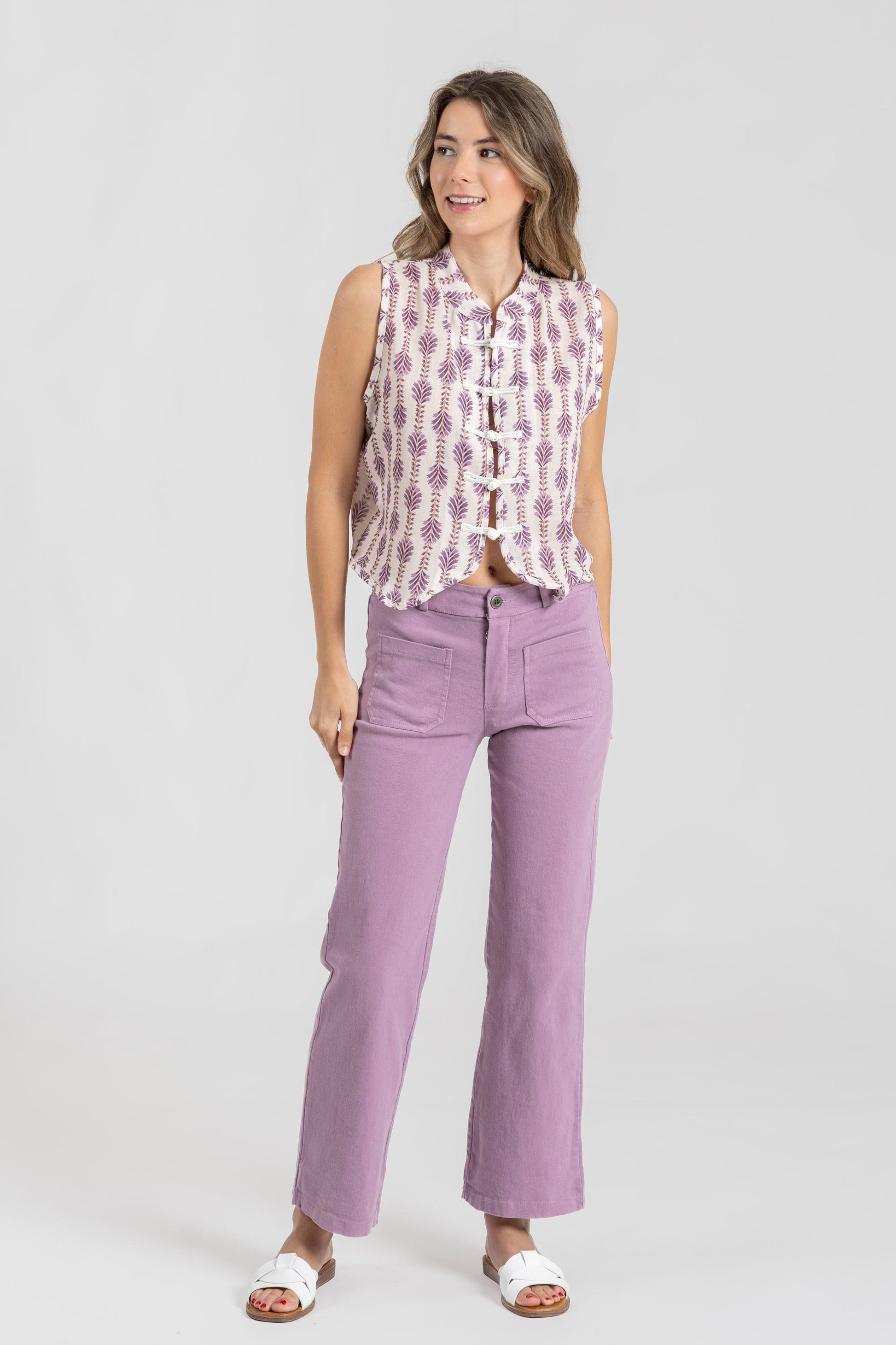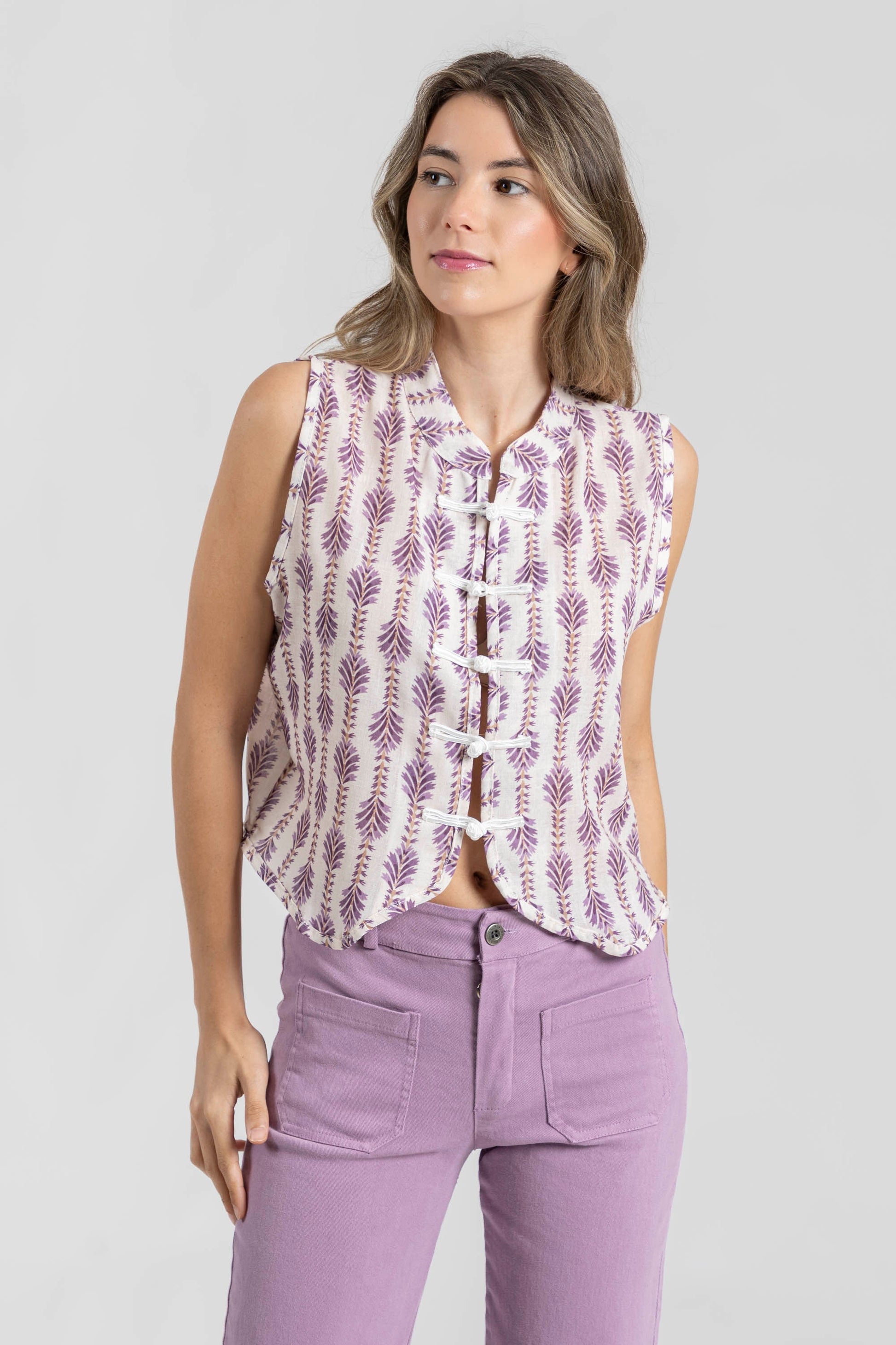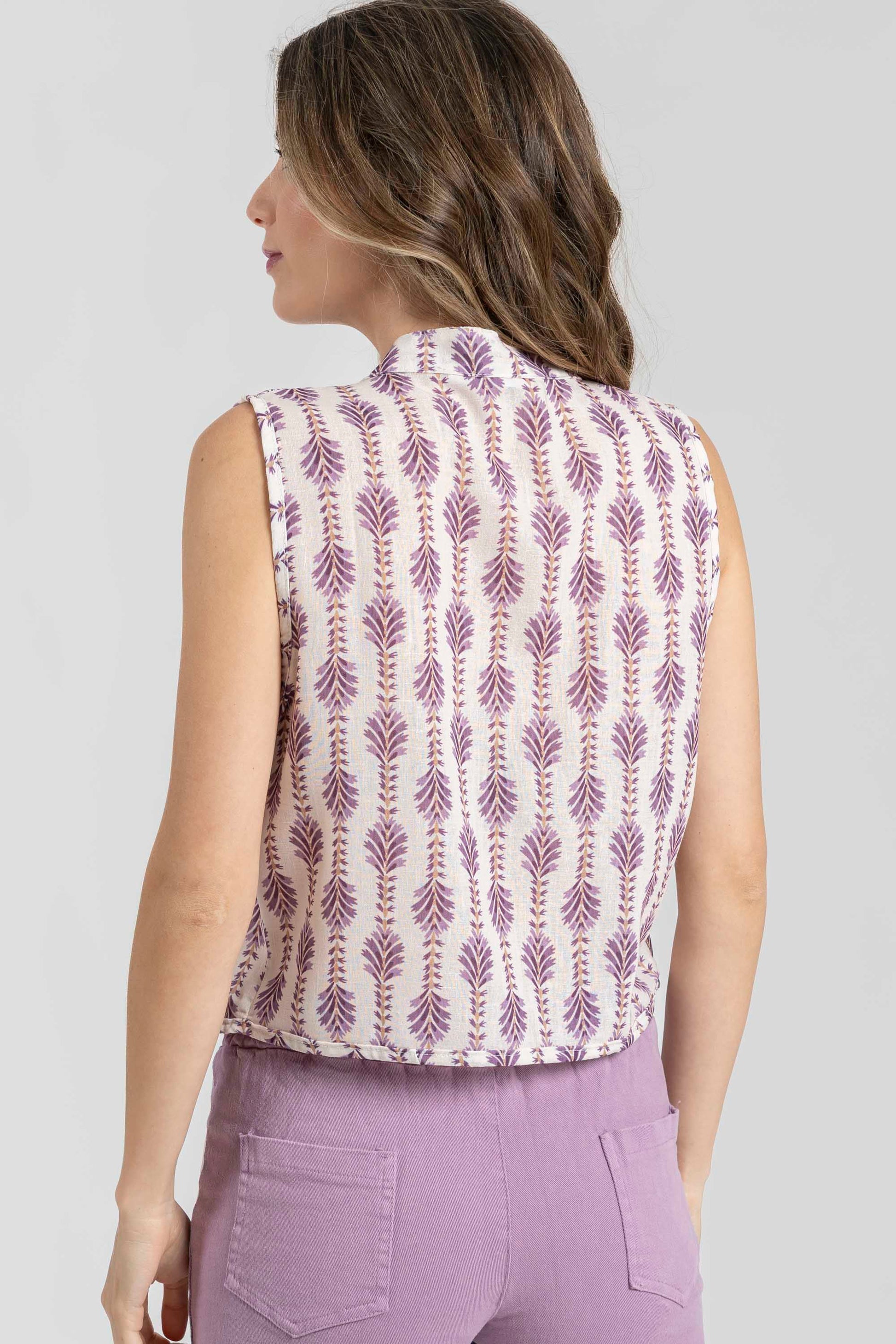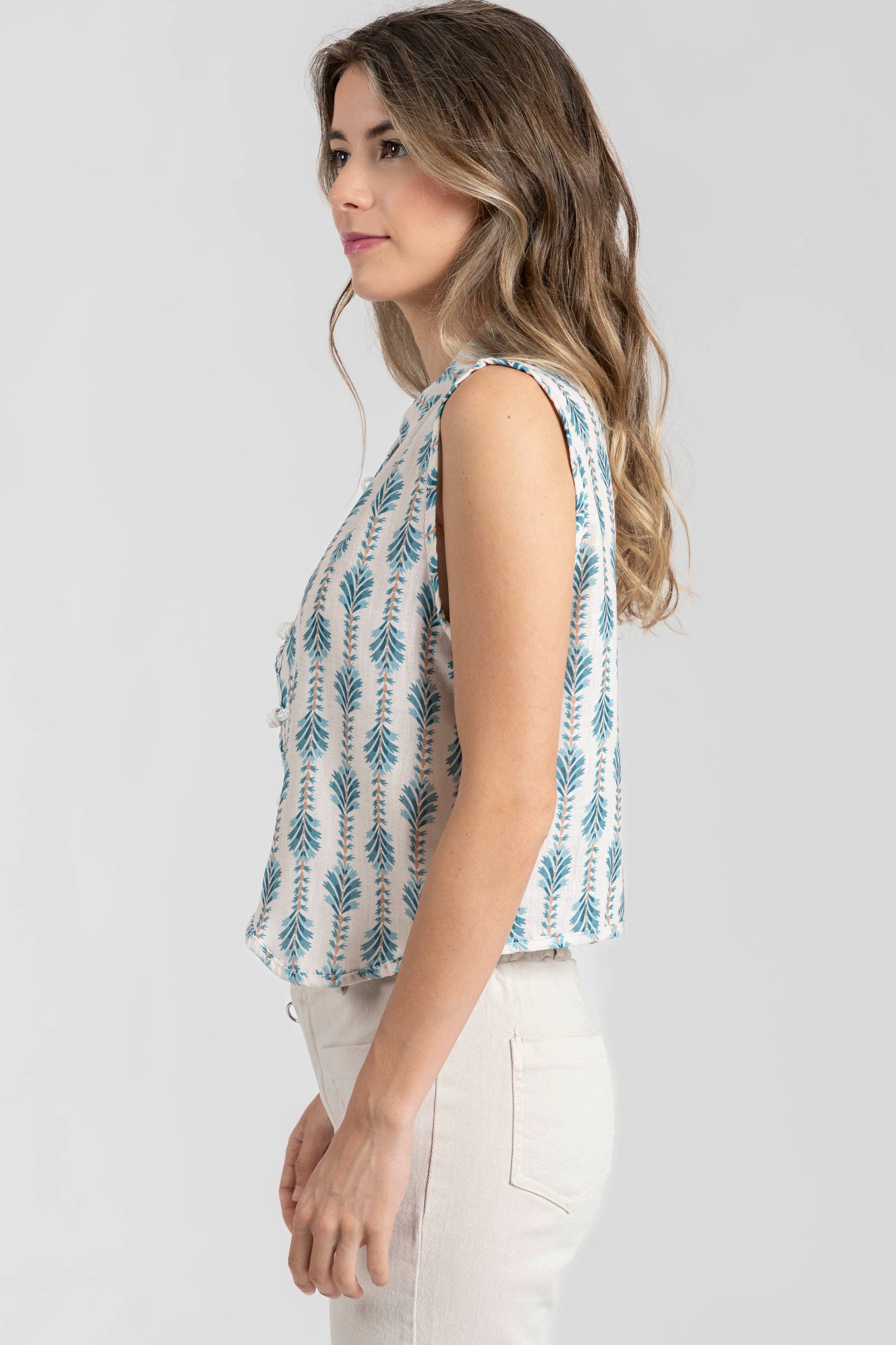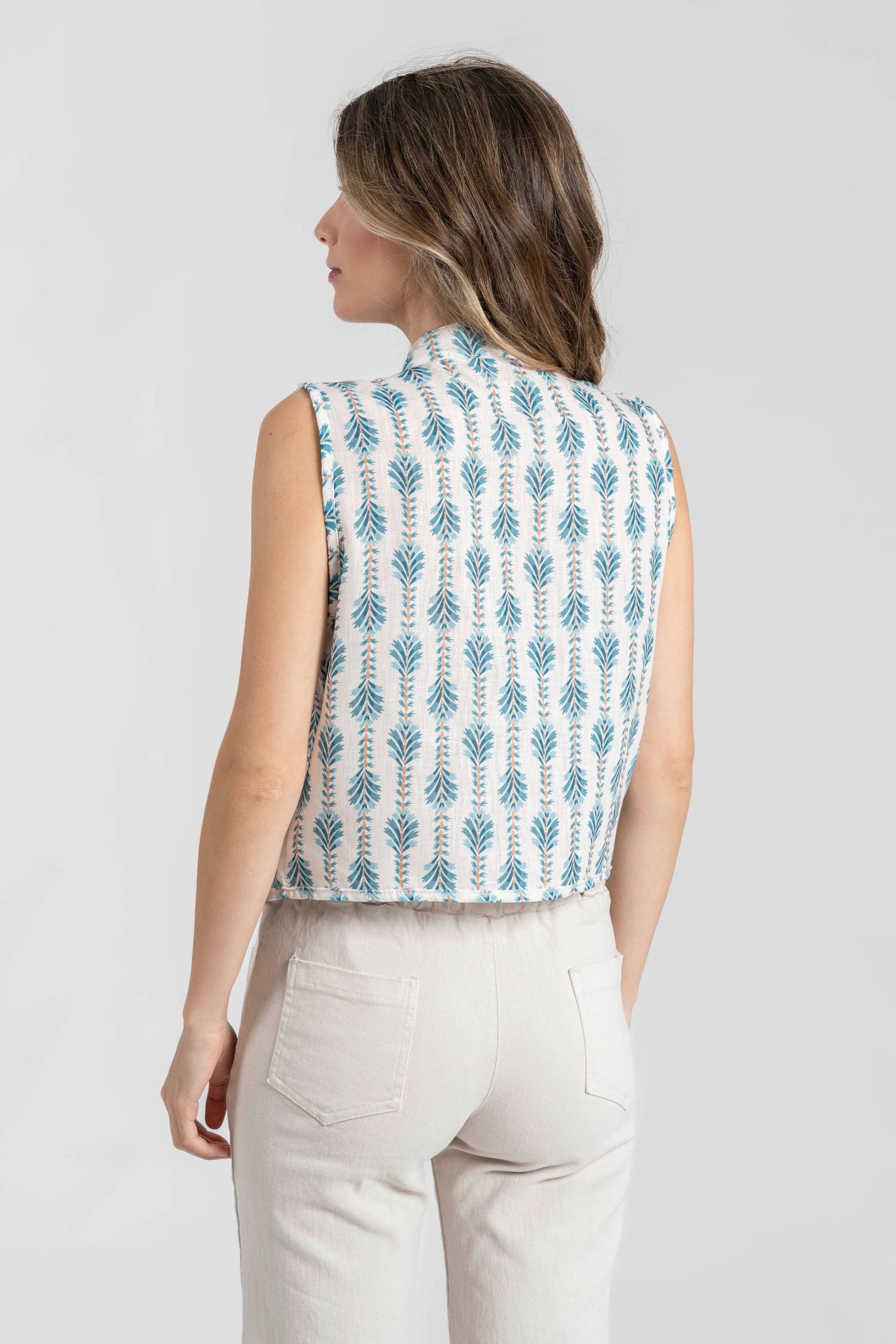 Tejido fluido. Diseño estampado. Diseño recto. Cuello redondo. Manga sisa. Hombros estructurados. Con cierre. Talla modelo: S. Altura modelo 1,70 m.