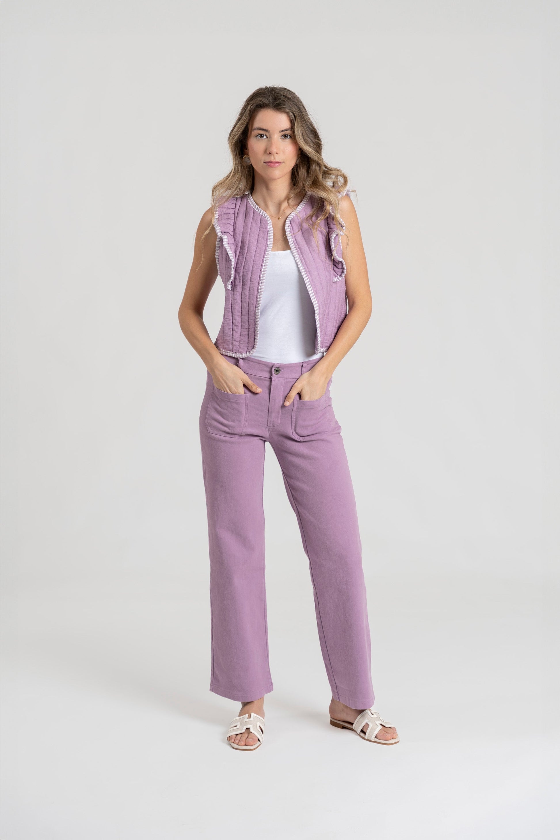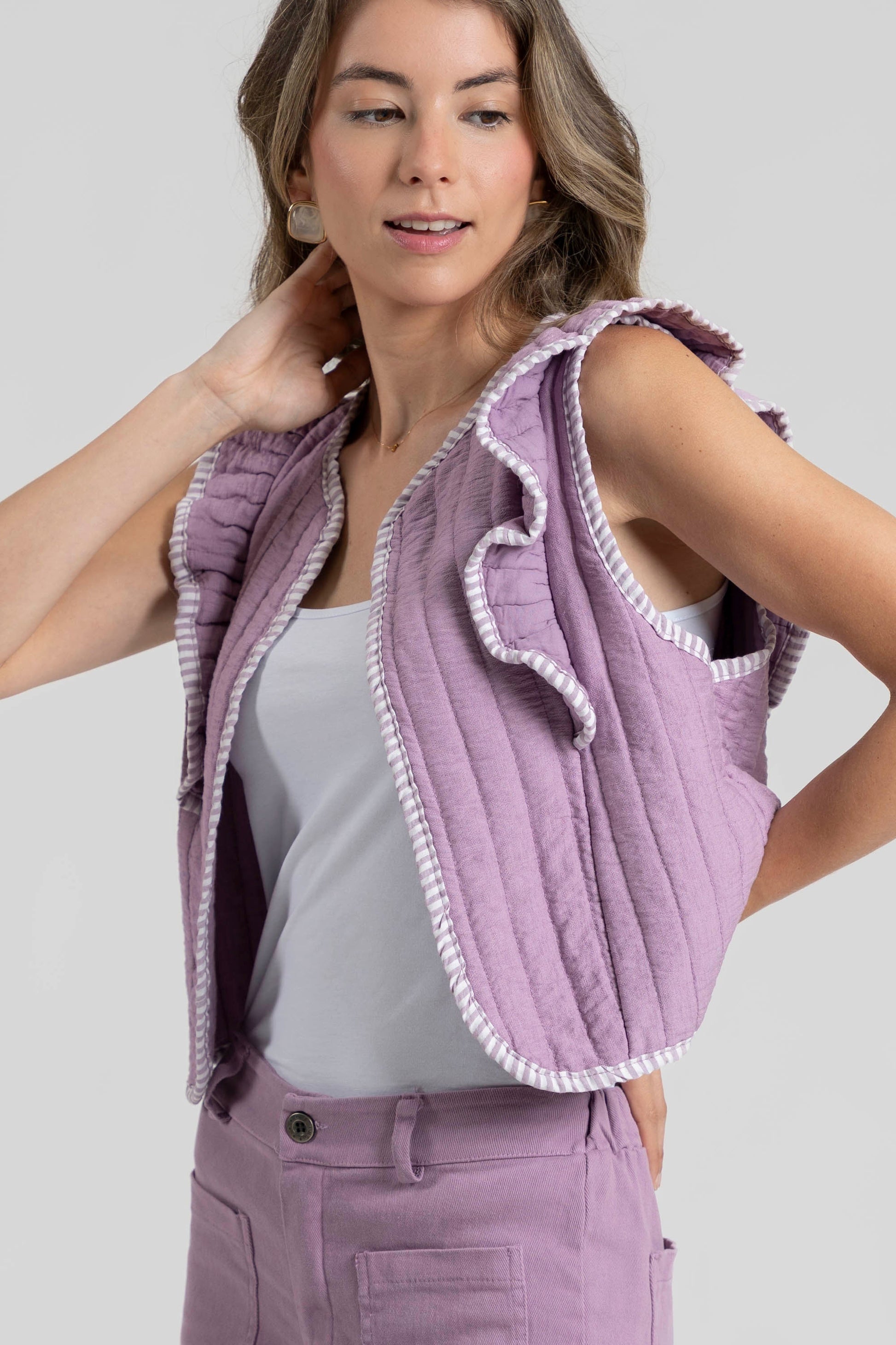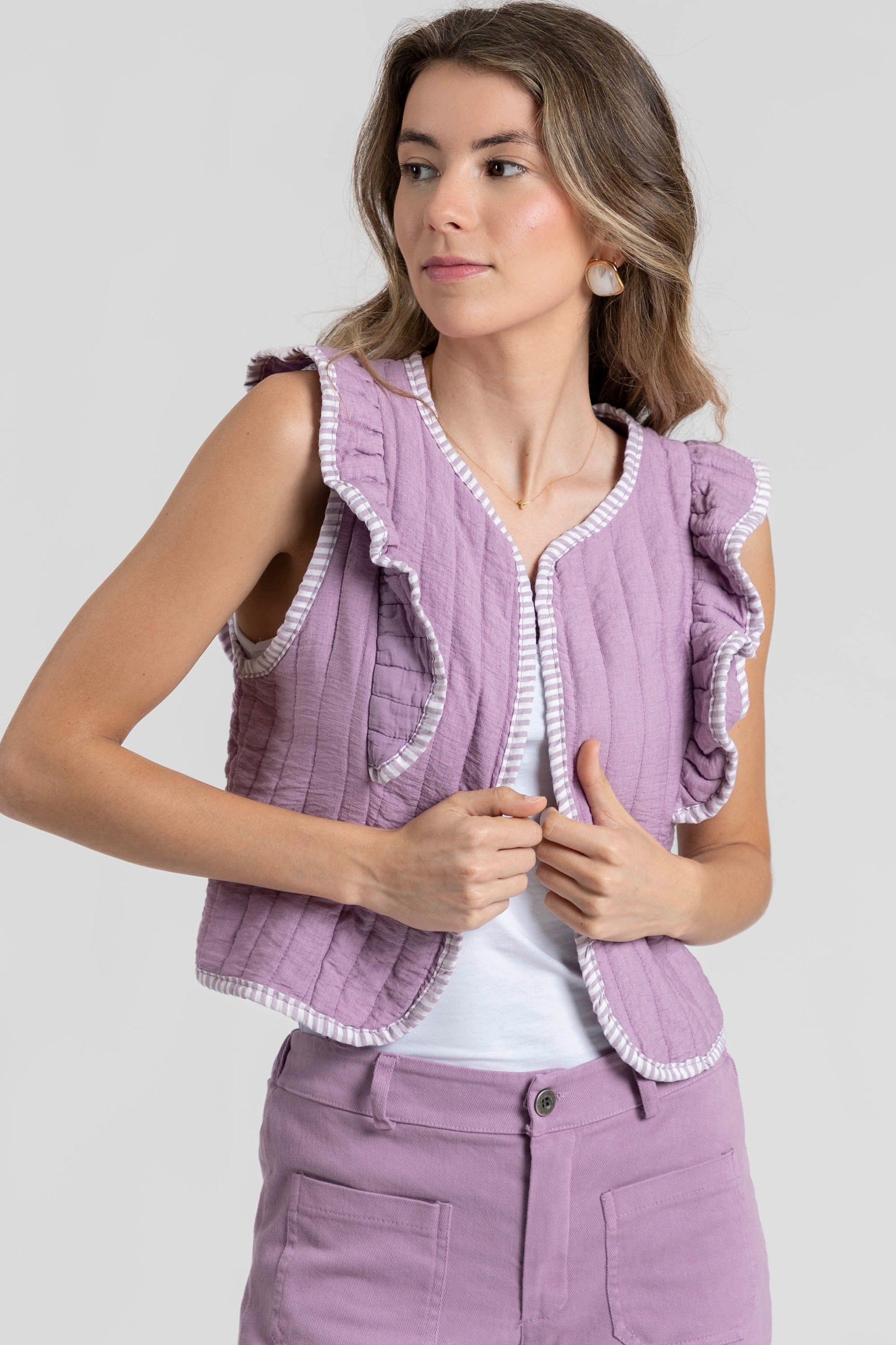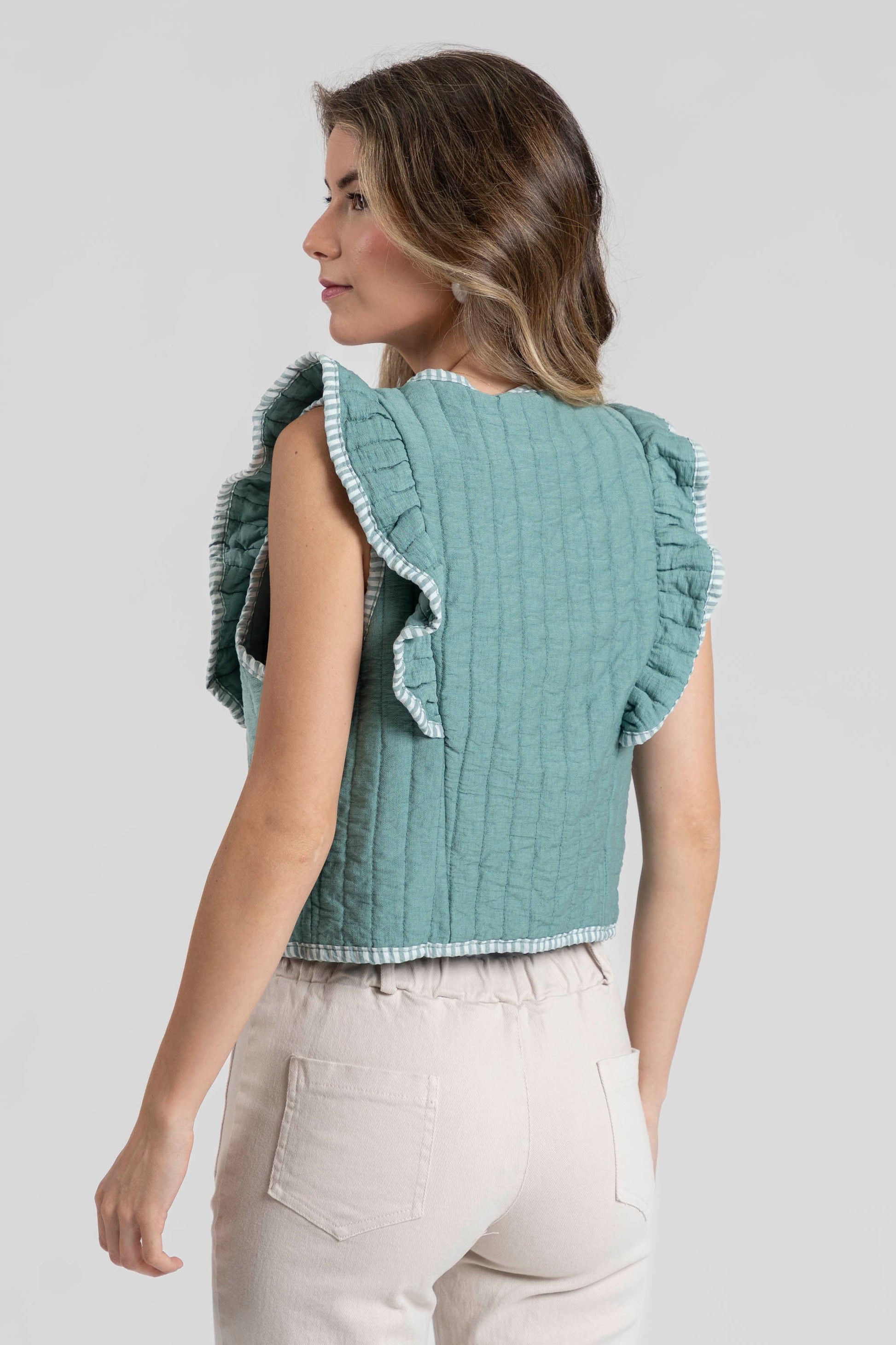 Tejido mezcla de algodón. Tejido textura. Diseño recto. Cuello redondo Manga sisa. Hombros estructurados. Detalle volantes. Terminaciones estampadas. Sin cierre. Talla modelo: S.