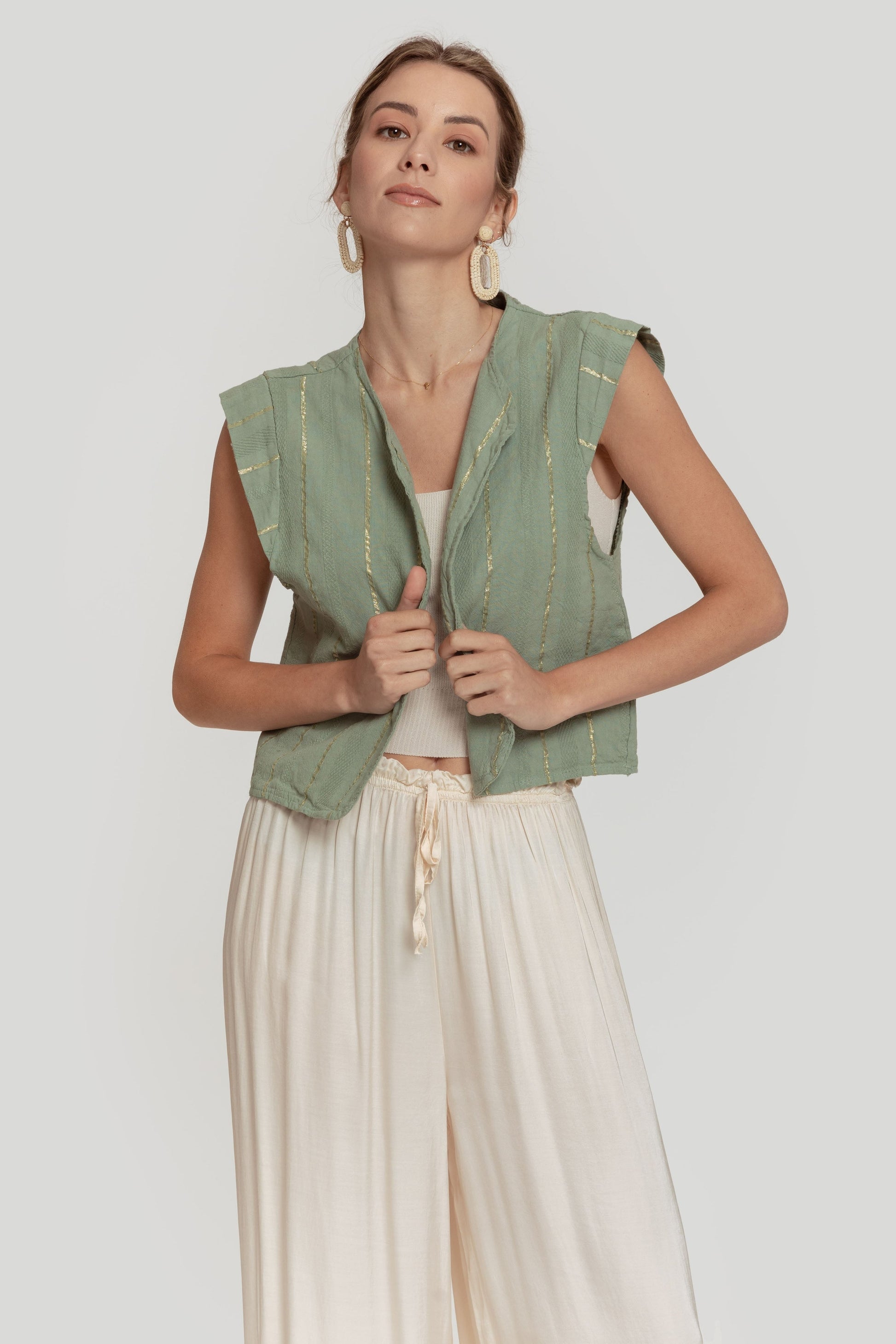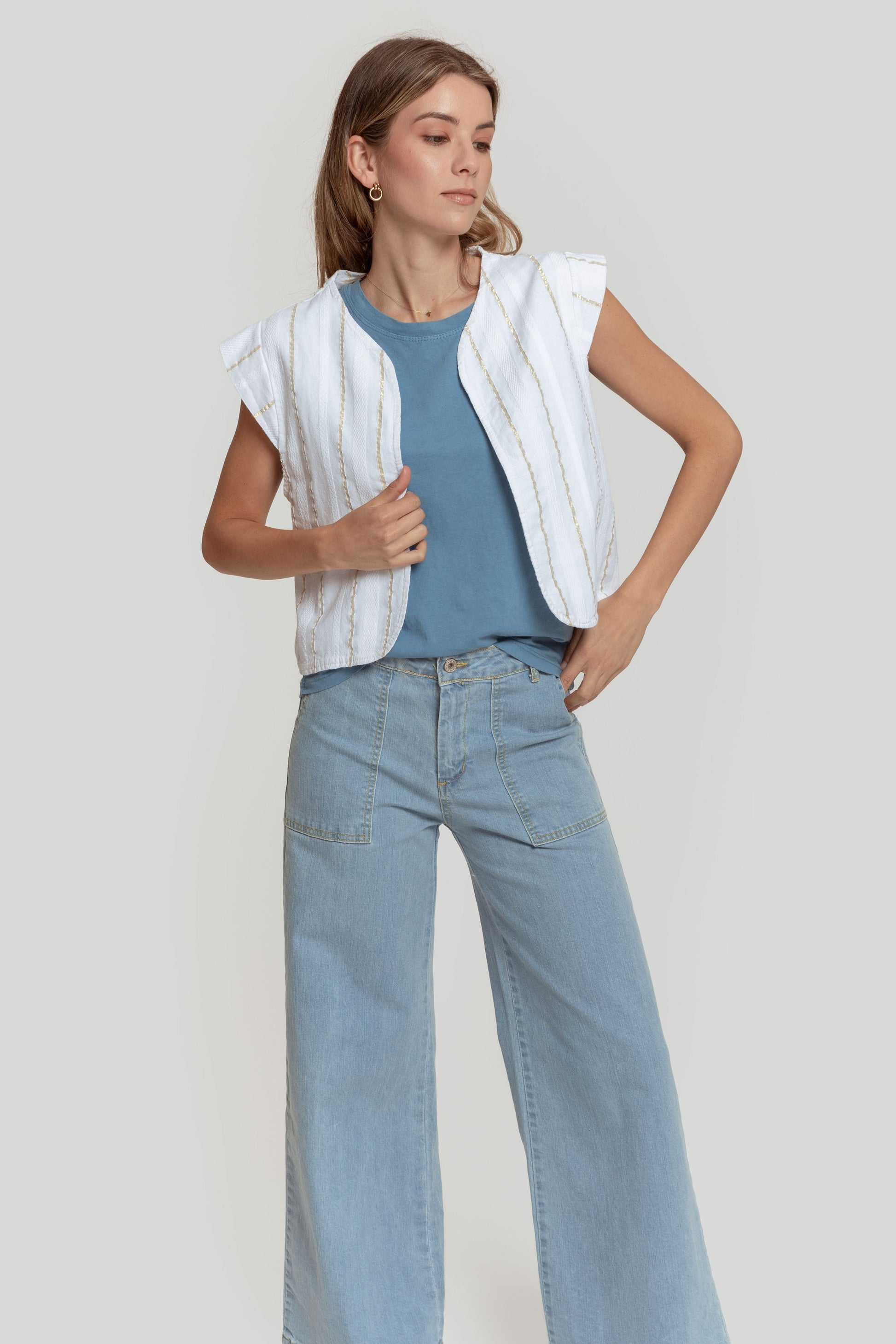 Tejido mezcla de algodón. Diseño estampado. Diseño recto. Cuello redondo. Manga sisa. Trama brillante. Talla modelo: S. Altura modelo 1,70 m.