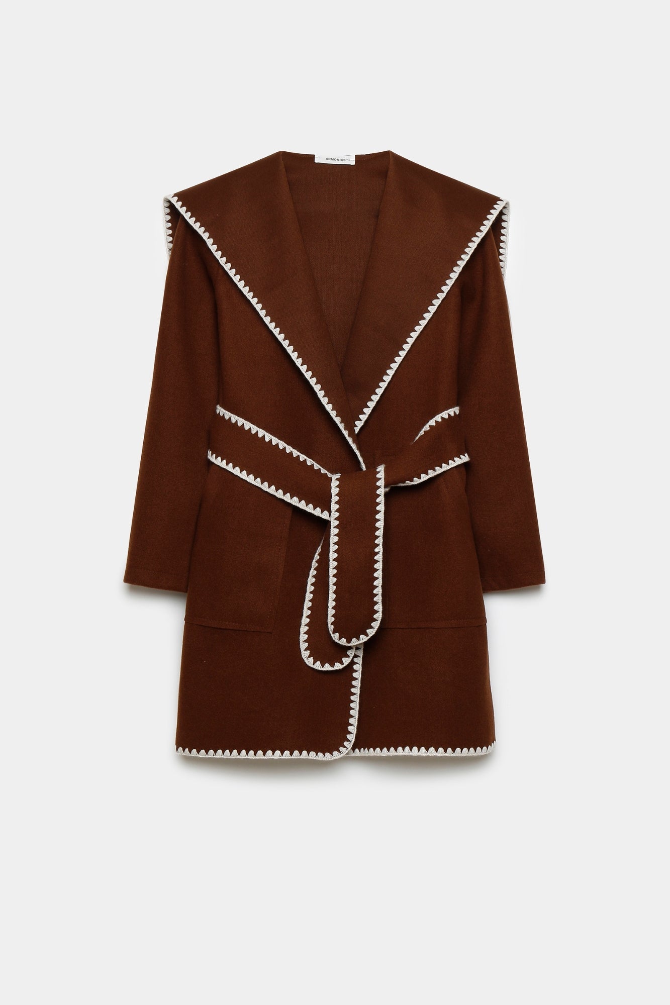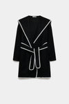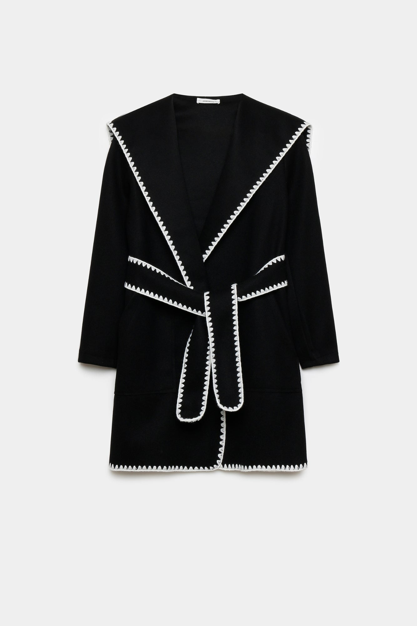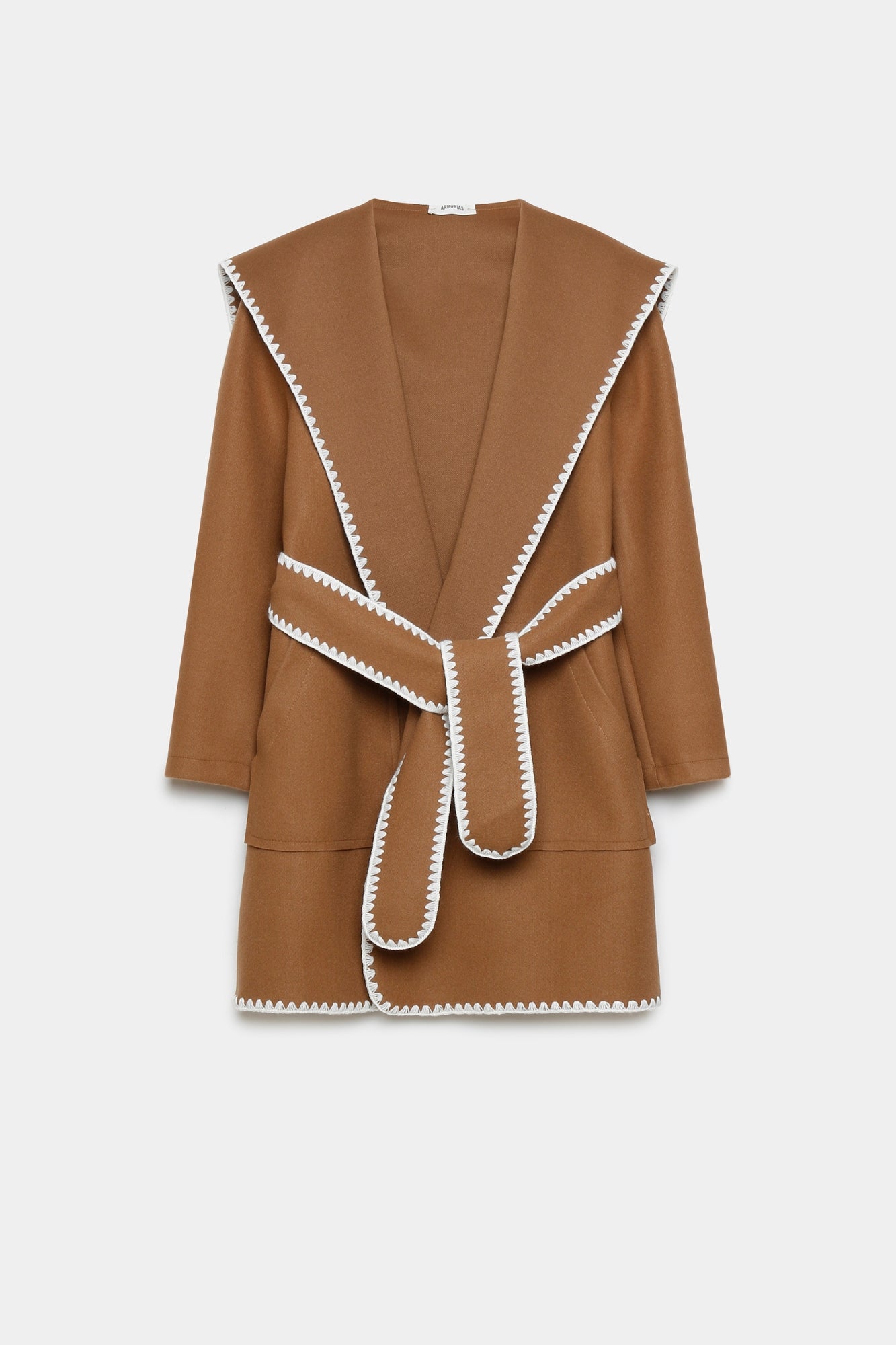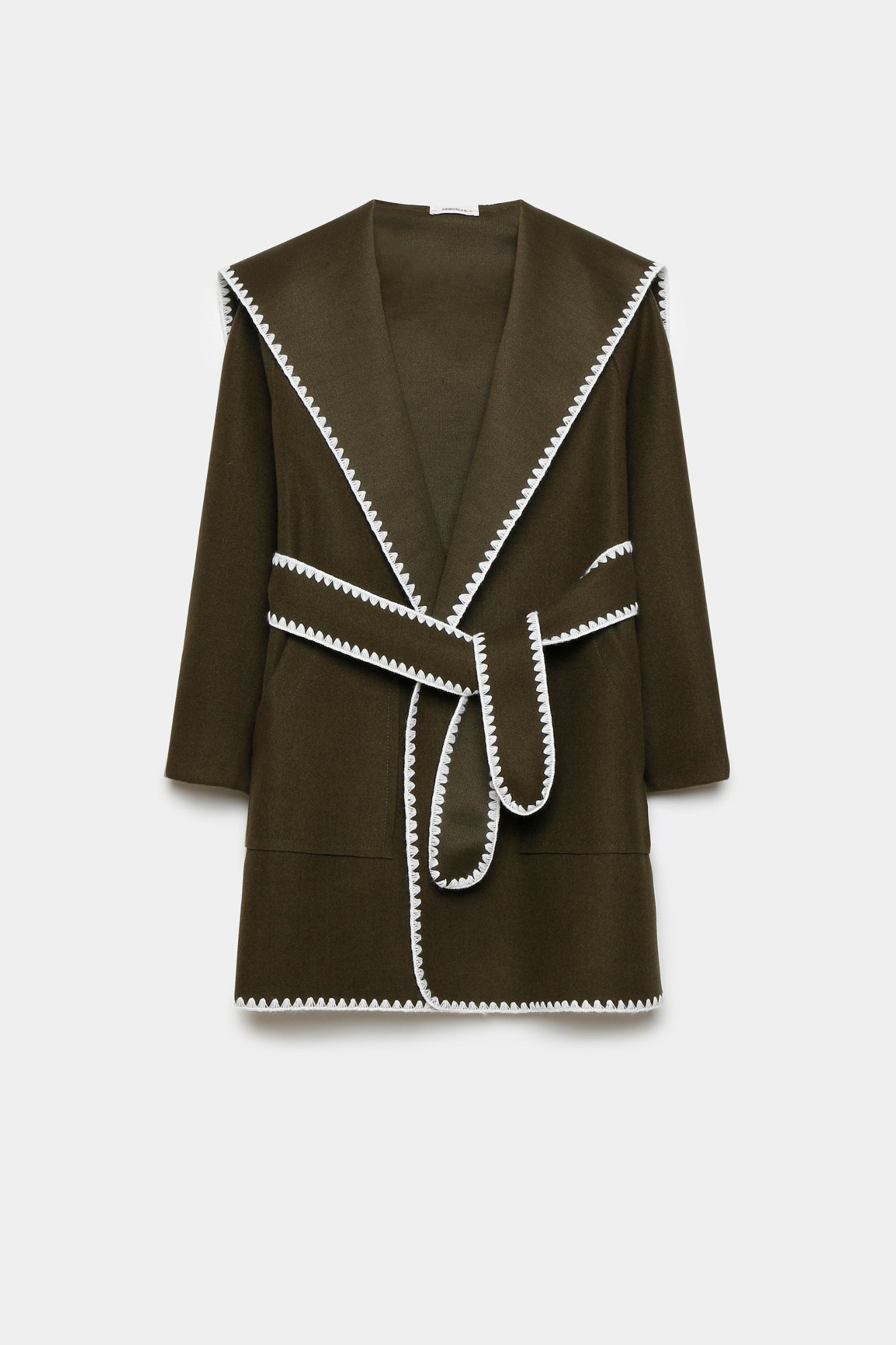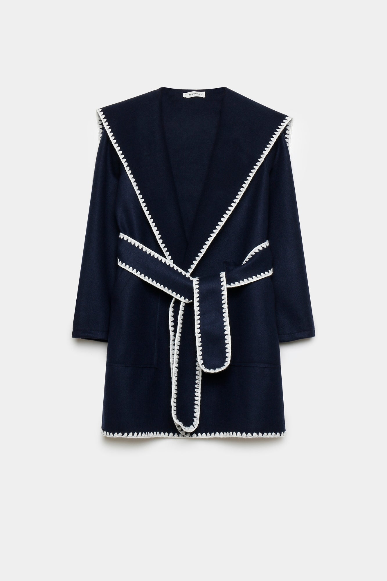 Cuello solapa. Manga larga. Bolsillos delanteros de vivo. Cierre frontal cruzado con cinturón de mismo tejido. Detalle bordados. Disponible en varios colores.