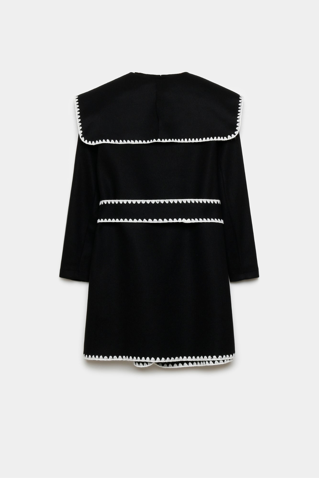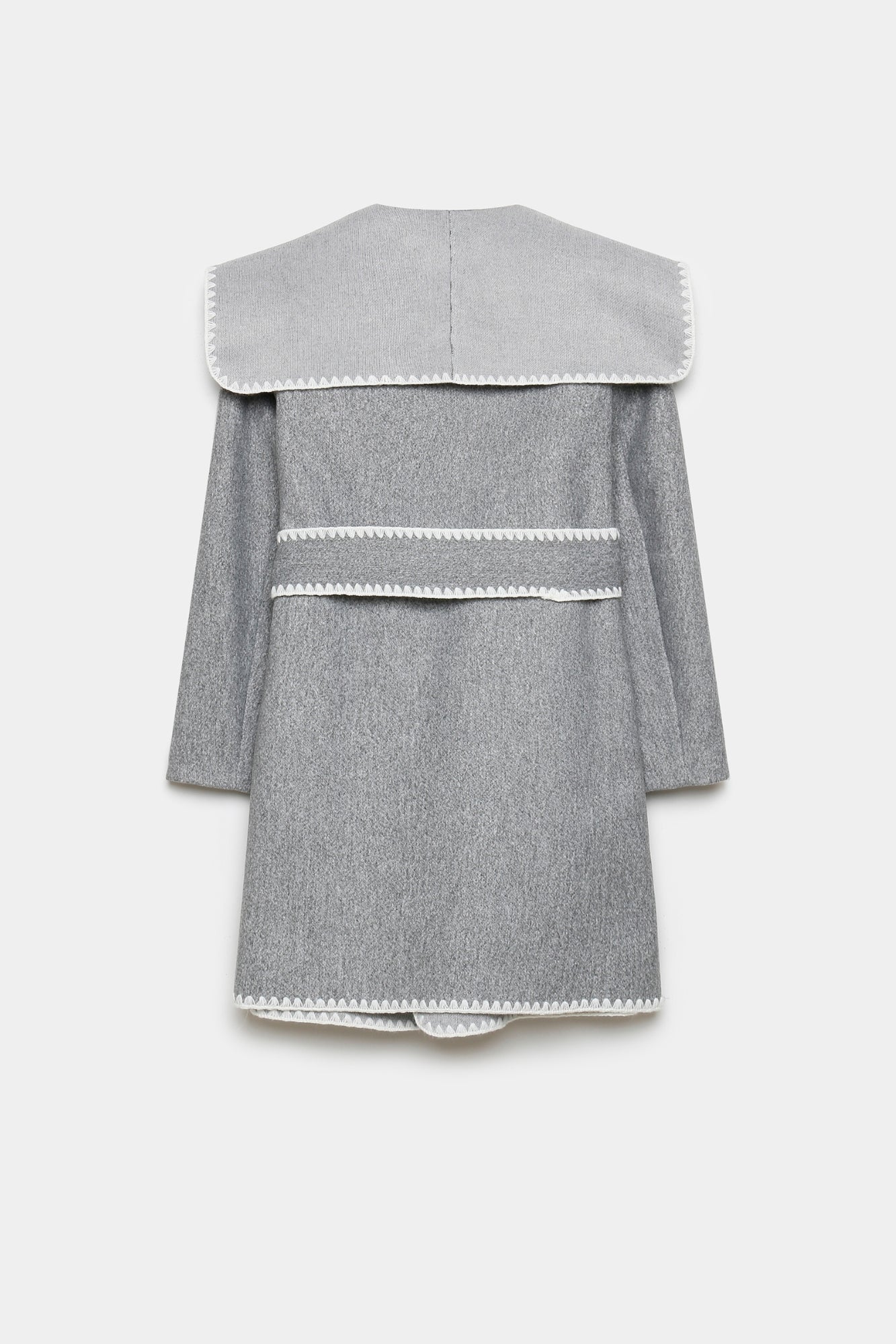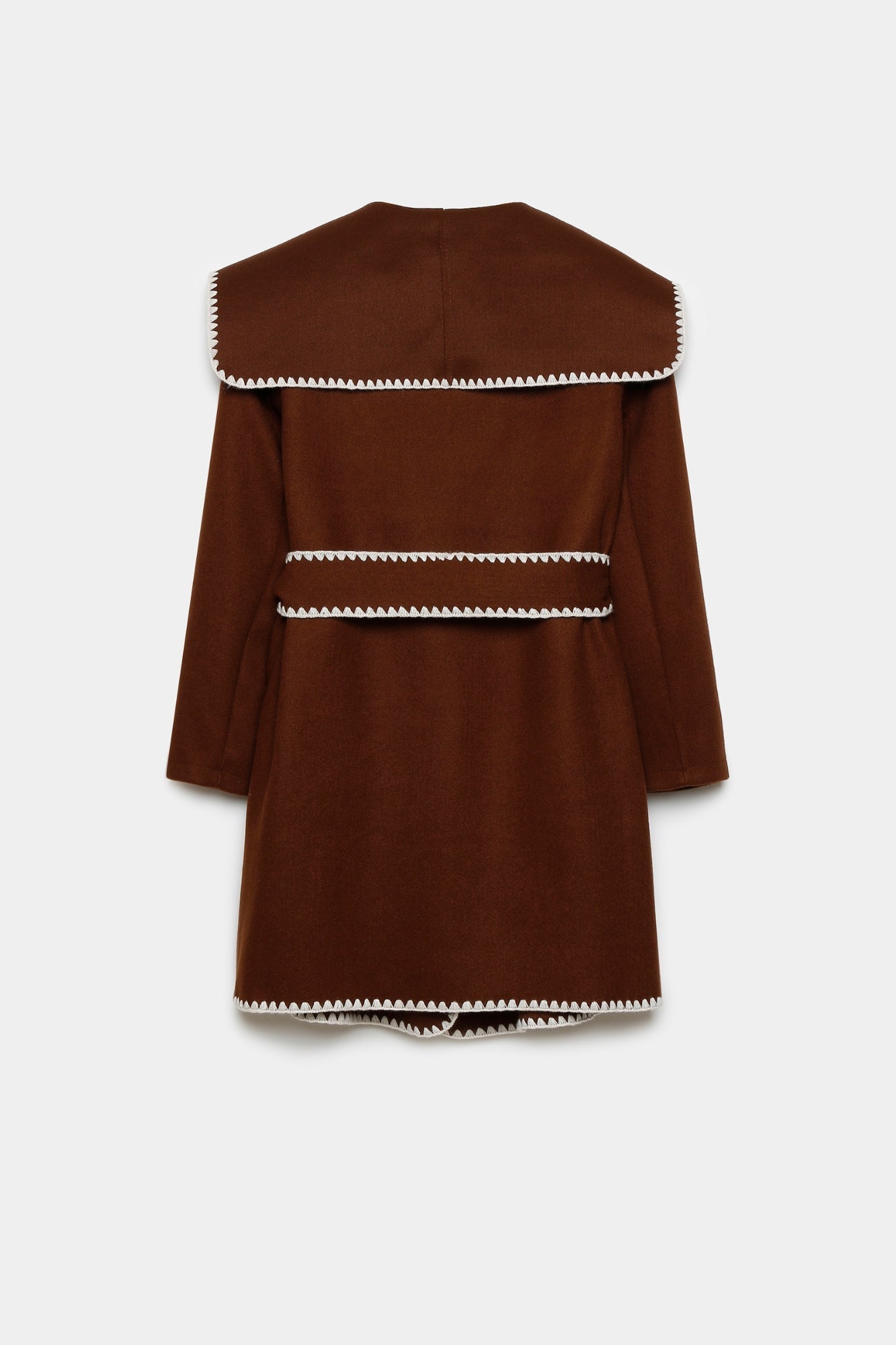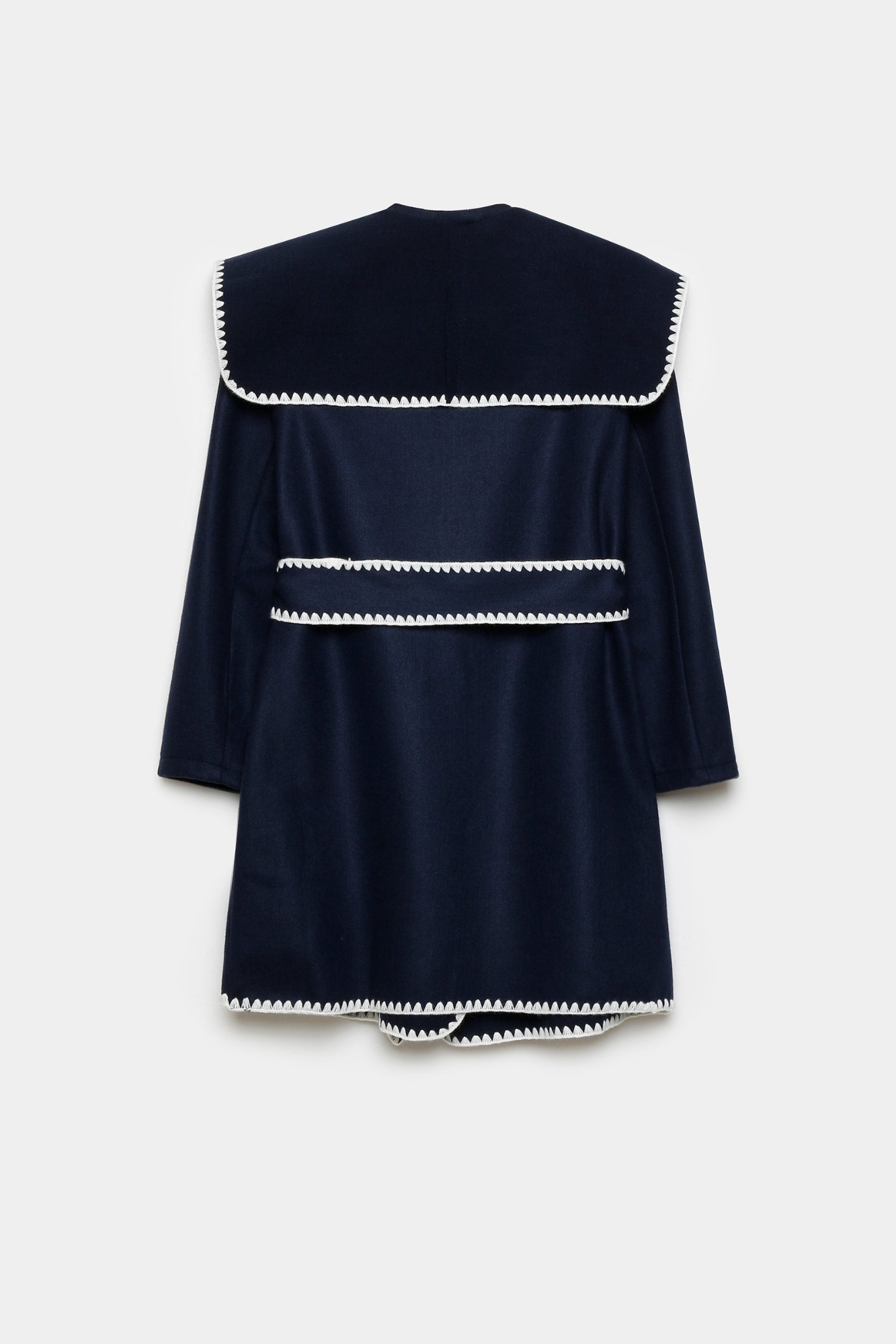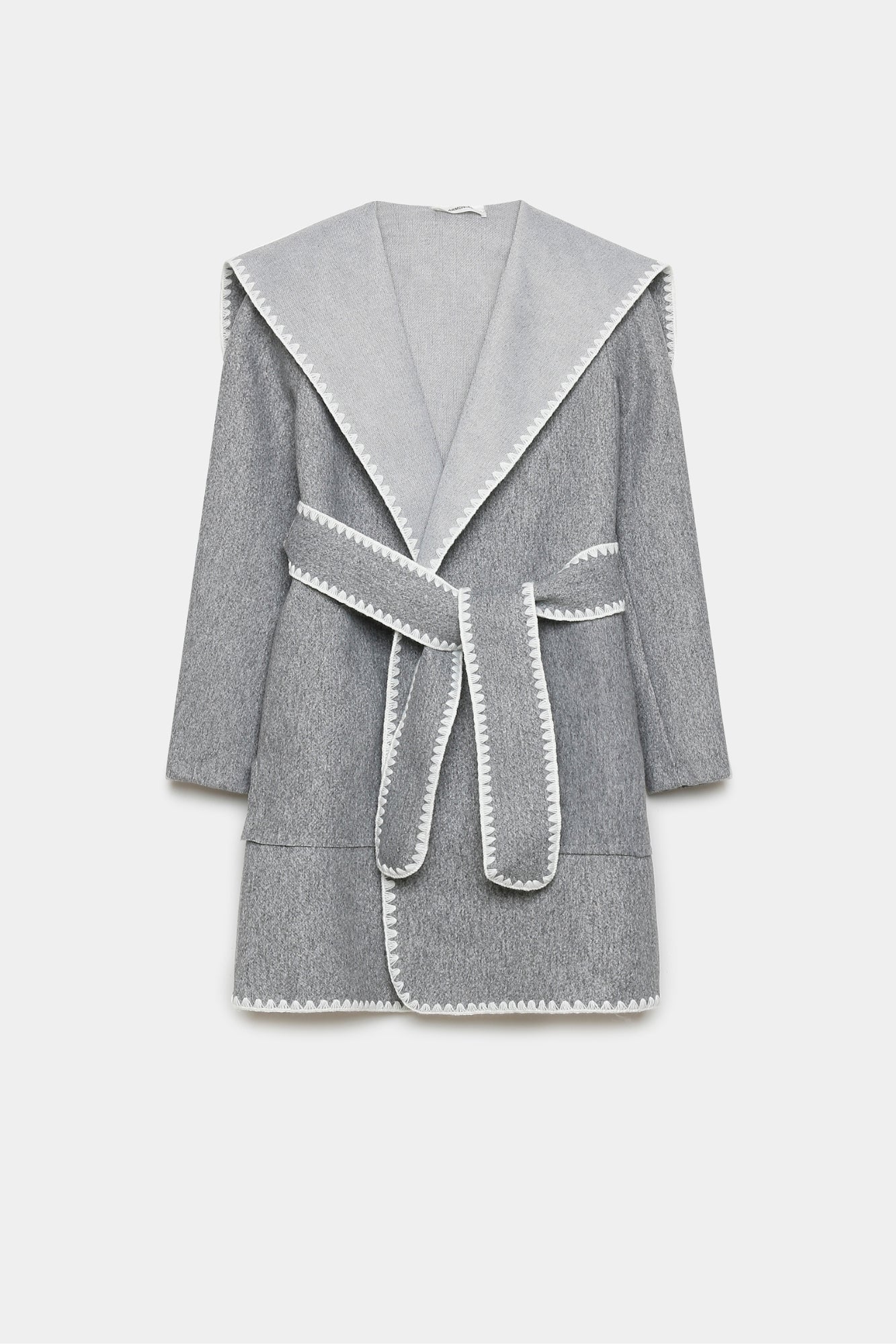 Cuello solapa. Manga larga. Bolsillos delanteros de vivo. Cierre frontal cruzado con cinturón de mismo tejido. Detalle bordados. Disponible en varios colores.