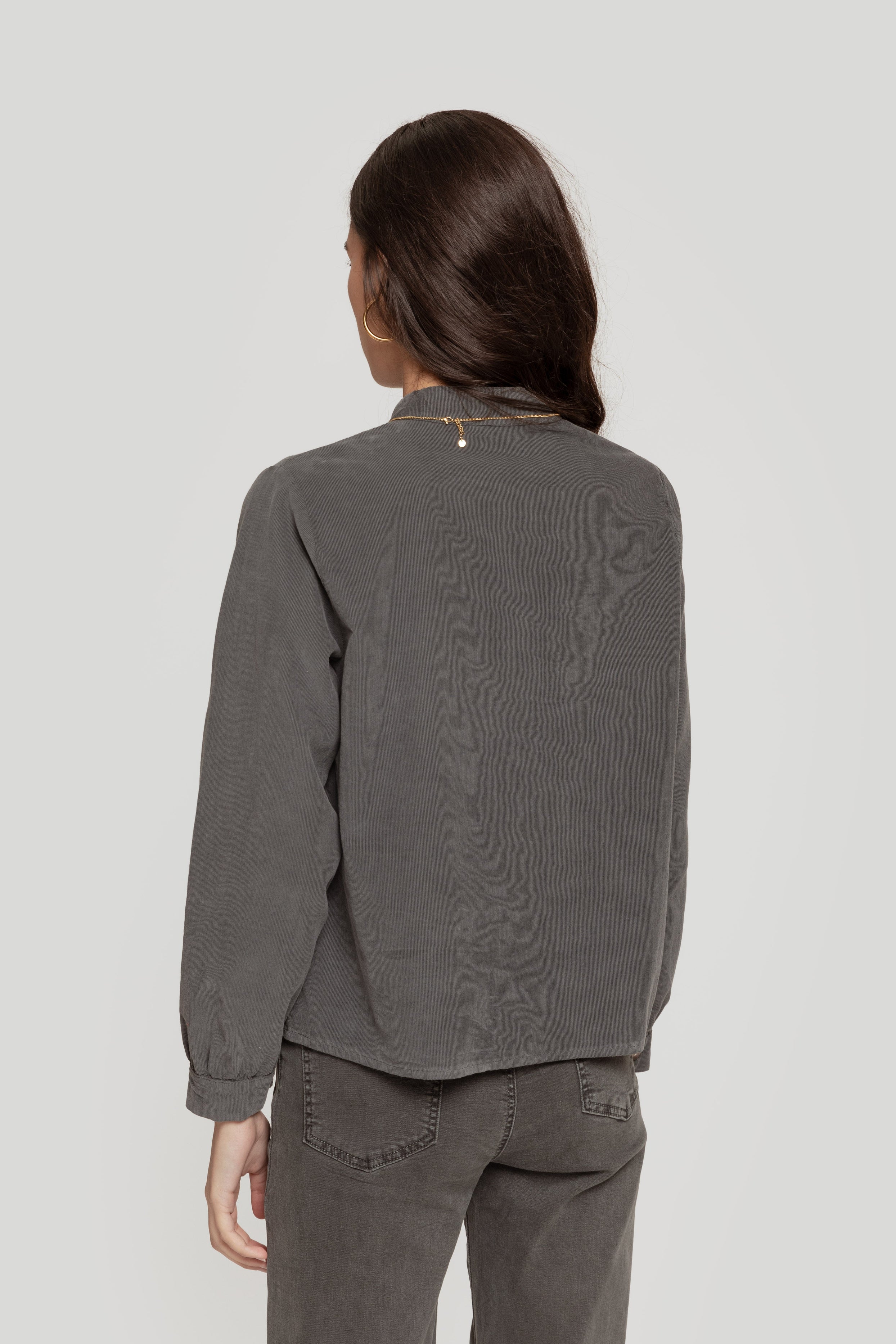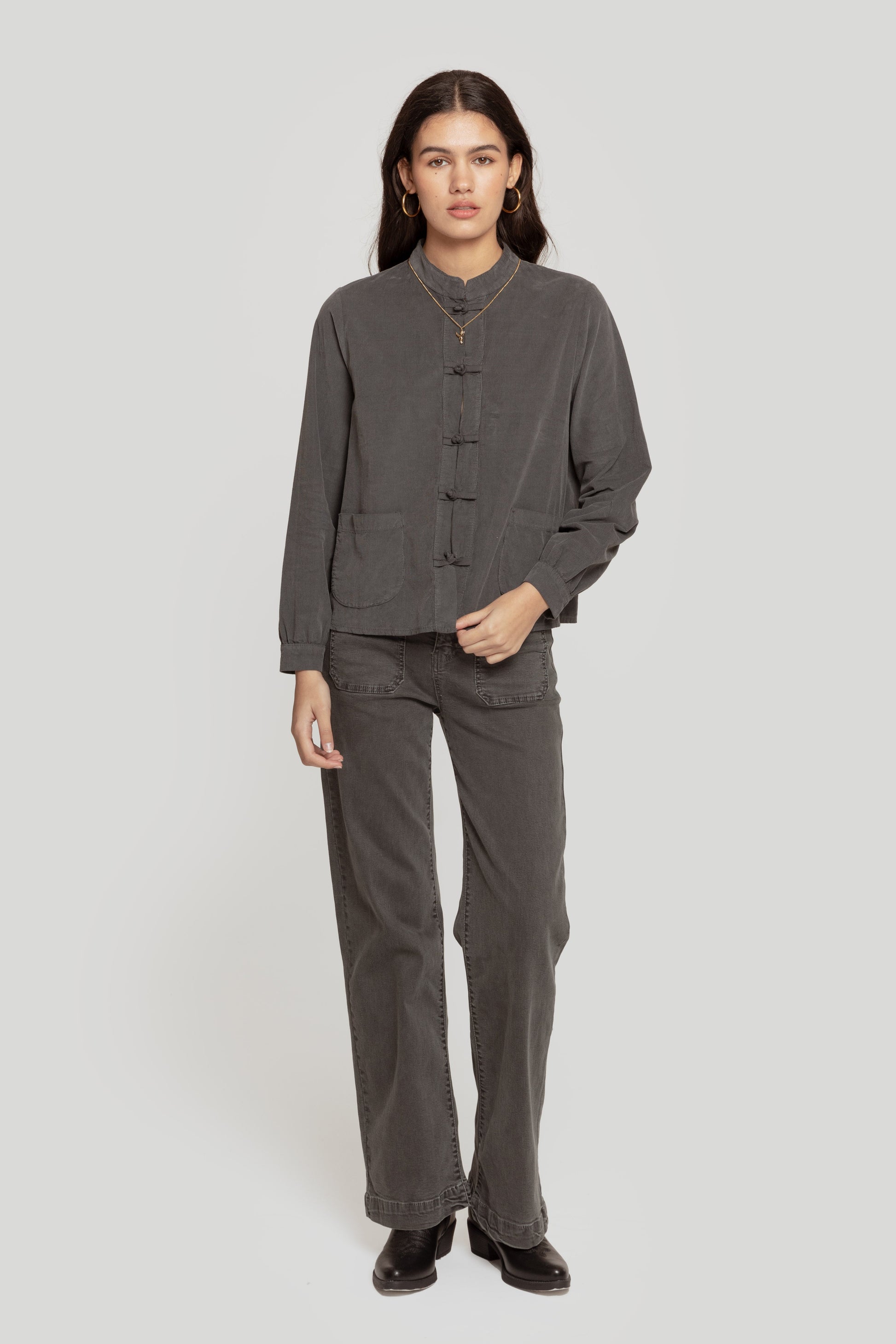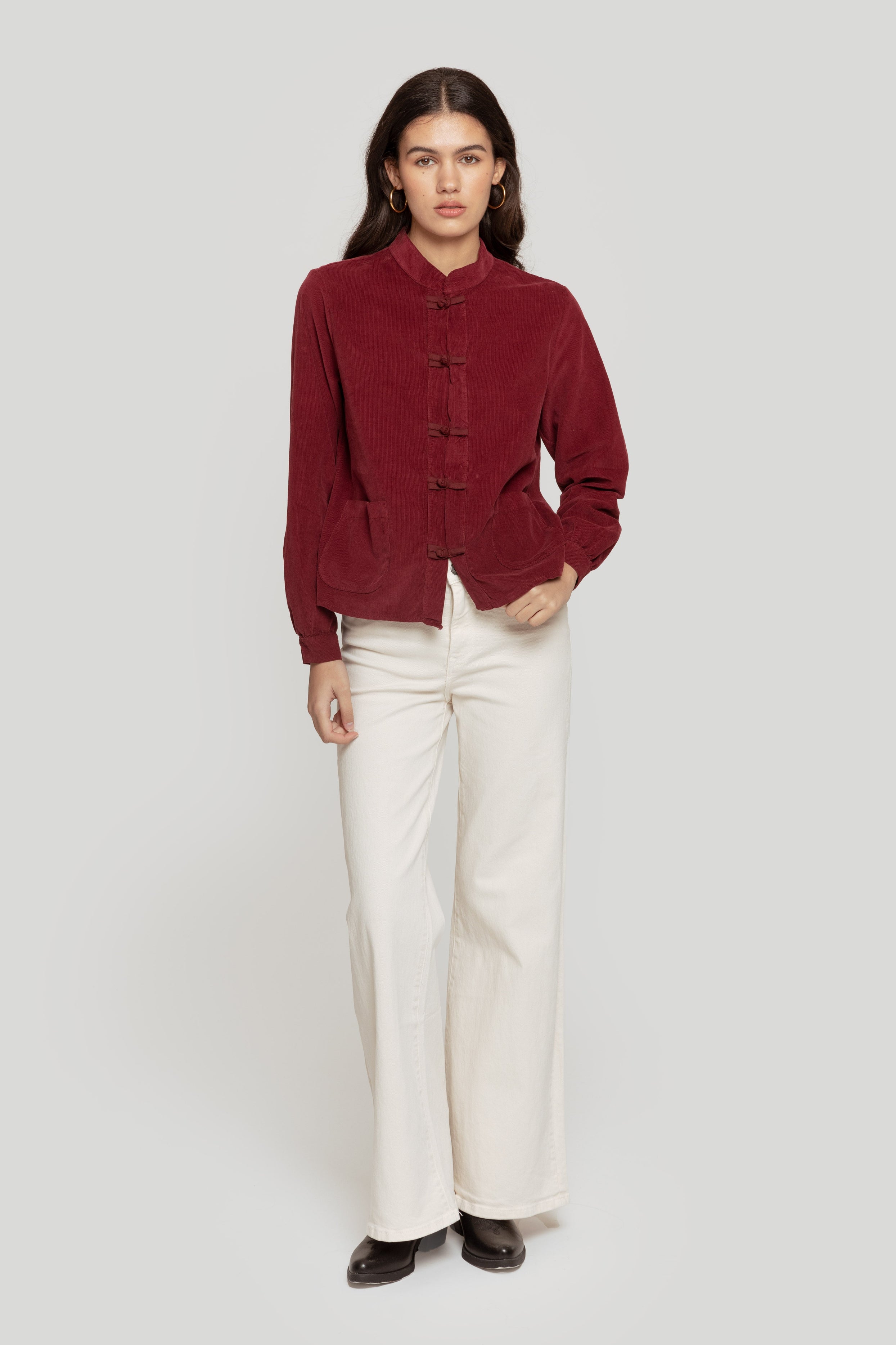 Tejido de algodón. Tejido de pana. Diseño recto. Cuello redondo. Manga larga. Cierre de ojales con nudos. Bolsillos frontales. Talla modelo: S. Altura modelo: 1,75 m.