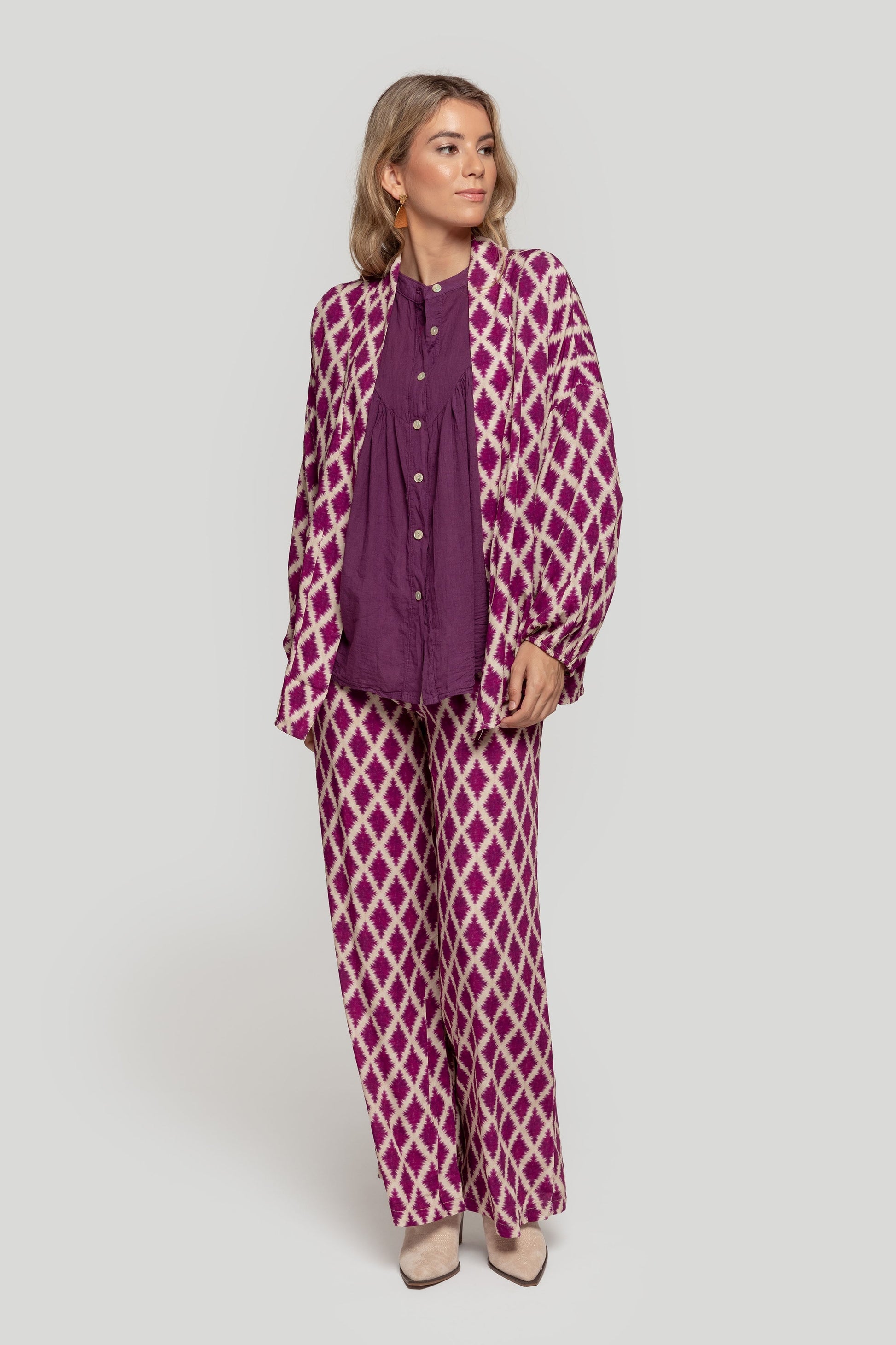 Tejido de acabado suave. Diseño estampado. Diseño recto. Diseño fluido. Manga larga. Puño elástico. Abierto. Talla S. Altura modelo 1,70 m.