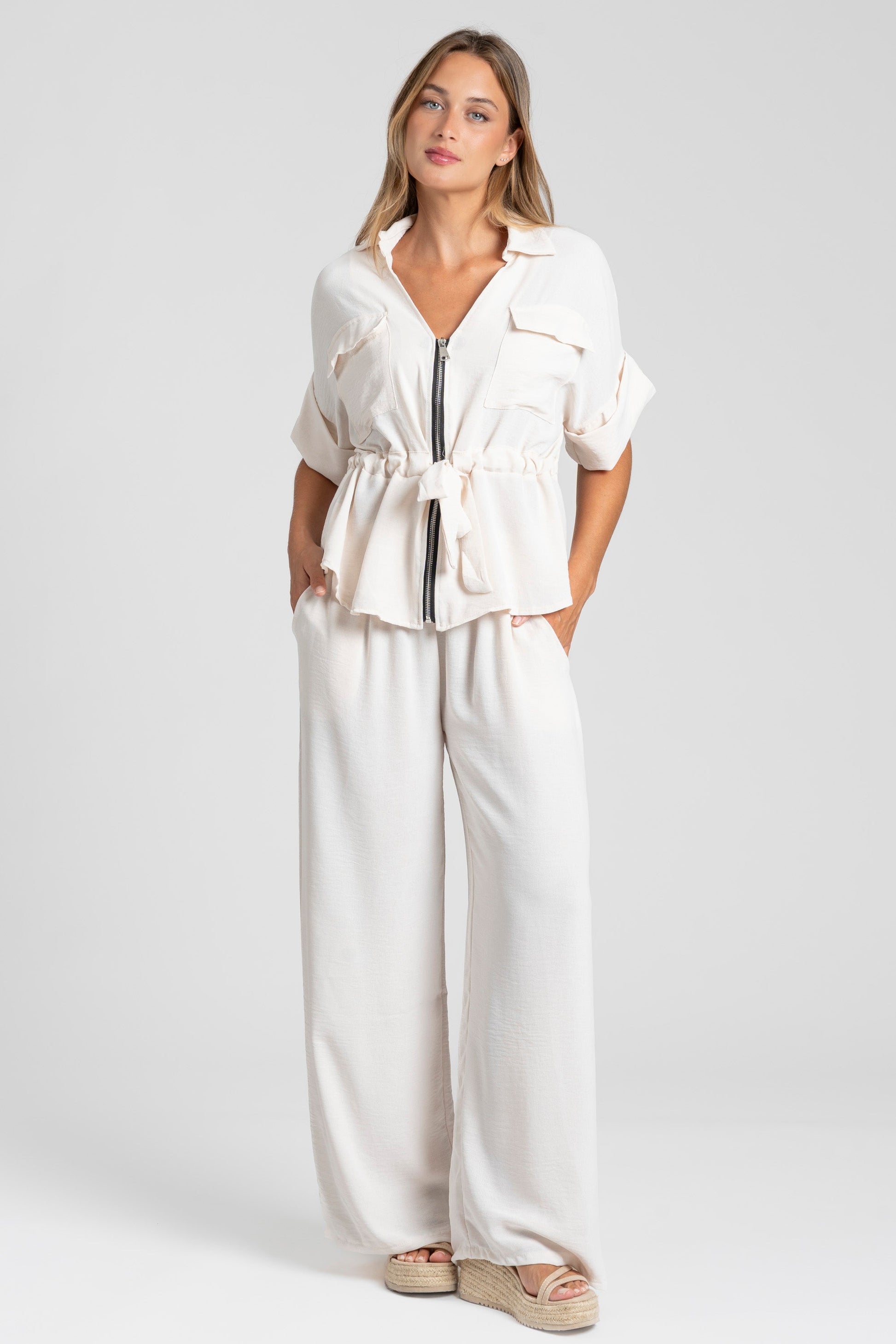 Conjunto chaqueta y pantalón. Tejido fluido. Chaqueta manga corta. Cierre cremallera. Bolsillos solapa. Cintura ajustable. Pantalón tiro alto. Bolsillos laterales. Pernera ancha.