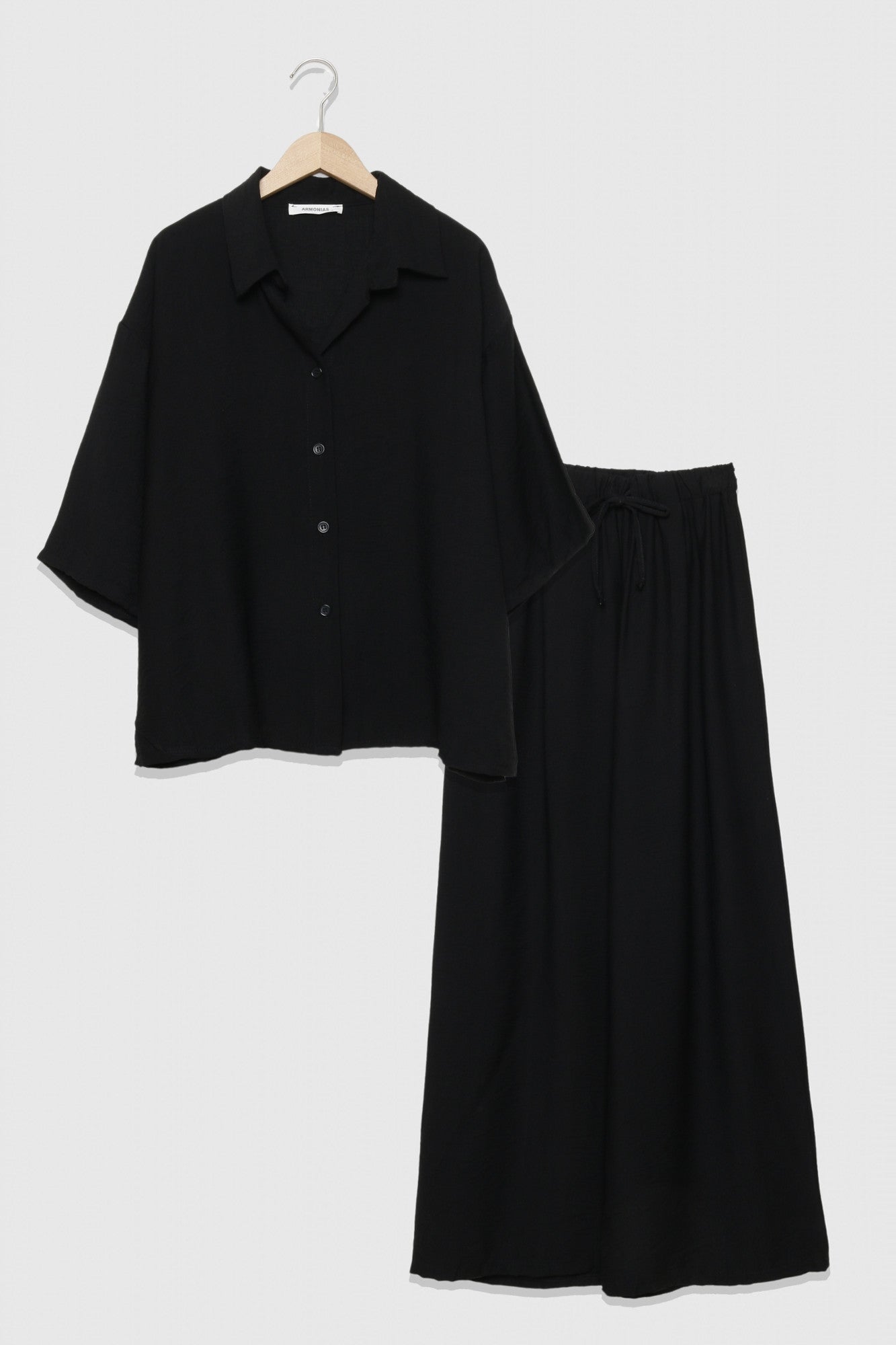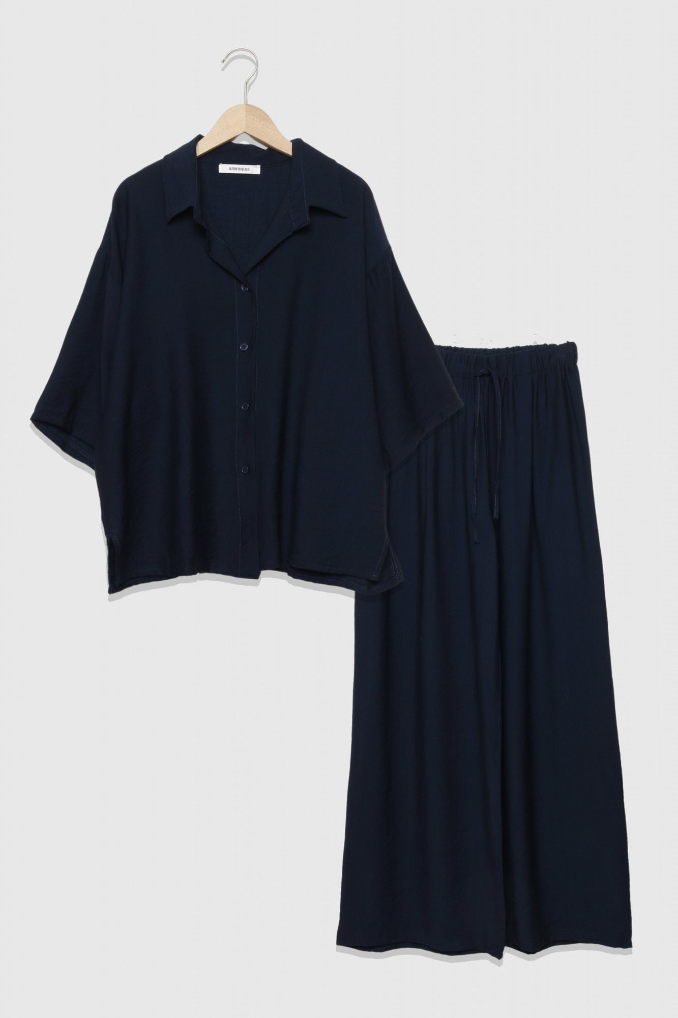 Conjunto de camisa y pantalón. Tejido fluido. Tejido con textura. Camisa oversize. Cierre de botones. Pantalón con cintura elástica ajustable. Disponible en varios colores.