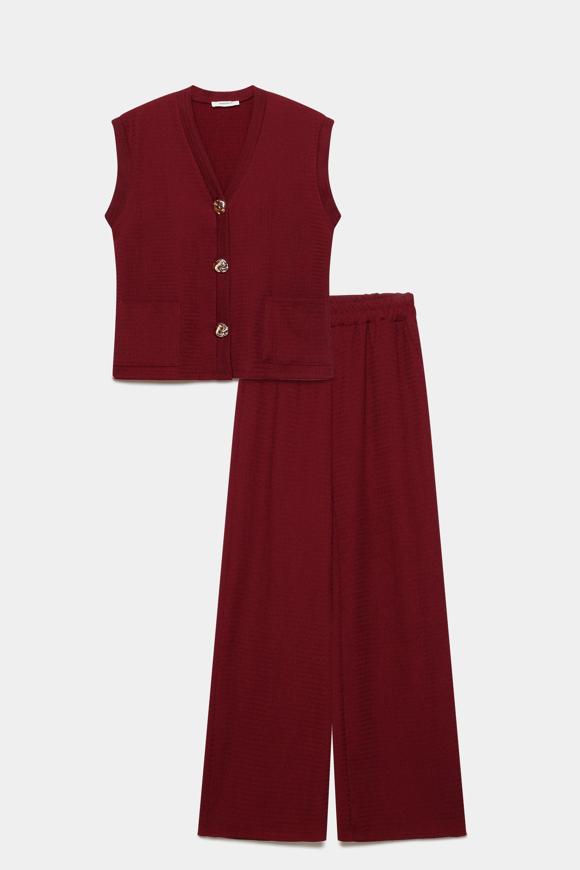 Tejido textura fluido. Escote pico. Manga sisa. Cierre frontal botones. Bolsillos frontales. Pantalón de tiro alto. Cintura elástica. Bolsillos laterales. Pernera recta.