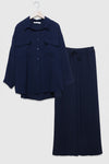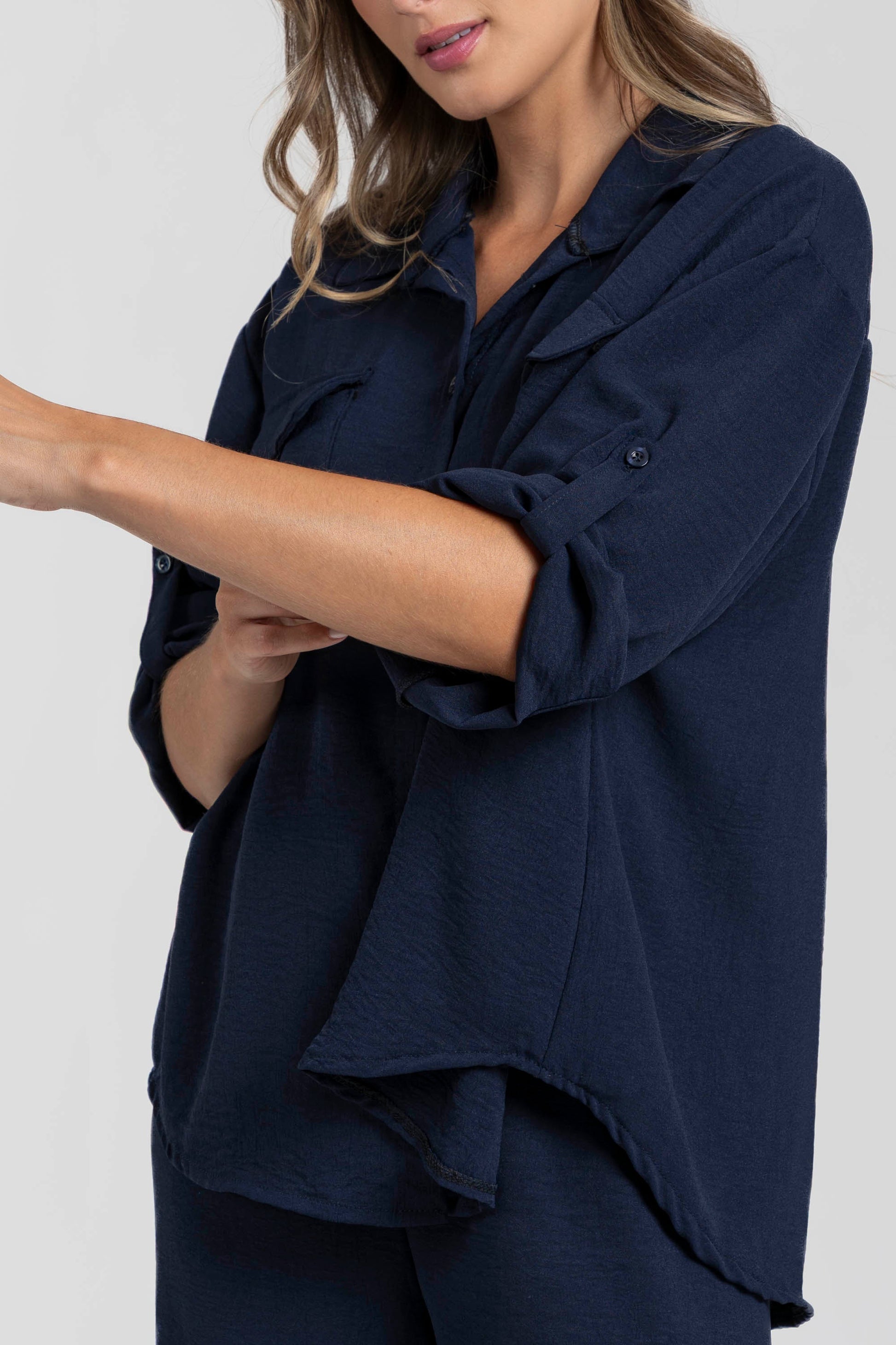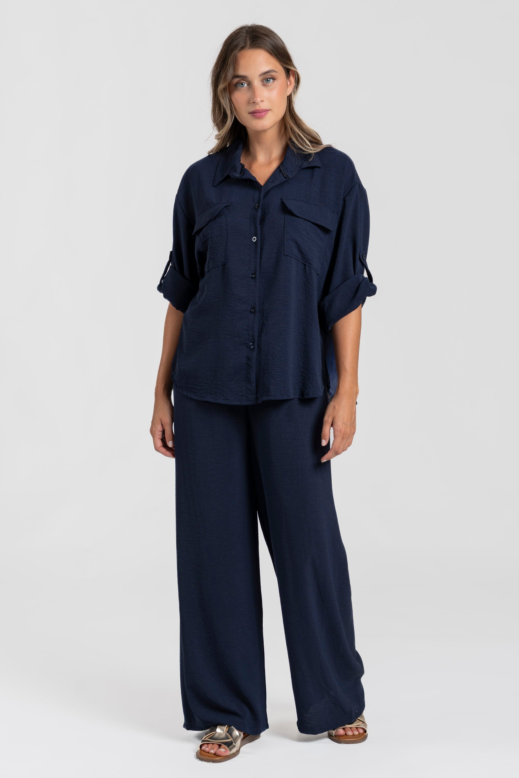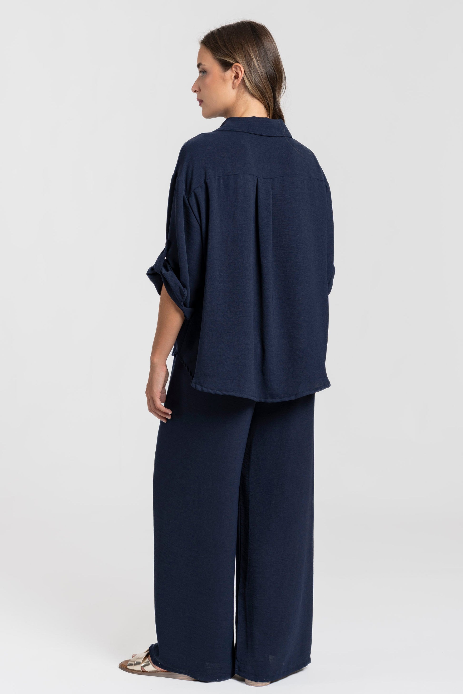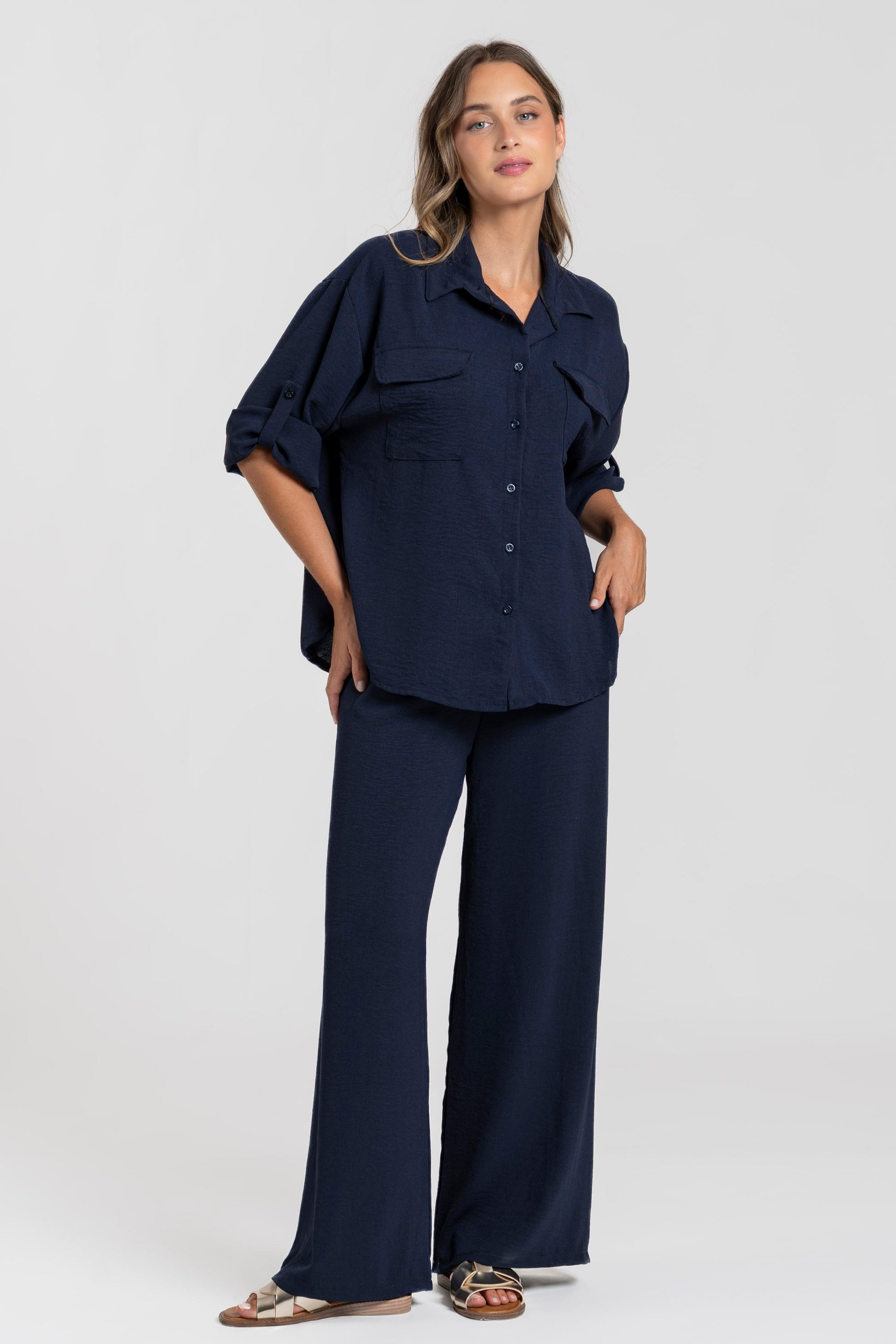 Conjunto de camisa y pantalón. Tejido de gasa. Tejido con textura. Camisa fluida. Bolsillos delanteros con solapa. Cierre de botones. Pantalón cintura elástica. Diseño recto.