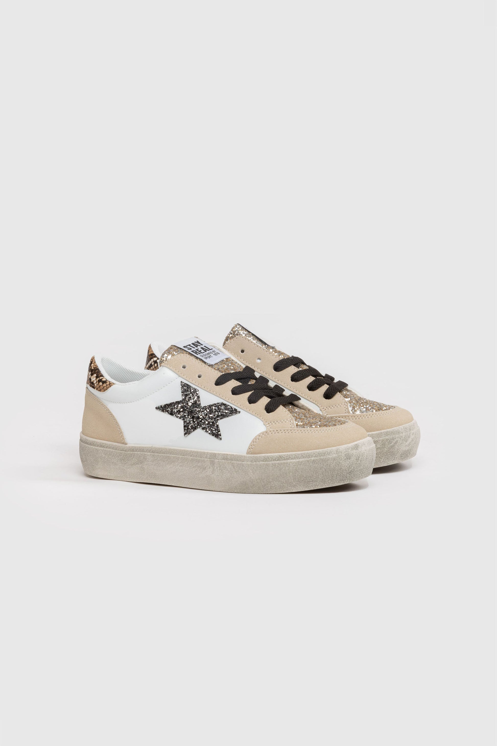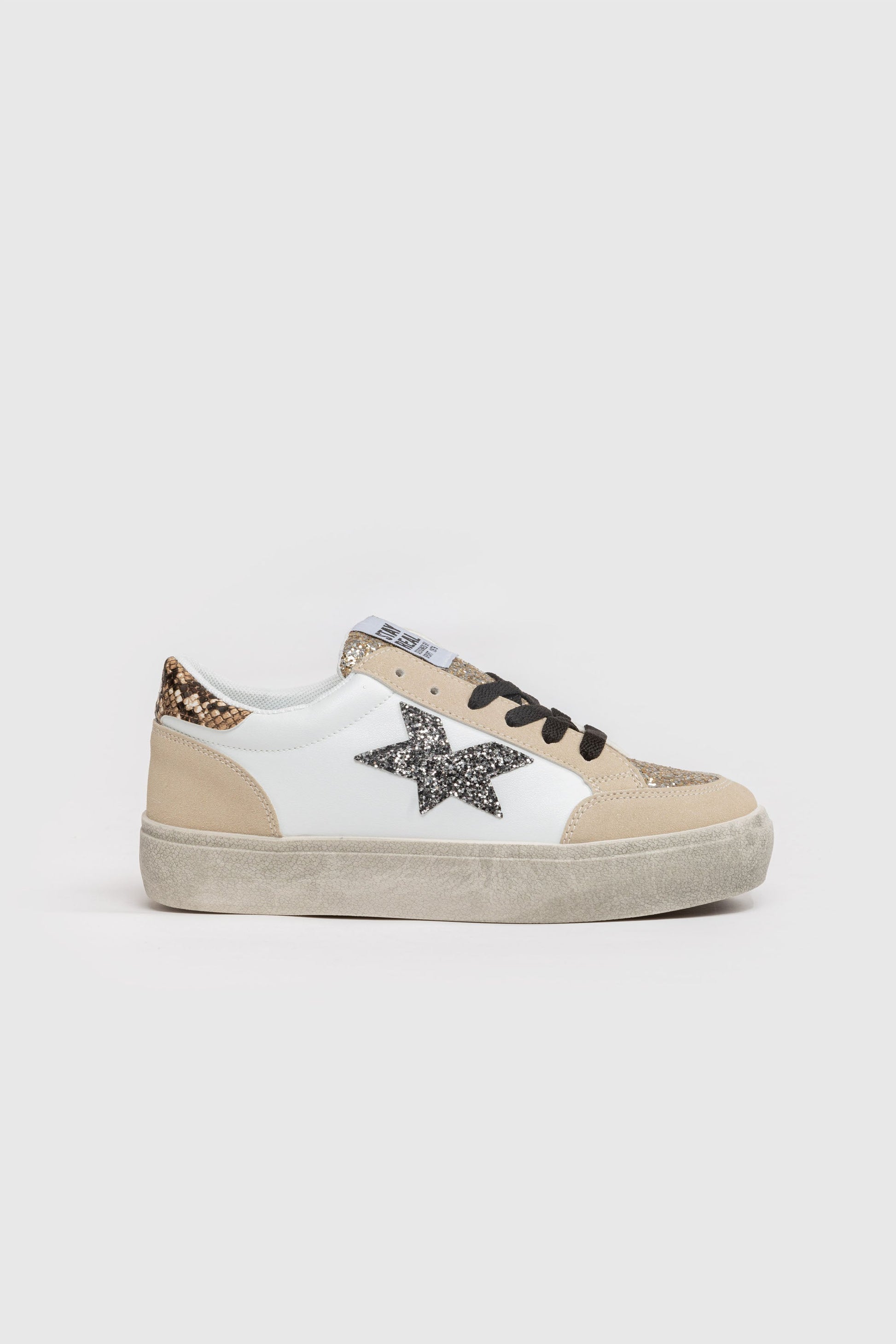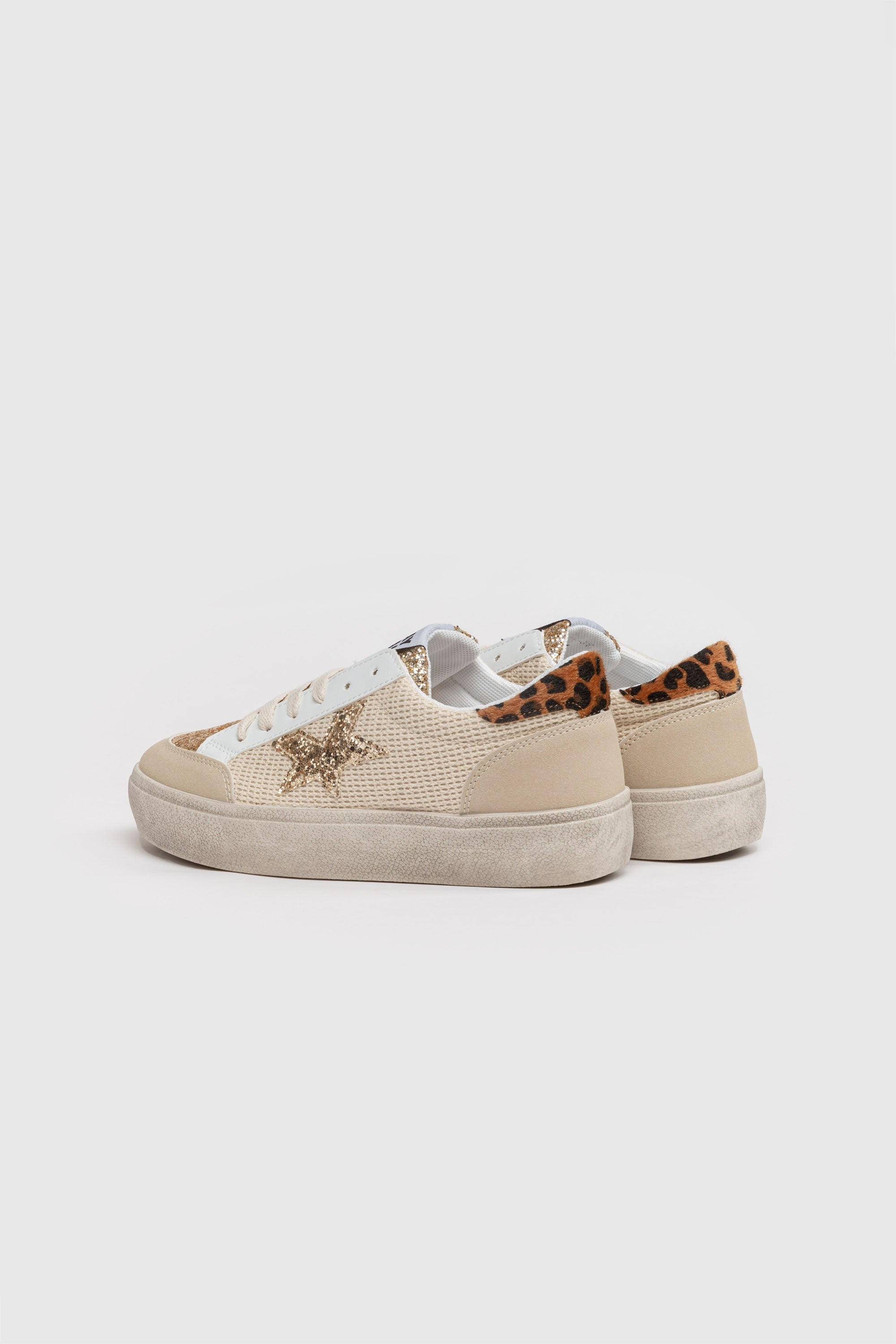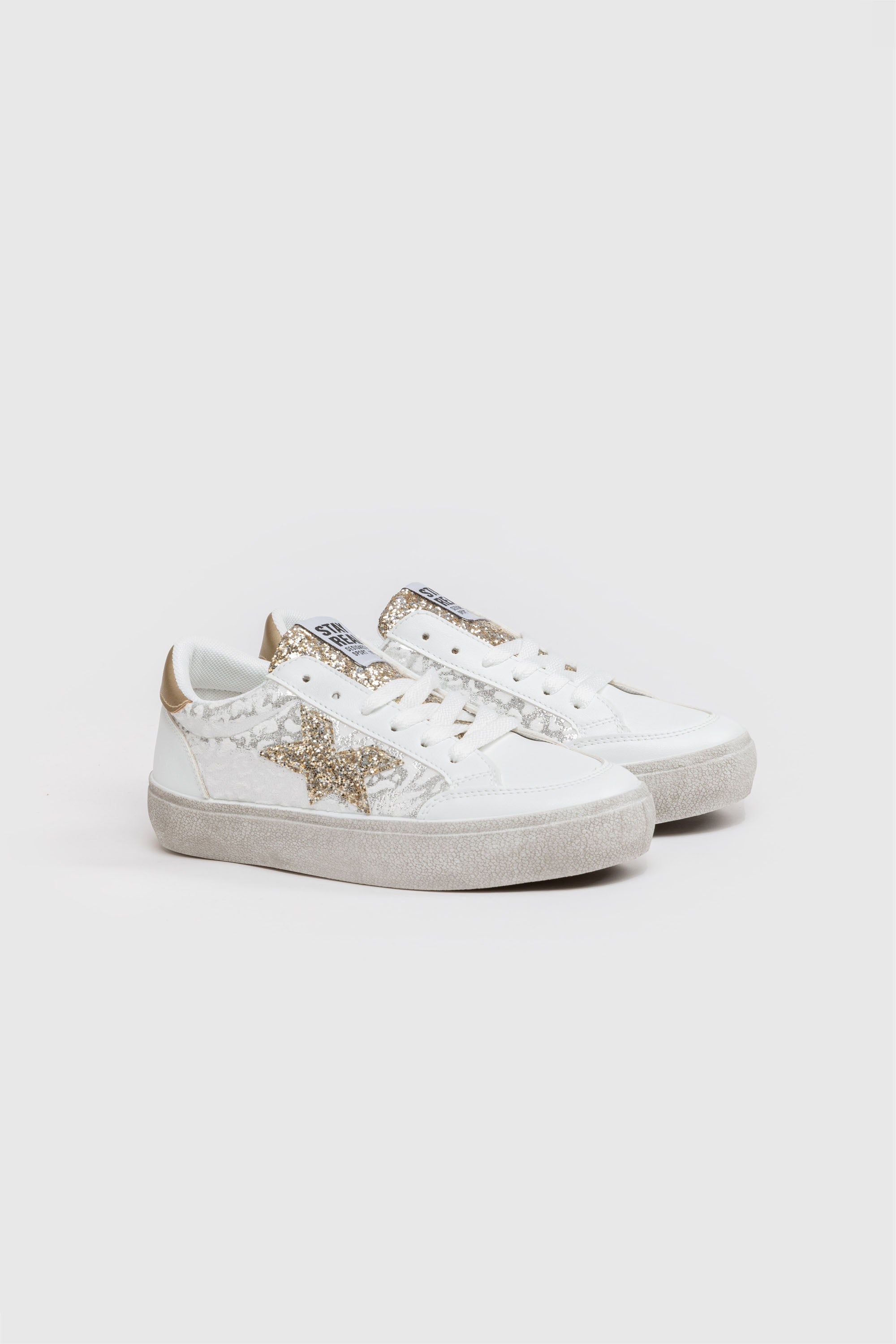 Zapato tipo deportiva. Tejido combinado. Diseño platarforma. Cierre de cordones. Suela manchada. Suela antideslizante. Estrella brillo lateral rosa. Panel trasero estampado.