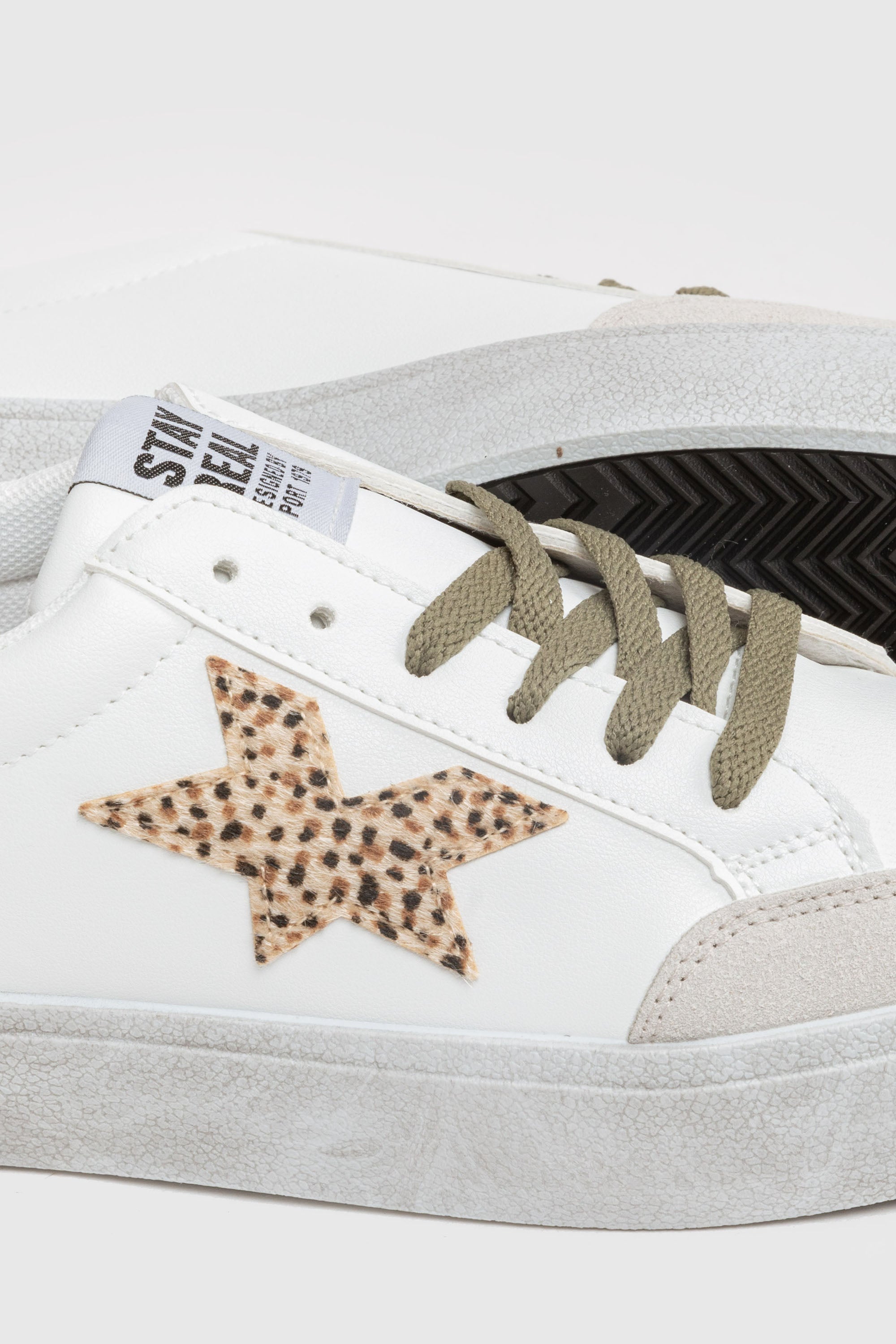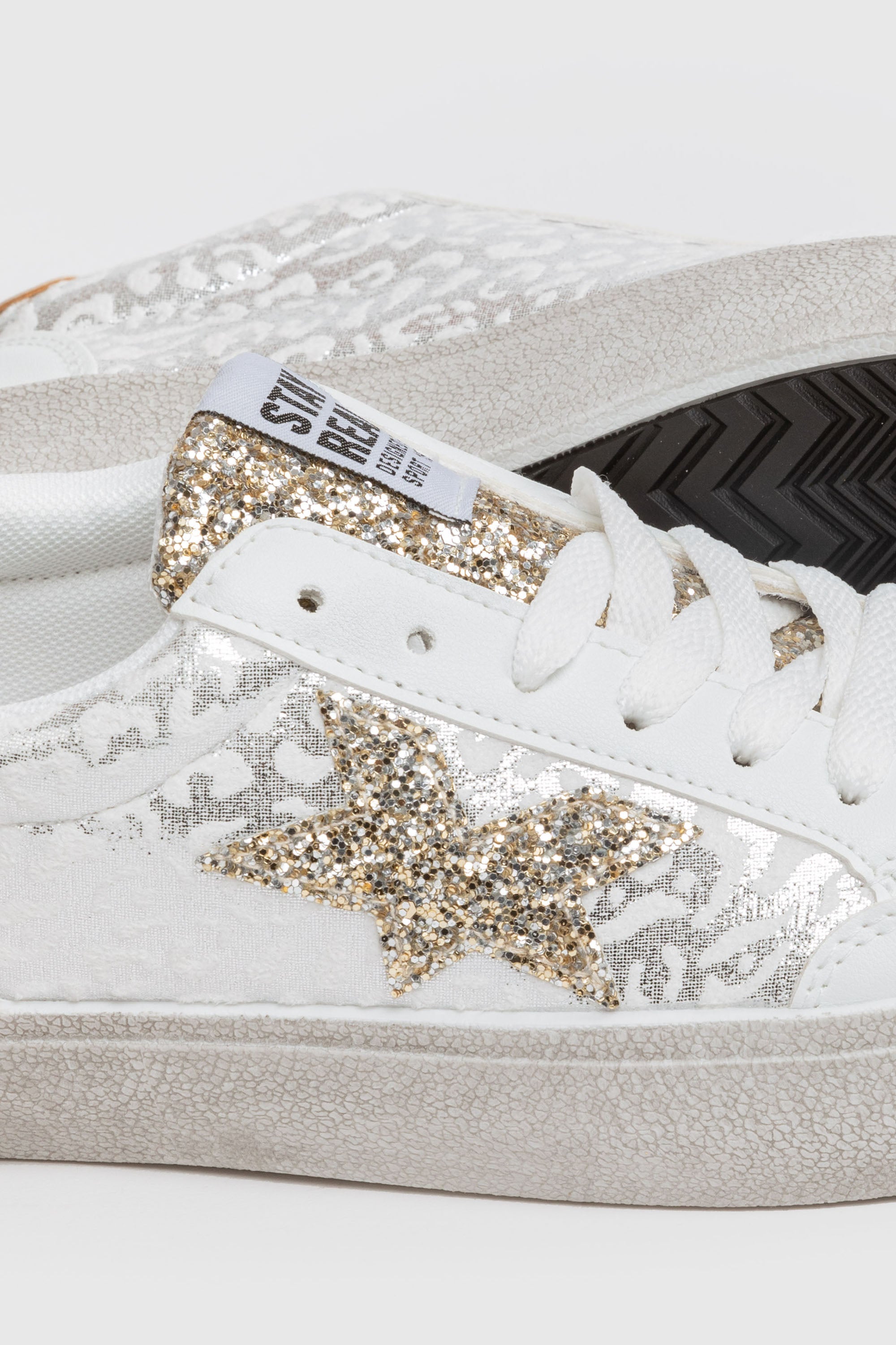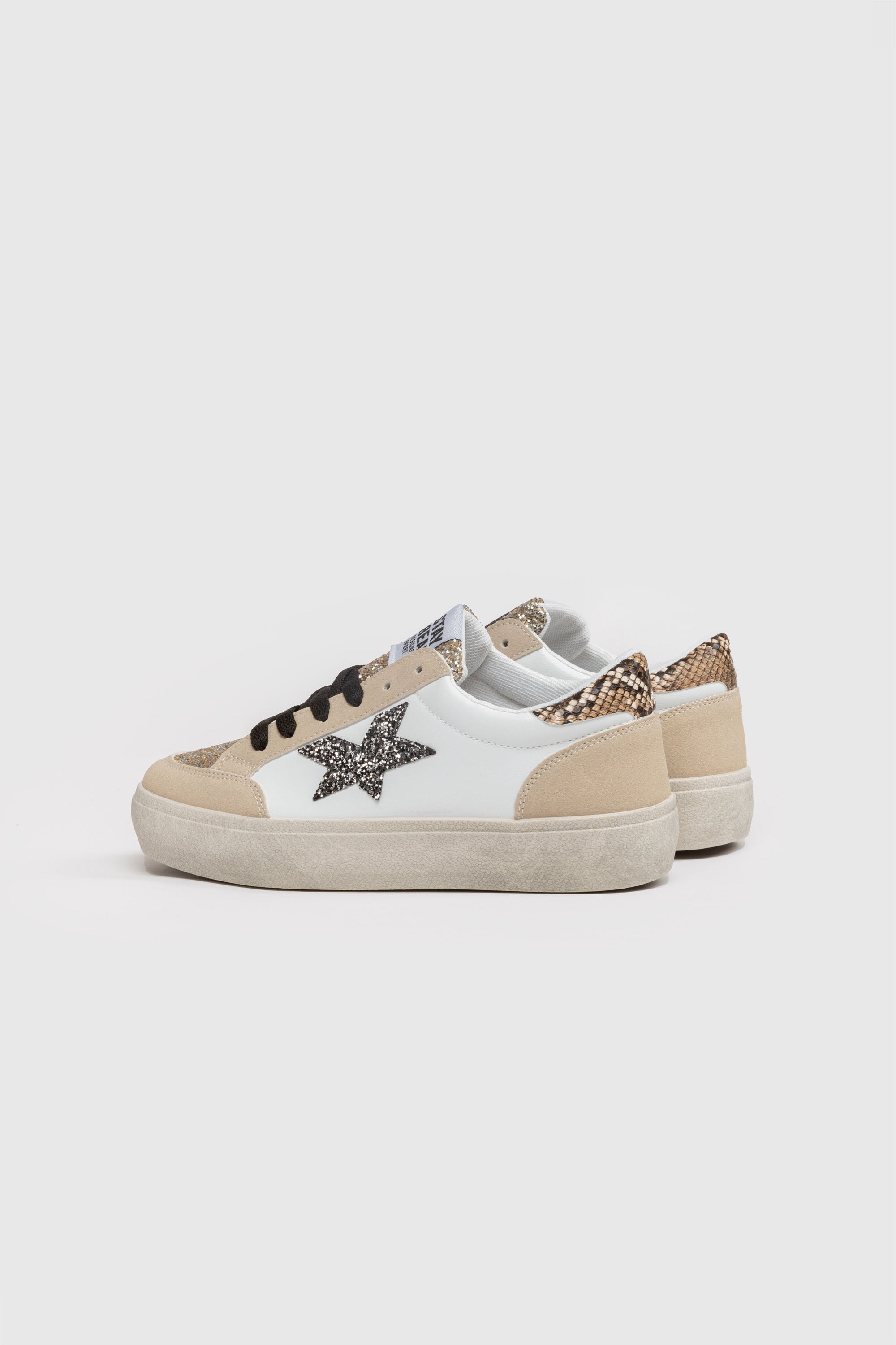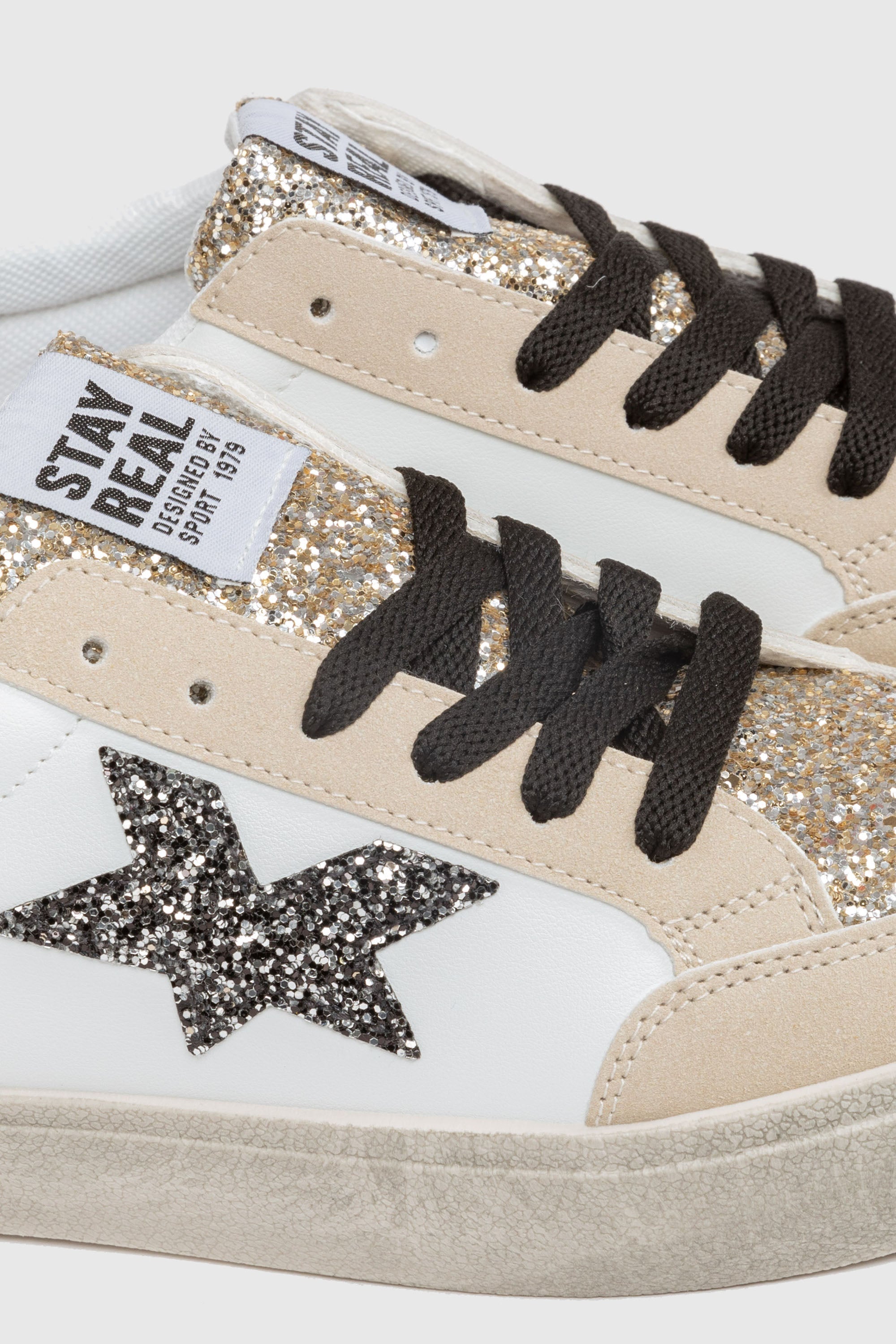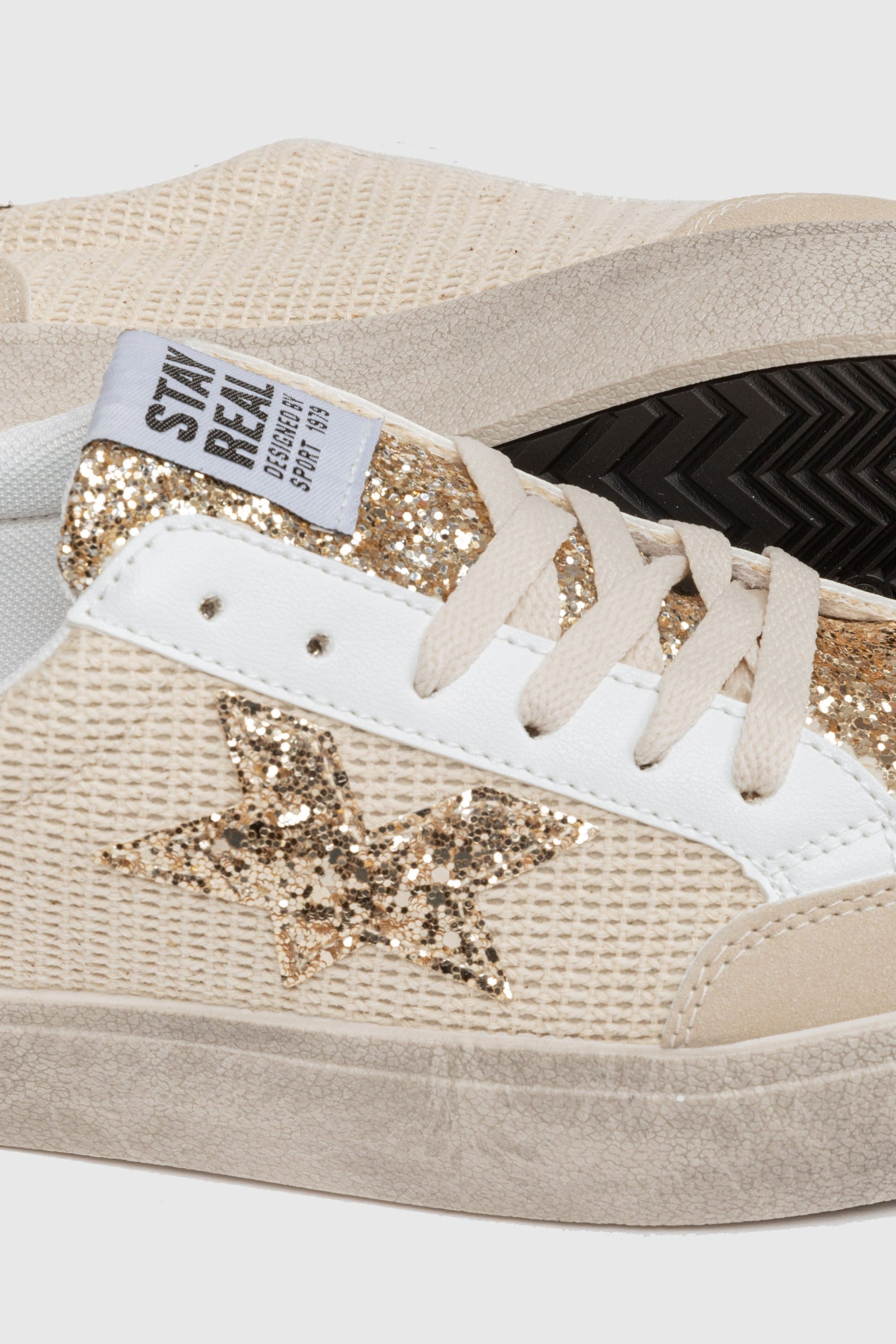 Zapato tipo deportiva. Tejido combinado. Diseño platarforma. Cierre de cordones. Suela manchada. Suela antideslizante. Estrella brillo lateral rosa. Panel trasero estampado.