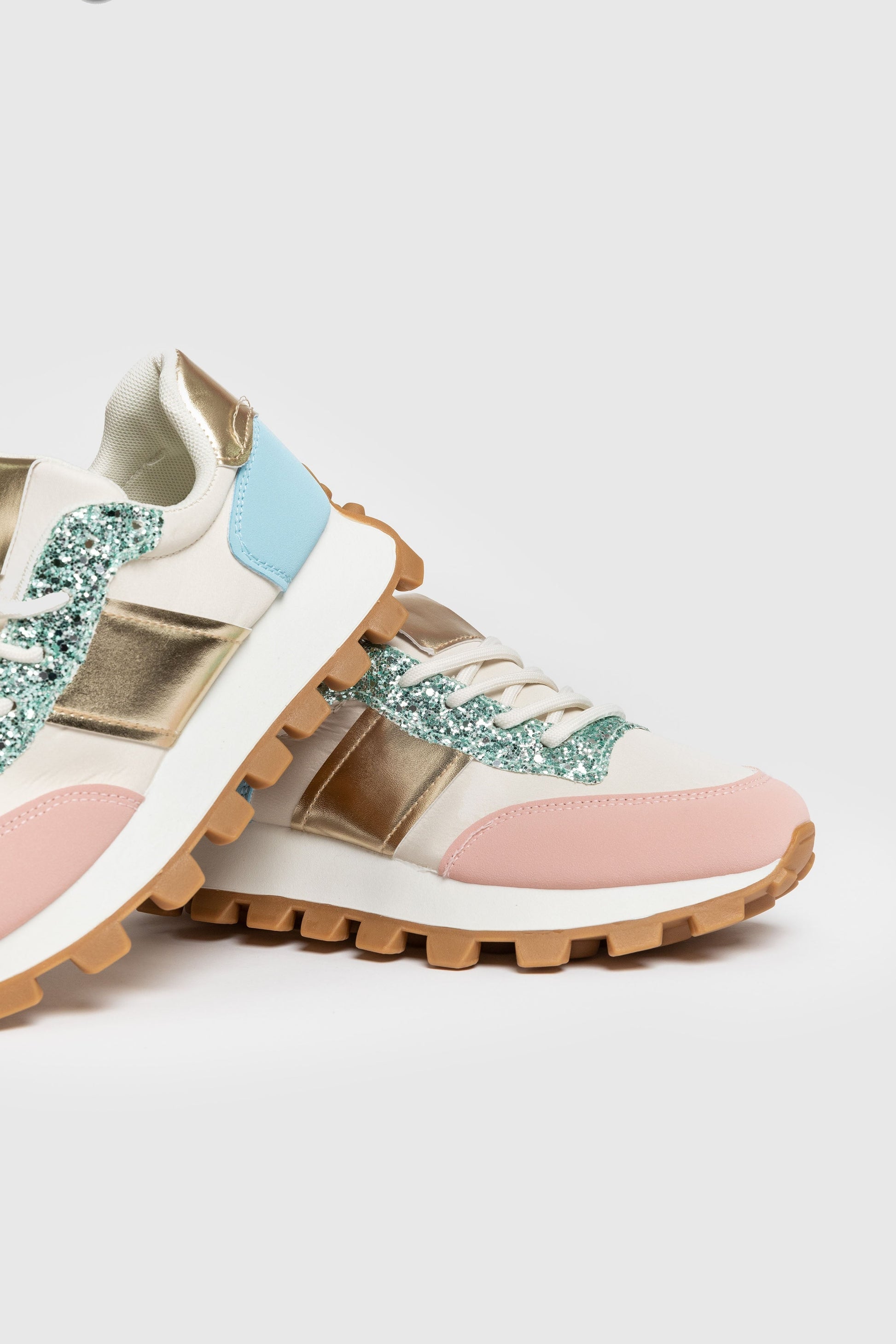 Zapatillas deportivas. Tejido combinado. Diseño colorido. Punta redondeada. Suela track. Cierre mediante cordones. Detalle metalizado en la parte trasera. Suela de contacto antideslizante. Altura piso: 4.0 cm