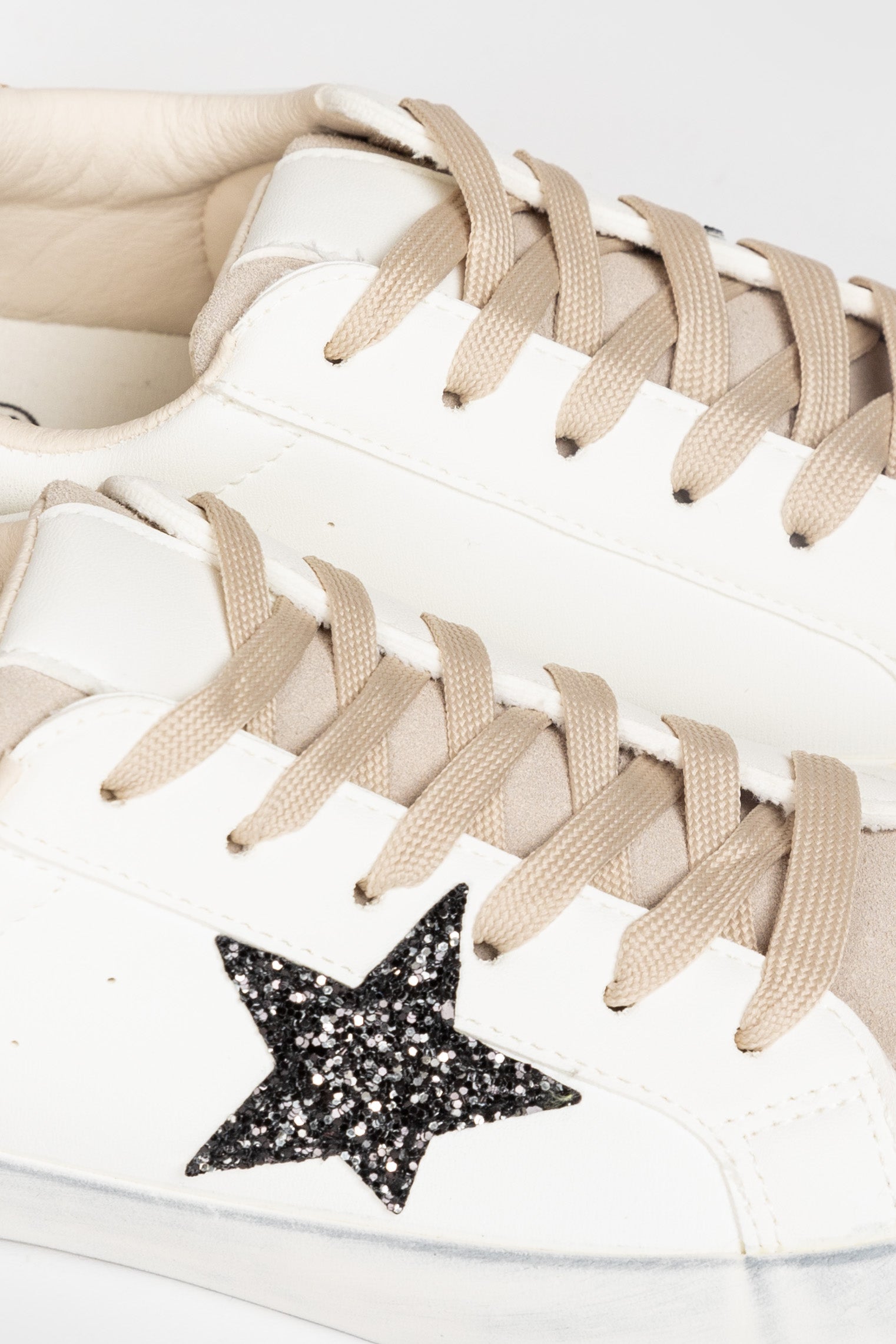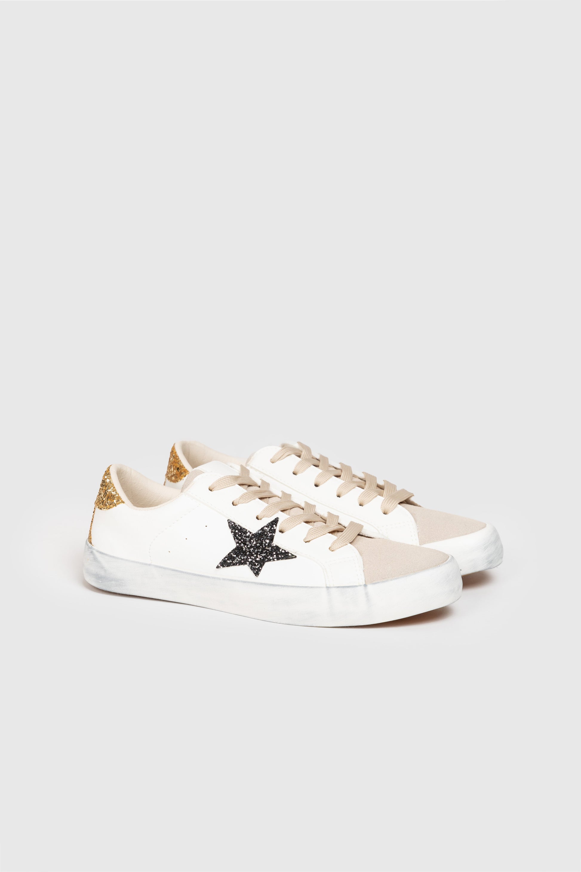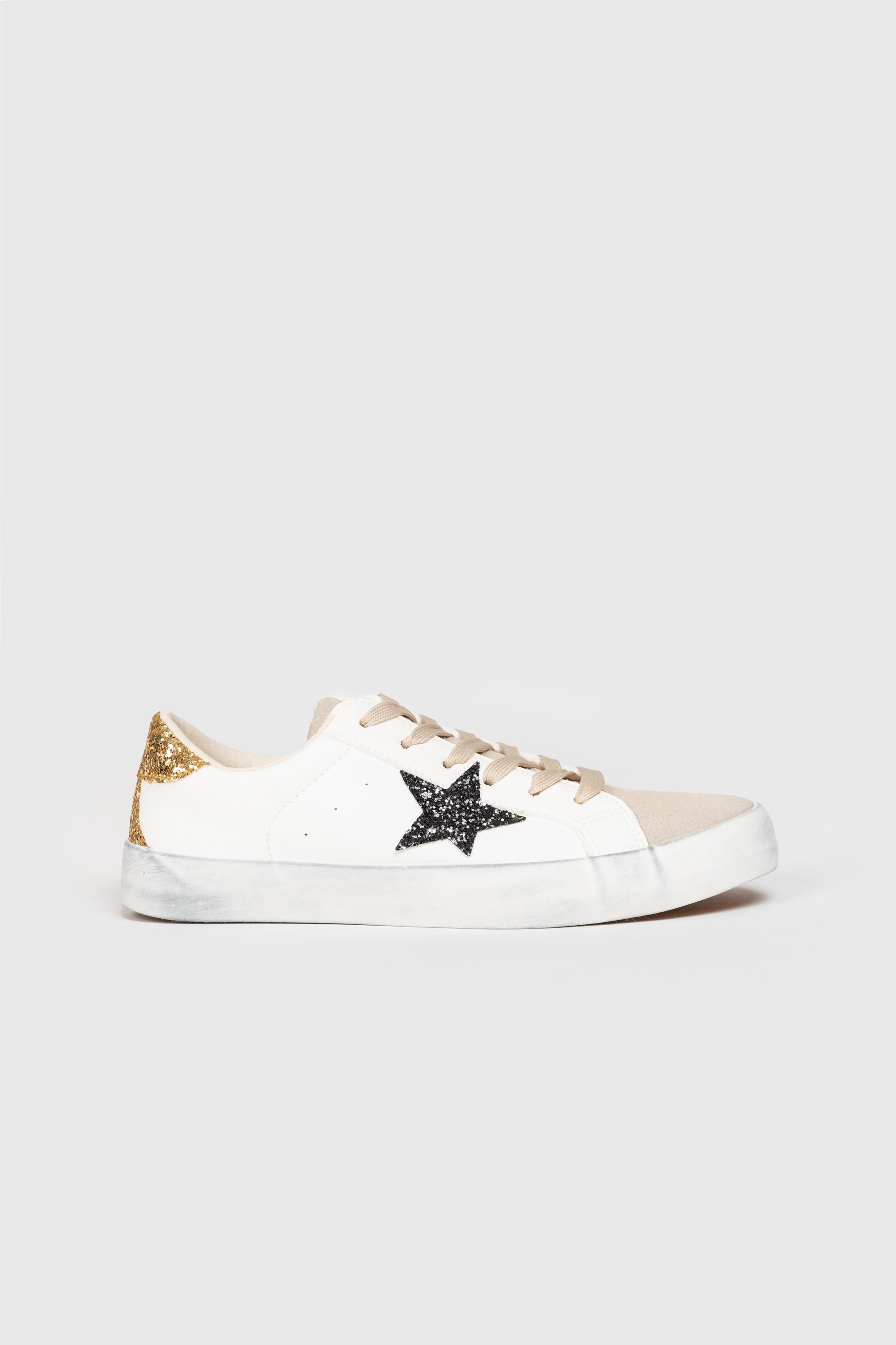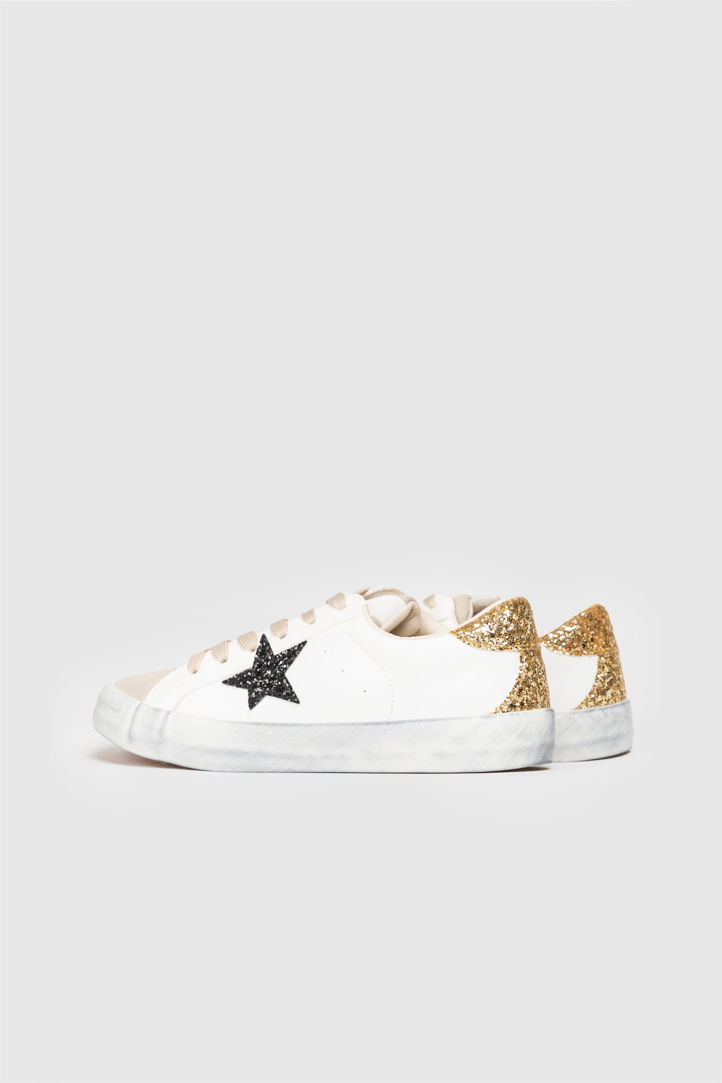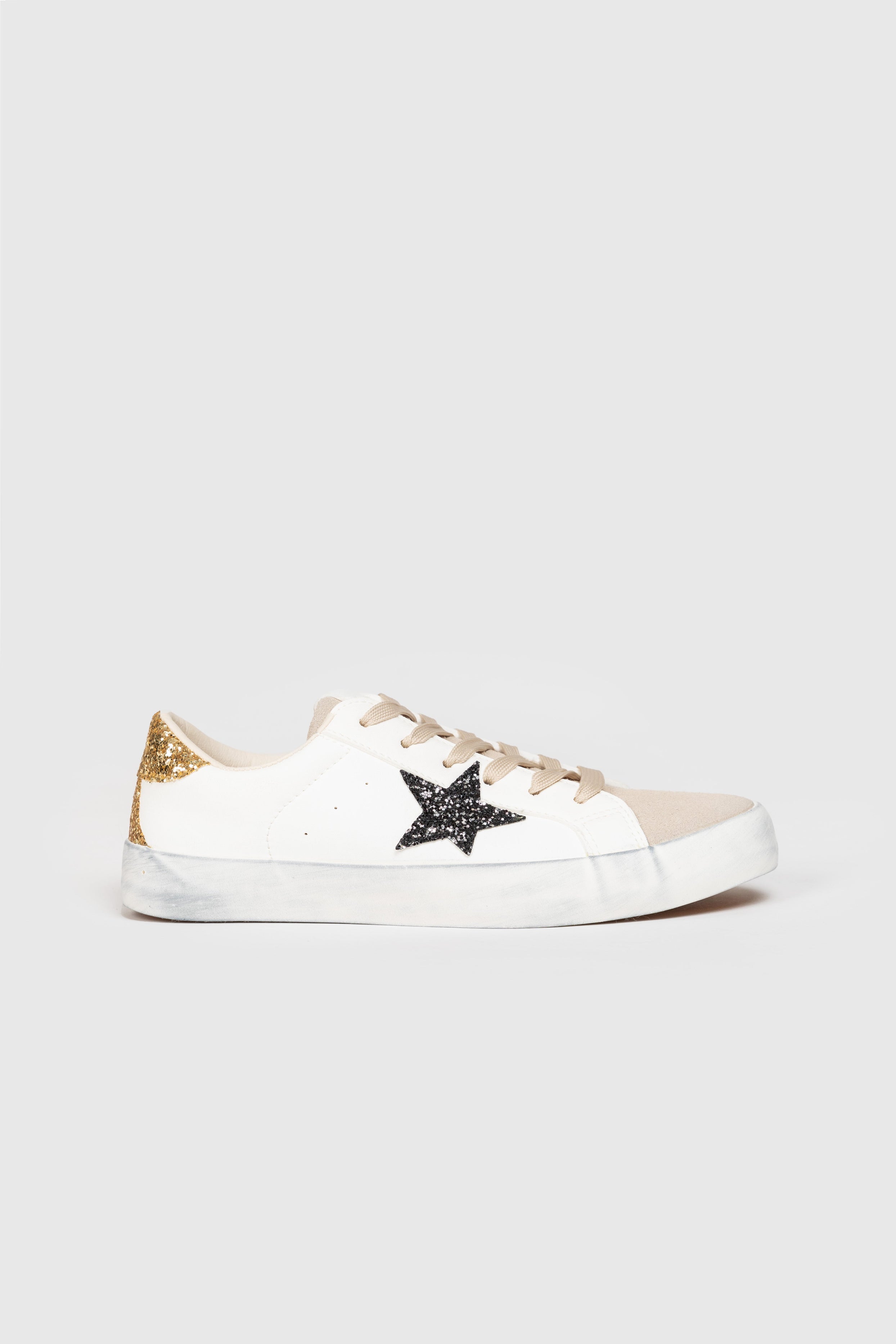 Zapato tipo deportiva. Tejido combinado. Diseño flat. Cierre de cordones. Suela raspada y manchada. Suela plana y antideslizante. Estrella brillo lateral negro. Panel trasero brillo dorado. Altura plataforma: 2.5 cm.